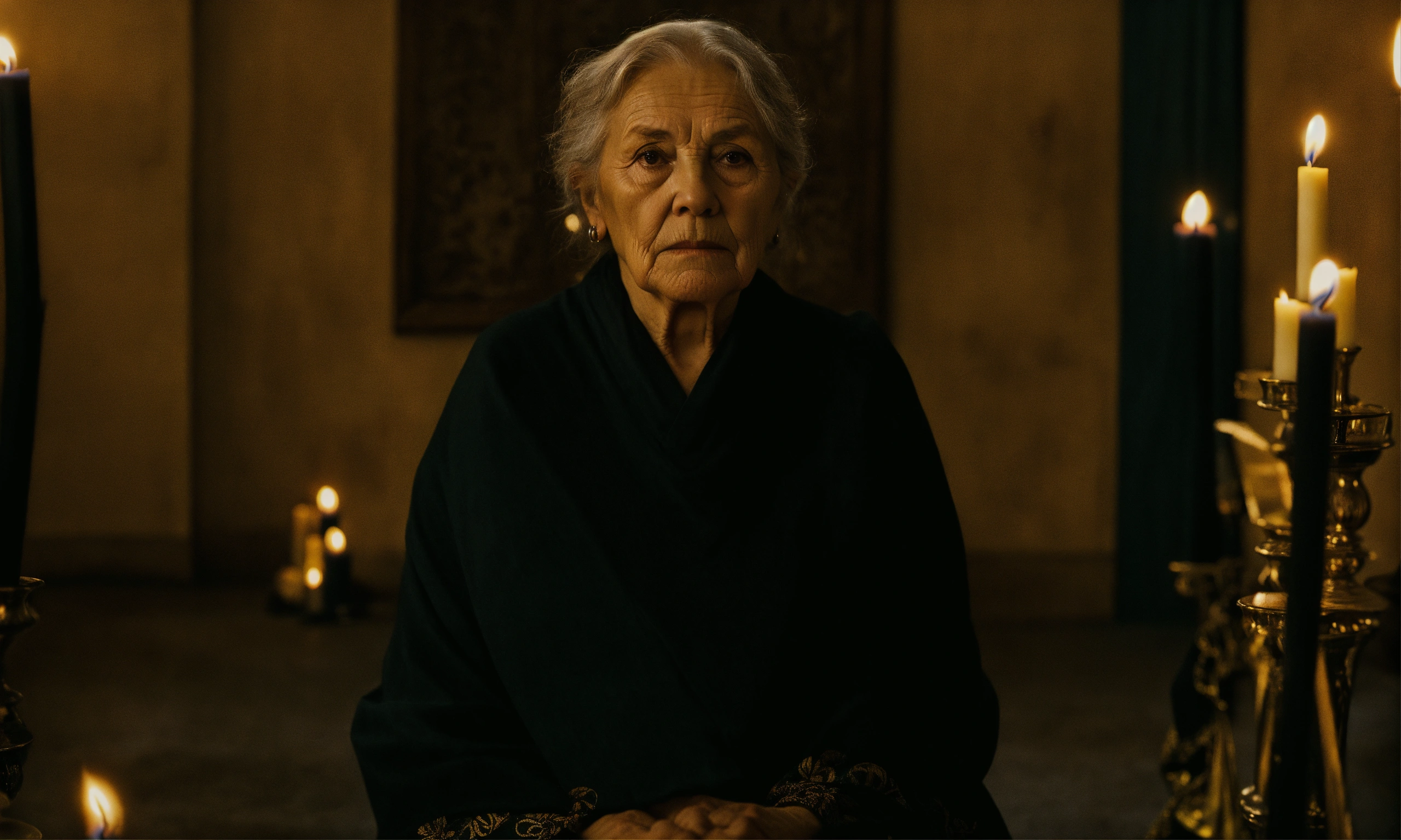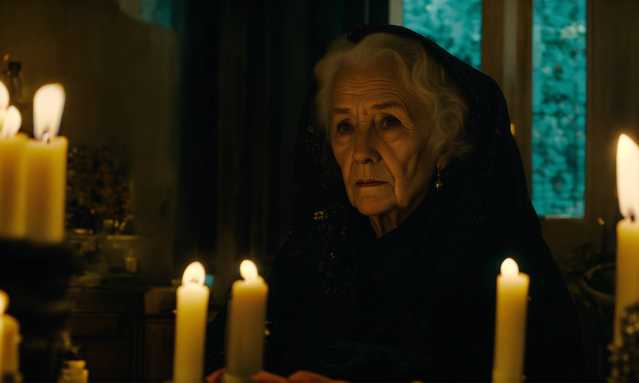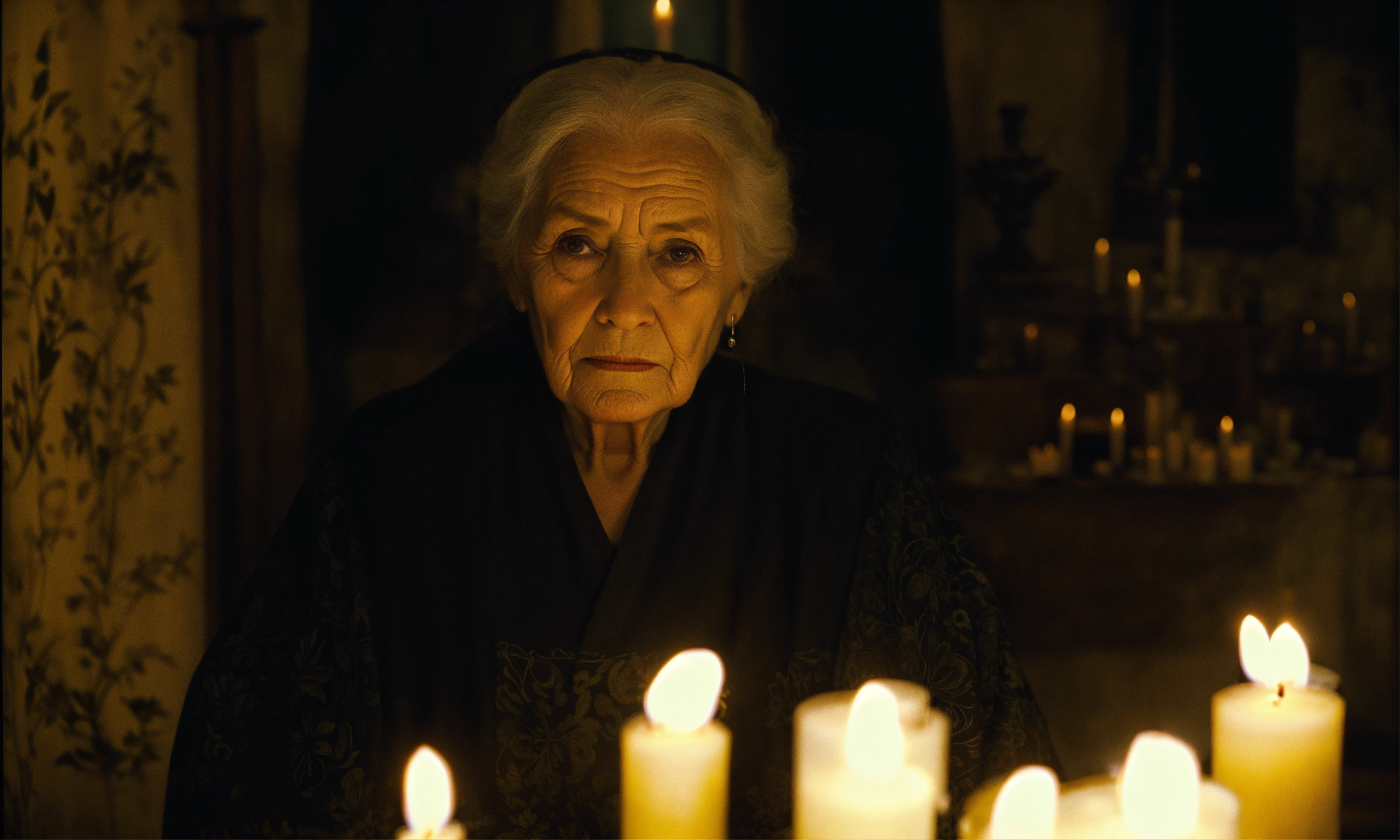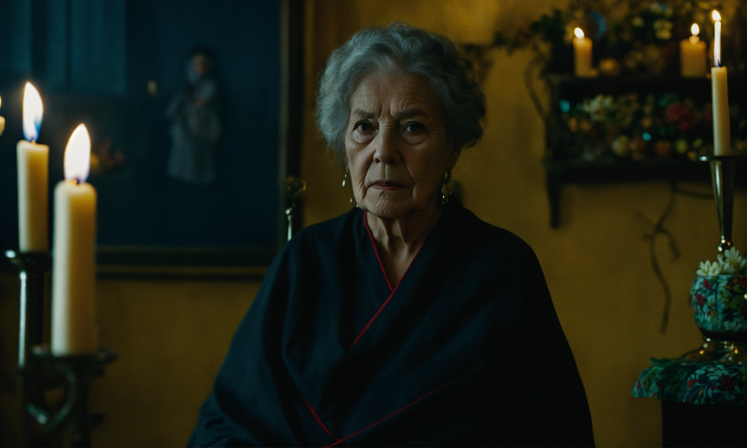 Portrait of an old woman, looking directly into camera, wearing a black muumuu, she sits in a dark room, full of candles, she is lonely. she is not happy, shot by annie leibowitz.