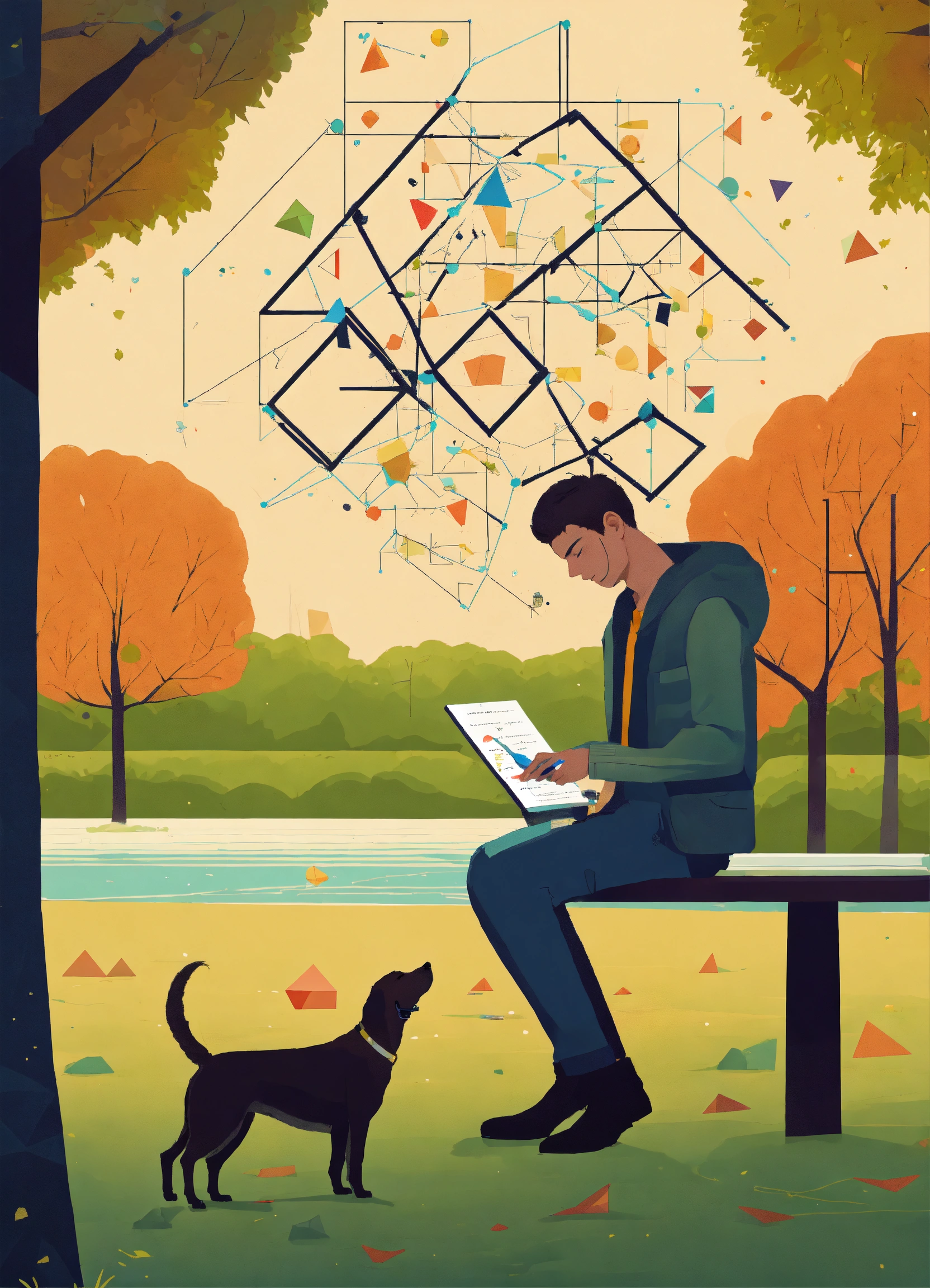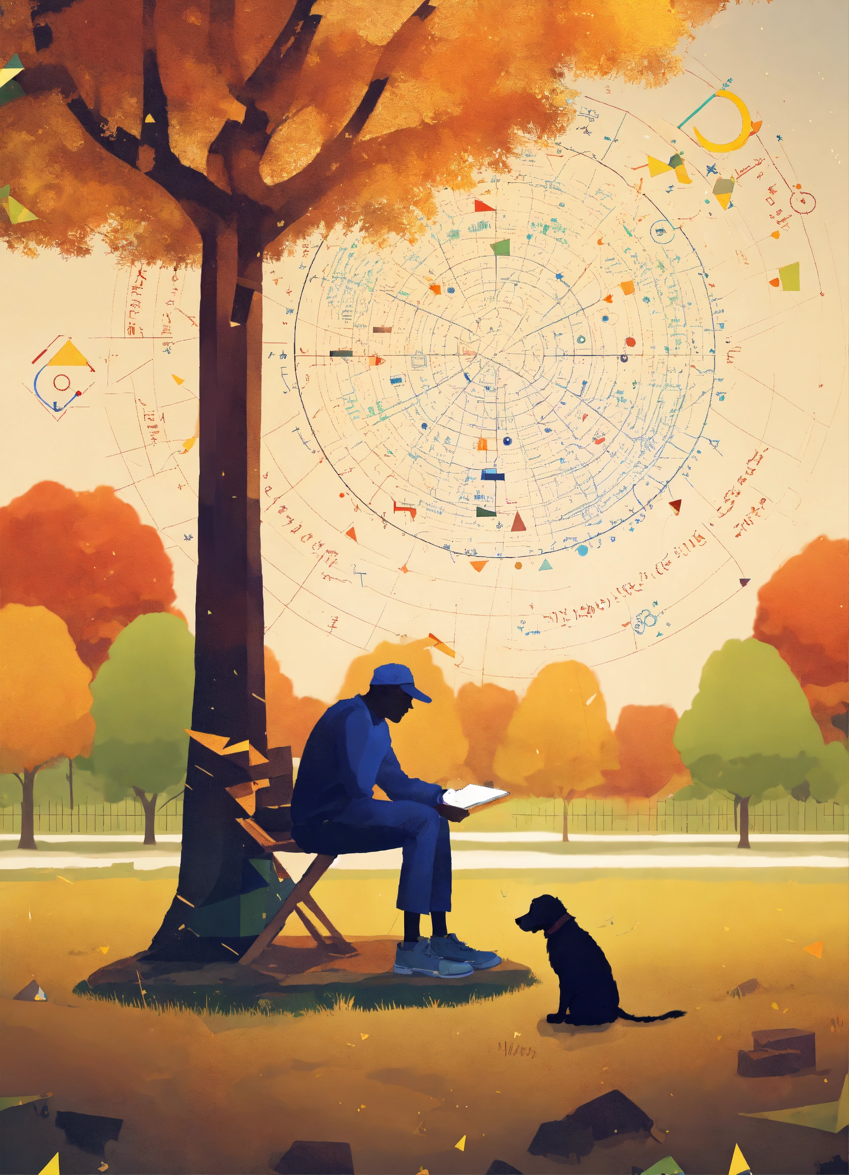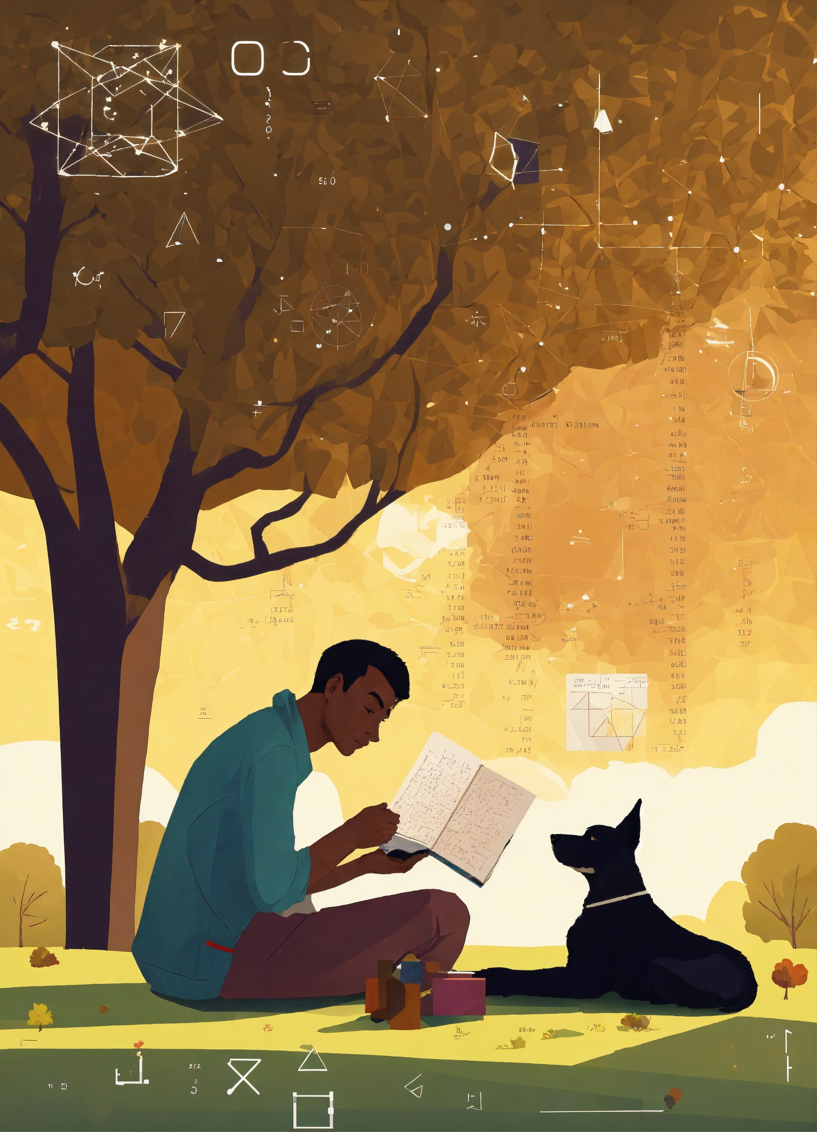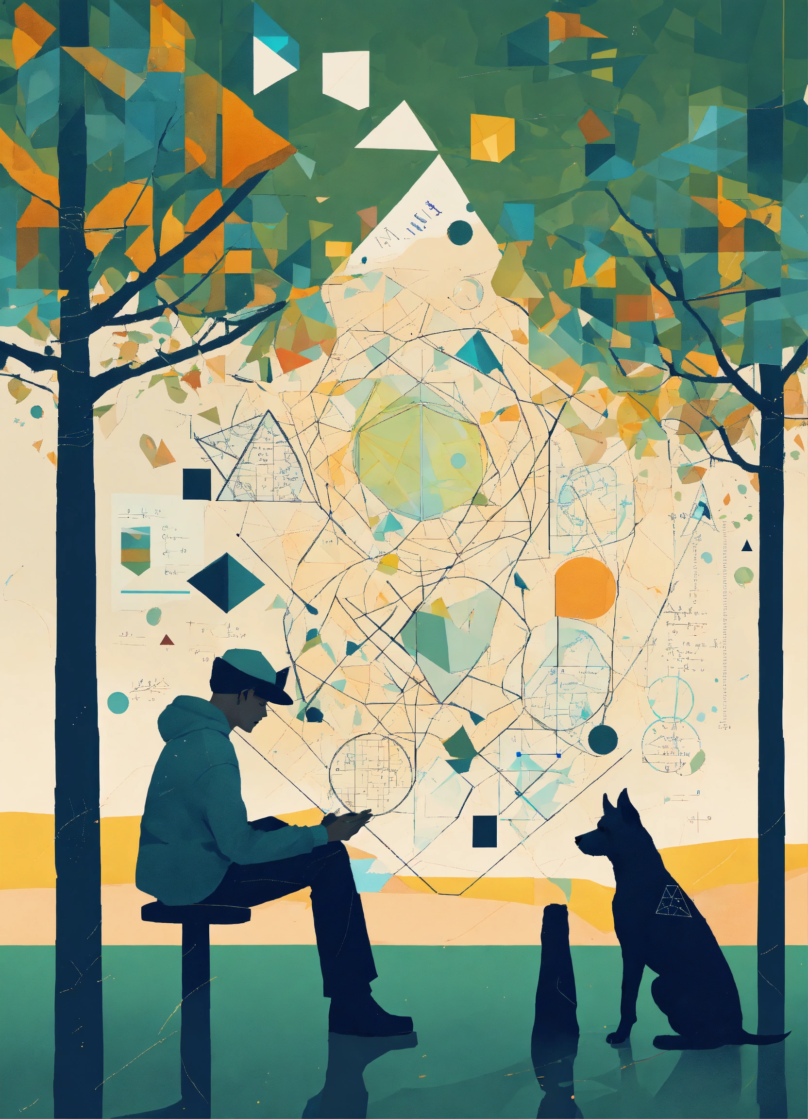 Man discovering geometric shapes like squares, triangules and circles in the world while he is sat under a tree in a park watching it, with a dog next to him. close up to the man's face. with written mathematical formulas floating in the background. vector image.