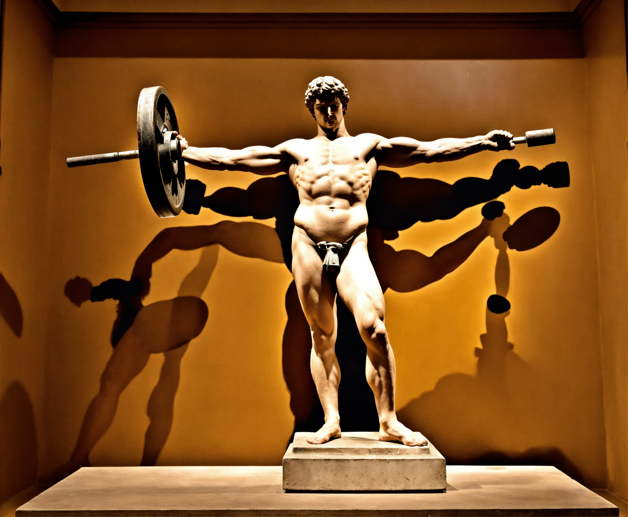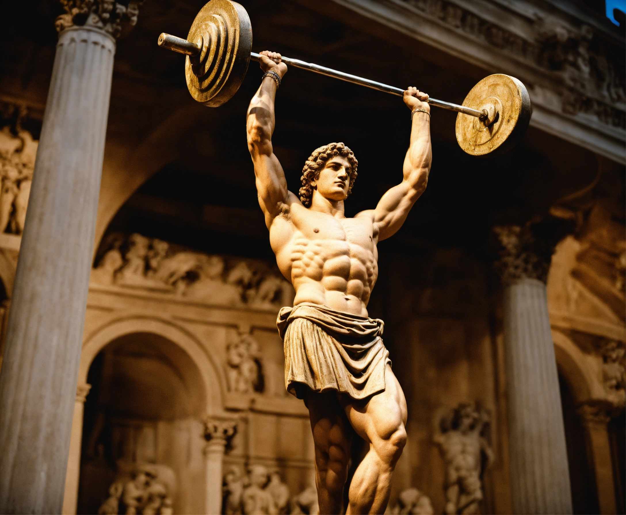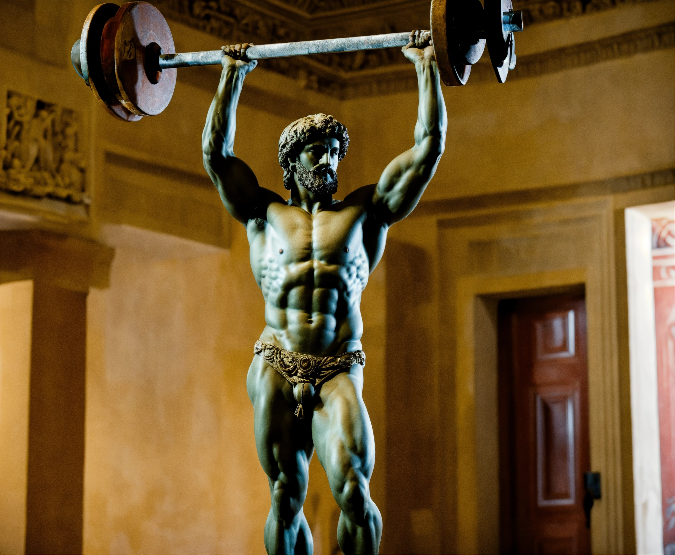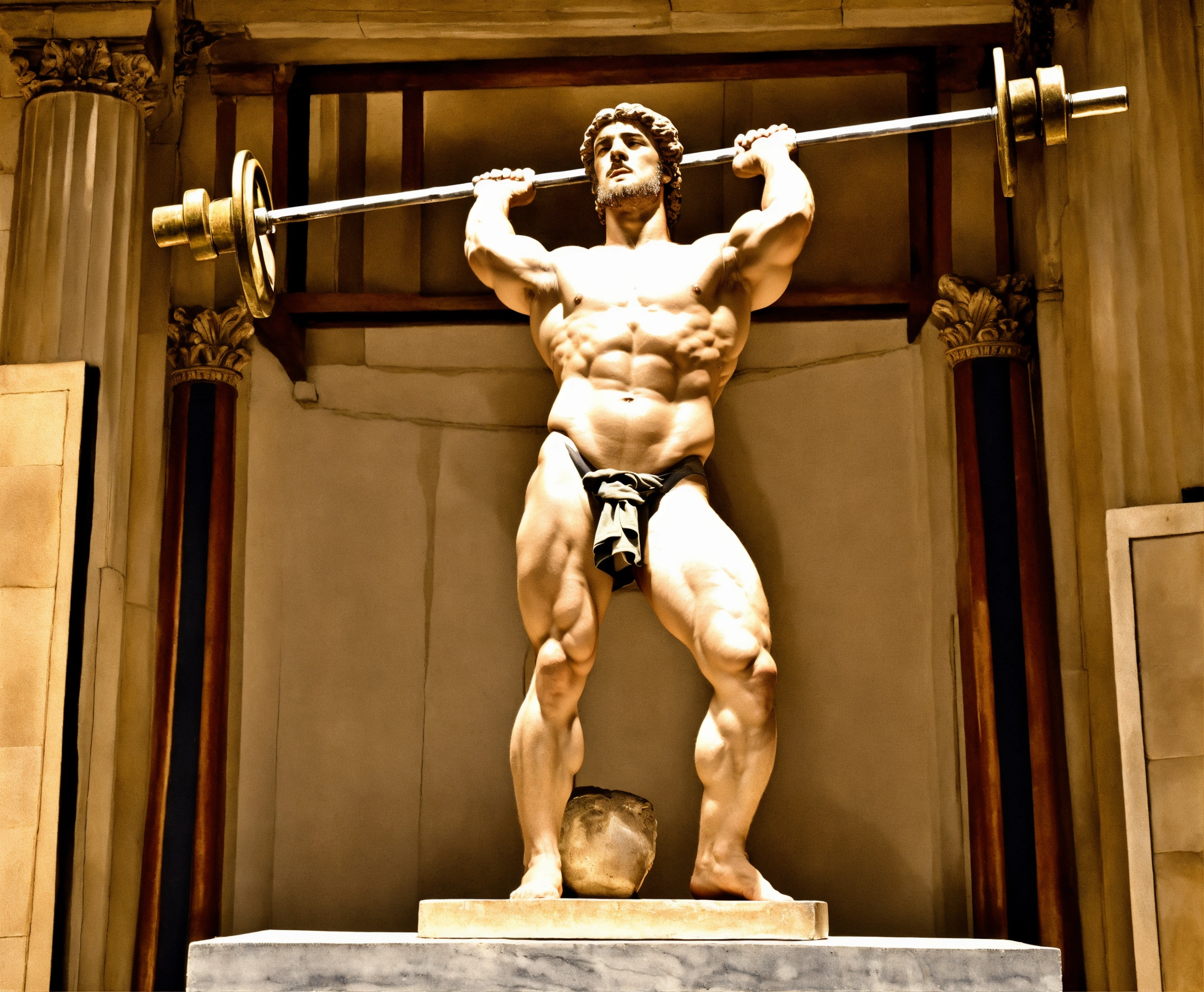 Greek sculpture of a man lifting a barbell over his head