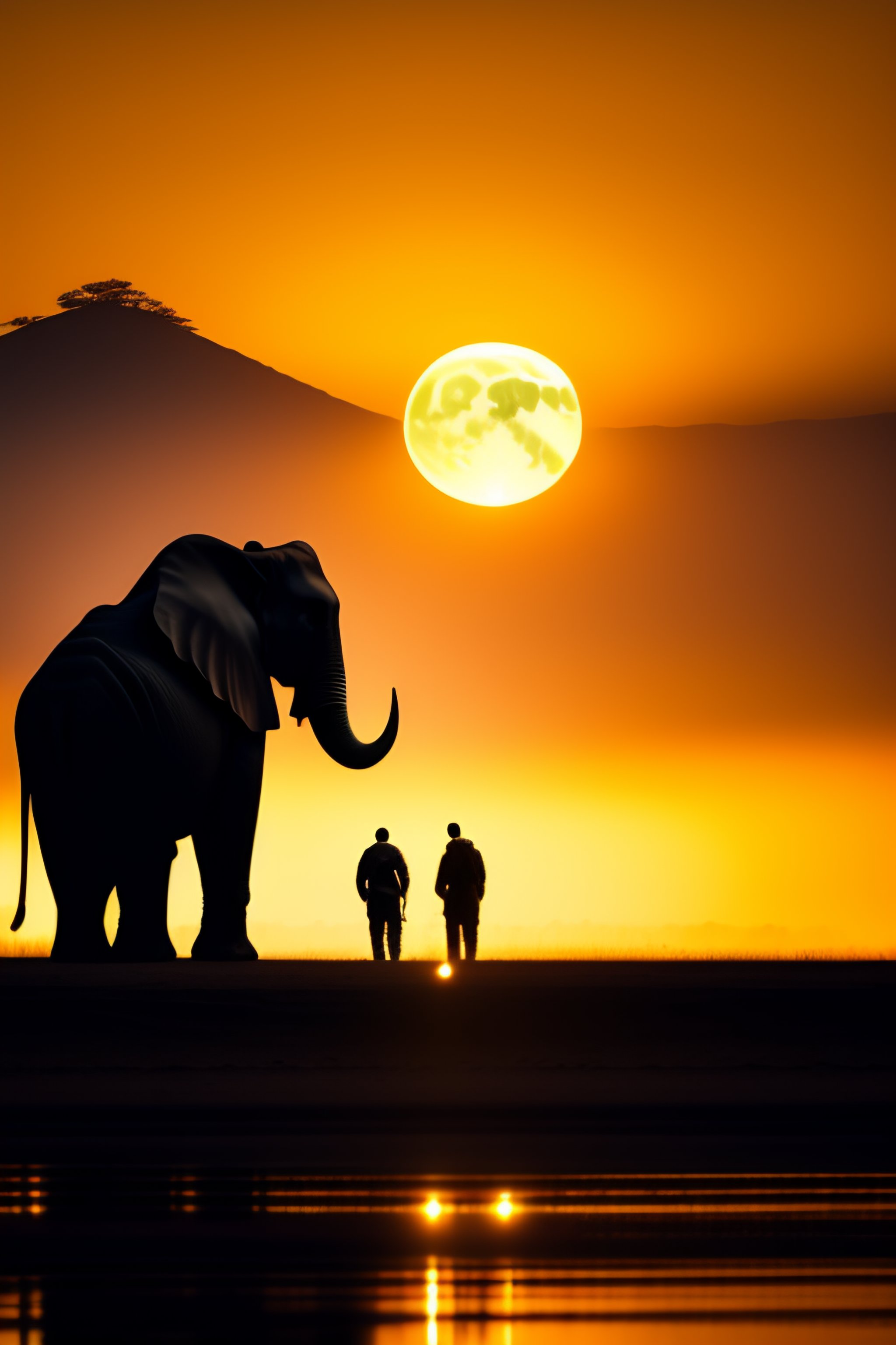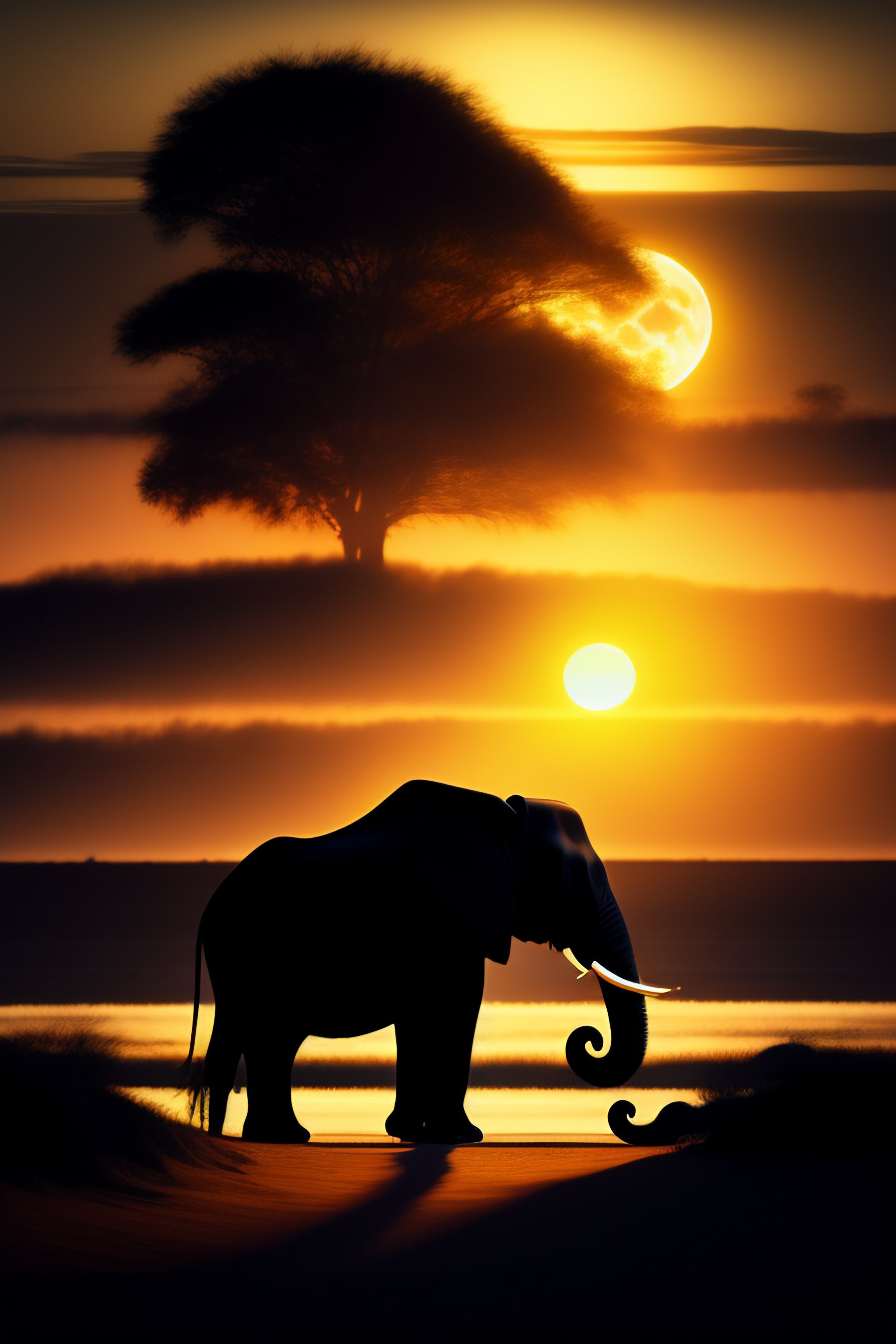 A black elephat stands on a mysterious and shadowy backdrop, with four tusks clearly visible. his golden eyes reflect the light of the full moon, and his expression is both thoughtful and unreadable at the same time. his arms are open in an invisible embrace while pathways around his silhouette are filled with magical symbols