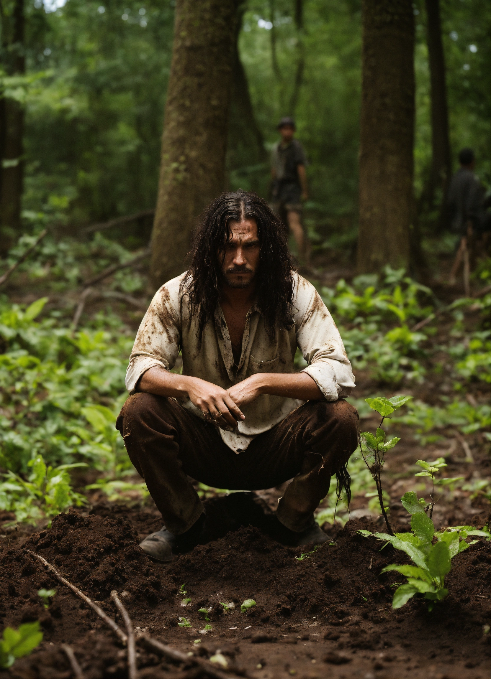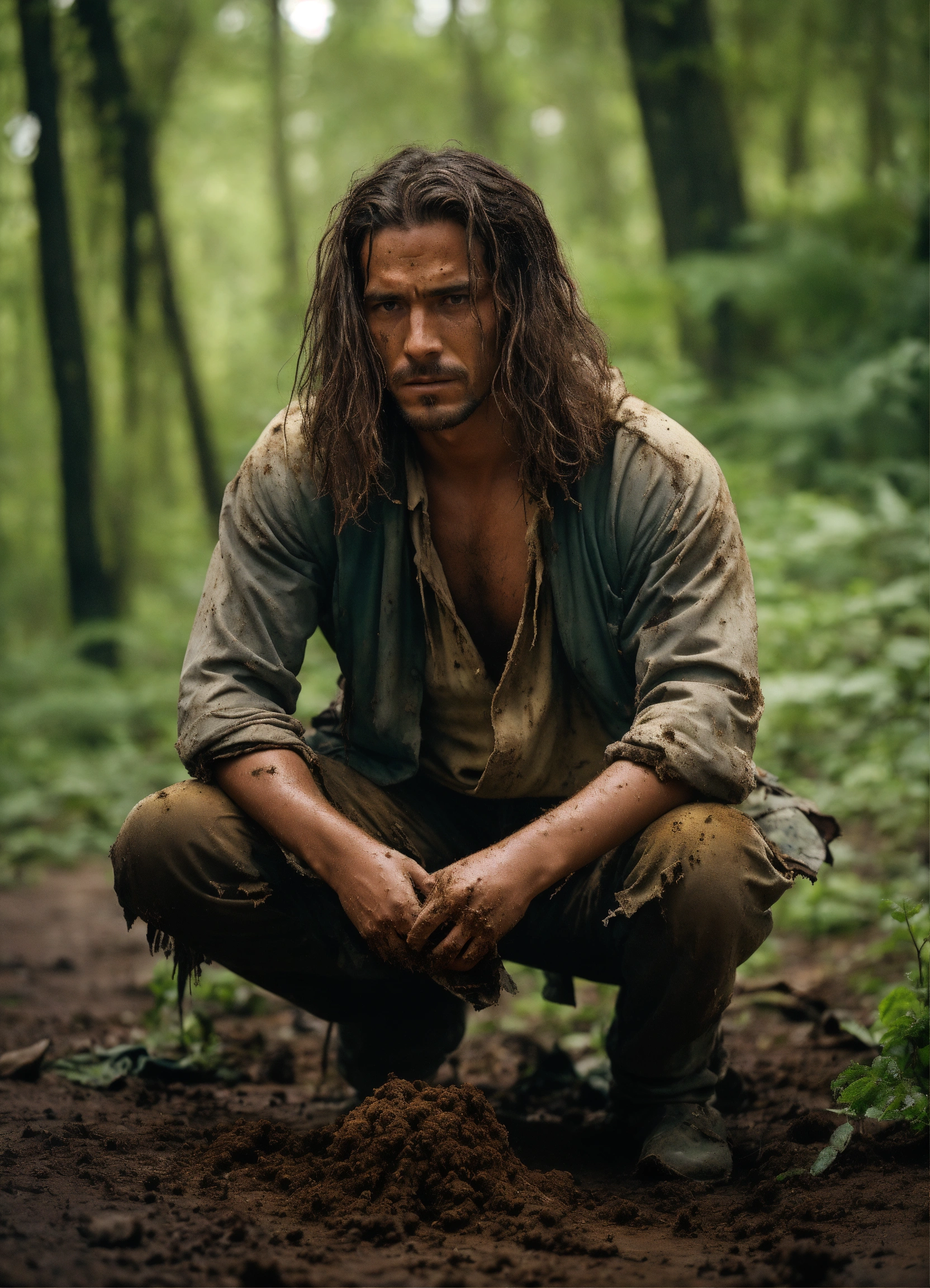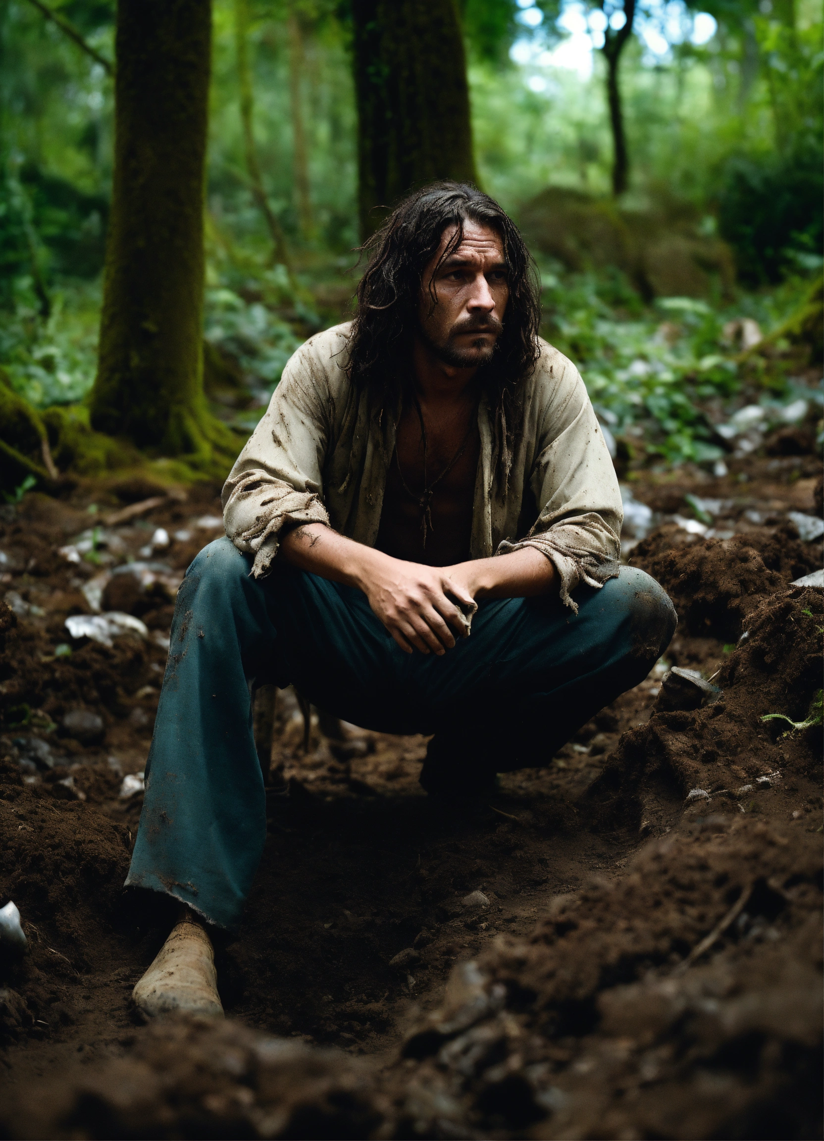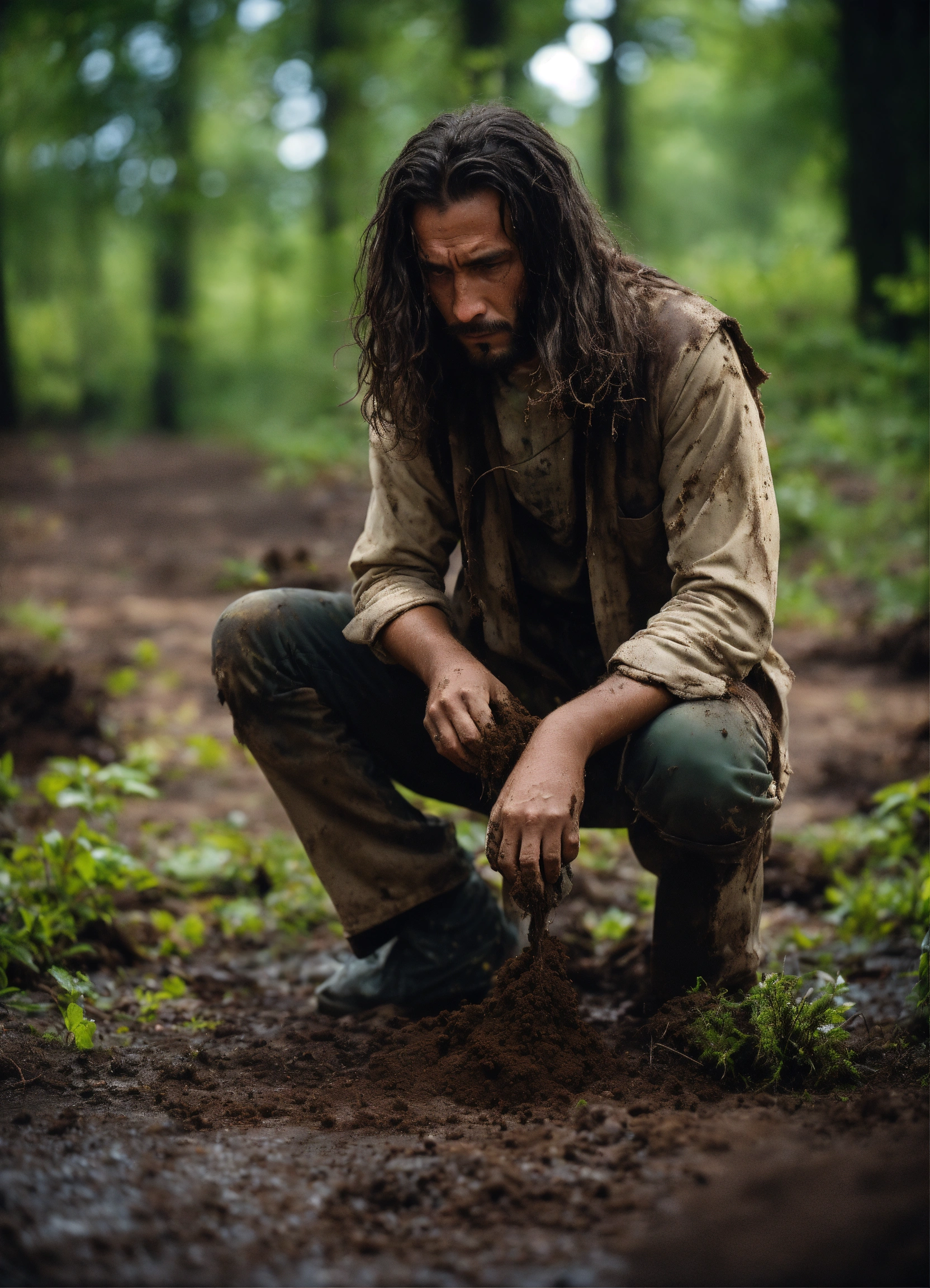 A man kneels on the dirt floor, his long hair is rooted in the earth, his clothes, destroyed by time, are torn and dirty. he has a dismayed expression on his face. the setting is a forest with a damp earth floor.