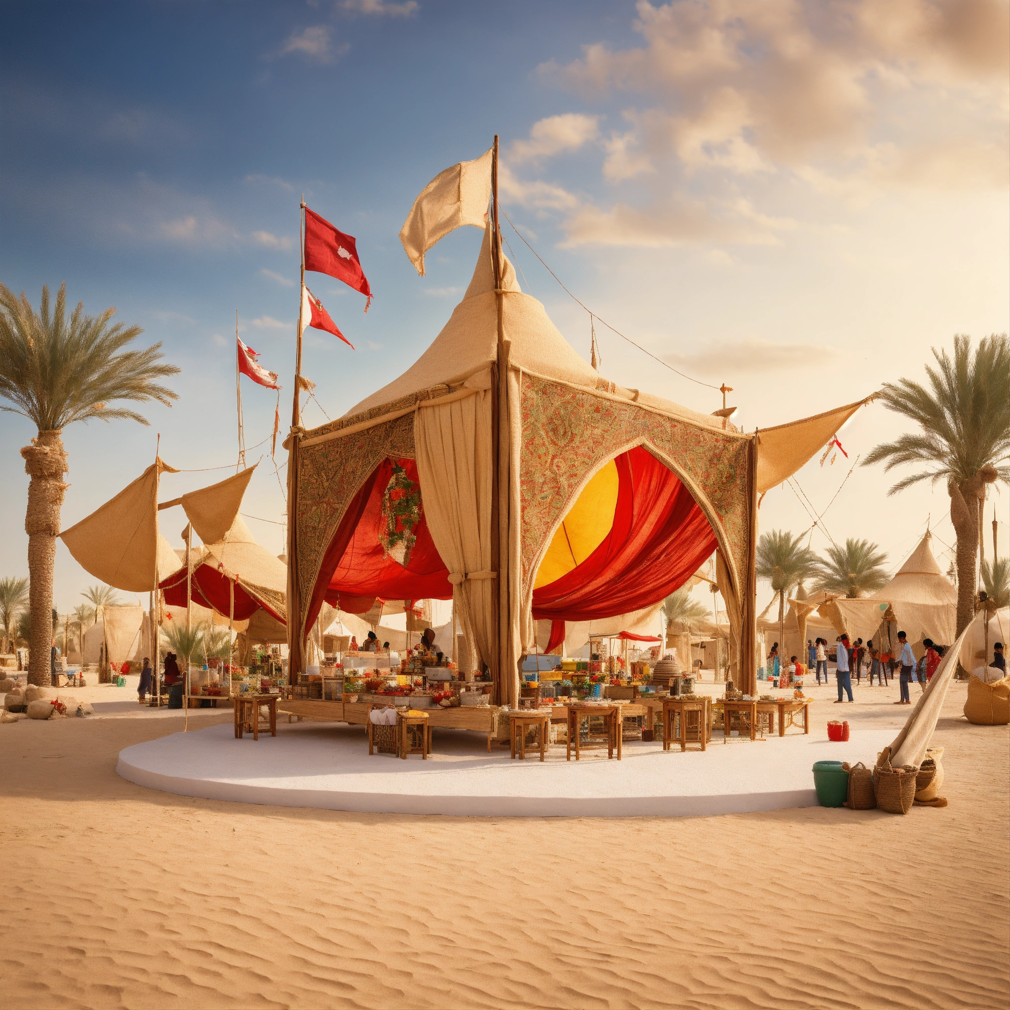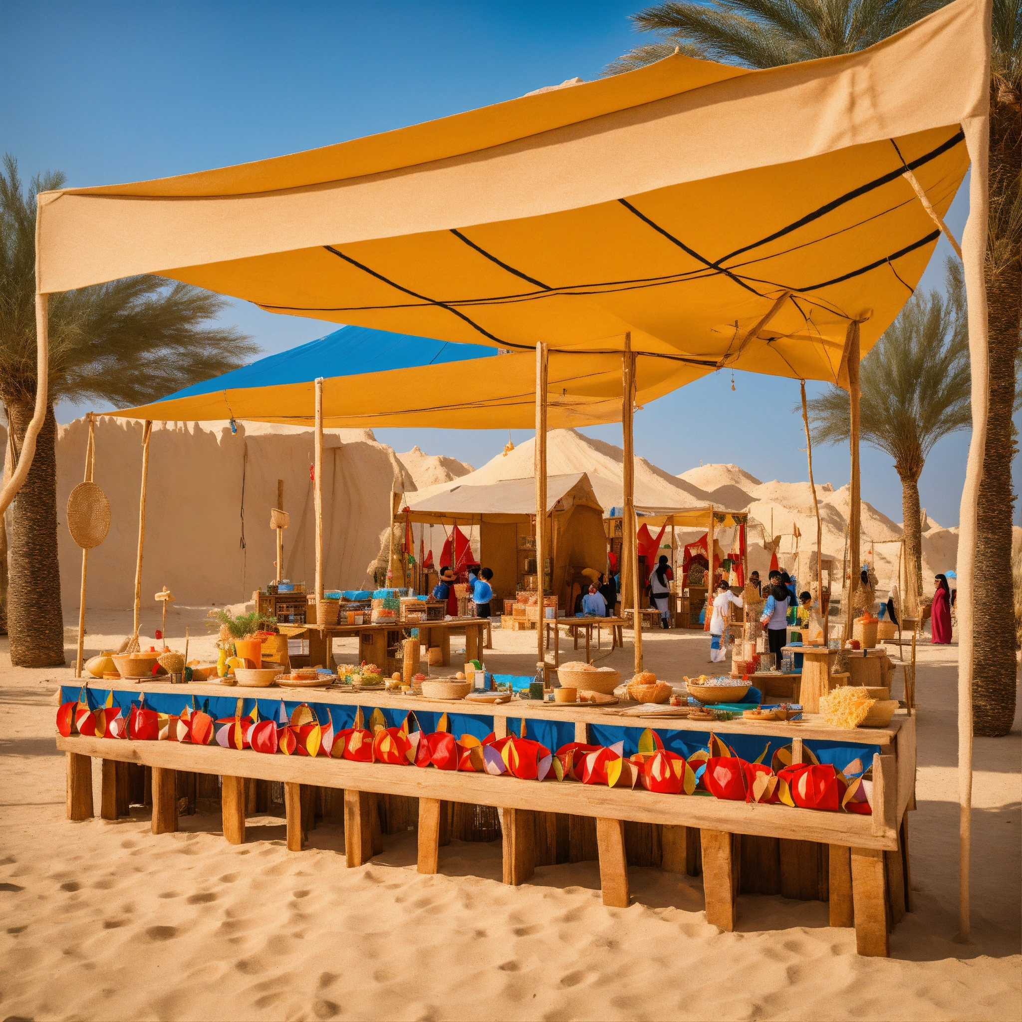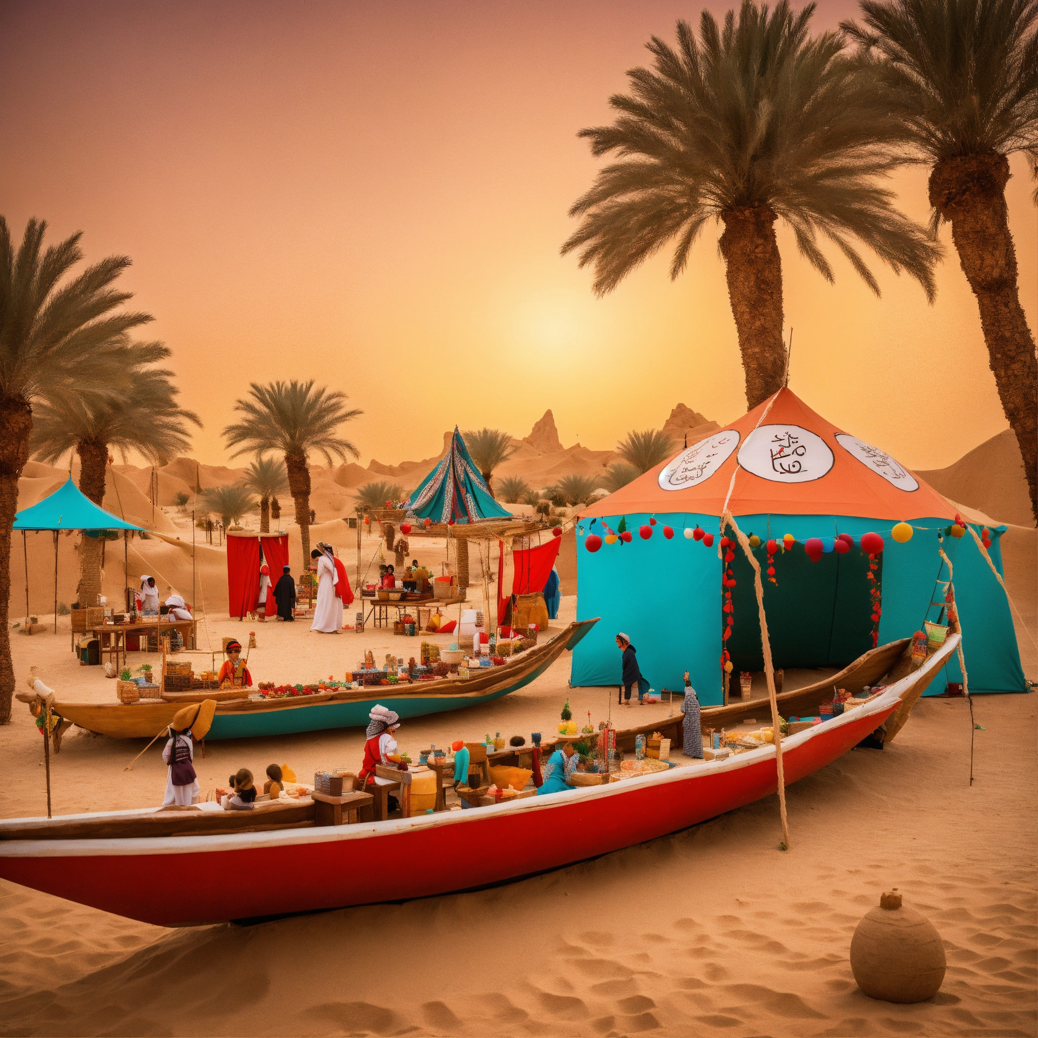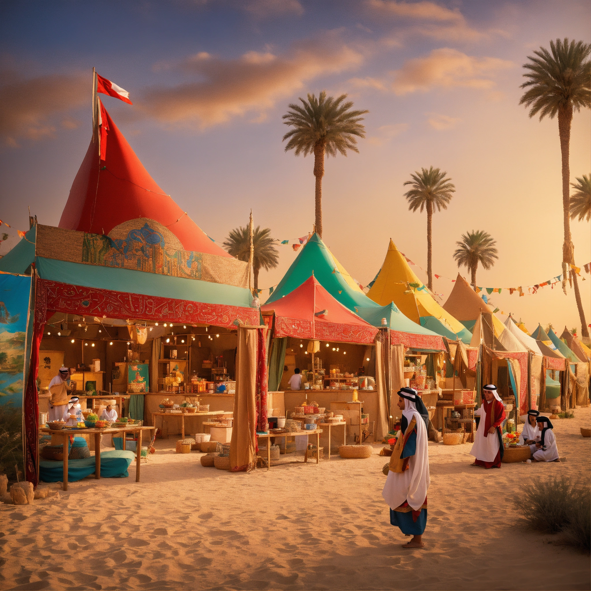 Imagine the 'taste of bahrain' food festival's whimsical kids' stage set in the arabian desert, adorned with colorful tents, date palm trees, and giant food props. kids enjoy interactive cooking workshops, crafts, puppet shows, storytelling, an art wall, and face painting. the arabic alphabet art adds an educational touch, all within this immersive desert landscape. incorporate traditional bahraini sailboats (dhow) as decorative elements, with small-scale models displayed around the area.