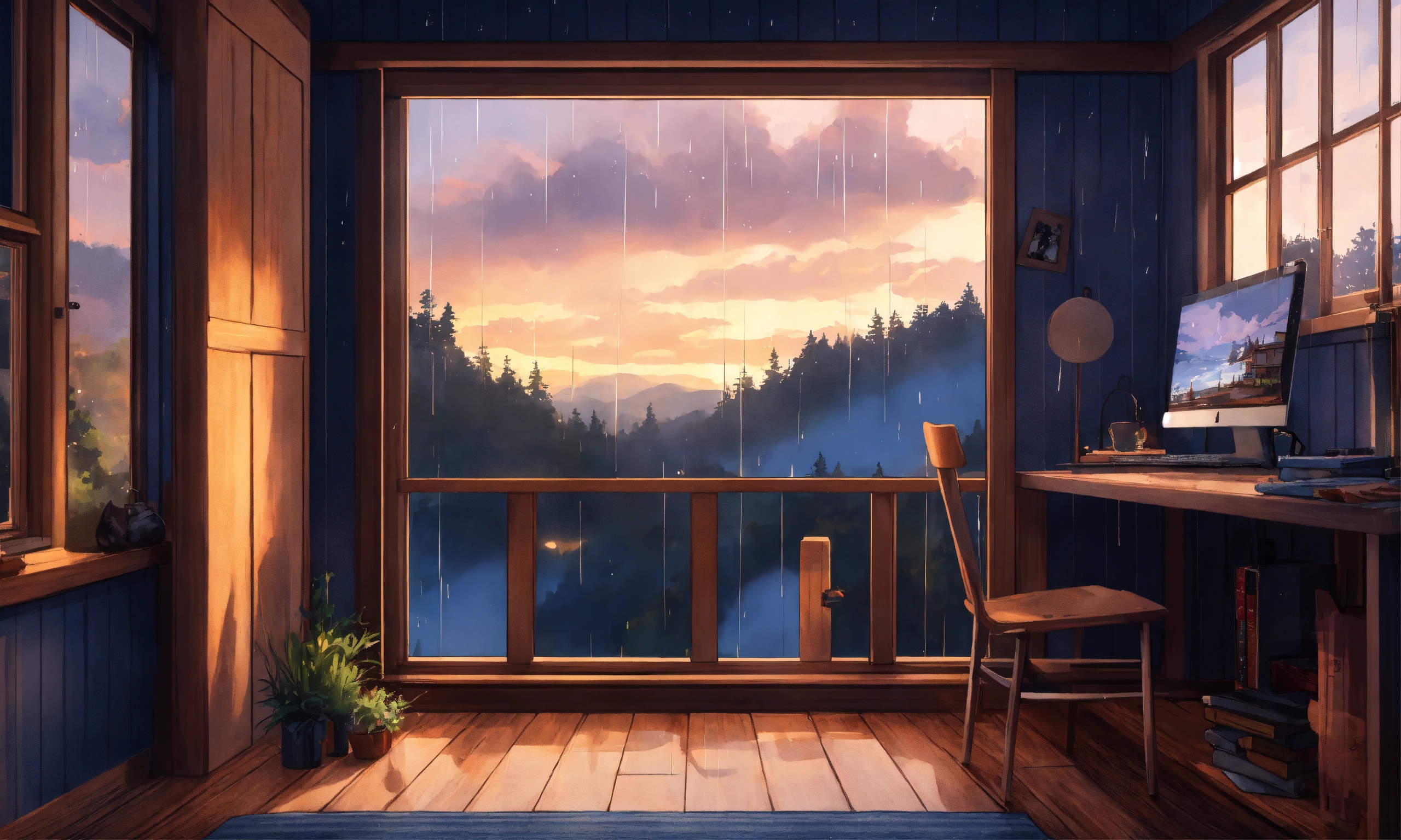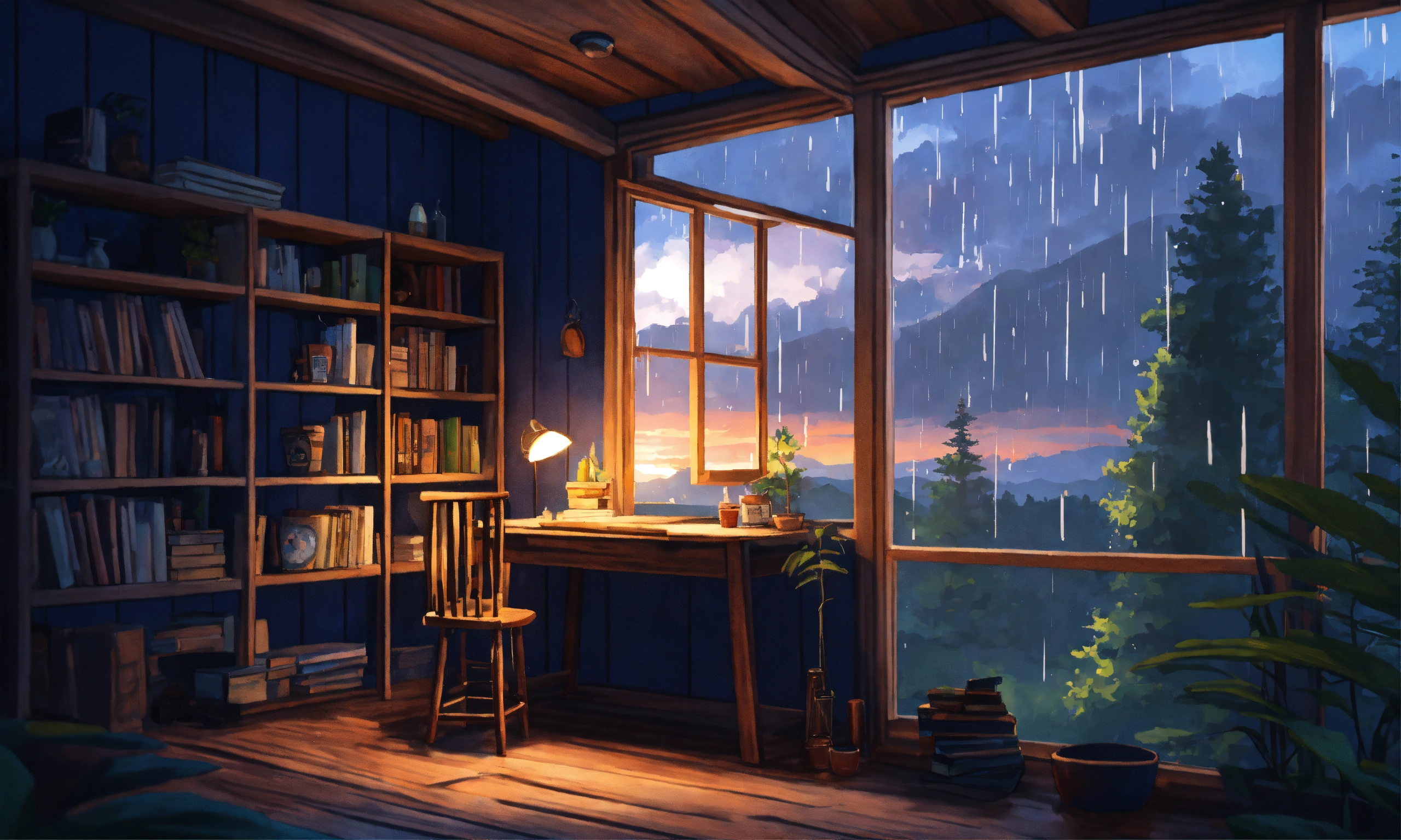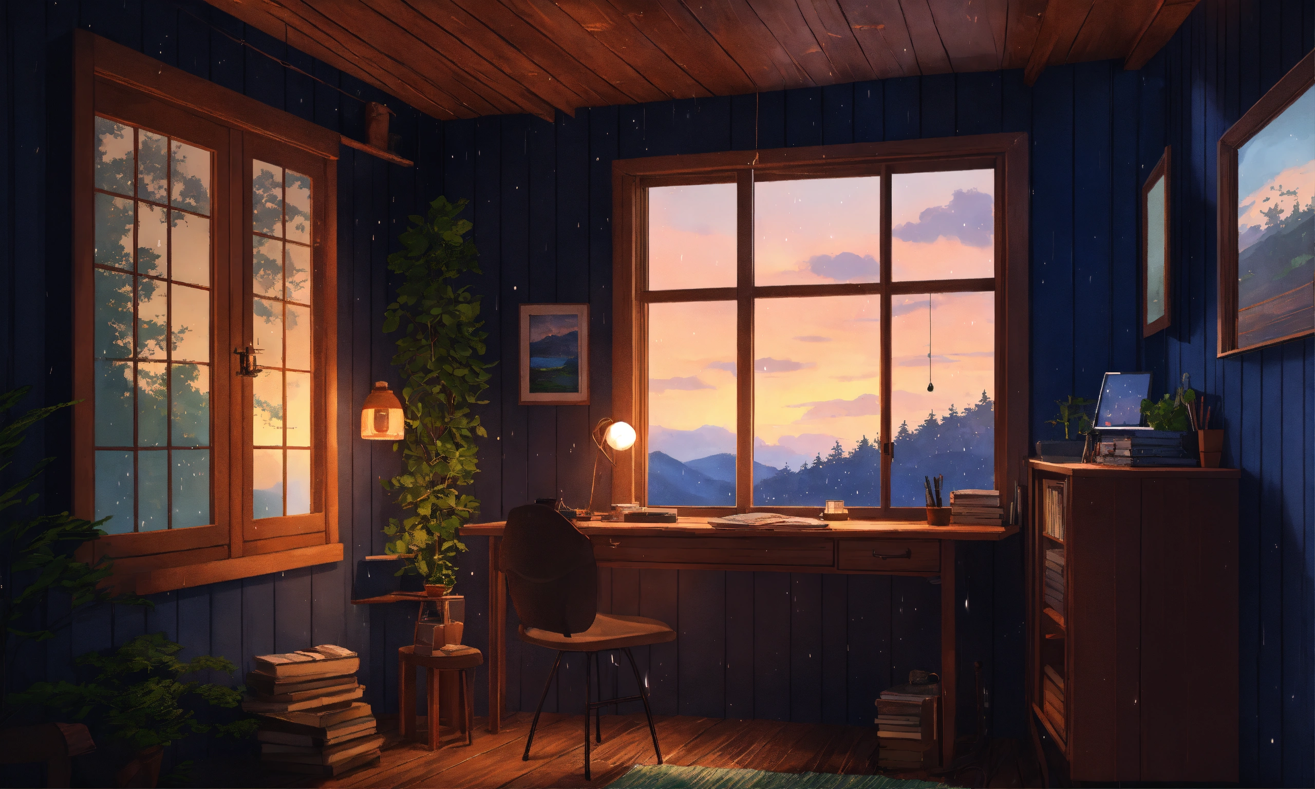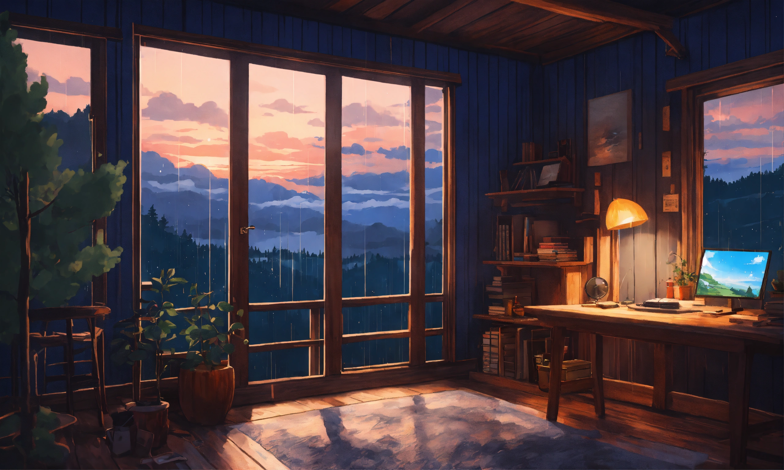 Cozy wooden nordic cabin with dark blue wooden walls, anime, studio ghibli, minimalistic, raining outside, dark cloudy evening sunset, big window view with study desk, washed acrylic image, forrest outside, anime lofi artwork