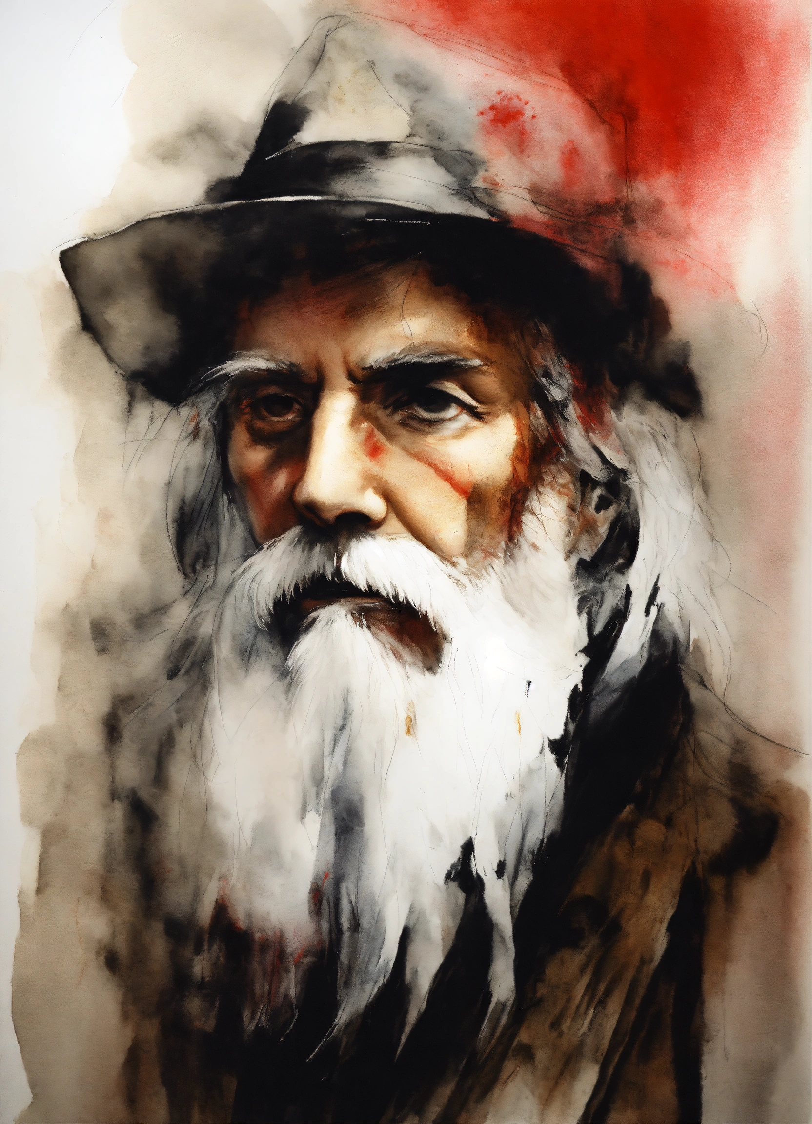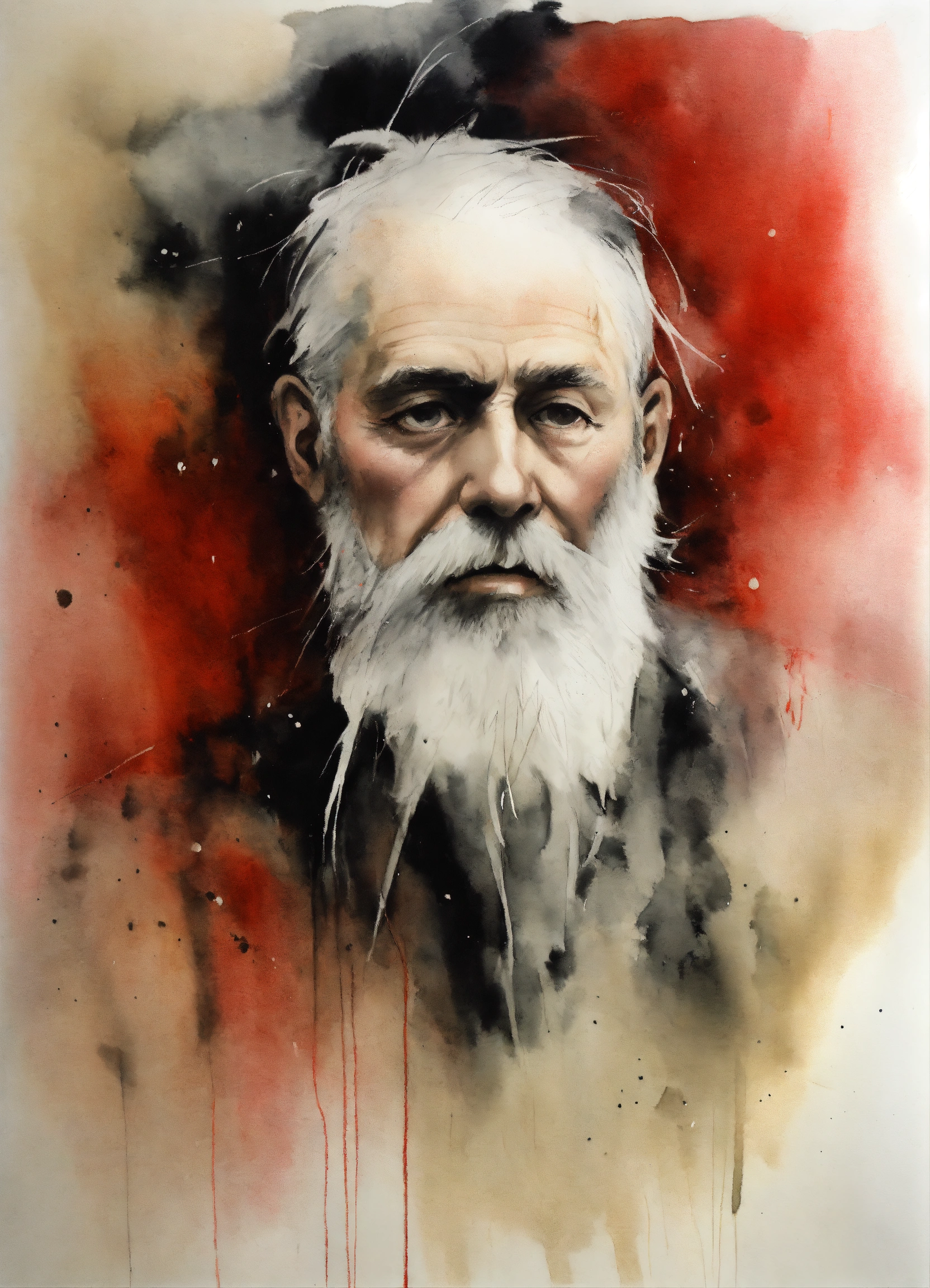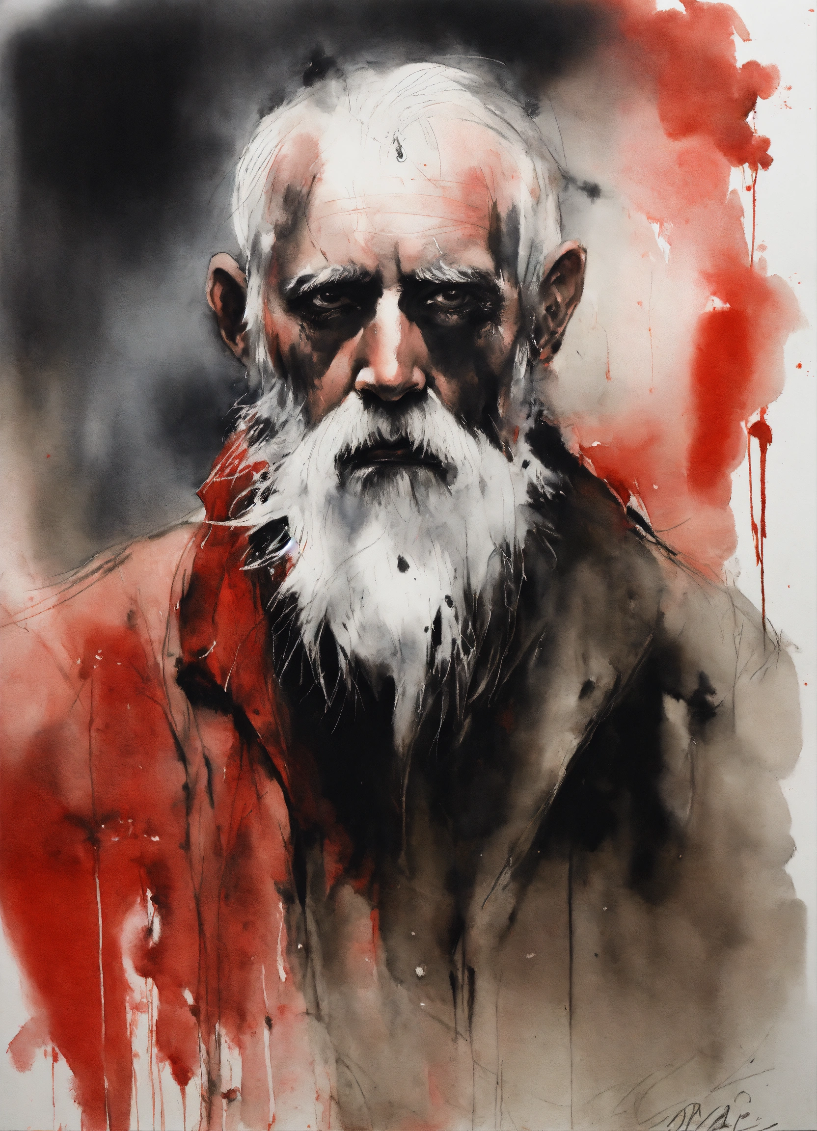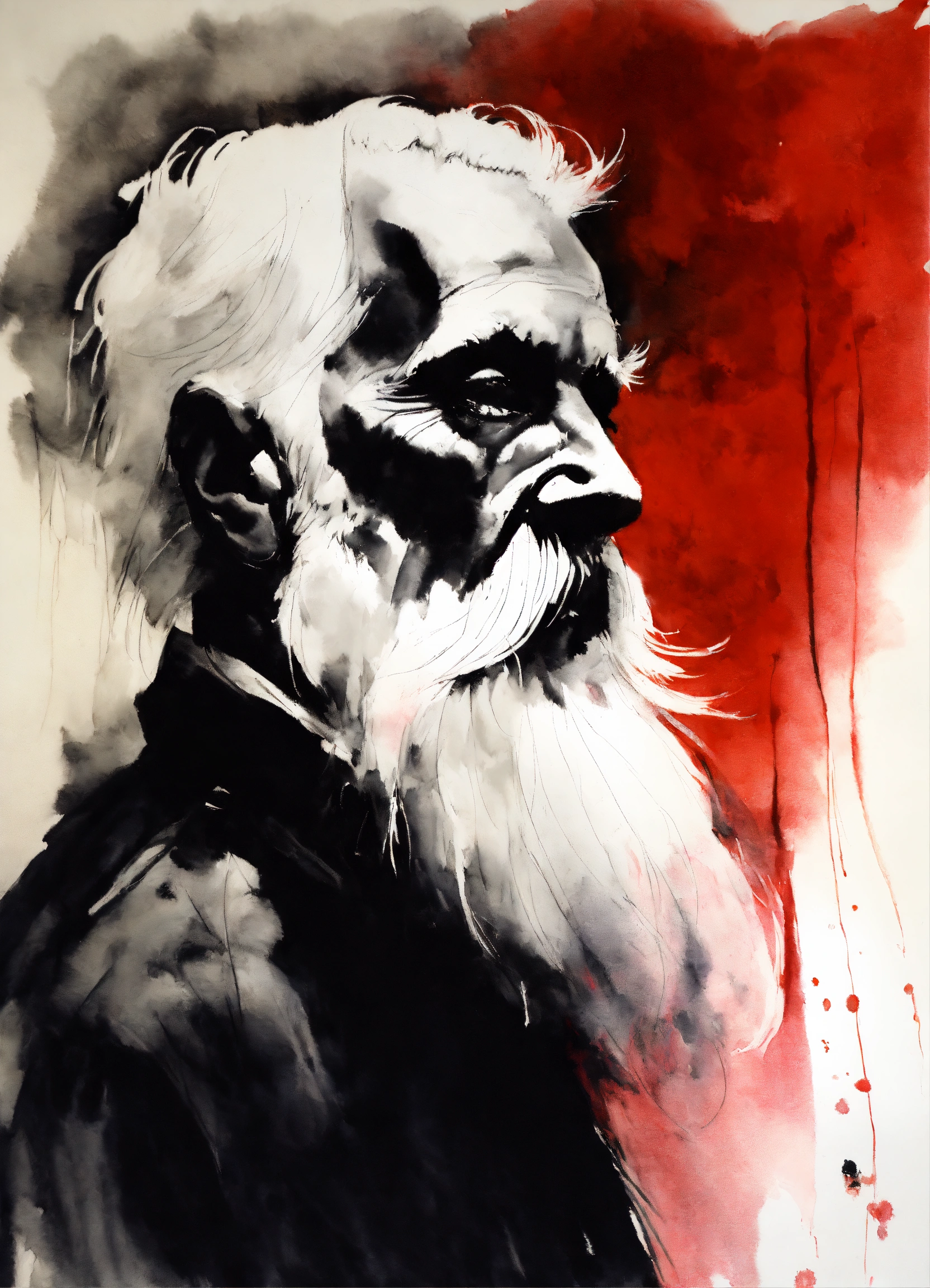 Stephen gammell style, dessin, aquarelle, aquarelles, noir et blanc et rouge, de marais, de sombres créatures, dégoulinant, un homme d'un certain age, avec une barbe blanche a man of a certain age, with a white beard