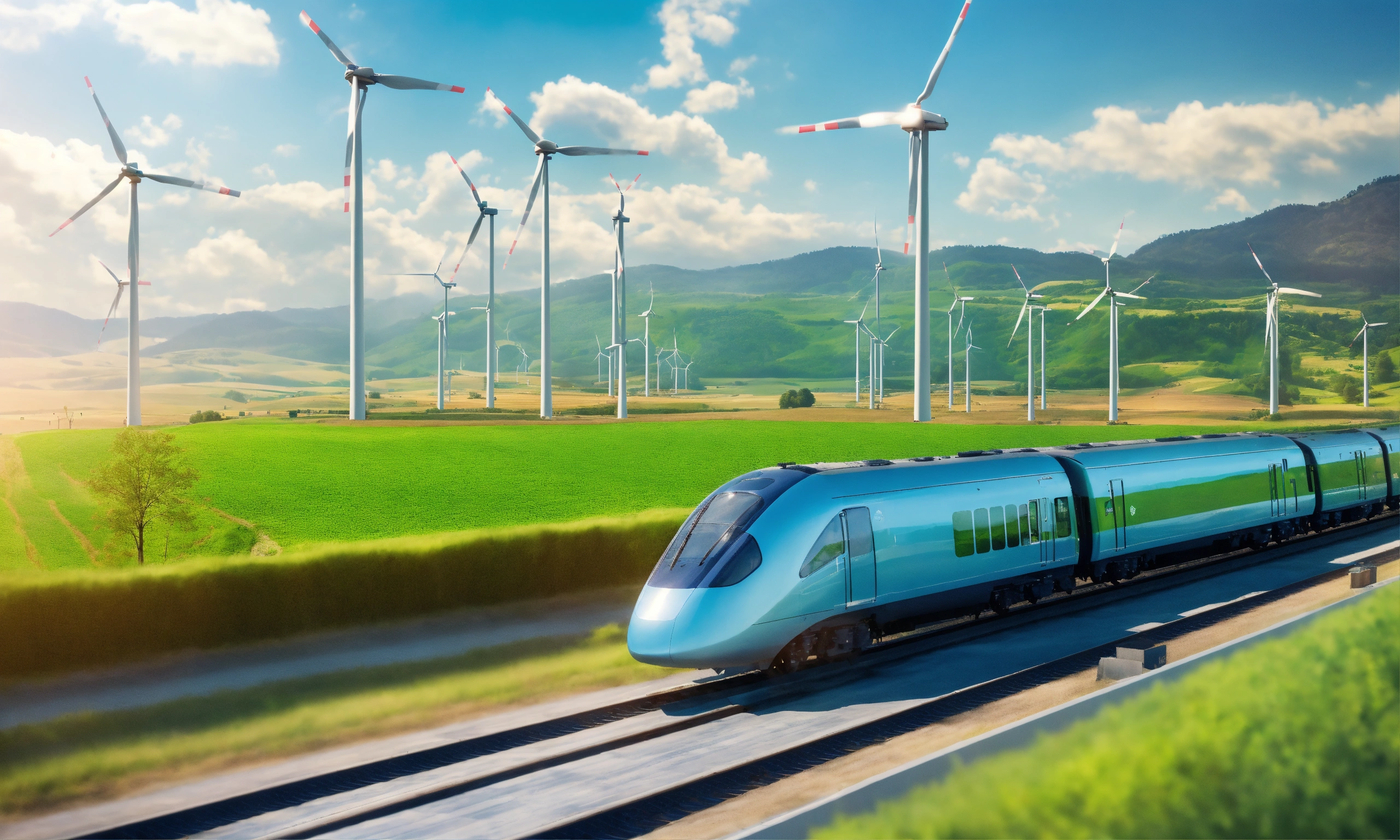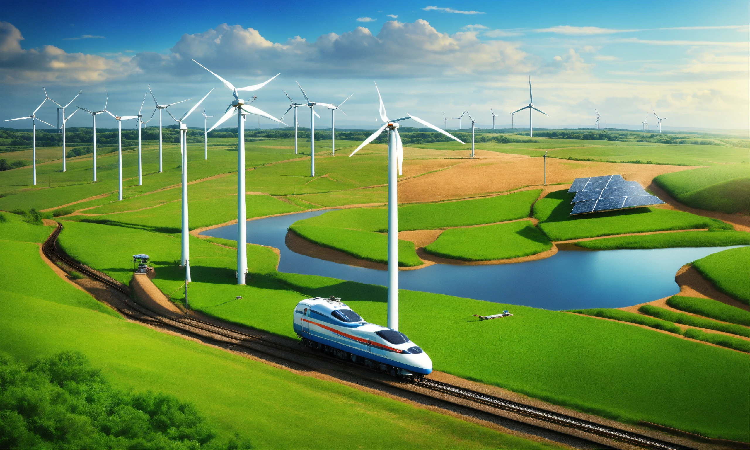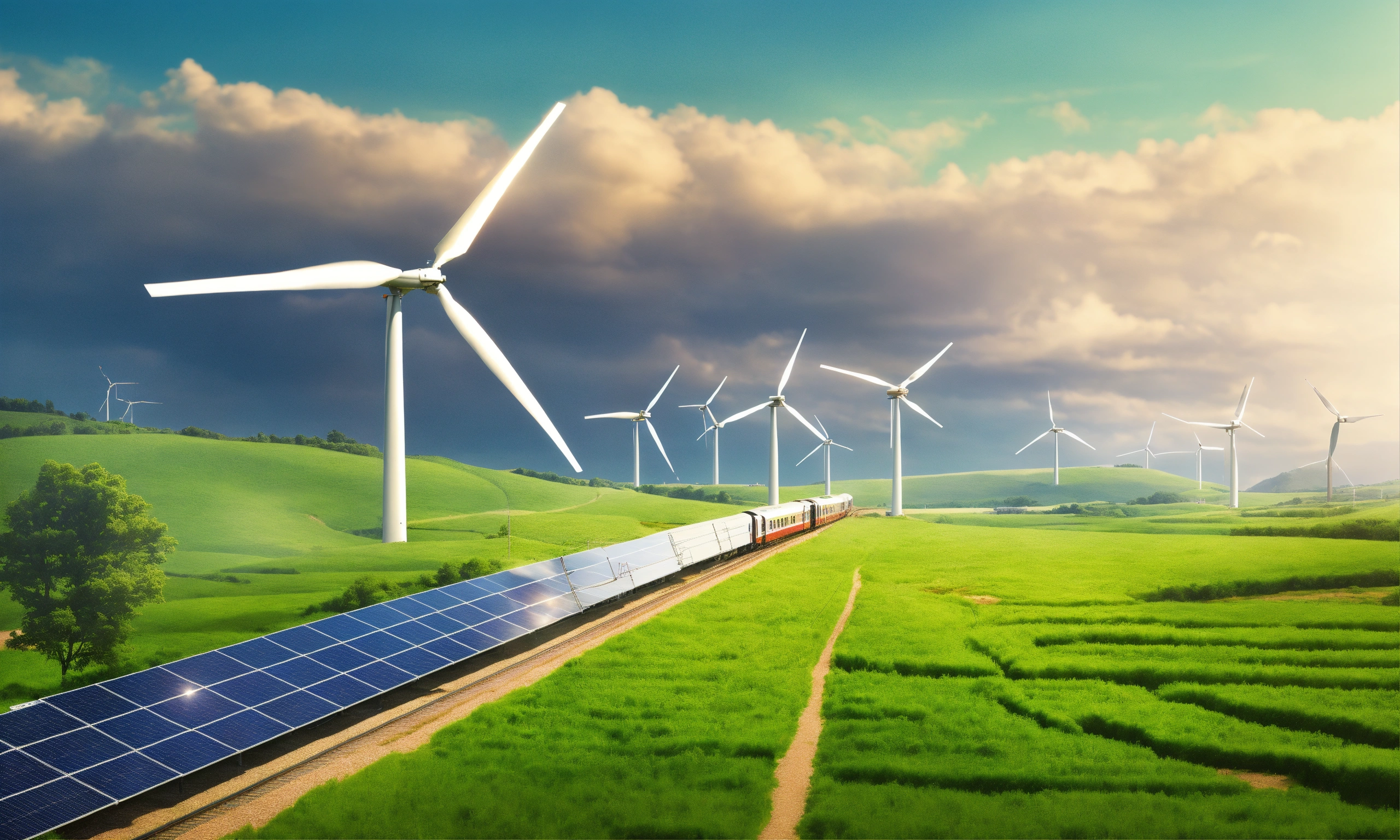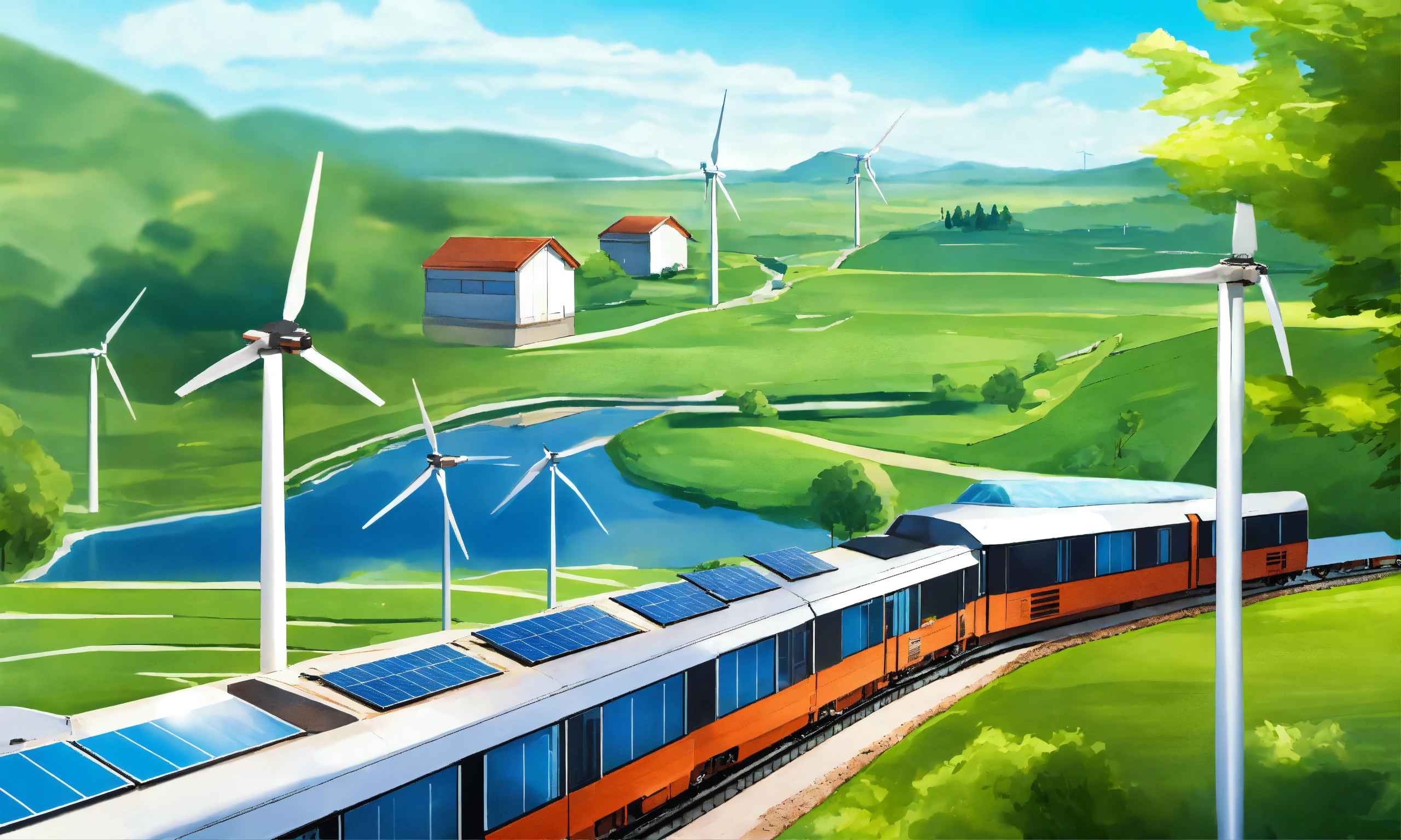 Landscape with green landscape, blue sky, some wind turbine (with realistic three rotor blades) and train, solar panels, illustration style