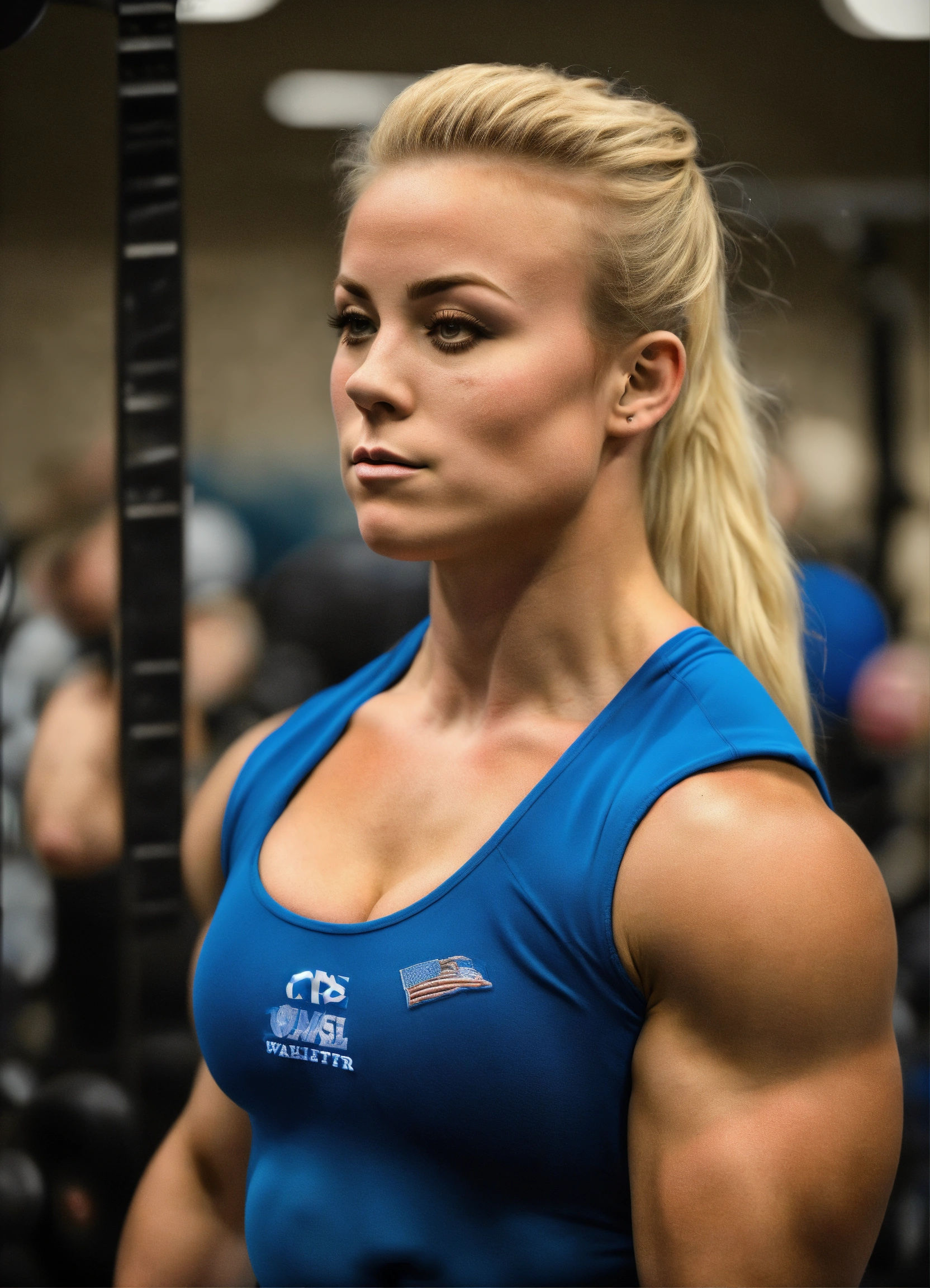 Blonde female (((powerlifter))) with the most muscular body in the galaxy and the most beutifull face, goddes of fertility, complete omnipotence