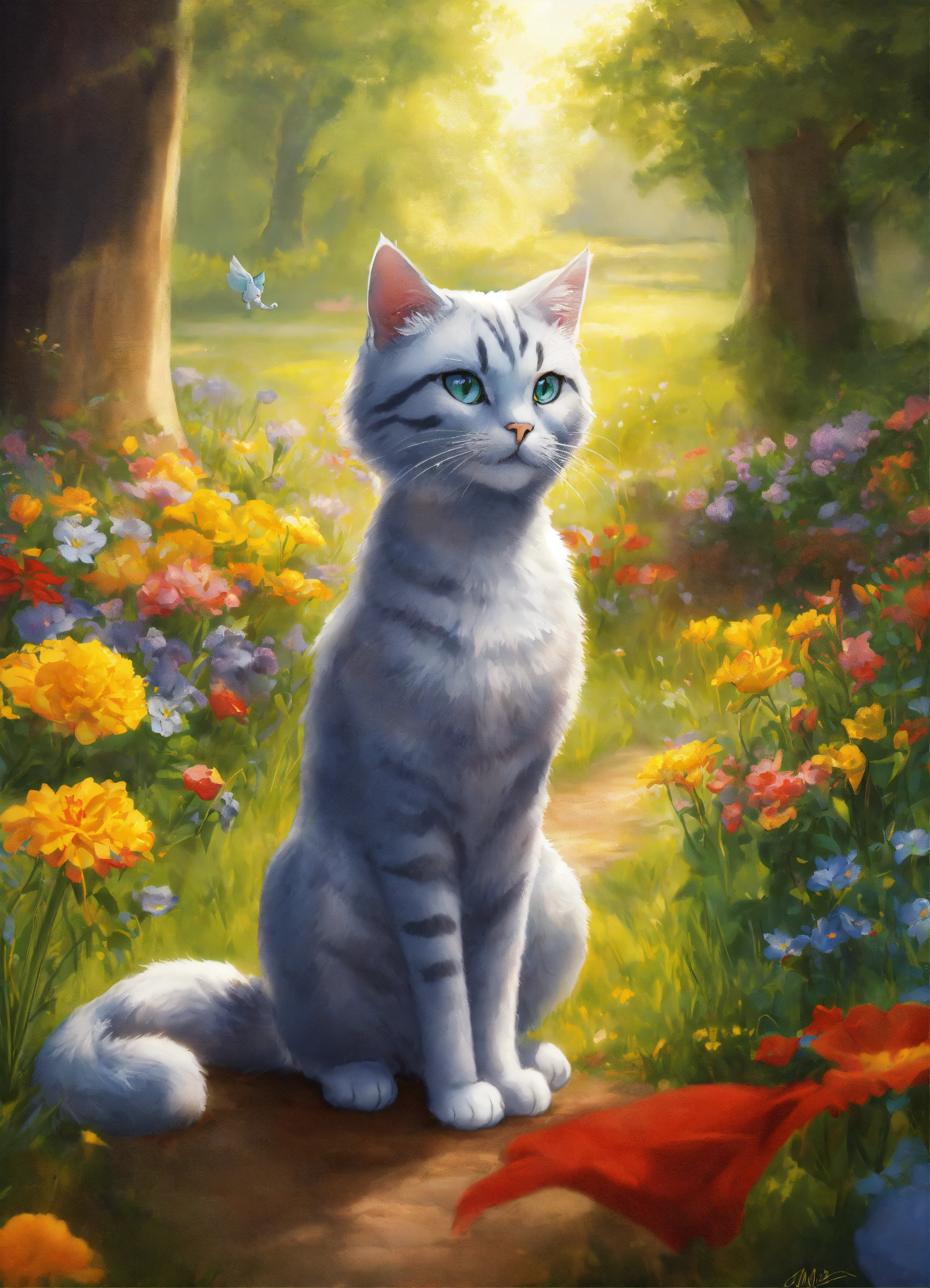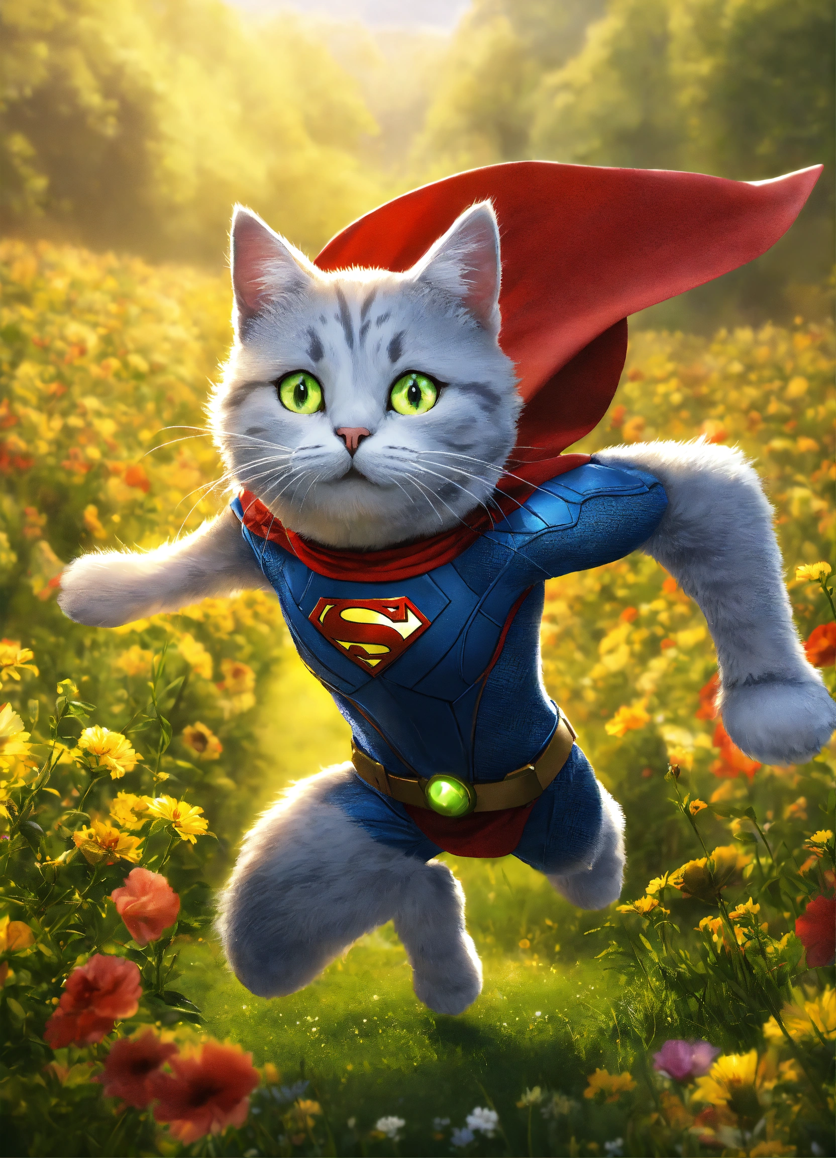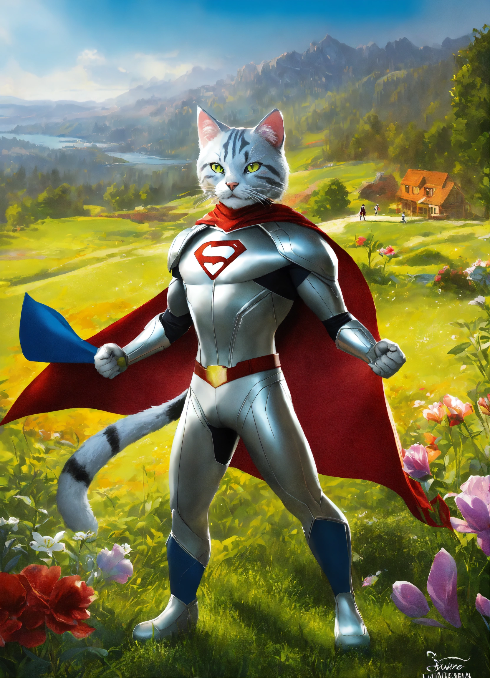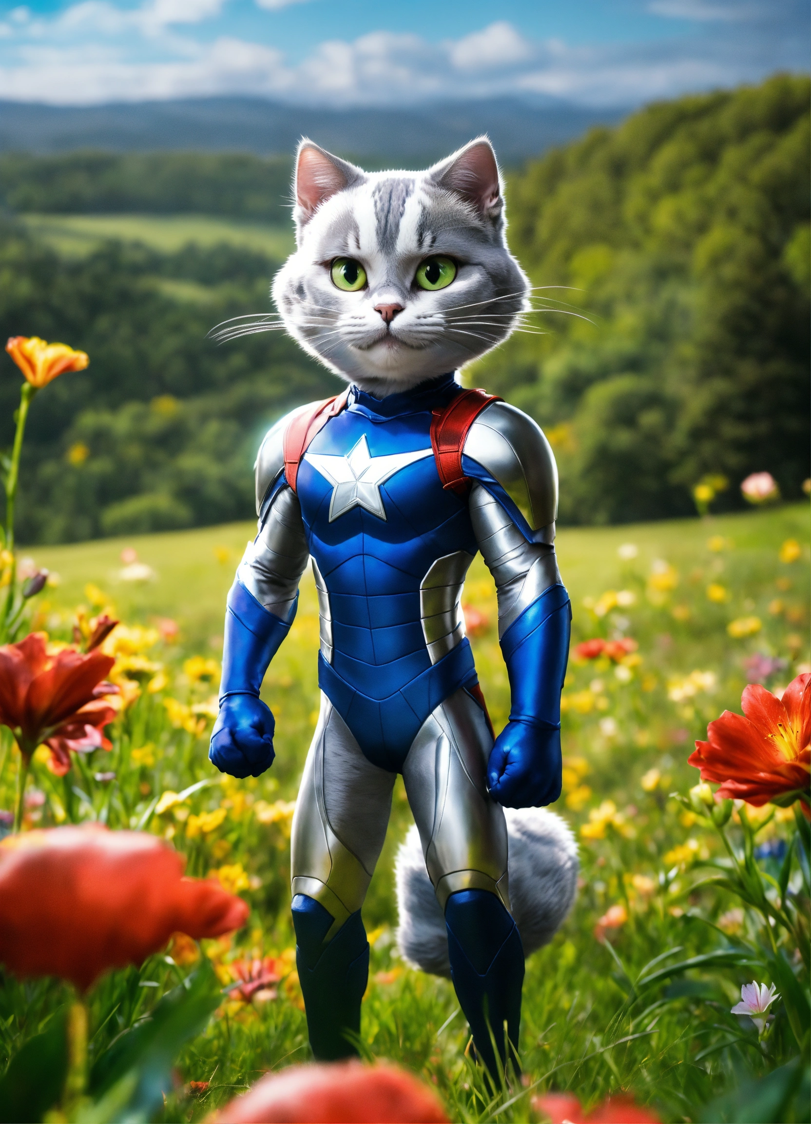 Silver (the cat) adjectives agile, mysterious, heroic verbs silver moves gracefully through the meadow, exuding the agility and charm of a marvel superhero. his animated movements are captivating, evoking the style of animation pixar. silver has a sleek, superhero-like costume with a hint of mystique that adds to his aura of intrigue and adventure. with his enigmatic yet heroic appearance, silver complements the scene in the meadow, making the trio of characters even more compelling and visually captivating. his partnership with lily and max creates a group of characters that blend the excitement of superhero adventures with the charm of animated storytelling.