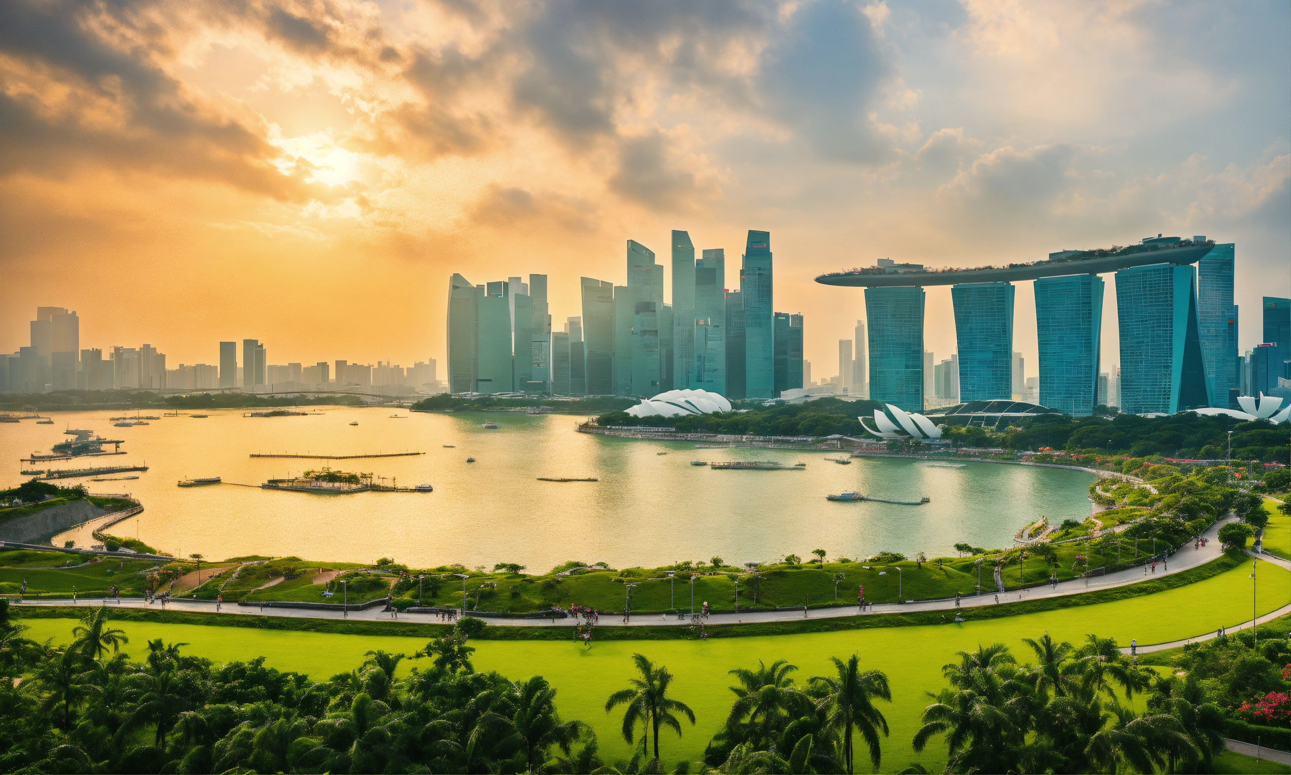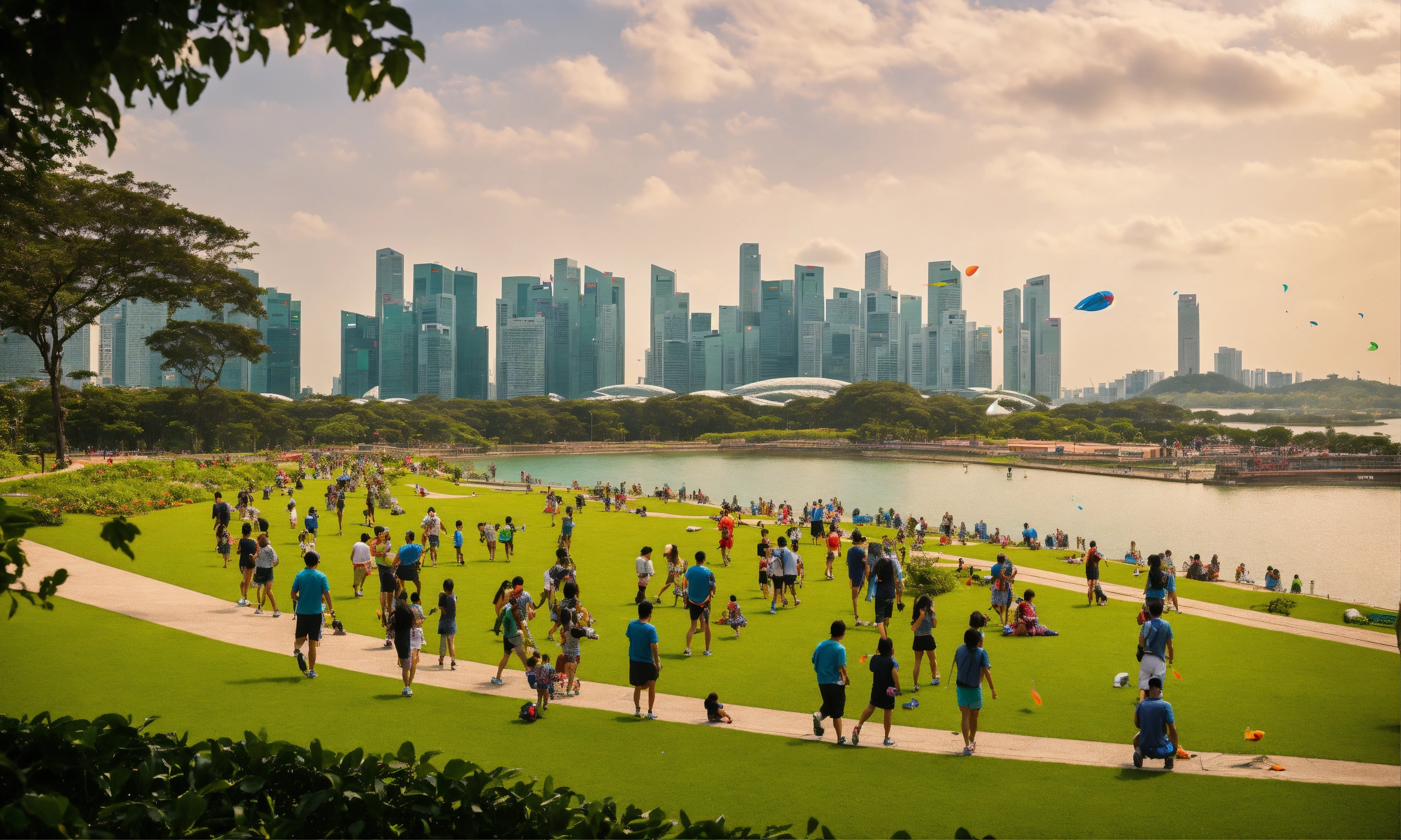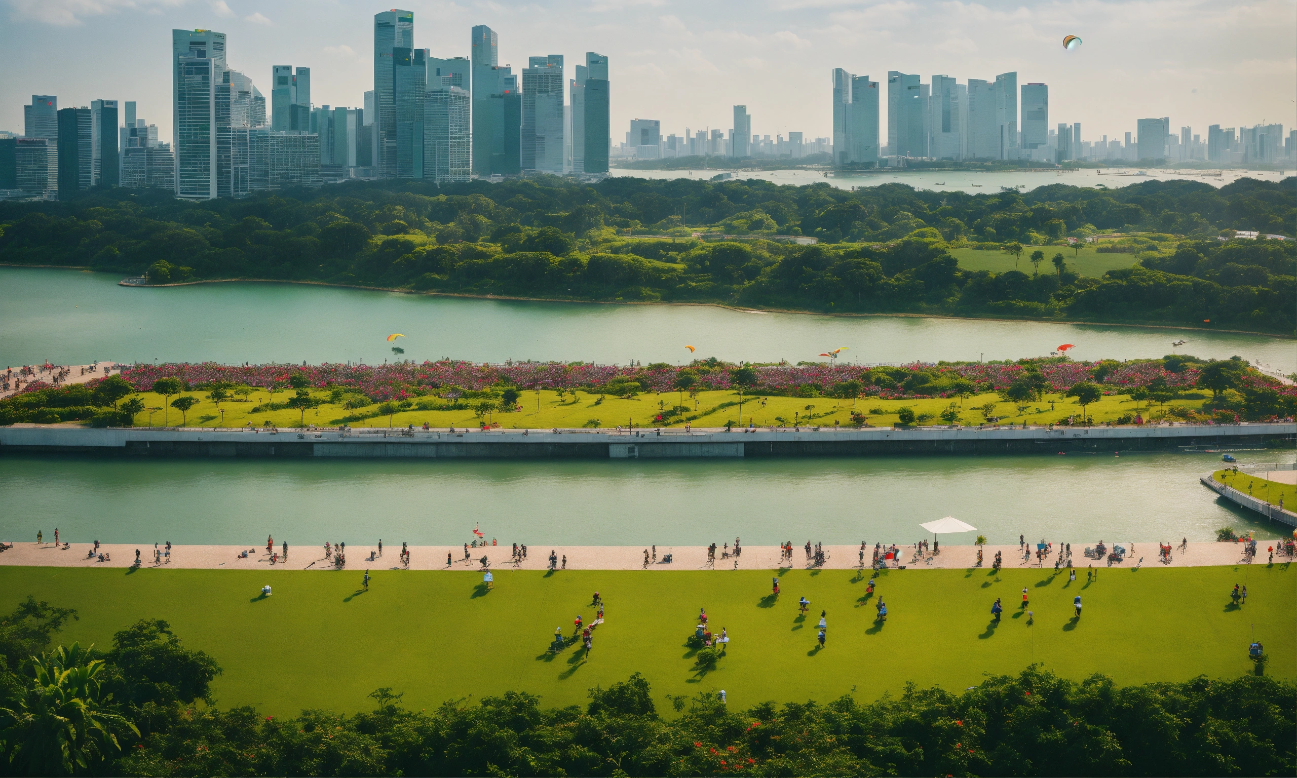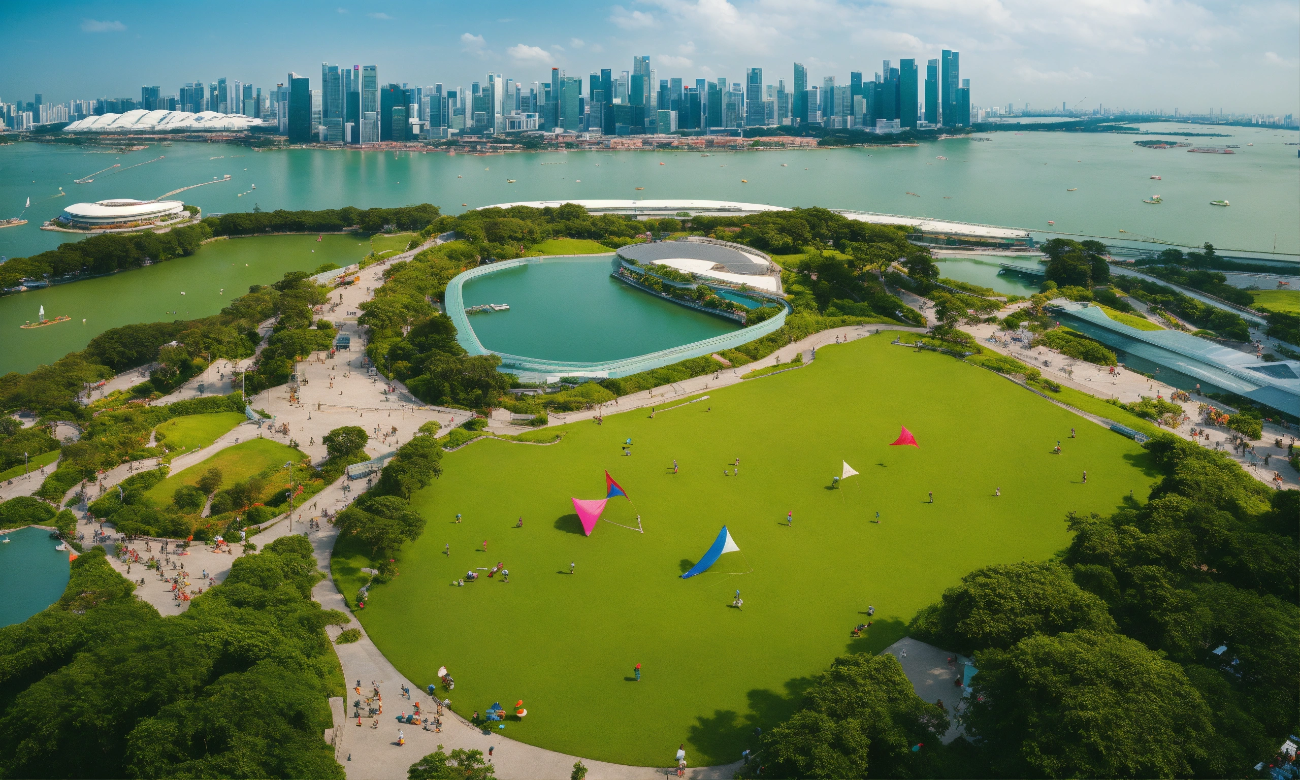 Ultra-realistic photo, cinematic quality, afternoon setting, aerial view capturing the activity on the vast green rooftop singapore's marina barrage the barrage is packed with people with families flying kites, joggers taking in the view, and tourists snapping photos; modern urban attire, expressions of awe and relaxation. under the bright afternoon sun, the barrage gleams, showcasing its marvel of modern engineering. in the backdrop, the lush east coast park and shimmering waters of the bay contrast beautifully with the green rooftop. themes modern nostalgia, juxtaposition of nature, sustainable infrastructure, and recreation, reflections on the water's surface, 70mm camera to capture vast expanse, portra 400 film for rich contrasts and colors, slight film grain for added texture