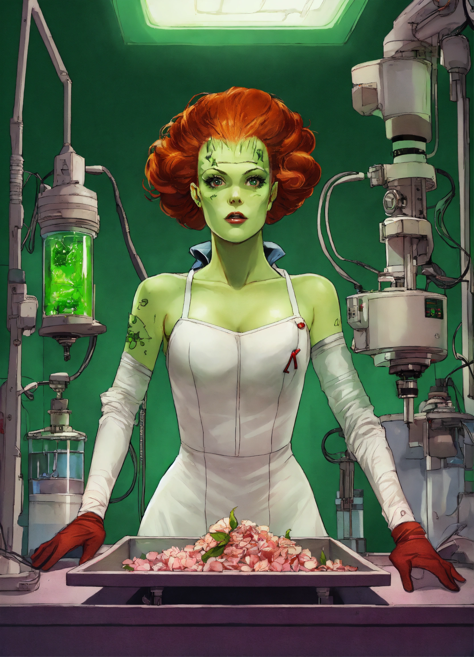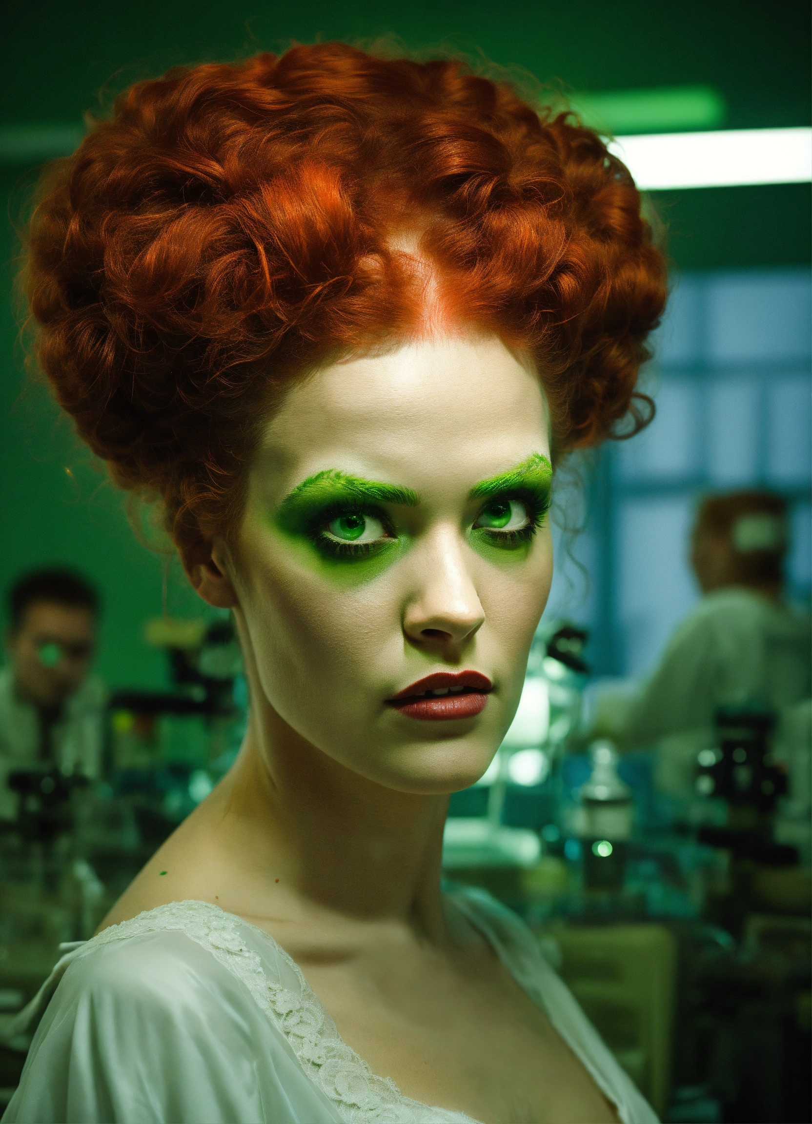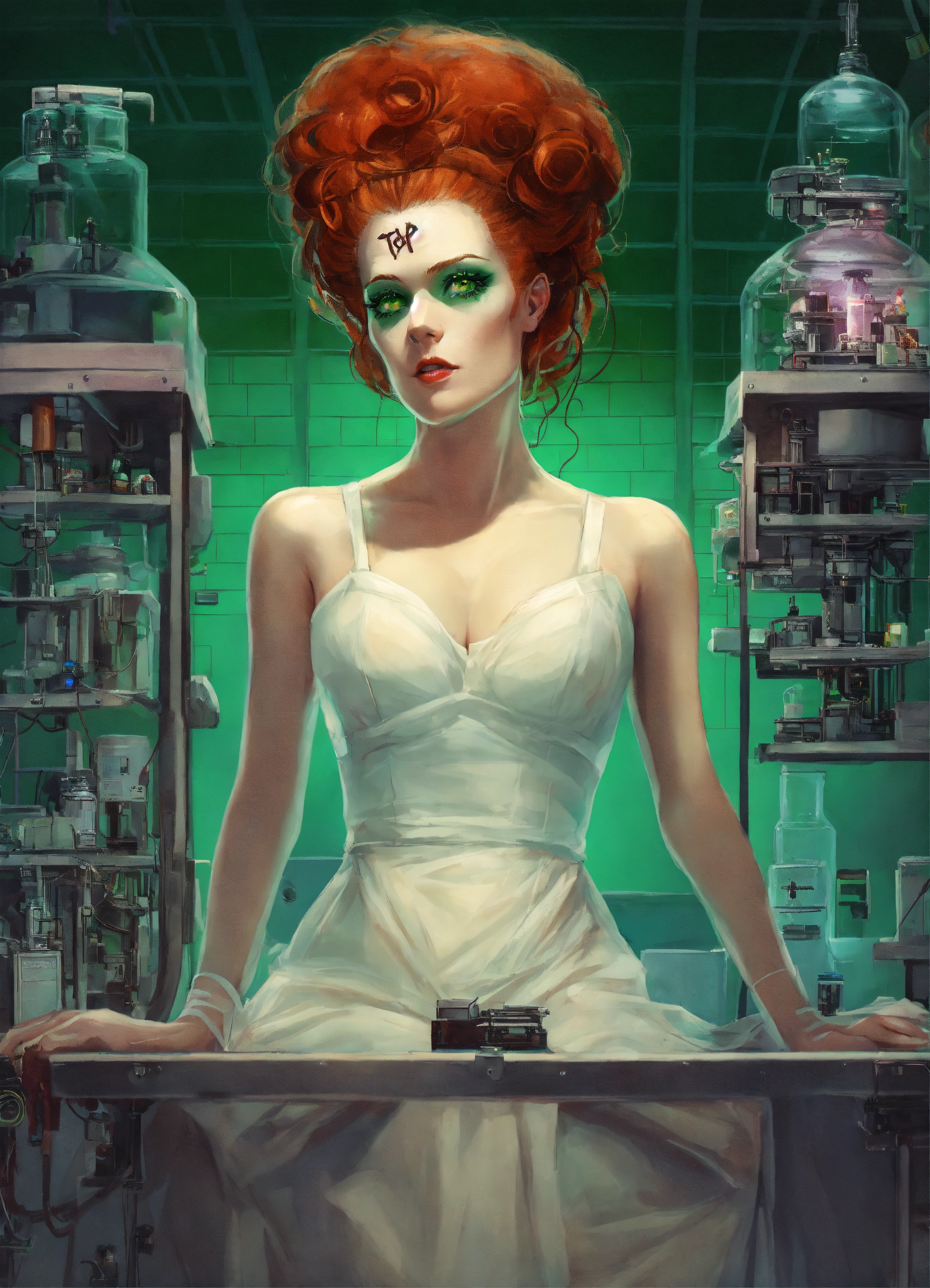 Redheaded green-eyed woman as the bride of frankenstein, rising up off from on top of an operating table from her back in a laboratory.