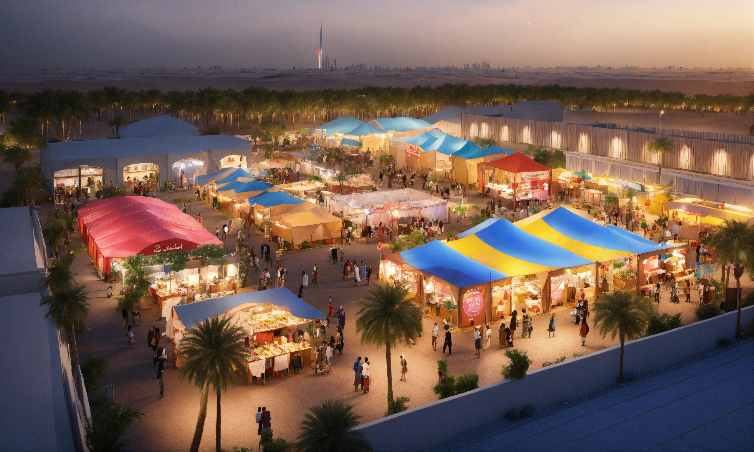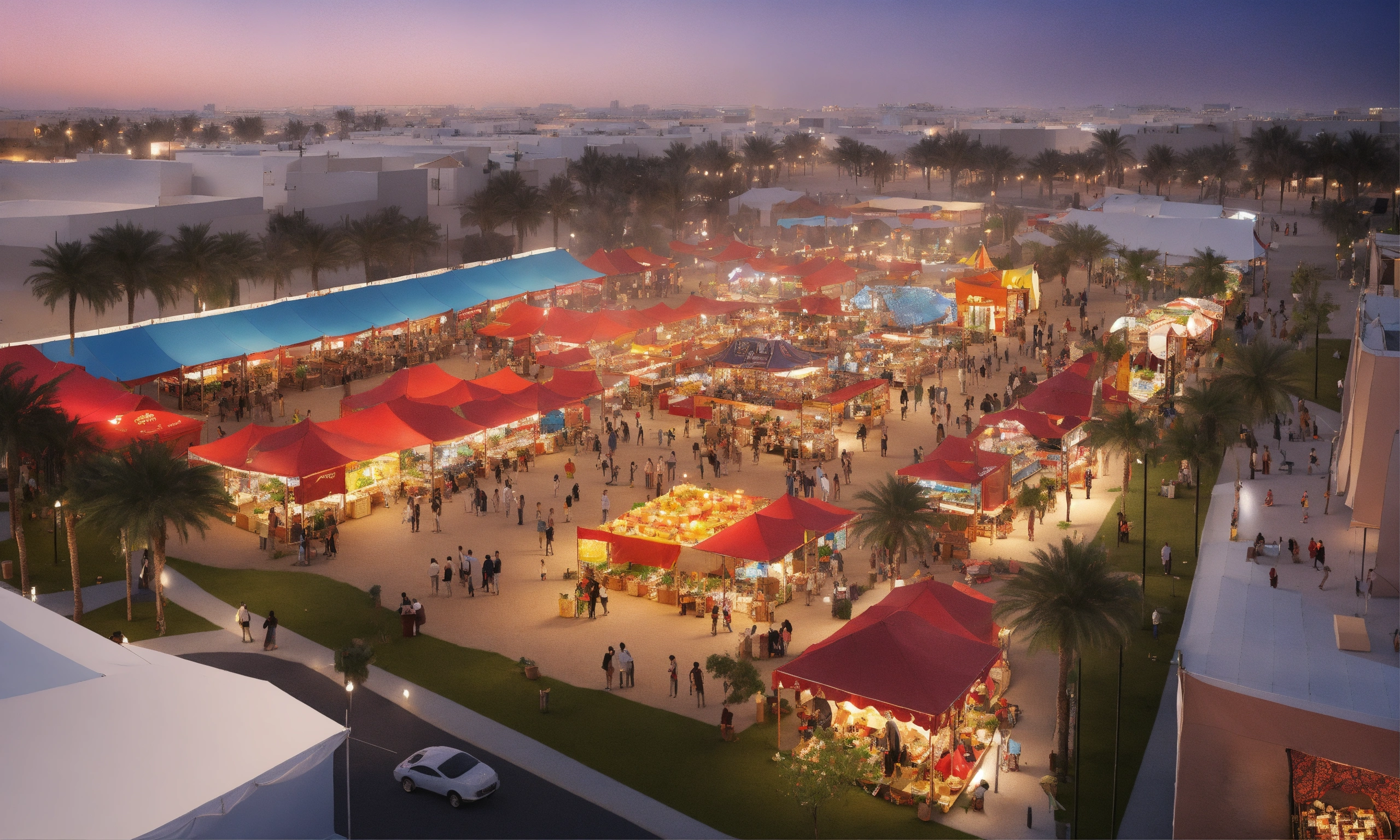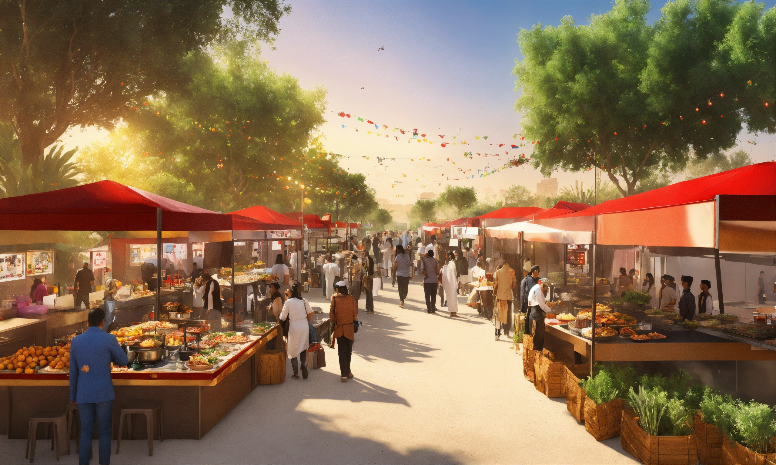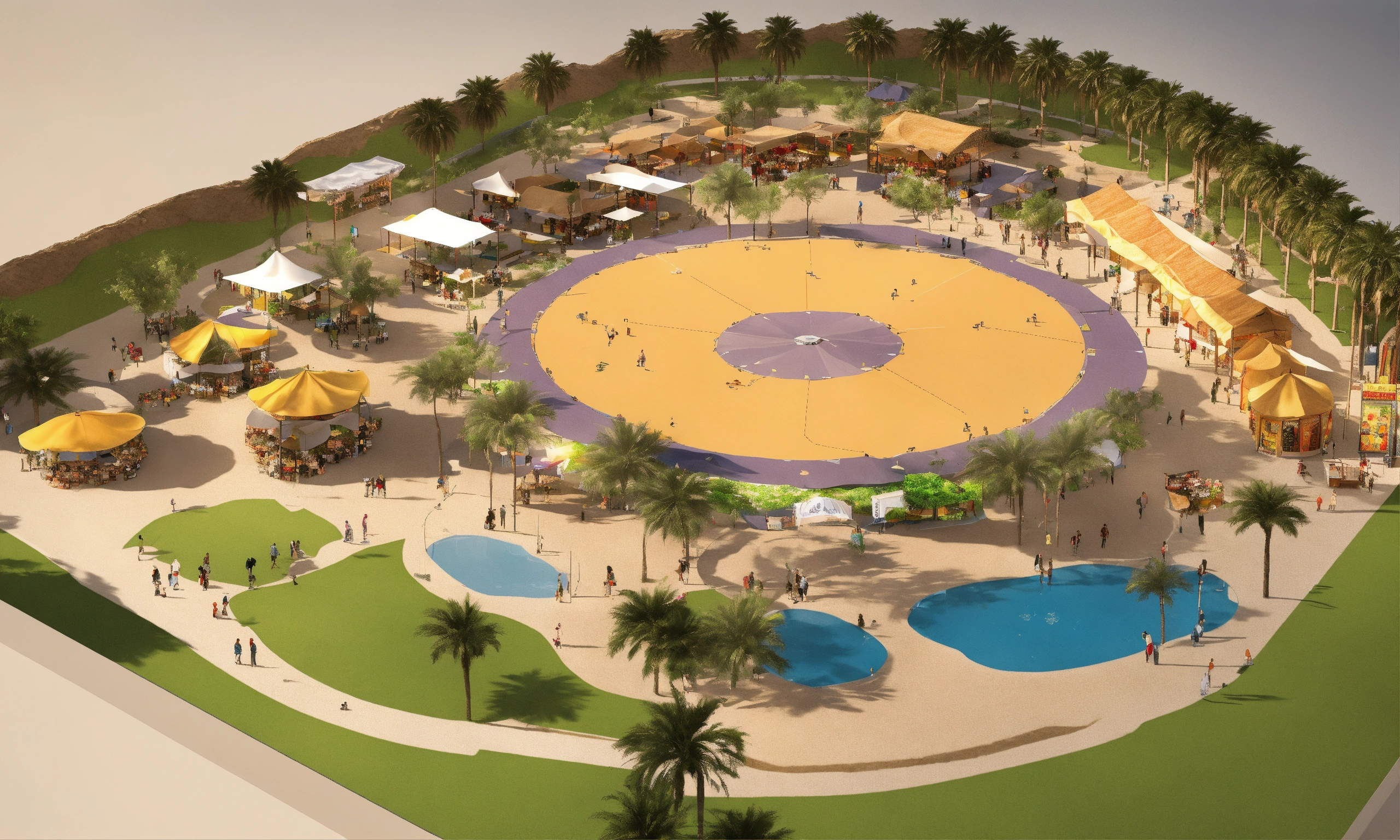 Produce a comprehensive floor plan image for the 'bahrain oasis street food festival a culinary and cultural journey.' desert environment, this plan should feature key elements such as the layout of traditional bahraini street food stalls, tent-shaped food kiosks, the main stage, kids' area, entrance arch, and the themed wayfinding system, providing an overall visual representation of the festival's design and organization.