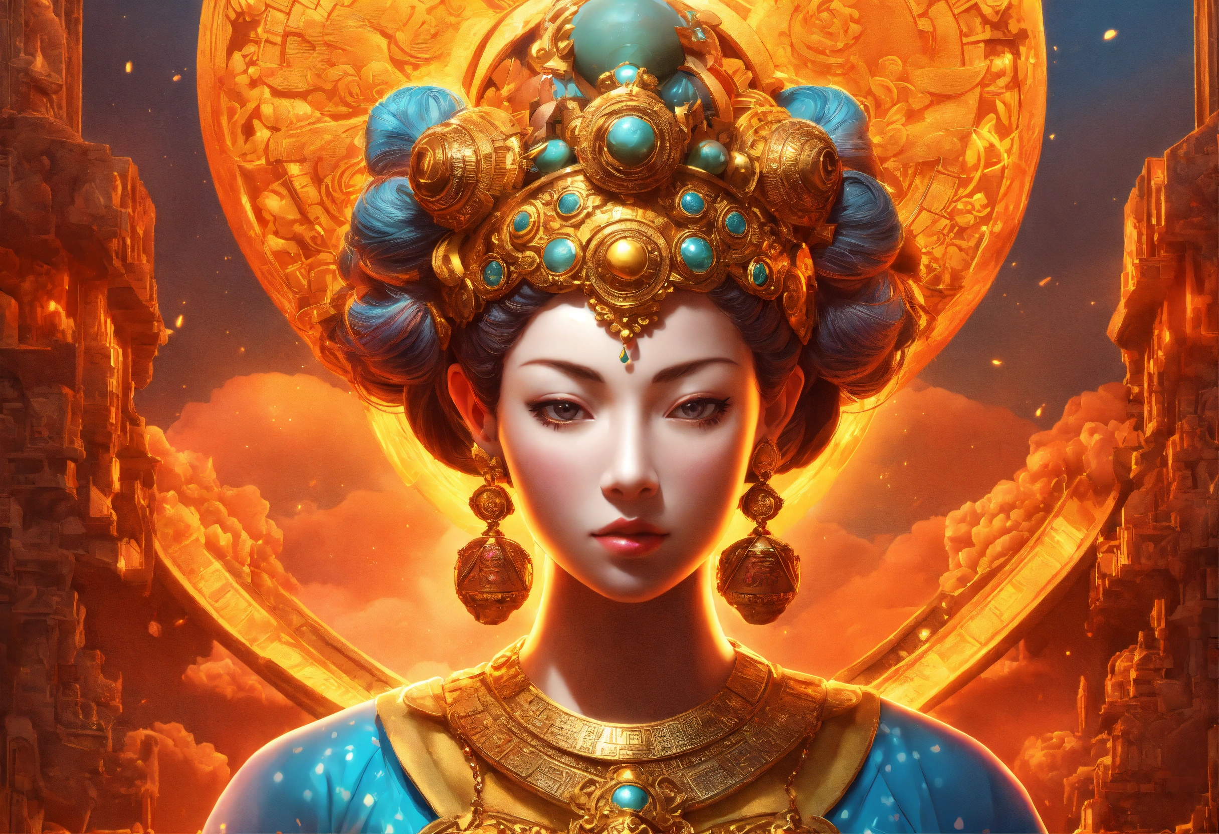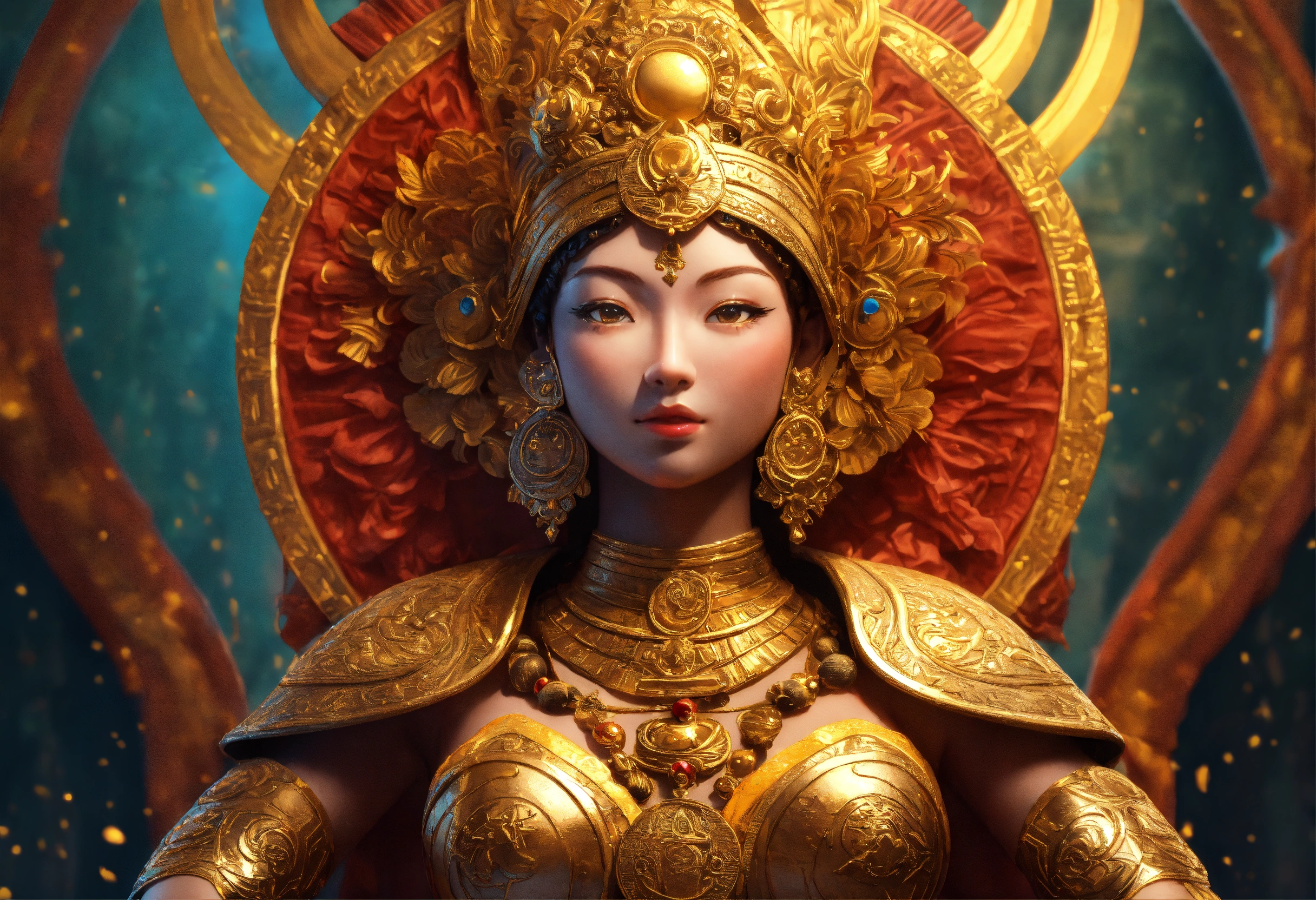 In this image, you can see a female deity depicted in a frontal view. the style of the illustration is a combination of cartoon, realistic, and 3d elements. the resolution of the image is ultra-high quality