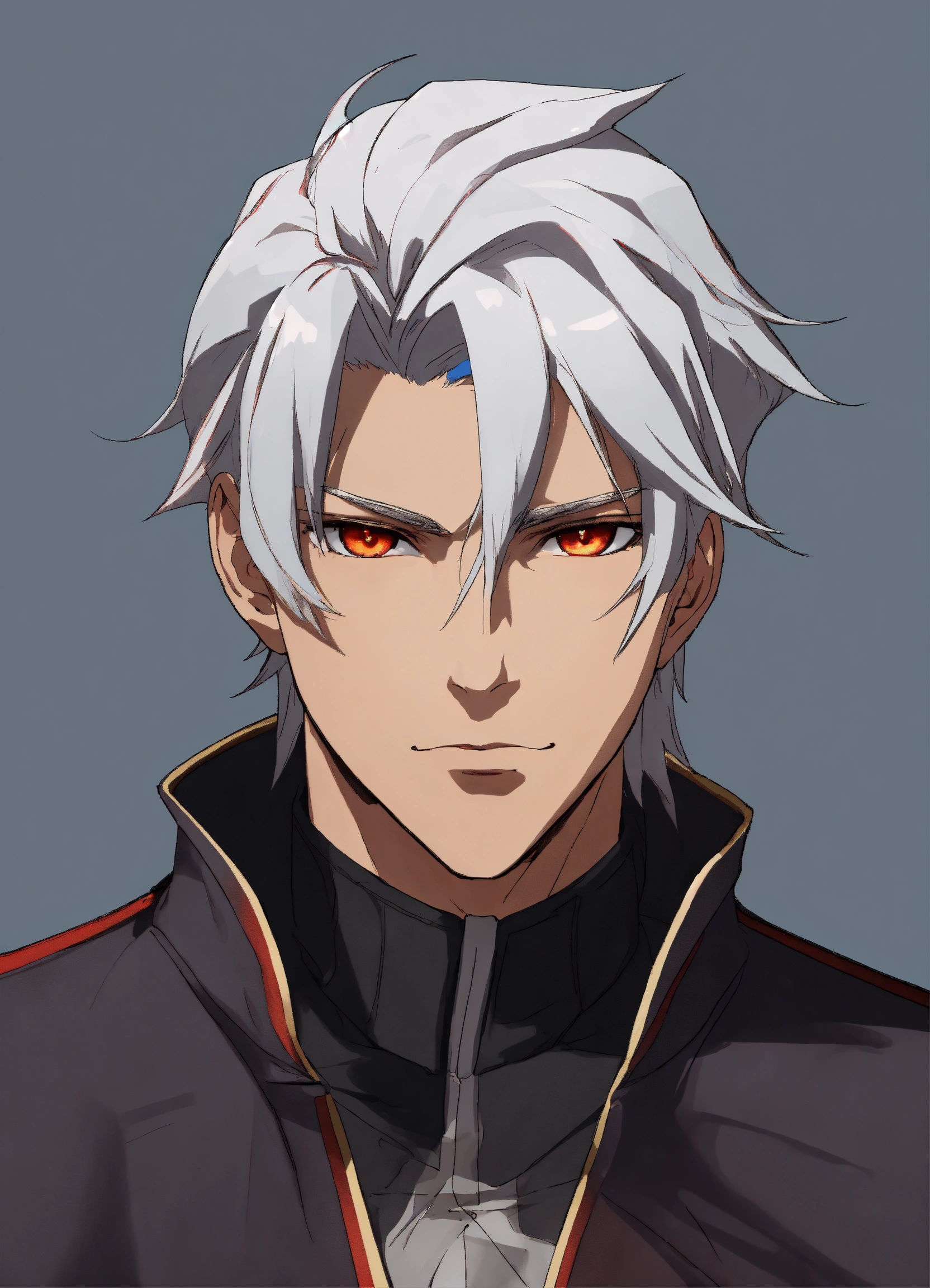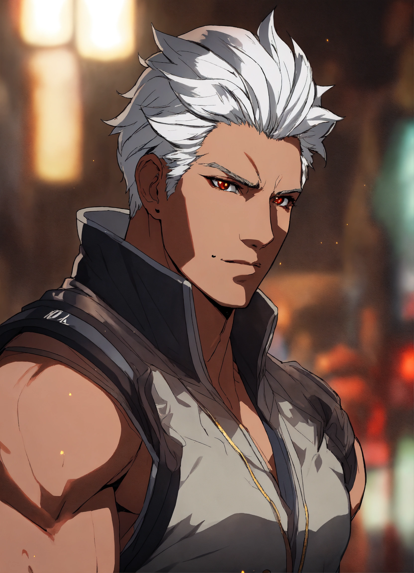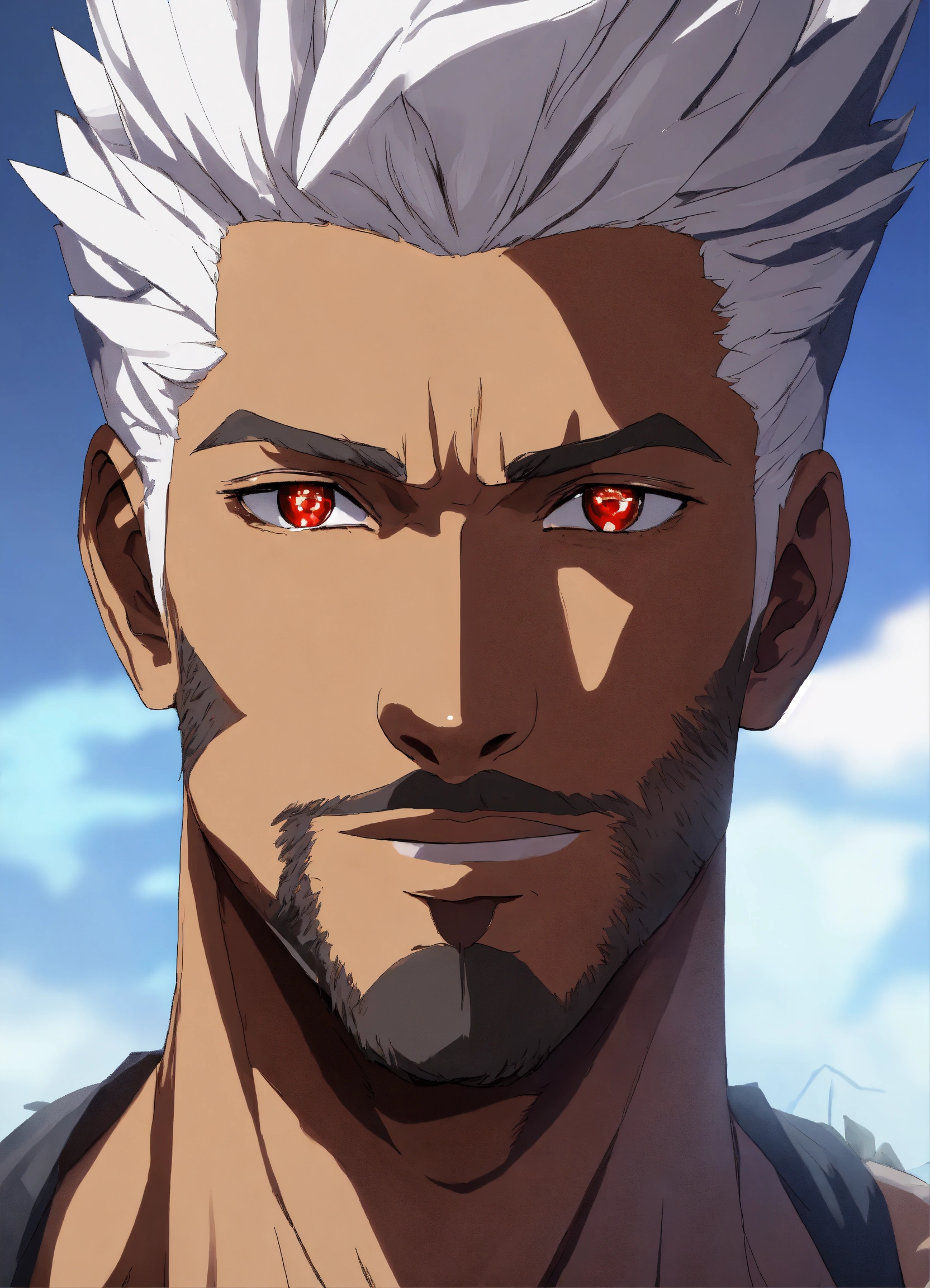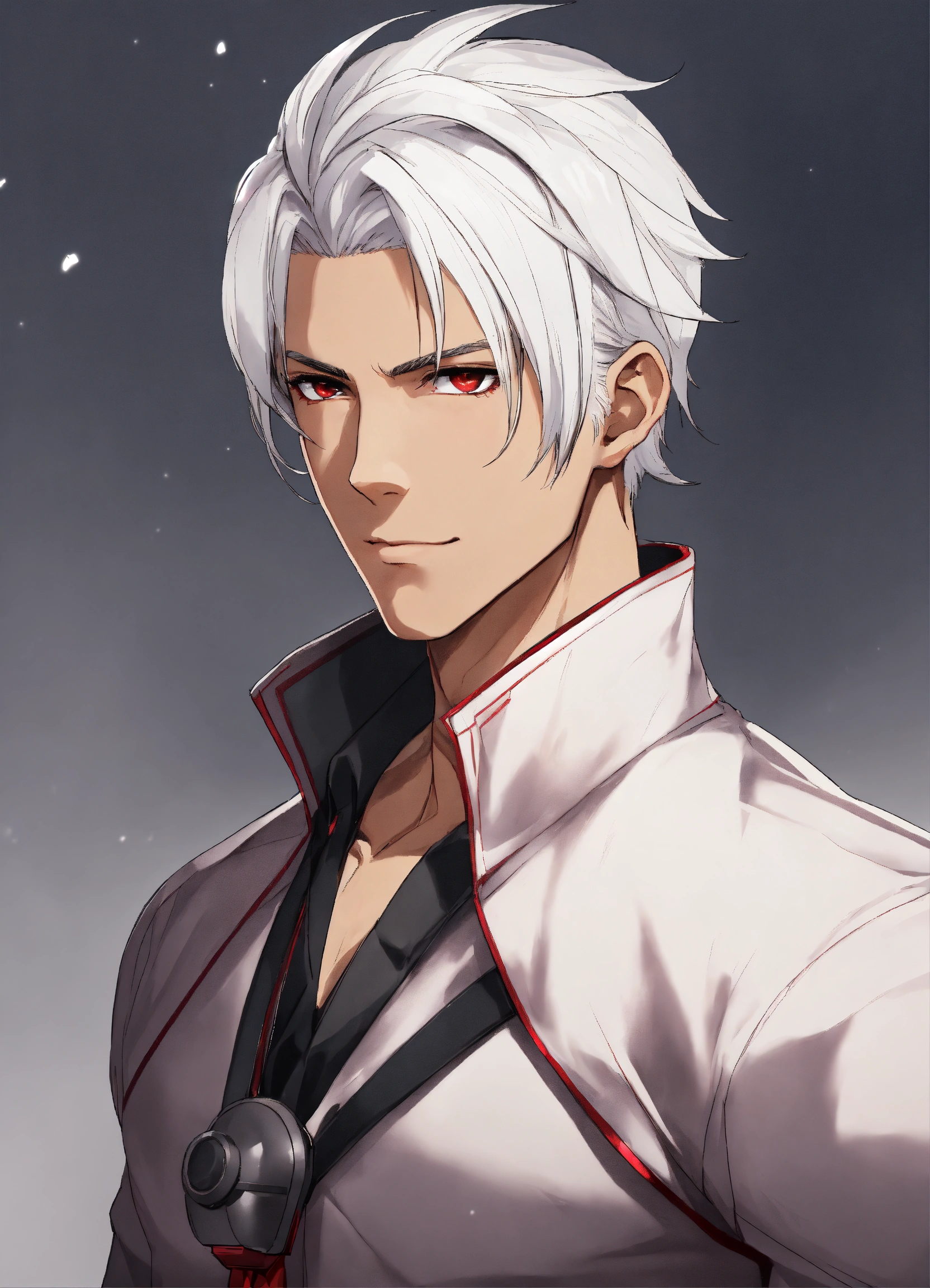 Man 40 years old. white hair. medium dark skin. sharp facial features. scarlet eyes. height 180 cm, athletic build. anime reskin style