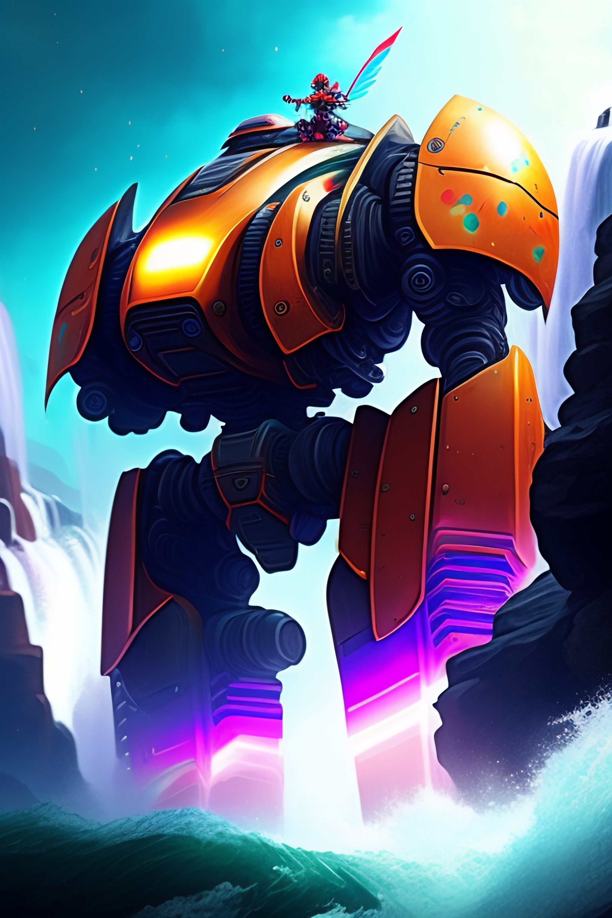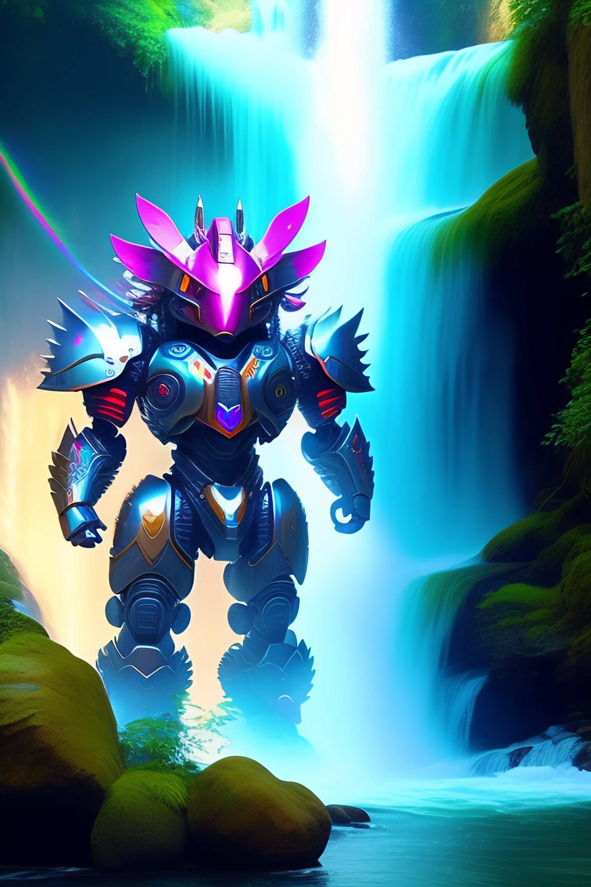 Axolotl transformer mech warrior chibi armor big manga eyes flying over waterfall with rainbows