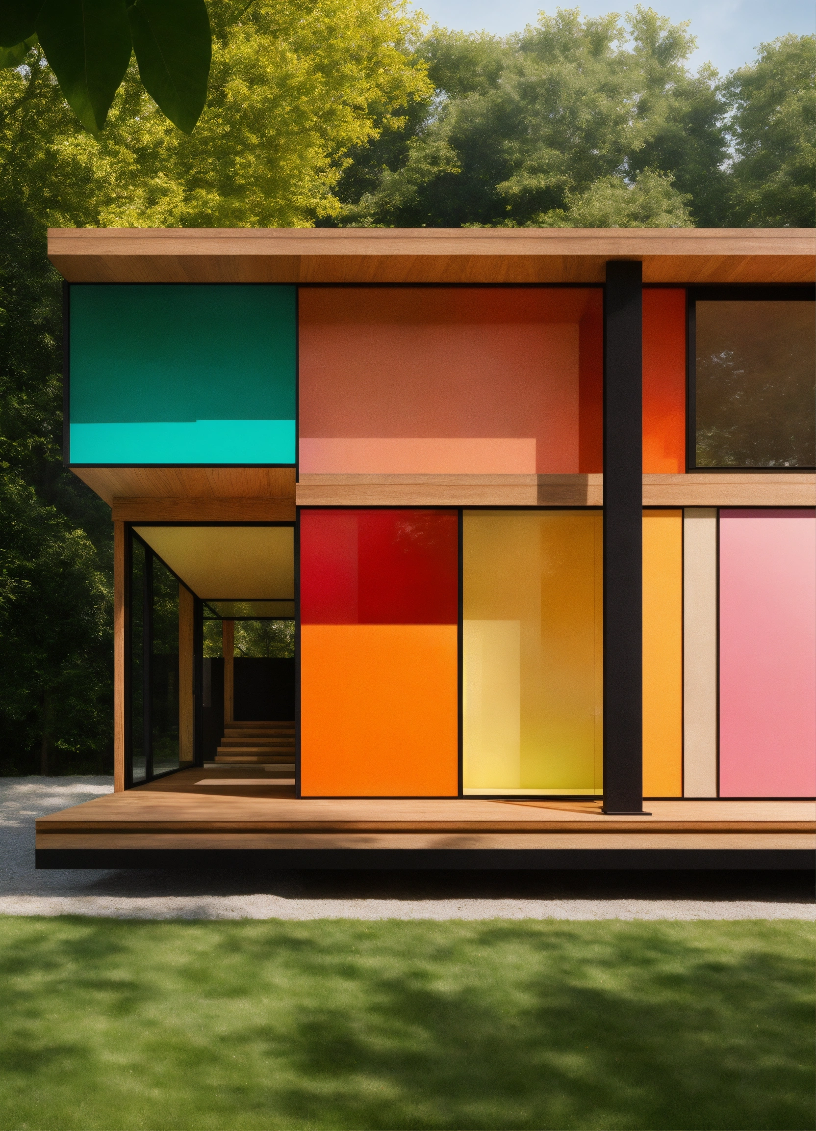 Mies van der rohe minimalist colorful plastic and wood house photorealistic from the front