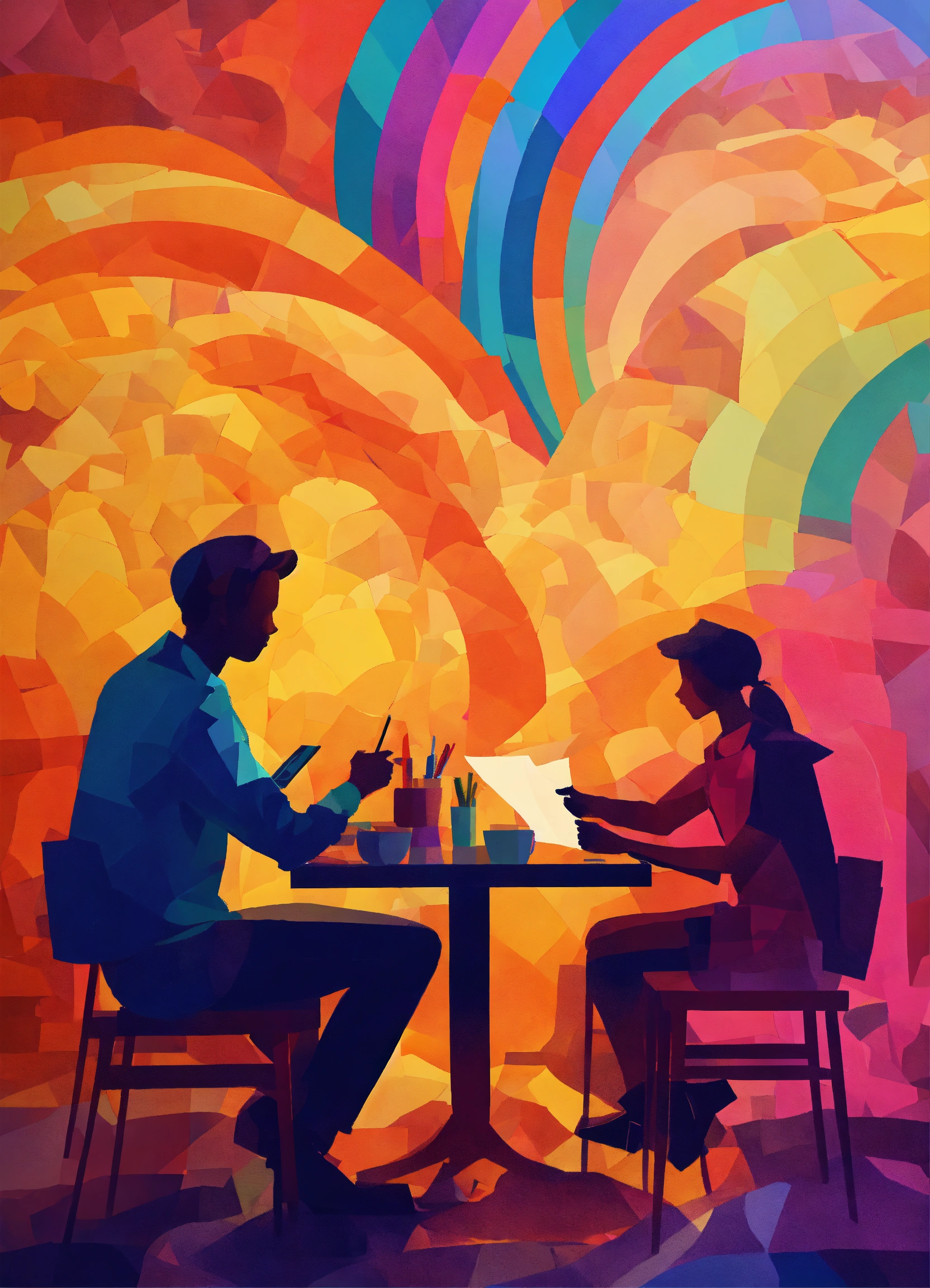 A group of friends, sitting at a table, socializing, completing a fun quiz with paper sheets at hand rainbow color, abstract, silhouette, warm ambiance, cubism art style, drawing, artwork, poster art