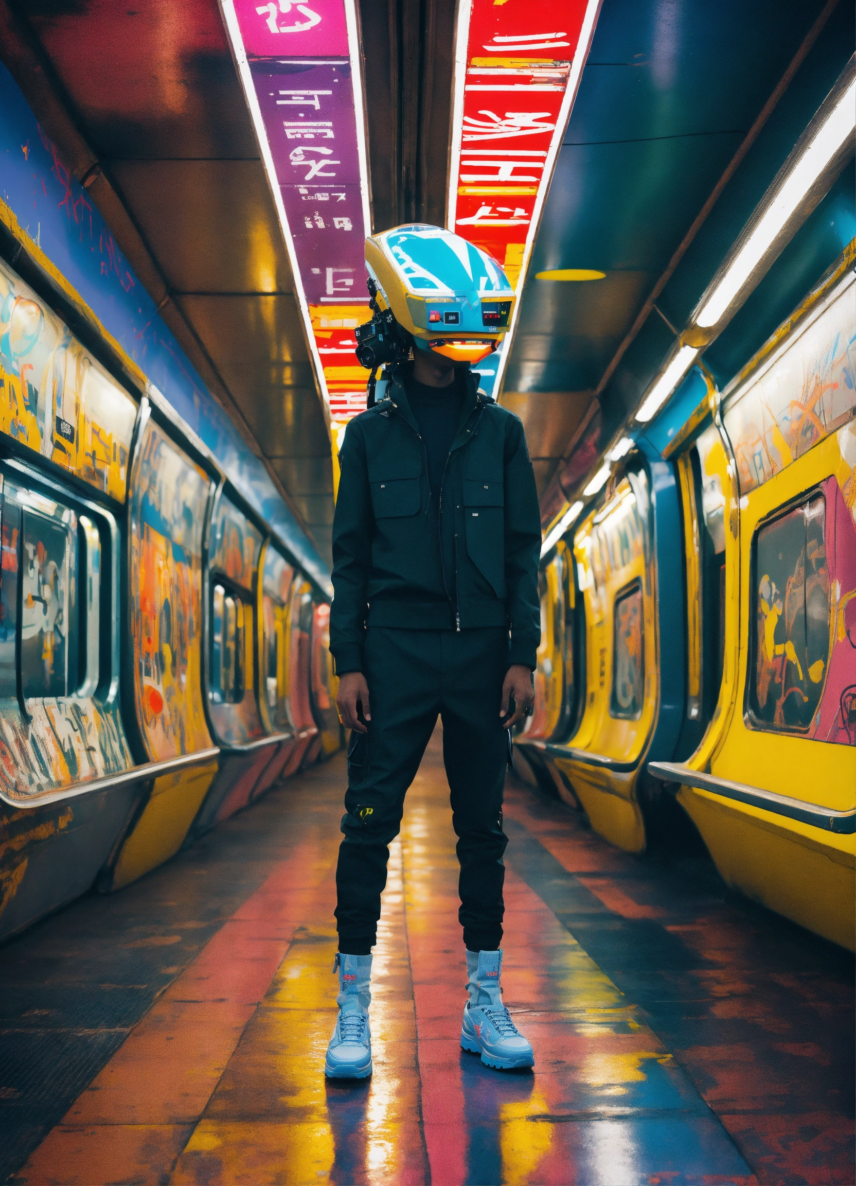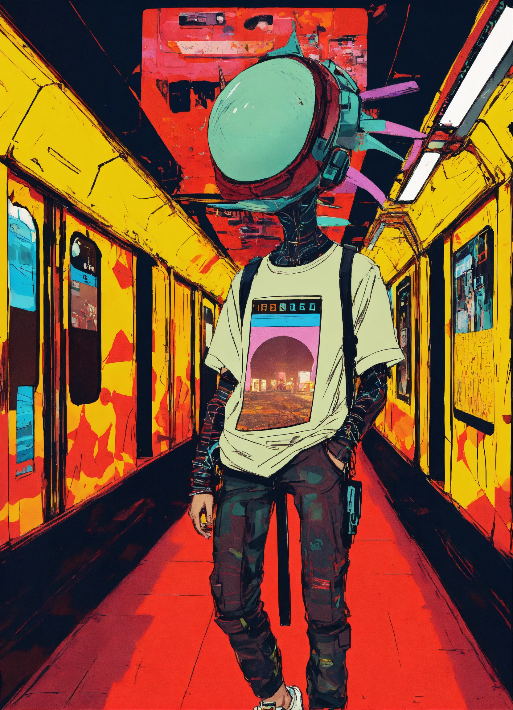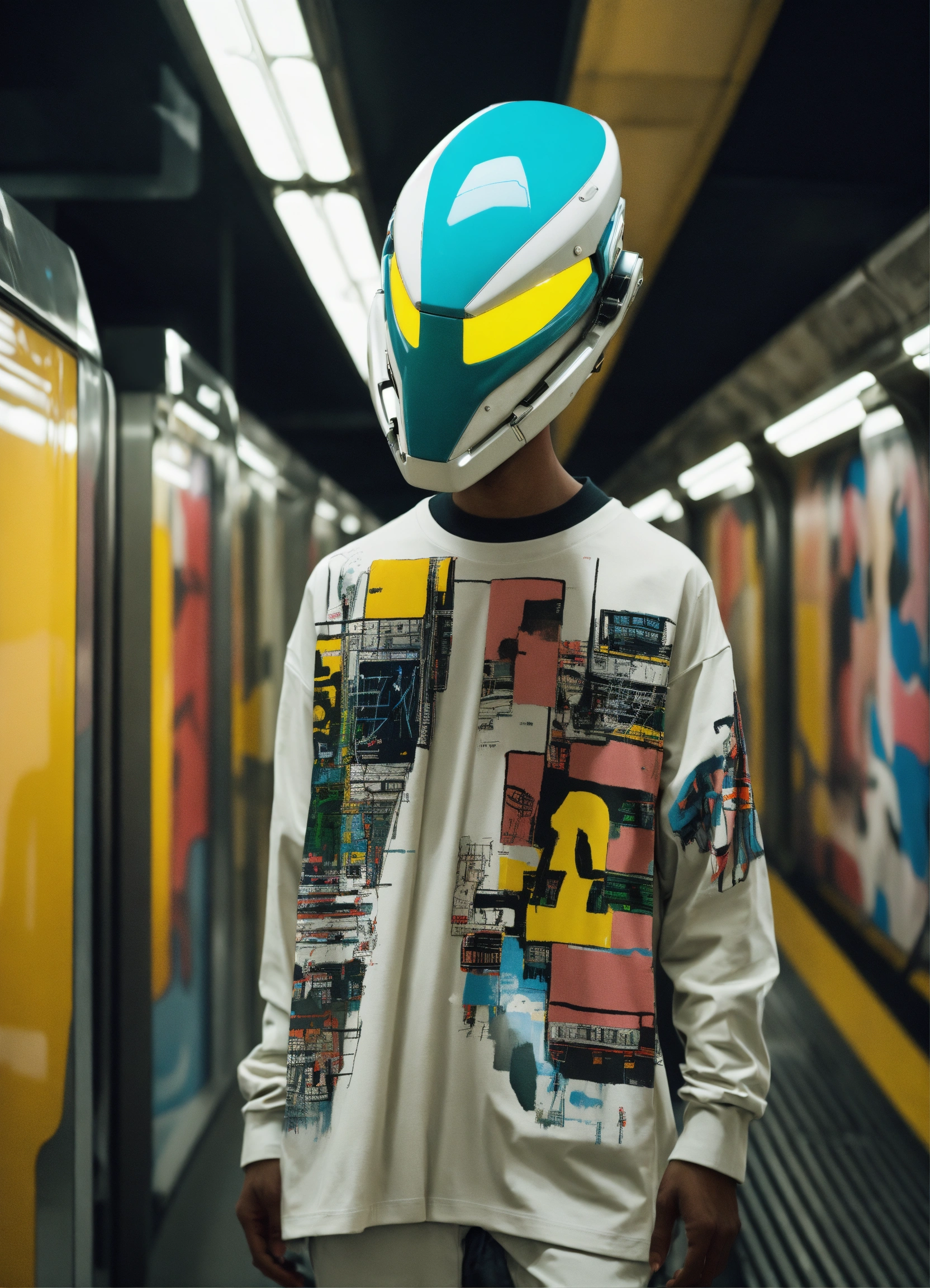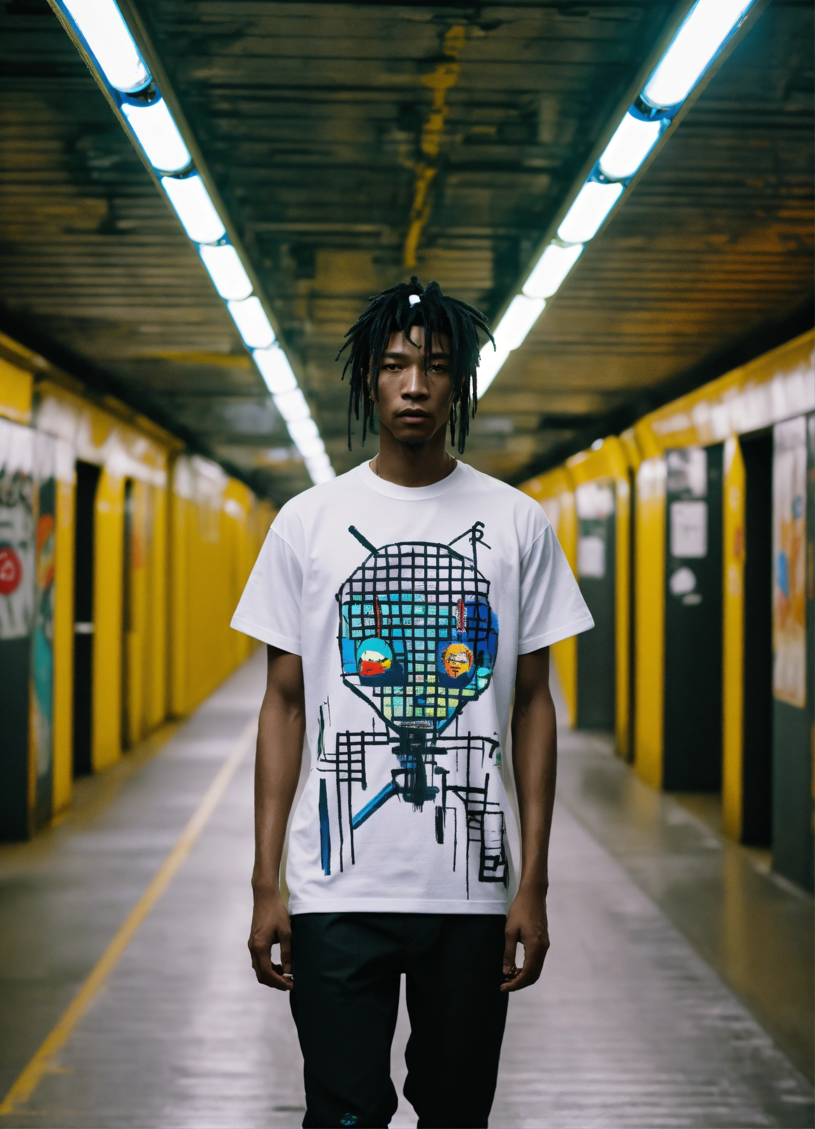 Alien species as manga robots stylized by jean michel basquiat and kieth haring geometrical edgy expressionism t shirt designed by xsander zhou kenzo balenciaga alexsander wang off white cristopher raeburn 2027 fashion trends editorial fashion fashion magazine cinematic shot ultra hd concept art glitch runway in a futuristic subway station