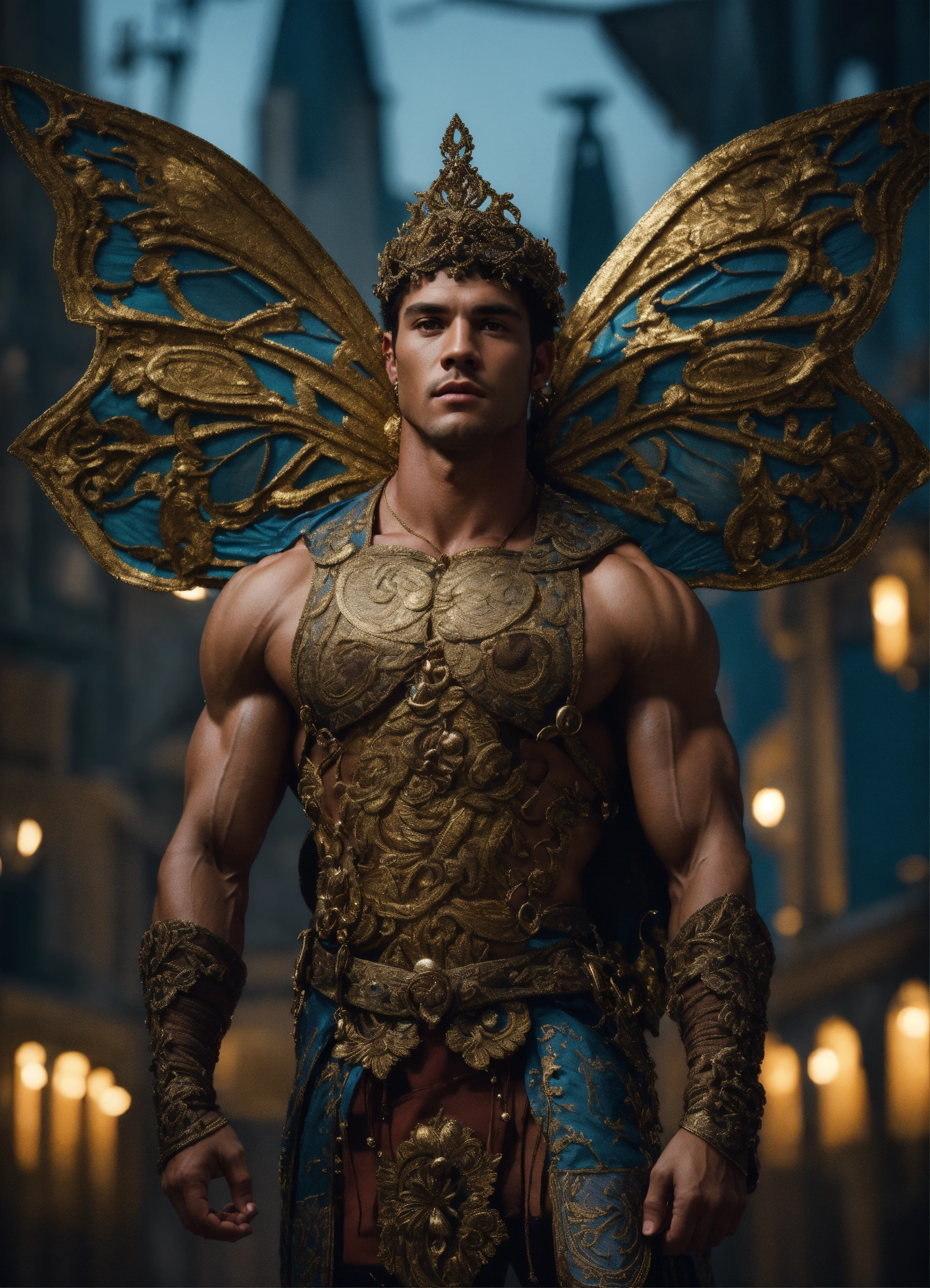 Portrait of a stunningly beautiful male fairy in symmetrical beautiful armor light, mister olympia anatomy, broad muscle legs, big delts, ripped, intricate, elegant, depth of field, zeiss lens, detailed, symmetrical, centered, fashion photoshoot, by annie leibovitz and steve mccurry, david lazar, jimmy nelsson, breathtaking, 8 k resolution, extremely detailed, beautiful, establishing shot, artistic, hyperrealistic, beautiful face, octane render, full shot