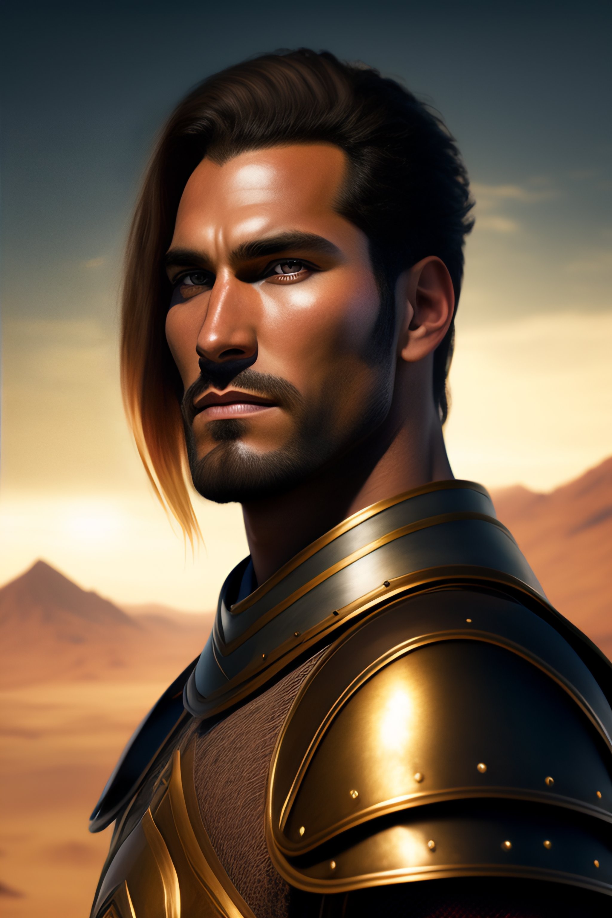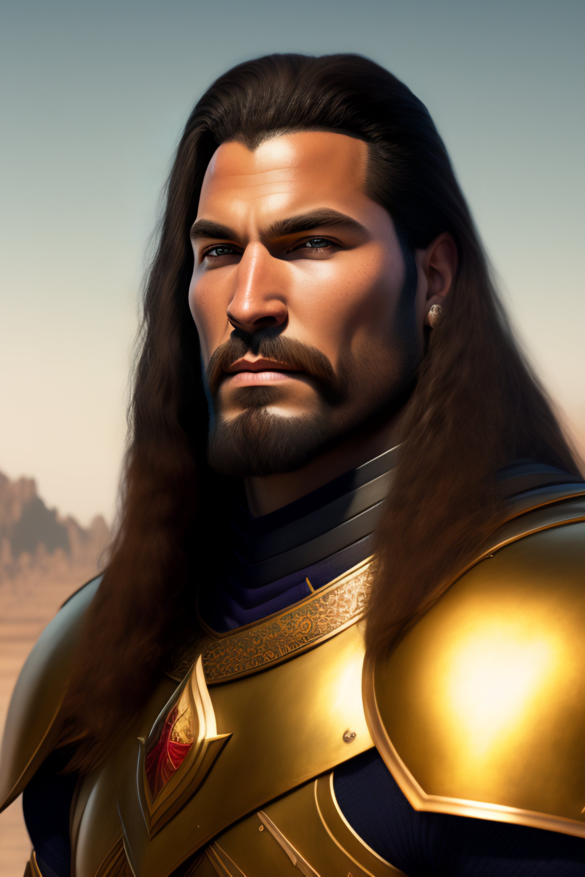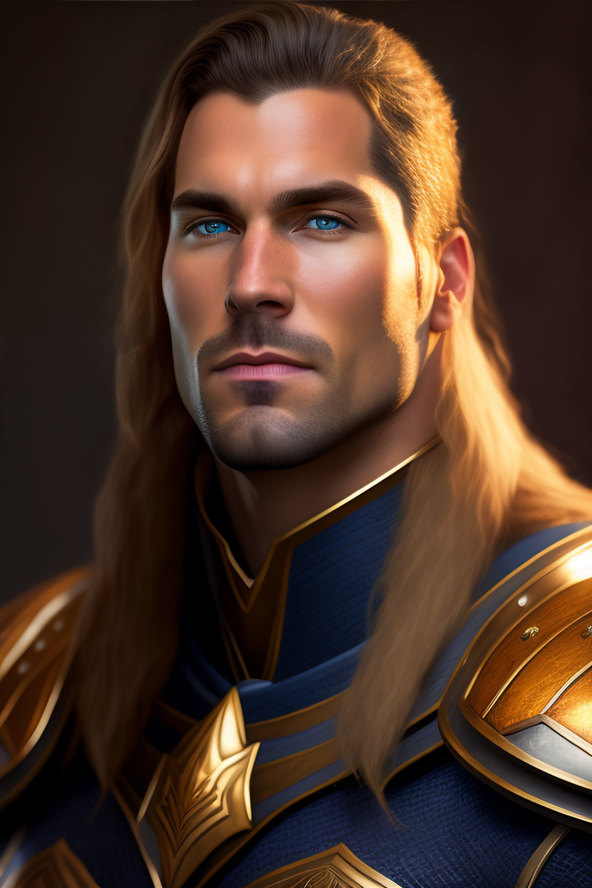 Portrait of a human paladin, 205 lbs in weight, 6 feet 1 inches tall, 39 years old, scar on face, long hair