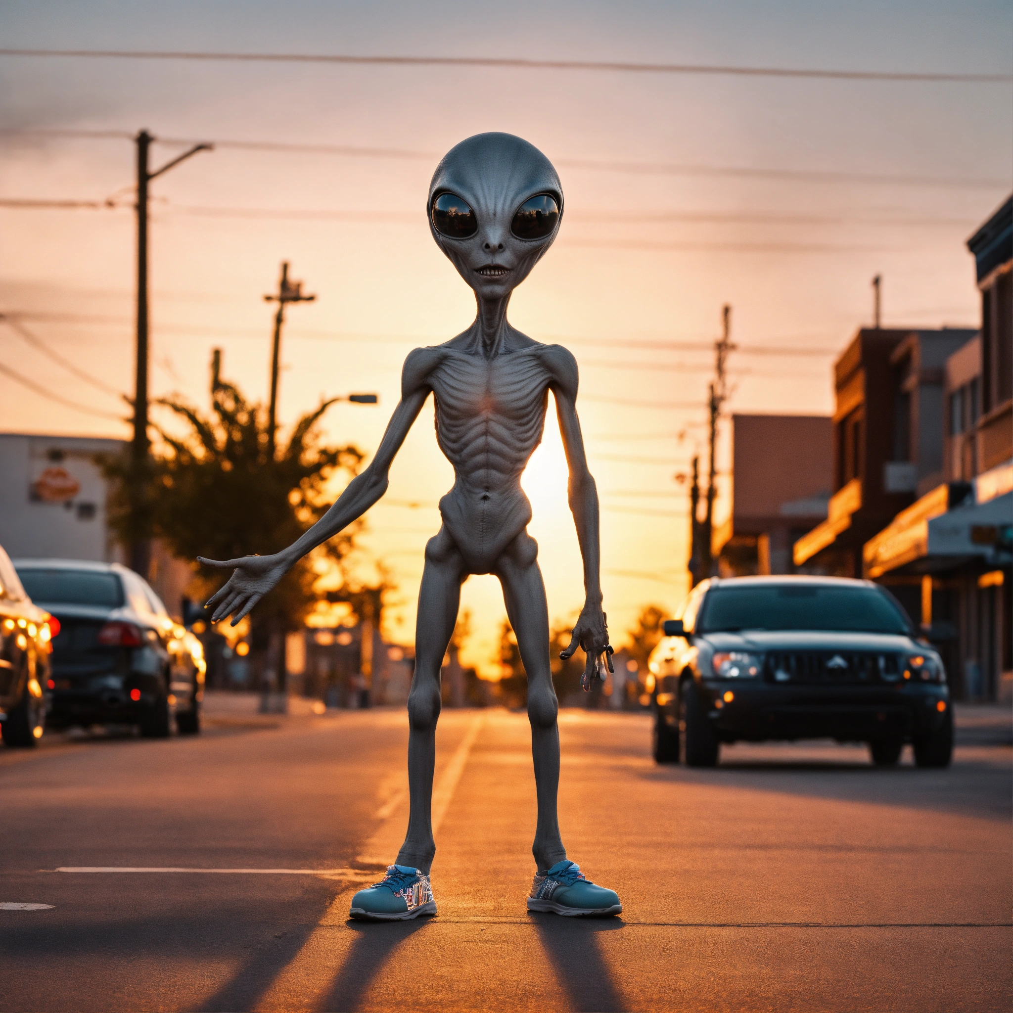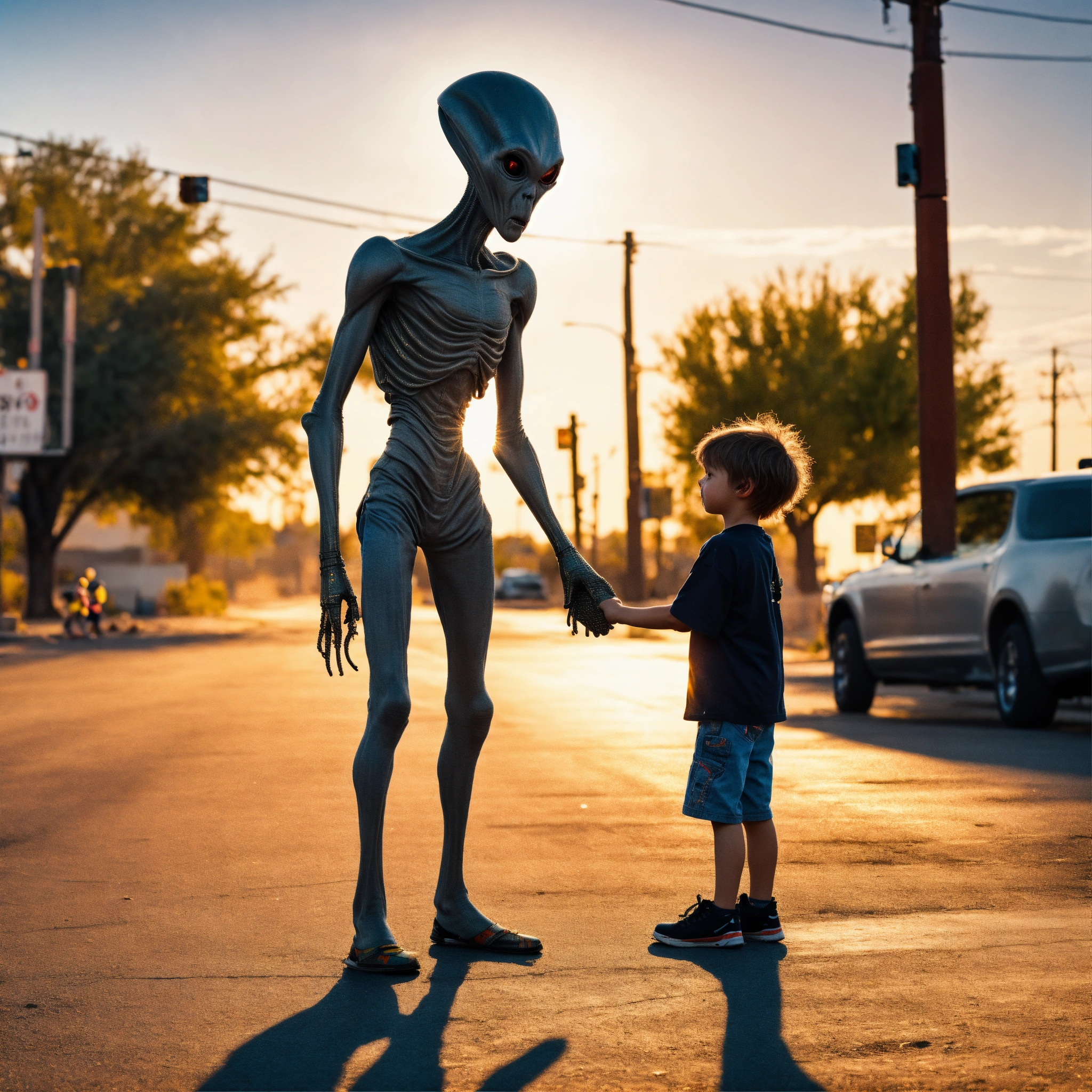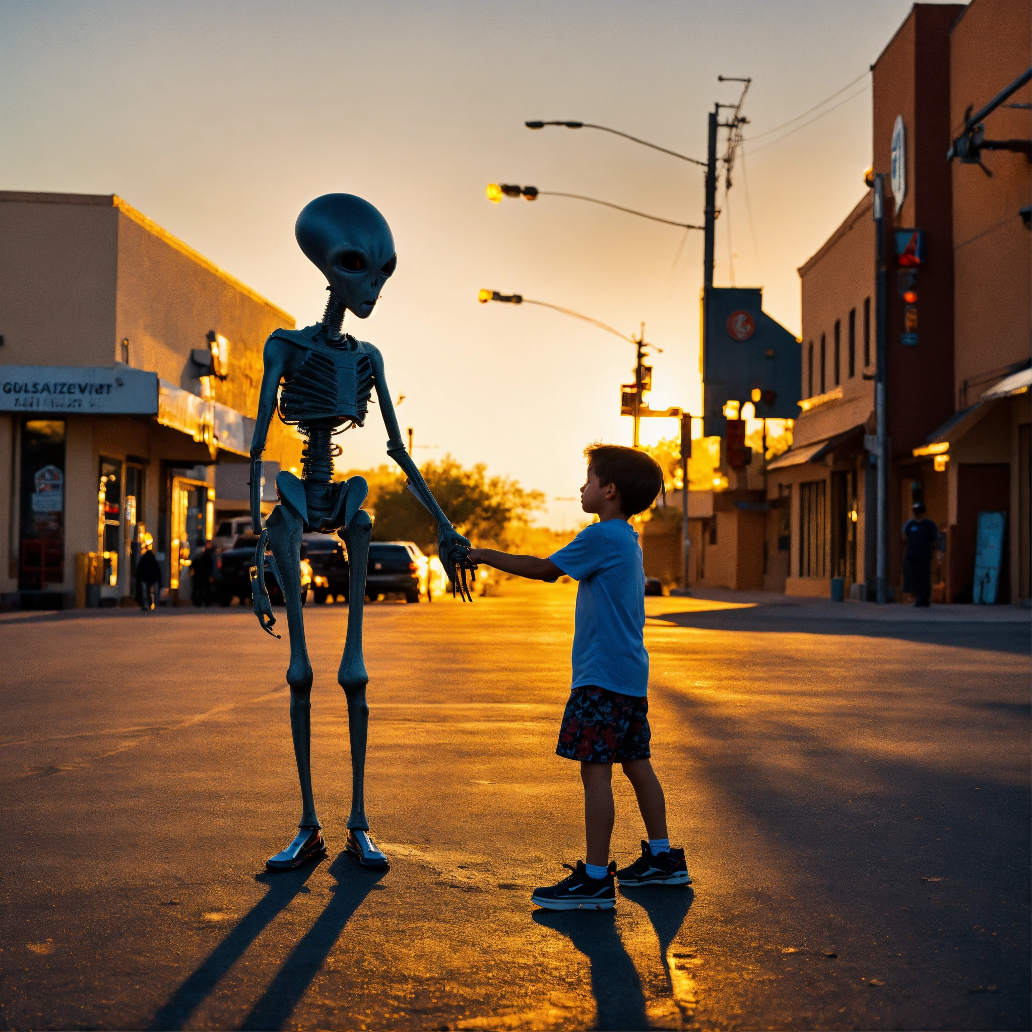Very creepy realistic grey alien standing in the street, shaking hands with a small skater boy, arizona, unsettling, wide angle, golden hour