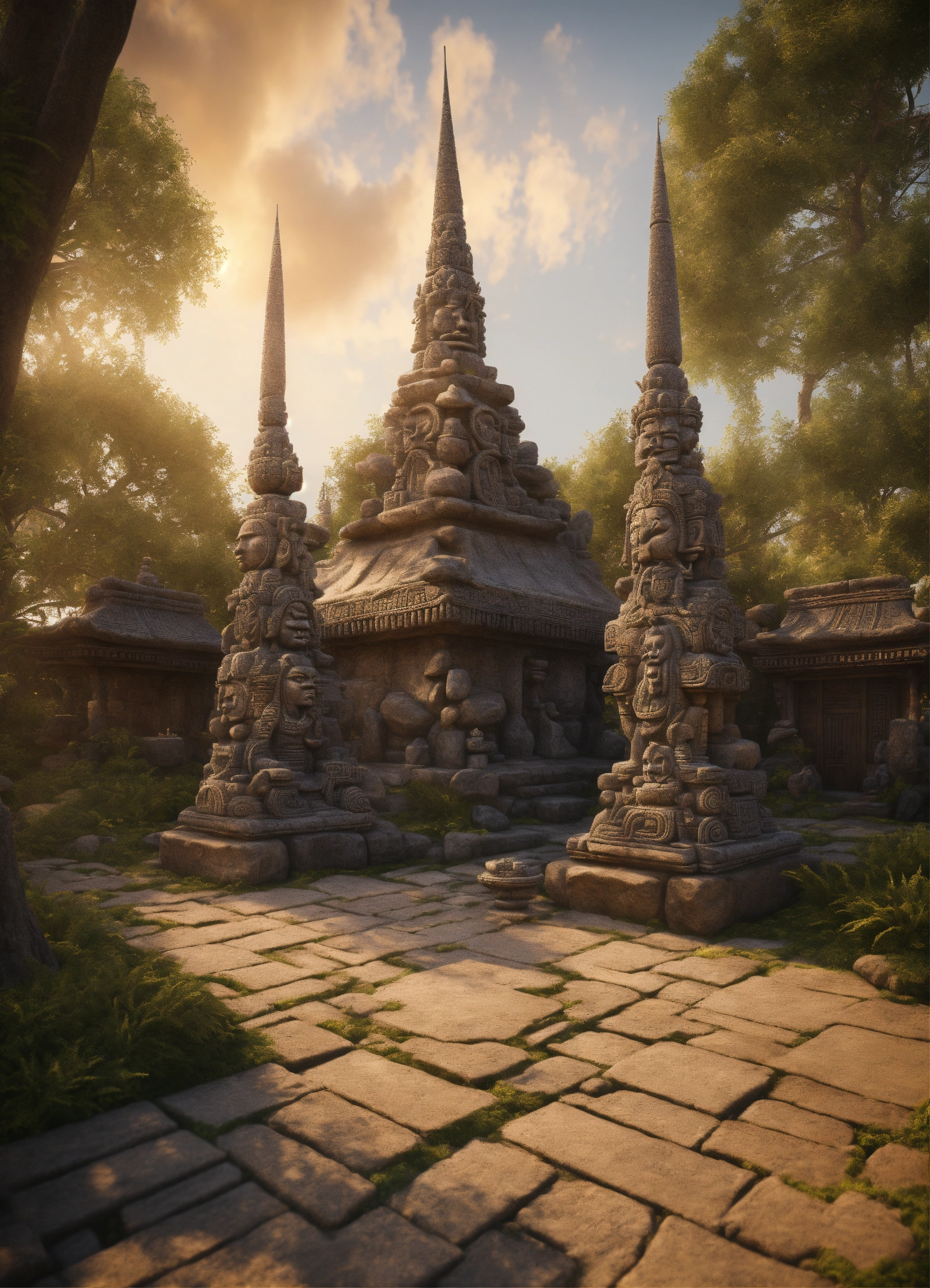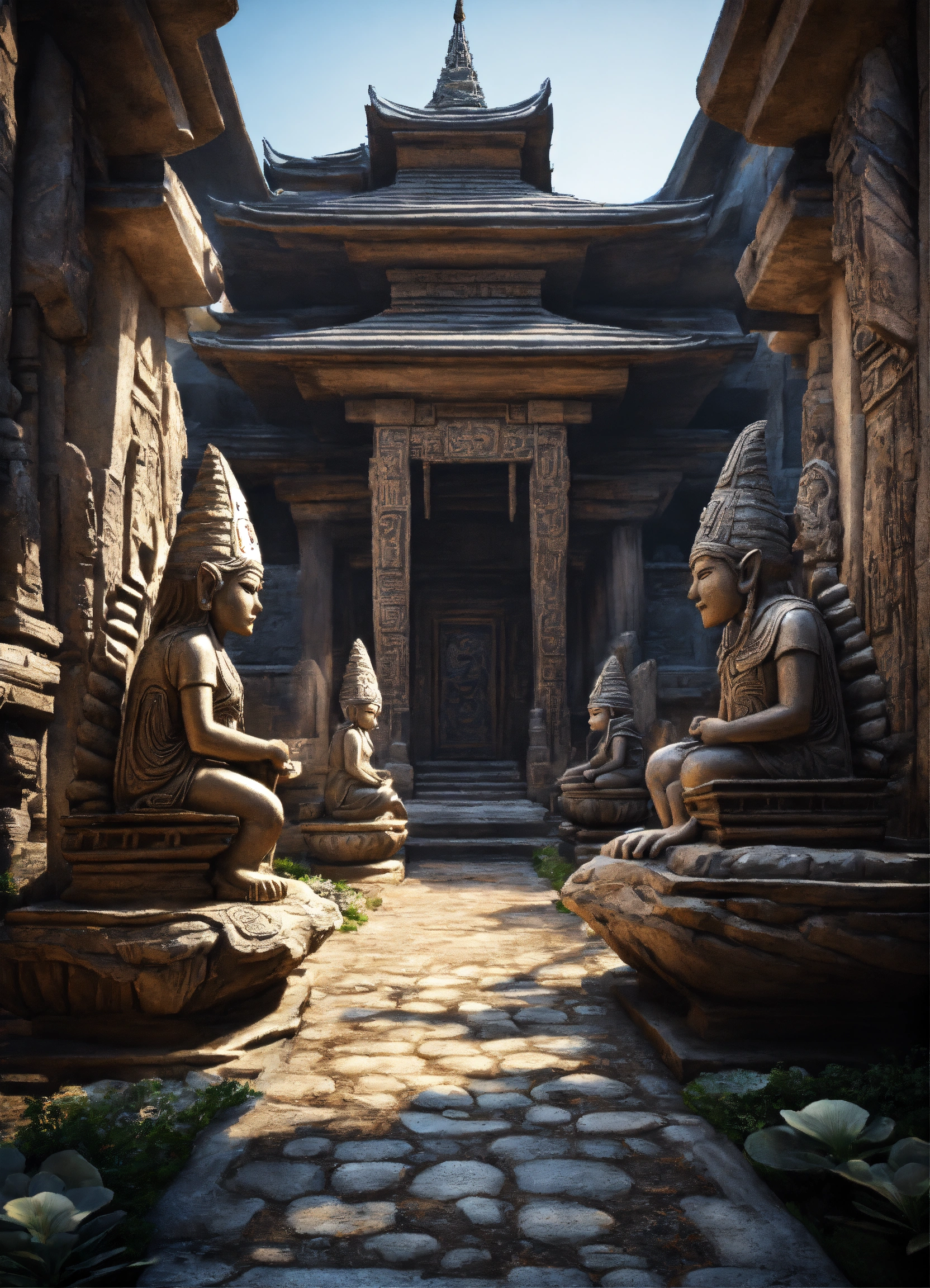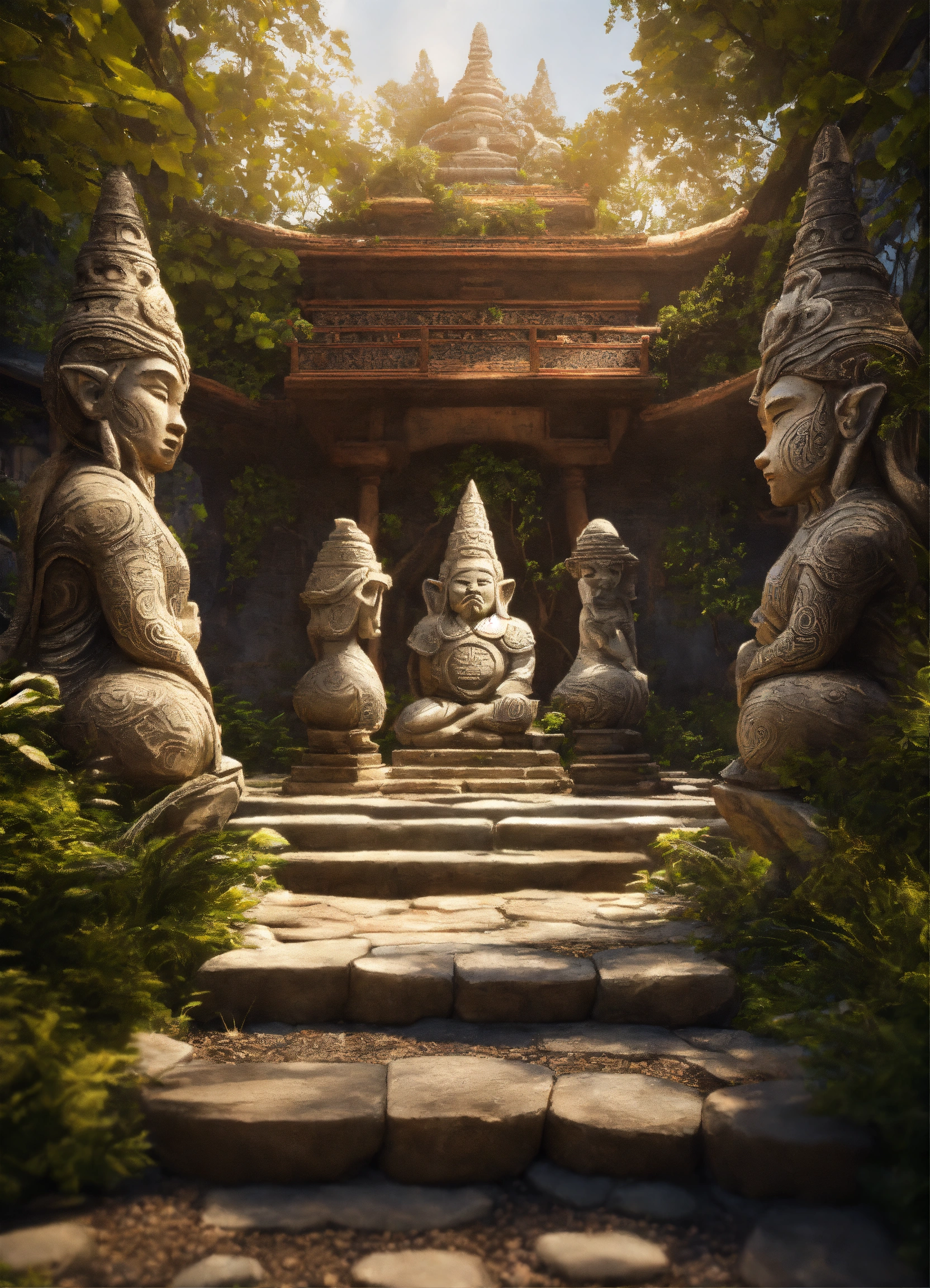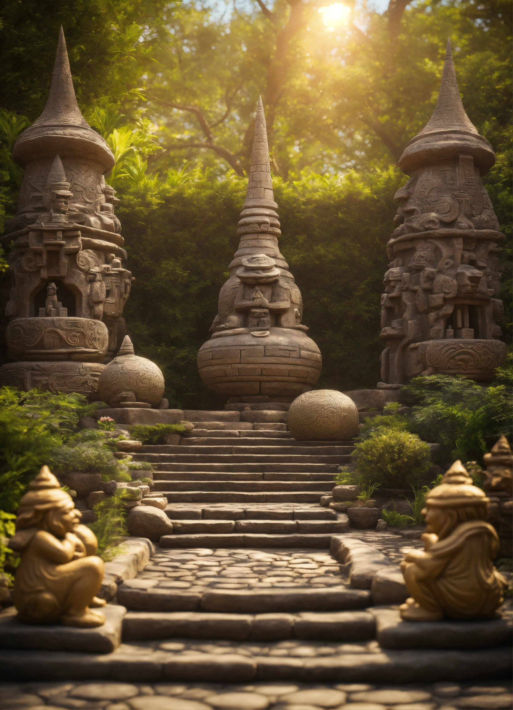 An ancient spiritual gnomes stone temple zen style garden.sculptured . style of alex grey, giger.unreal engine.totem sculptures.patterned stone pathway courtyard
