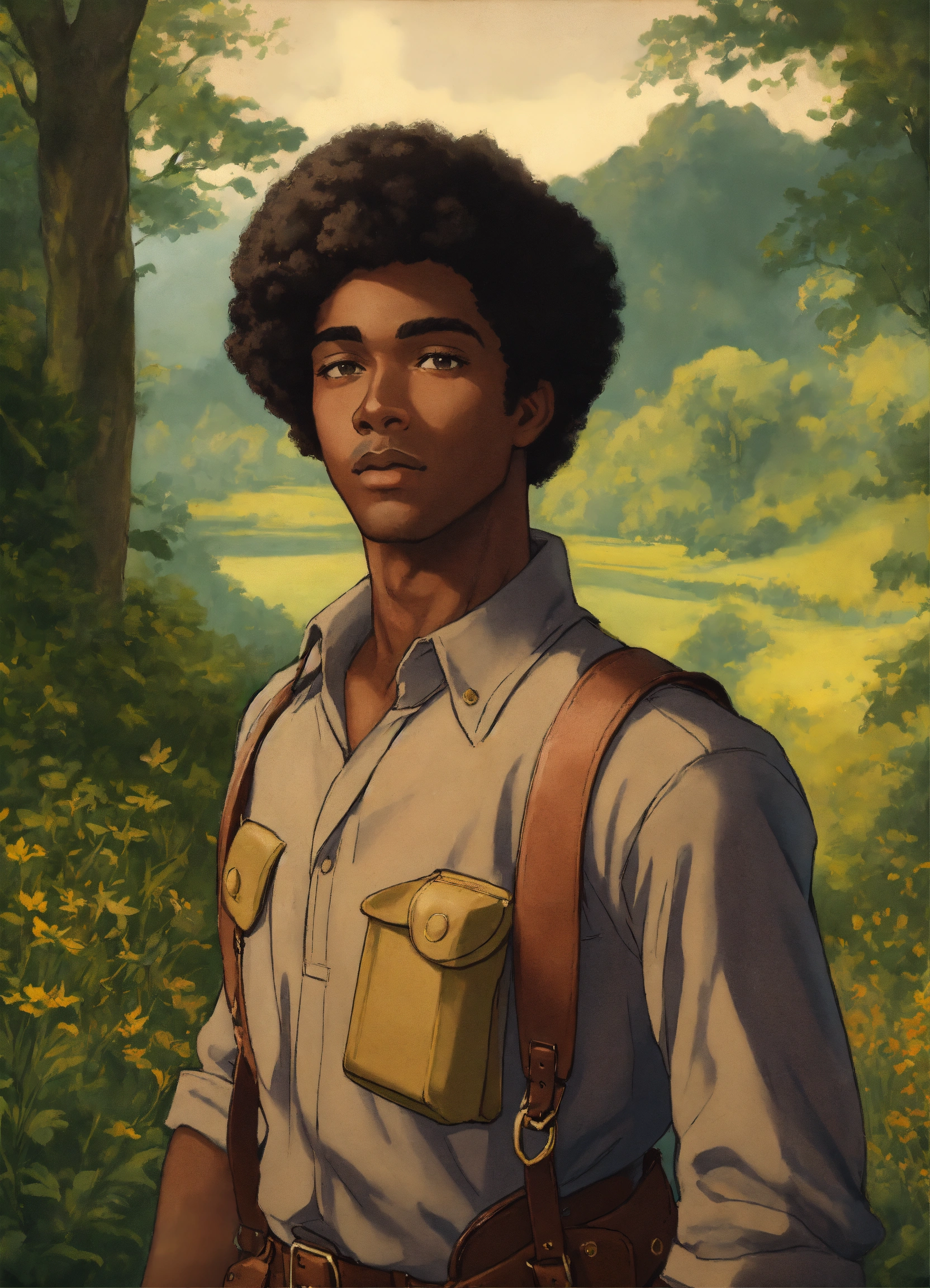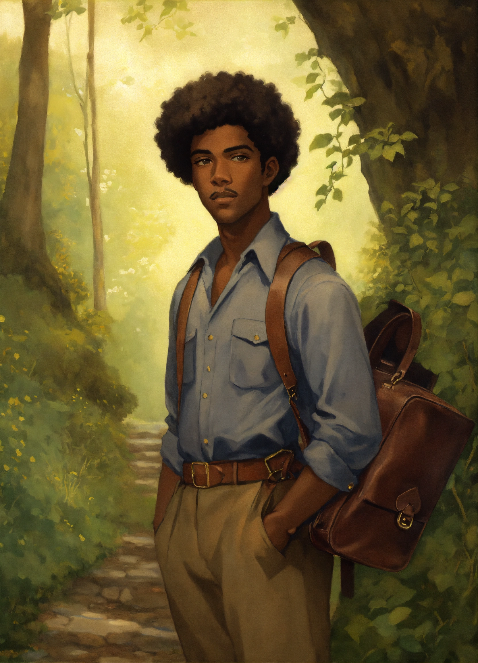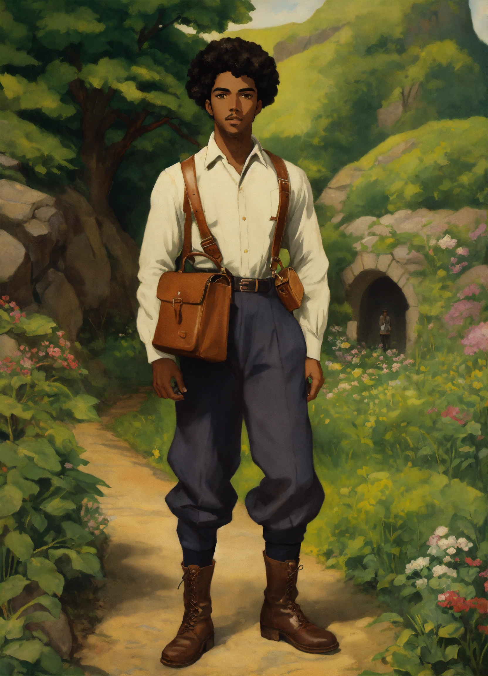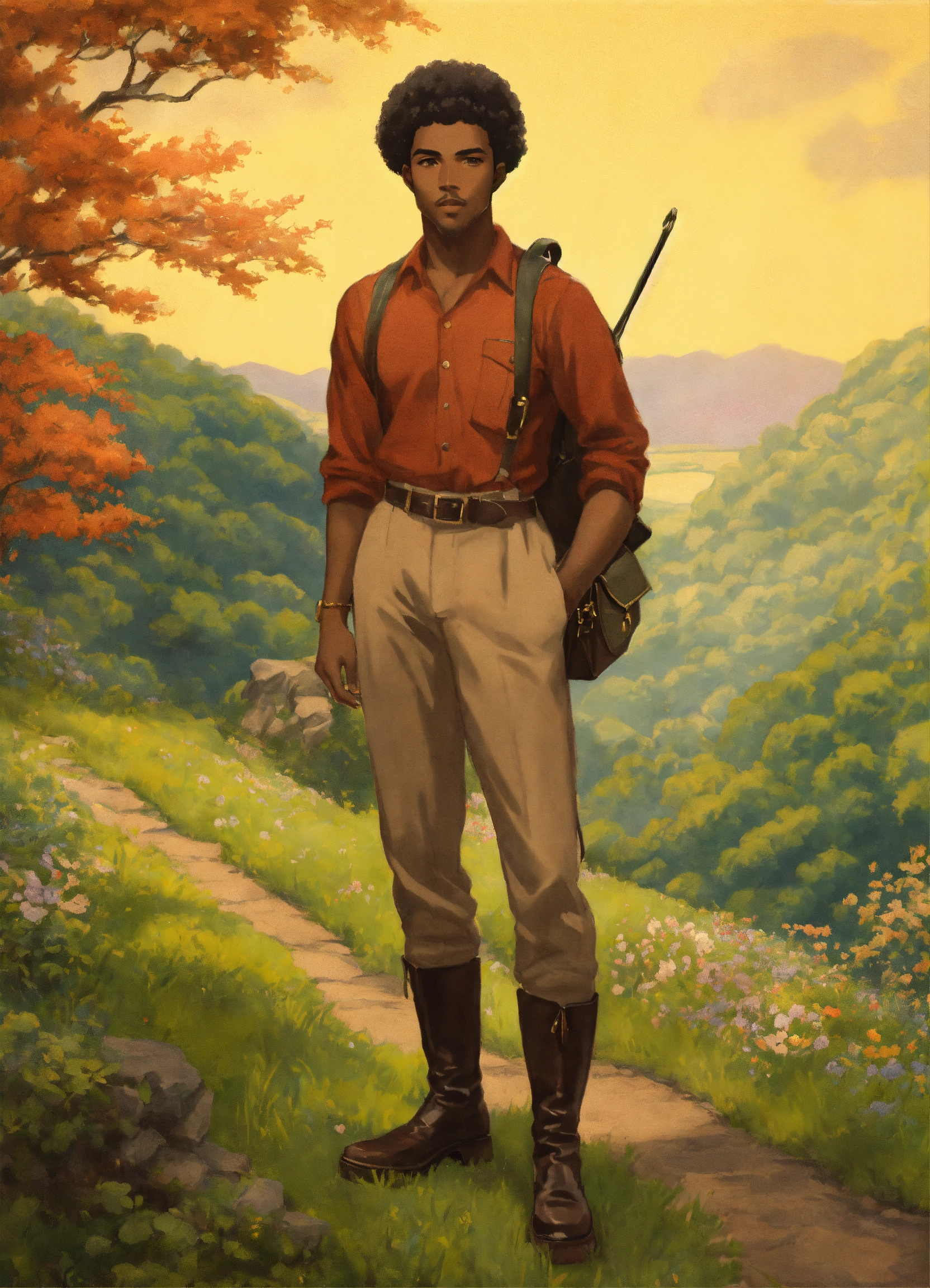 A 1930s portrait of an extremely handsome black man with short afro hair, hazel eyes standing in a glen with a satchel and boots by studio ghibli.