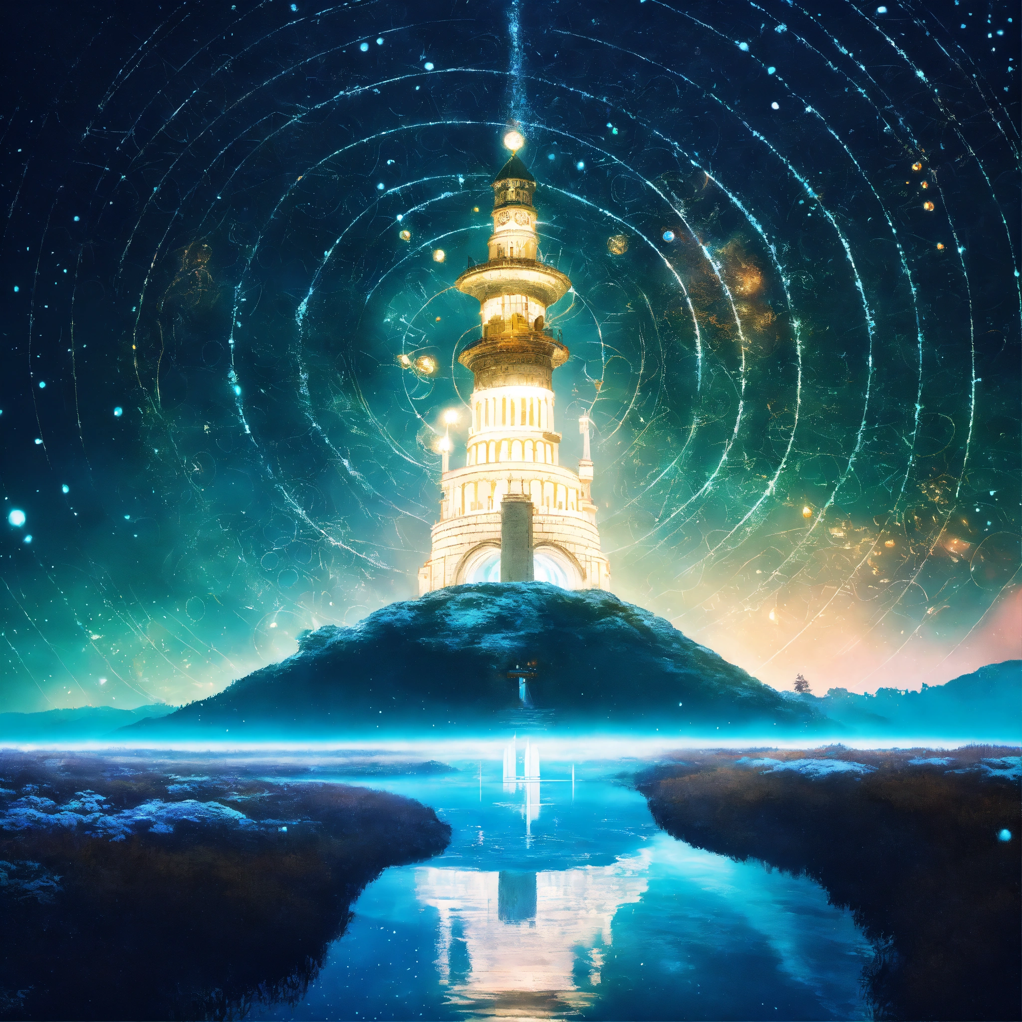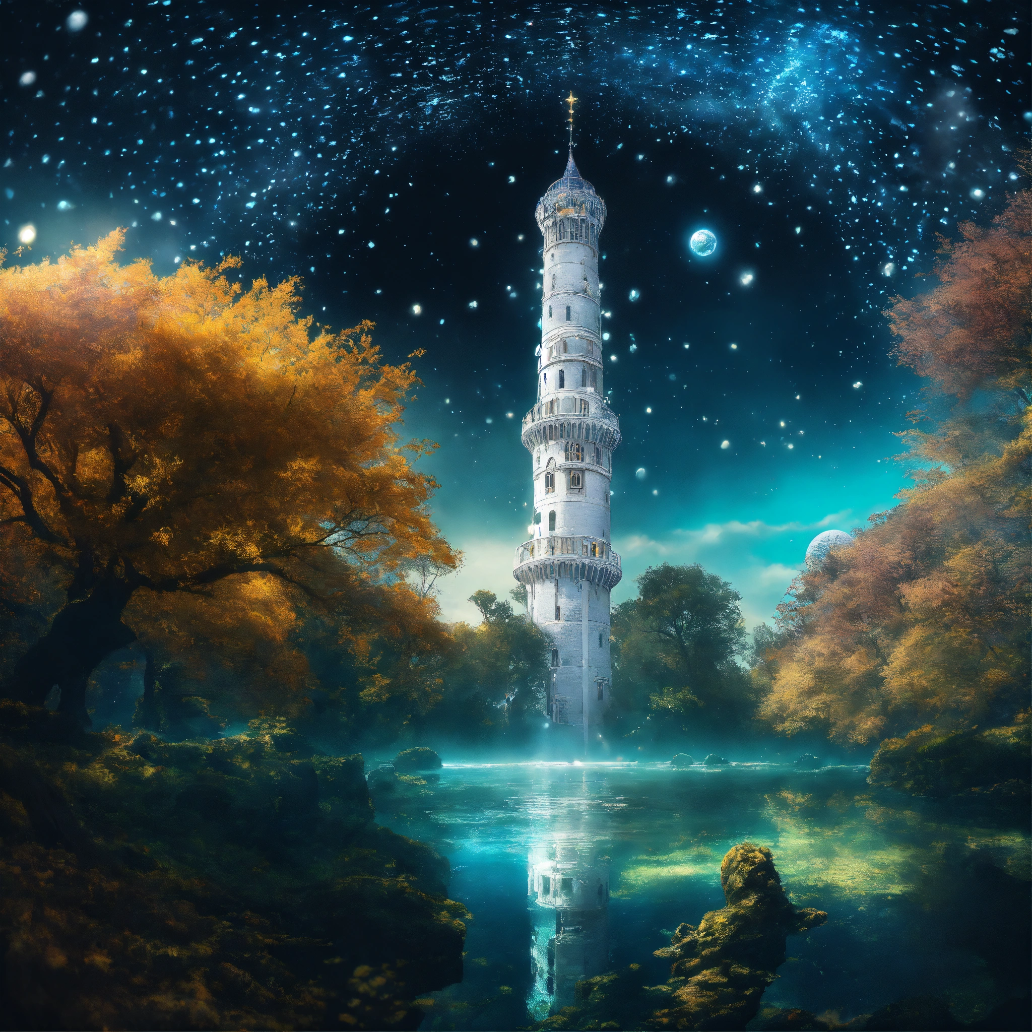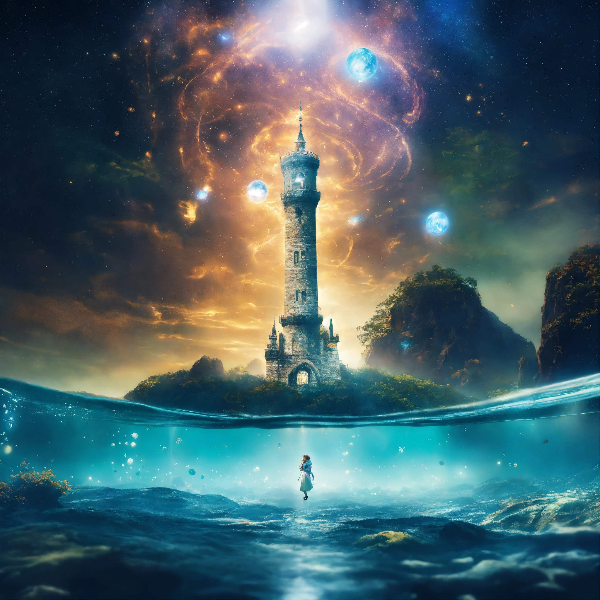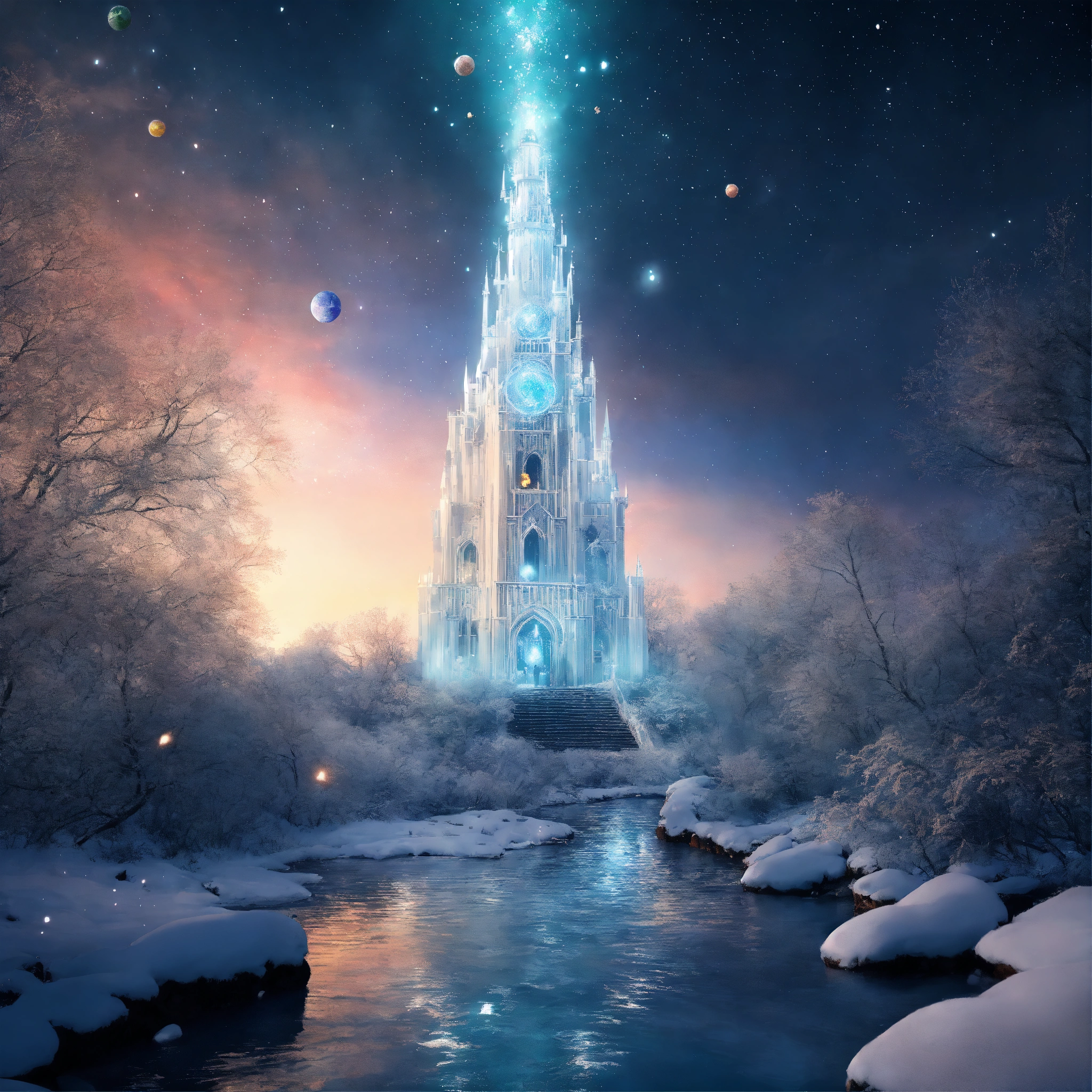 Underwater long exposure photography, giant white tower flying in the cosmos with orbs and portals, x-ray style, in the style of tim burton, lion king, the chronicles of narnia, beauty and the beast, and peter pan. with sacred geometric patterns on the body. enchanting aura. the chronicles of narnia, wizard of oz, and alice in wonderland background with snow mountains, and trees with white leaves.