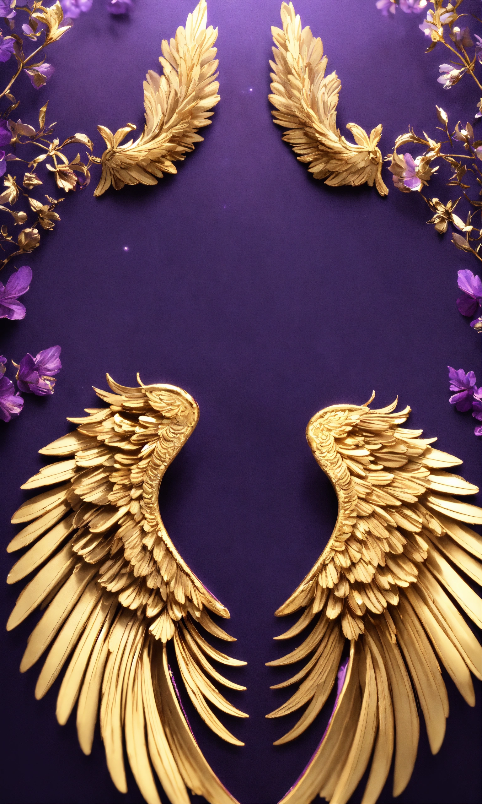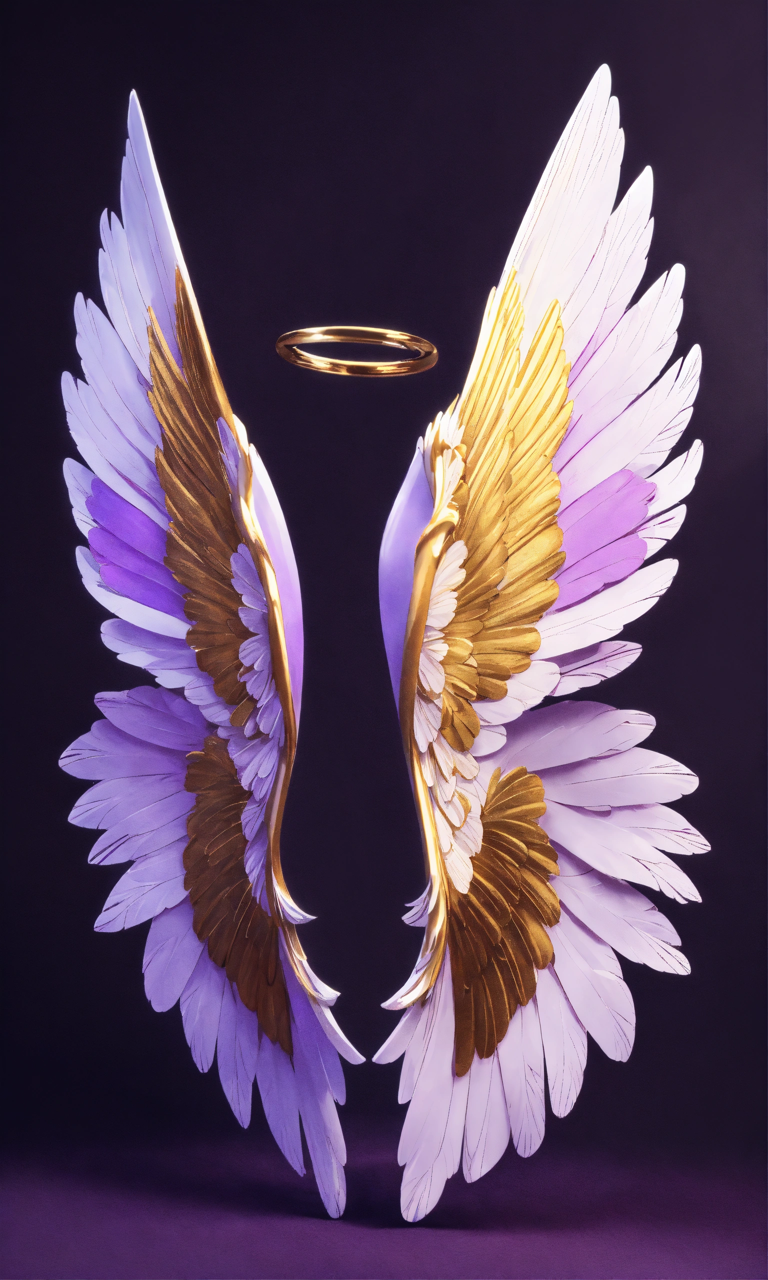 Beautiful and perfect small angel wings of violet color with precise white and at the same time some golden details. just a pair of small, violet-colored wings with small, complete white. precise wings. wings with a slight decoration in shades of violet and white. small wings complete both the right wing and the left wing, the background is dark blue, 3d, masterpiece. hd. realism. high resolution. high quality. digital art. 8k