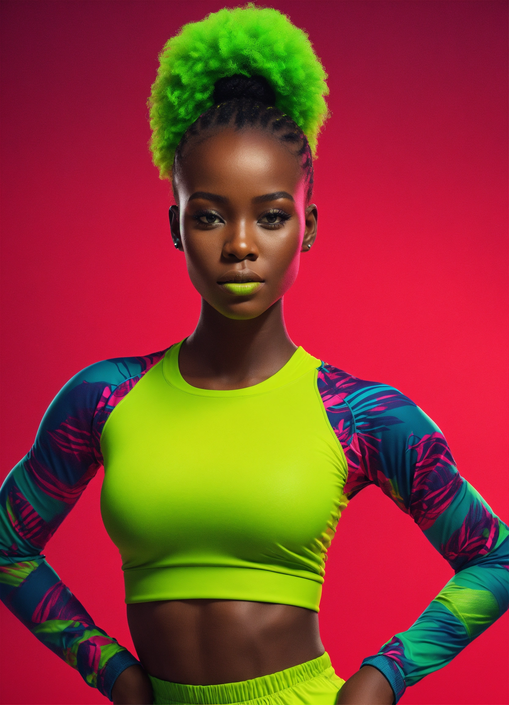 An african beautiful girl, front view, colorful fitness wear, studio photo, hyper realistic, fashion, photorealistic, 3d render, neon green background