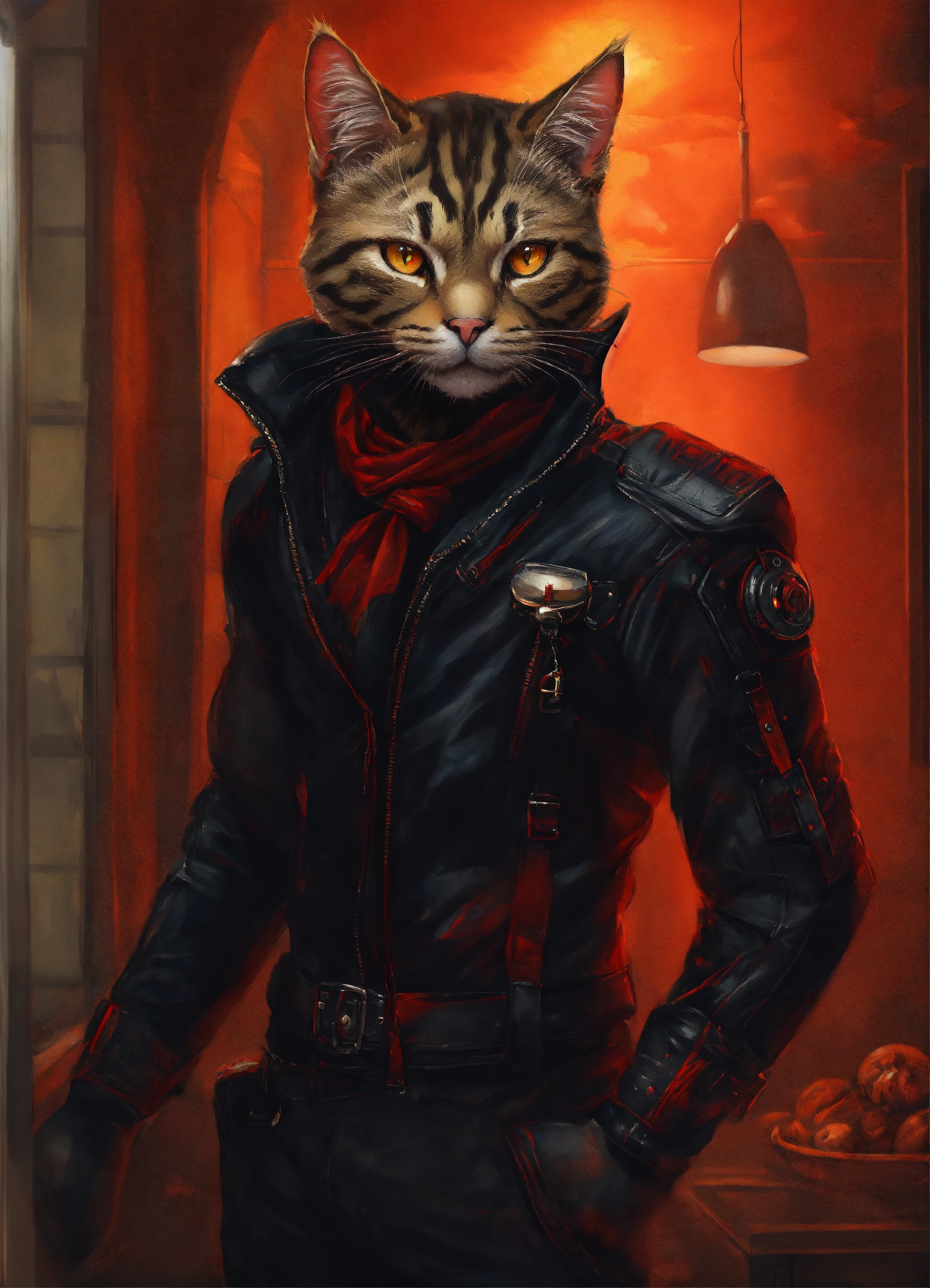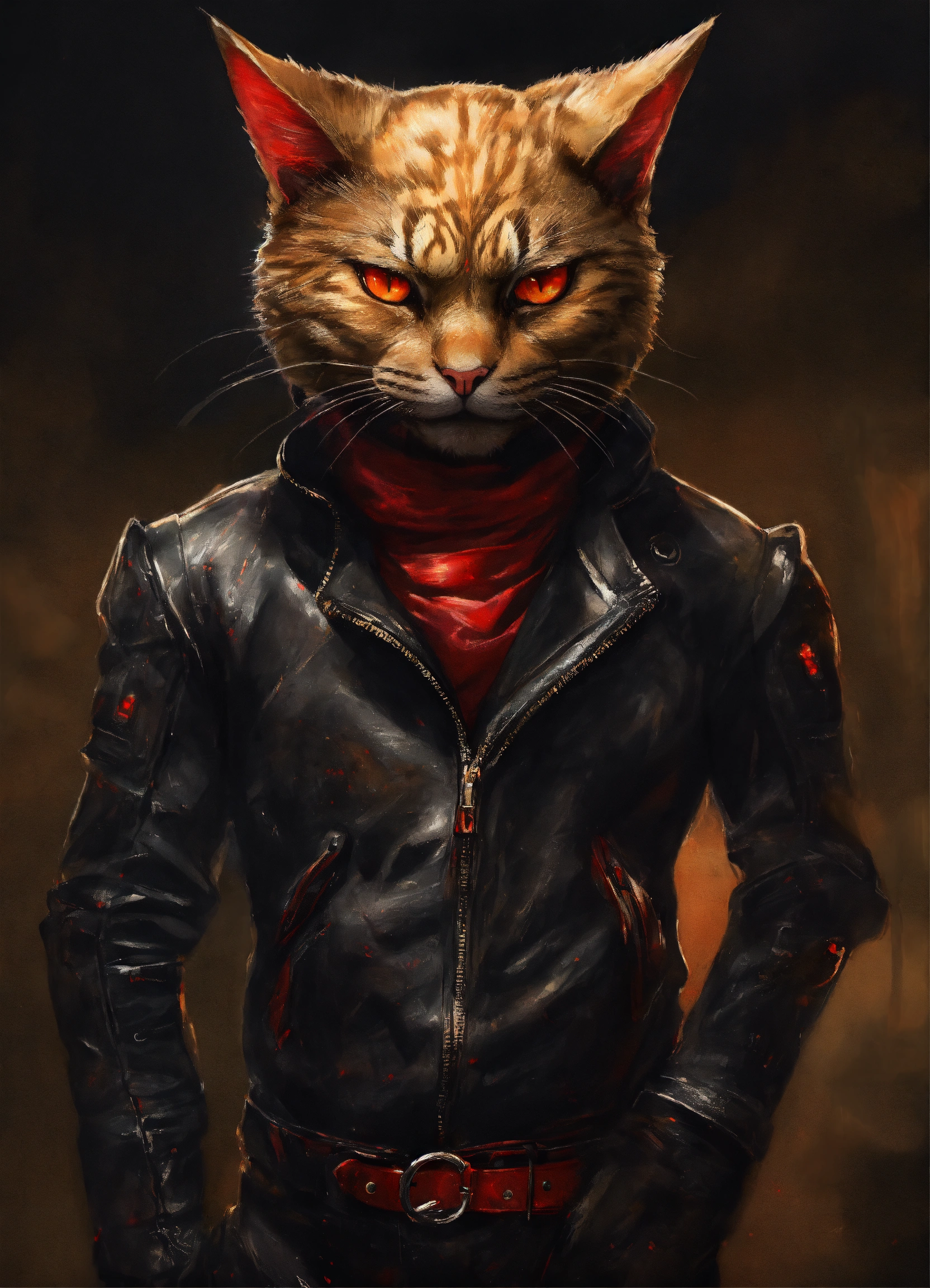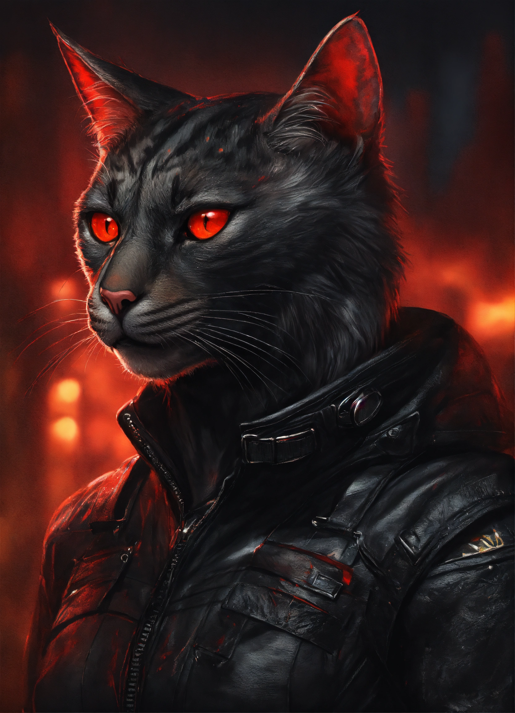 Realistic drawing a full body portrait of a mutant cat-human hybrid, with red reptilian eyes. feline smile. wearing a black leather outfit.