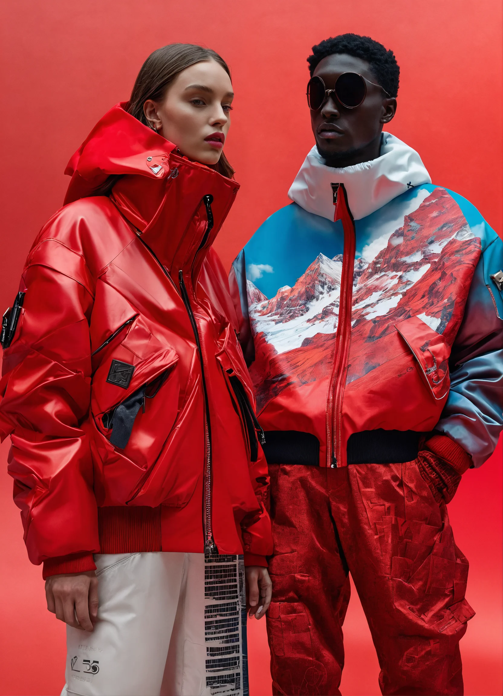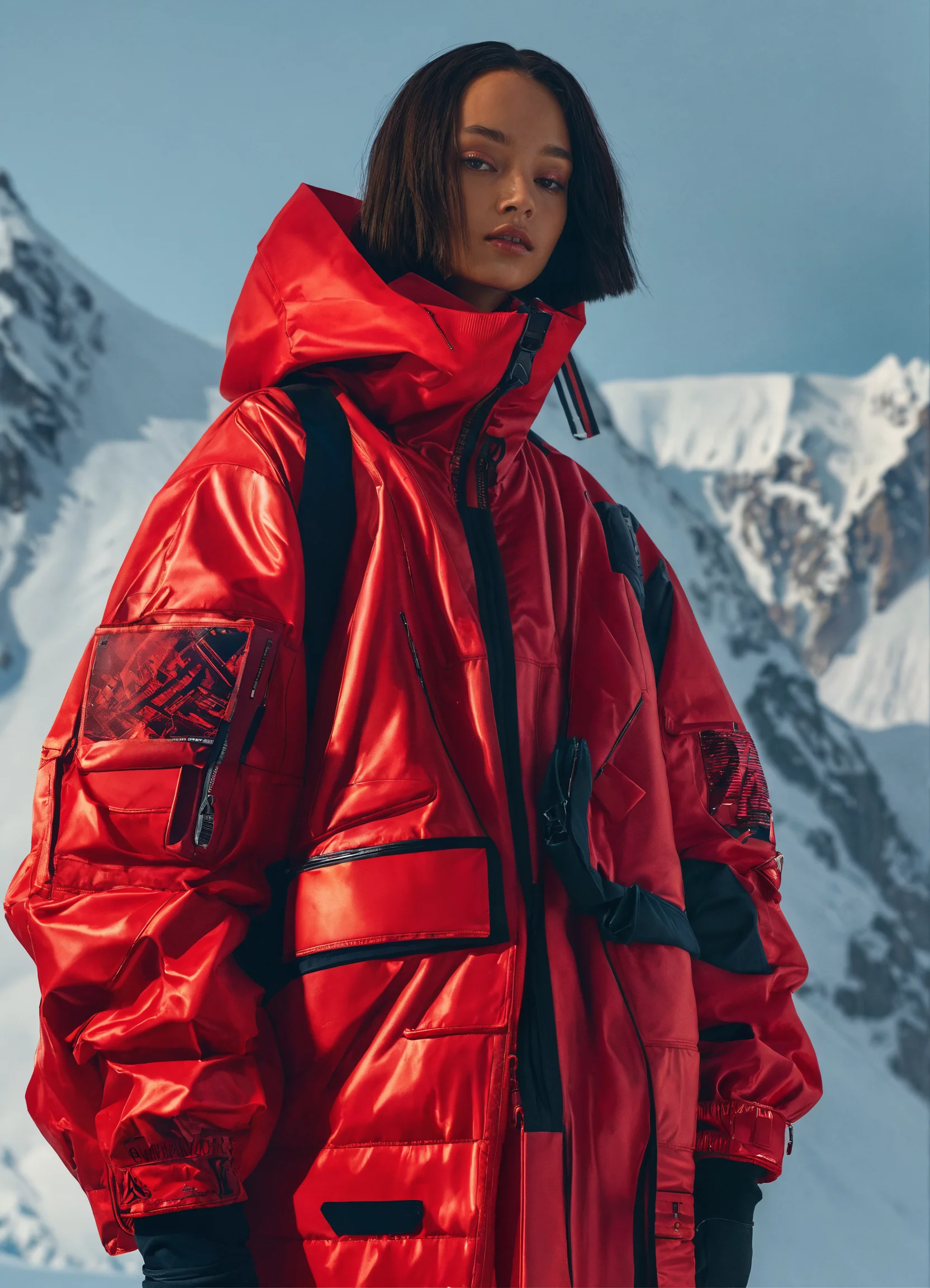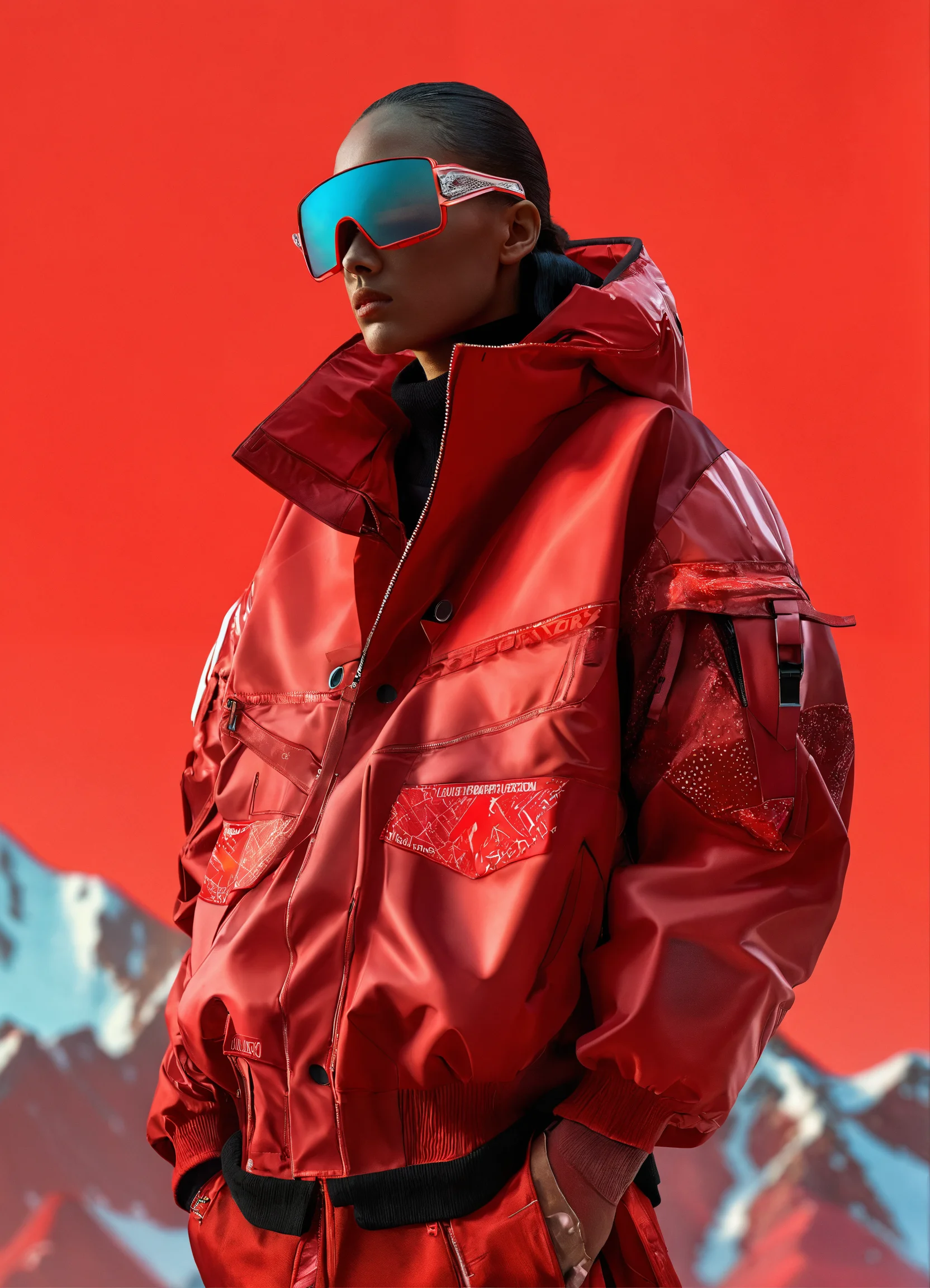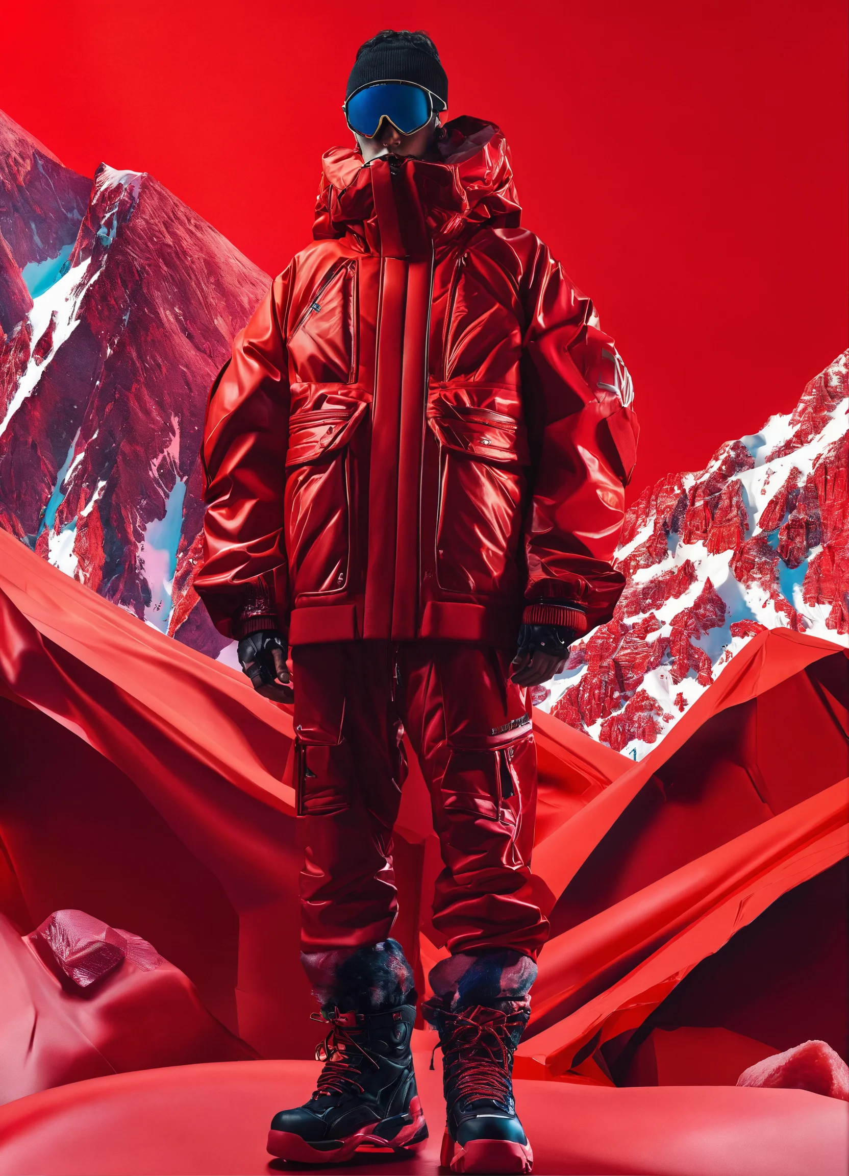 Bomber jacket futuristic, hyper-realistic, tastes like louis vuitton. big urbanwear red on red oversize coat with a background mountain with snowboard with skiwear plastic red.