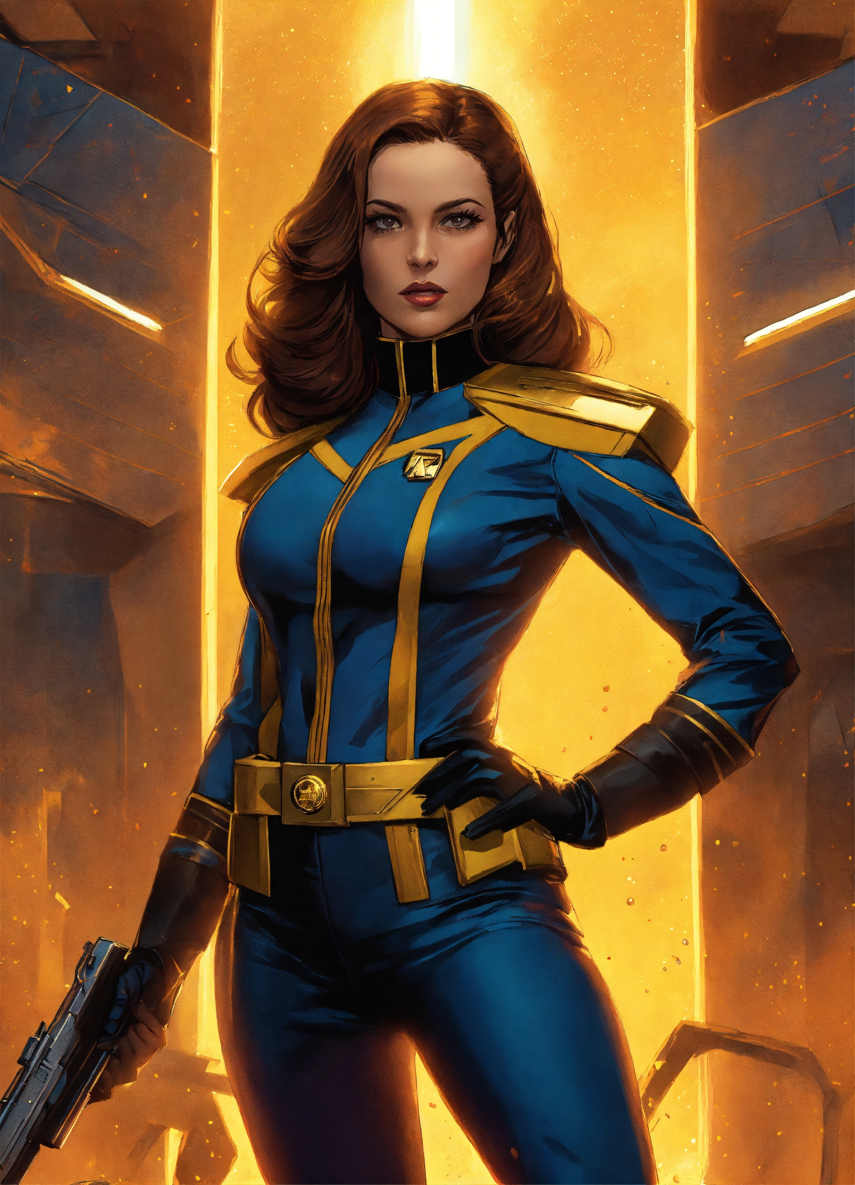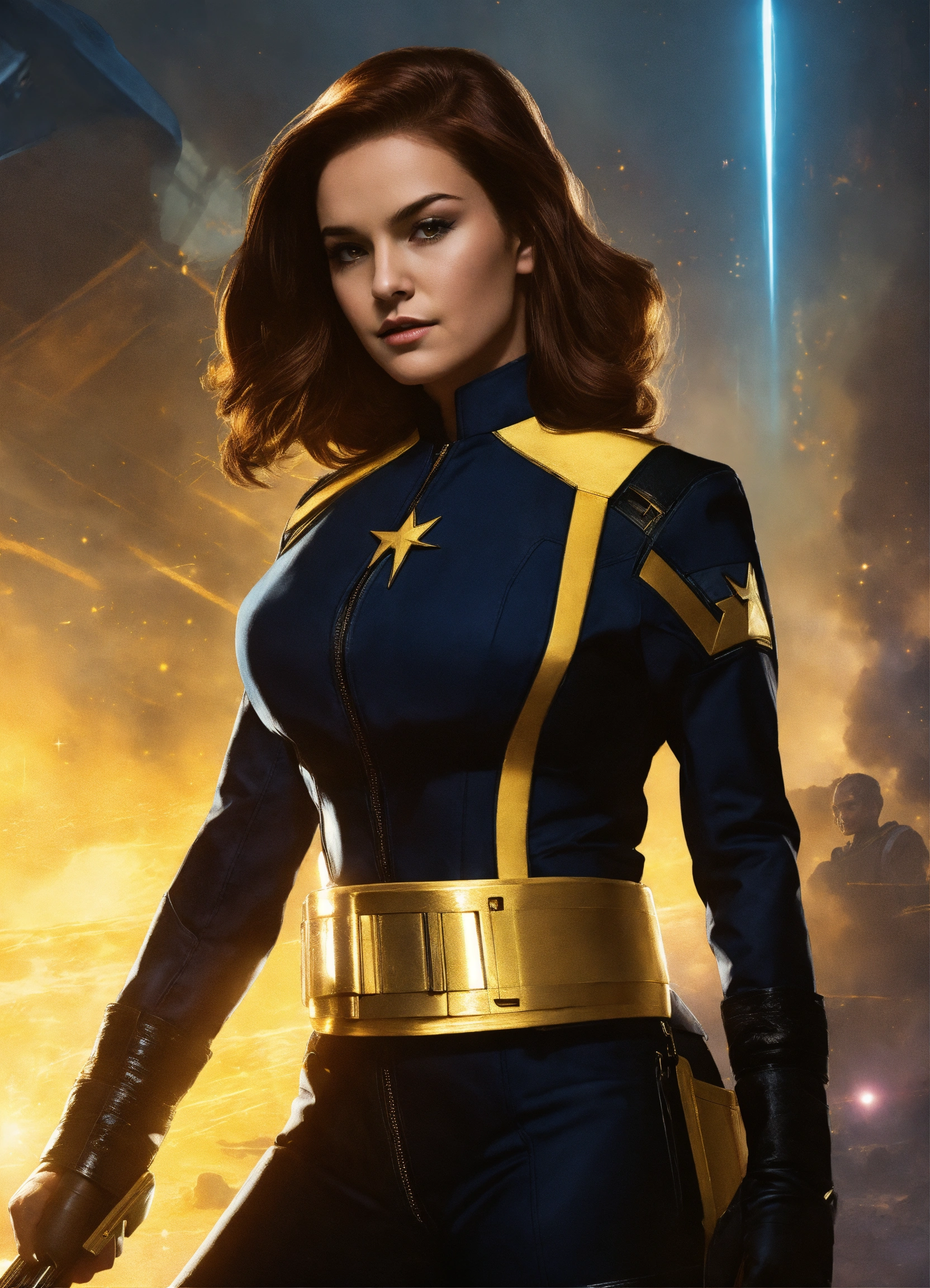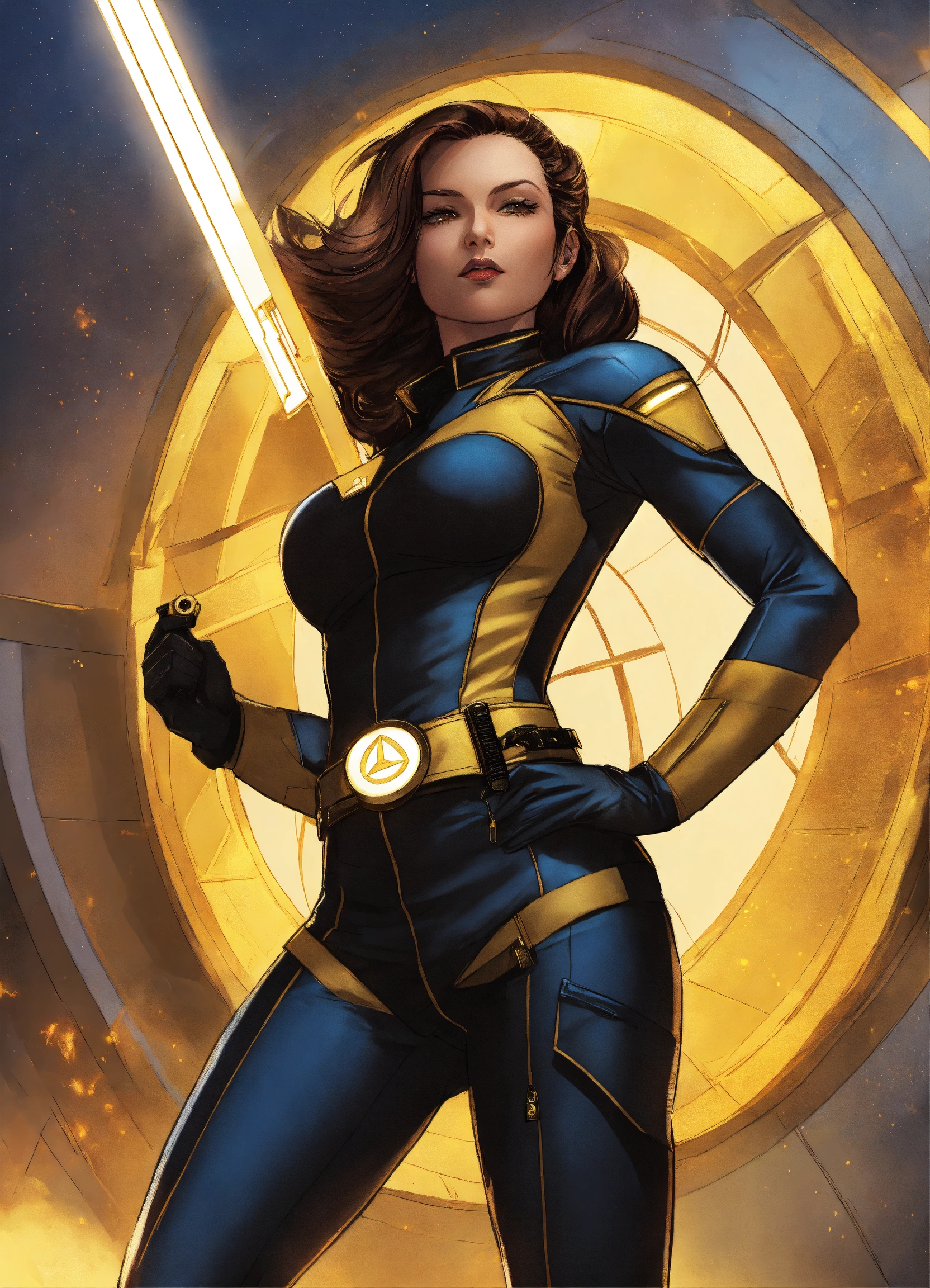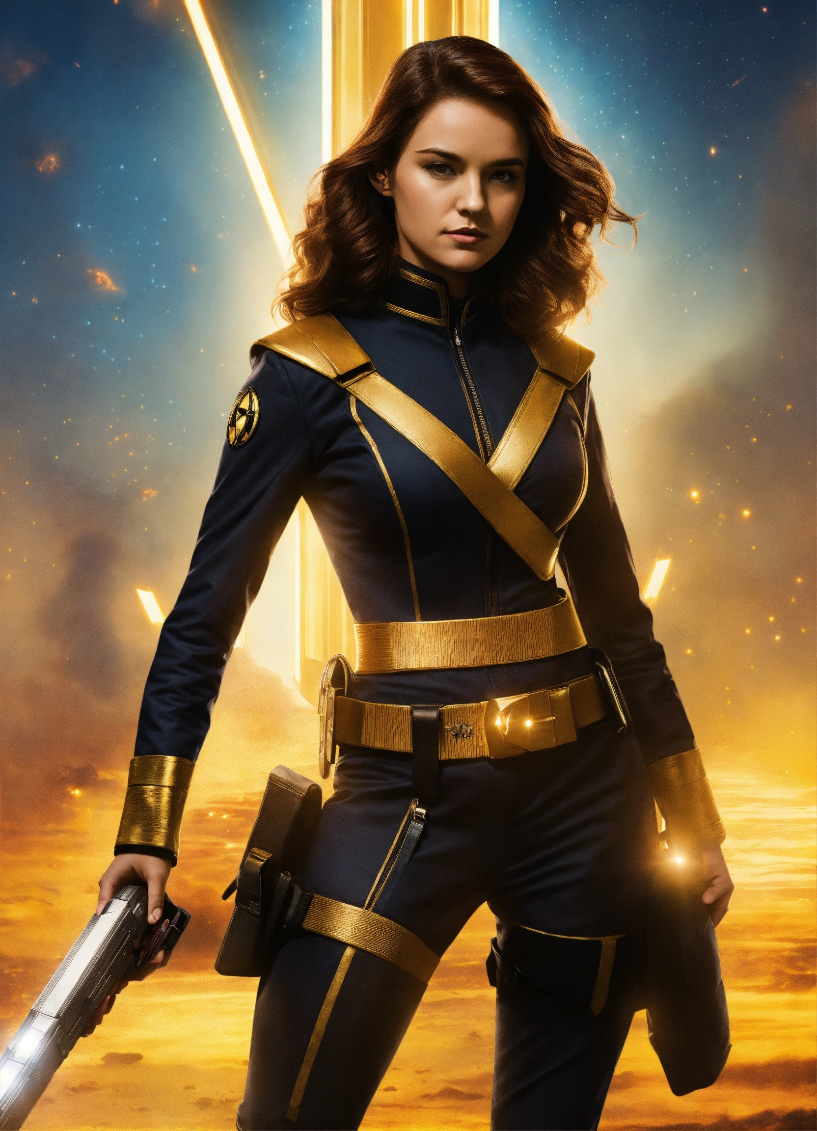 Female x-men shadowcat wearing black metal star trek uniform with gold utility belt that has phaser weapon and small pockets