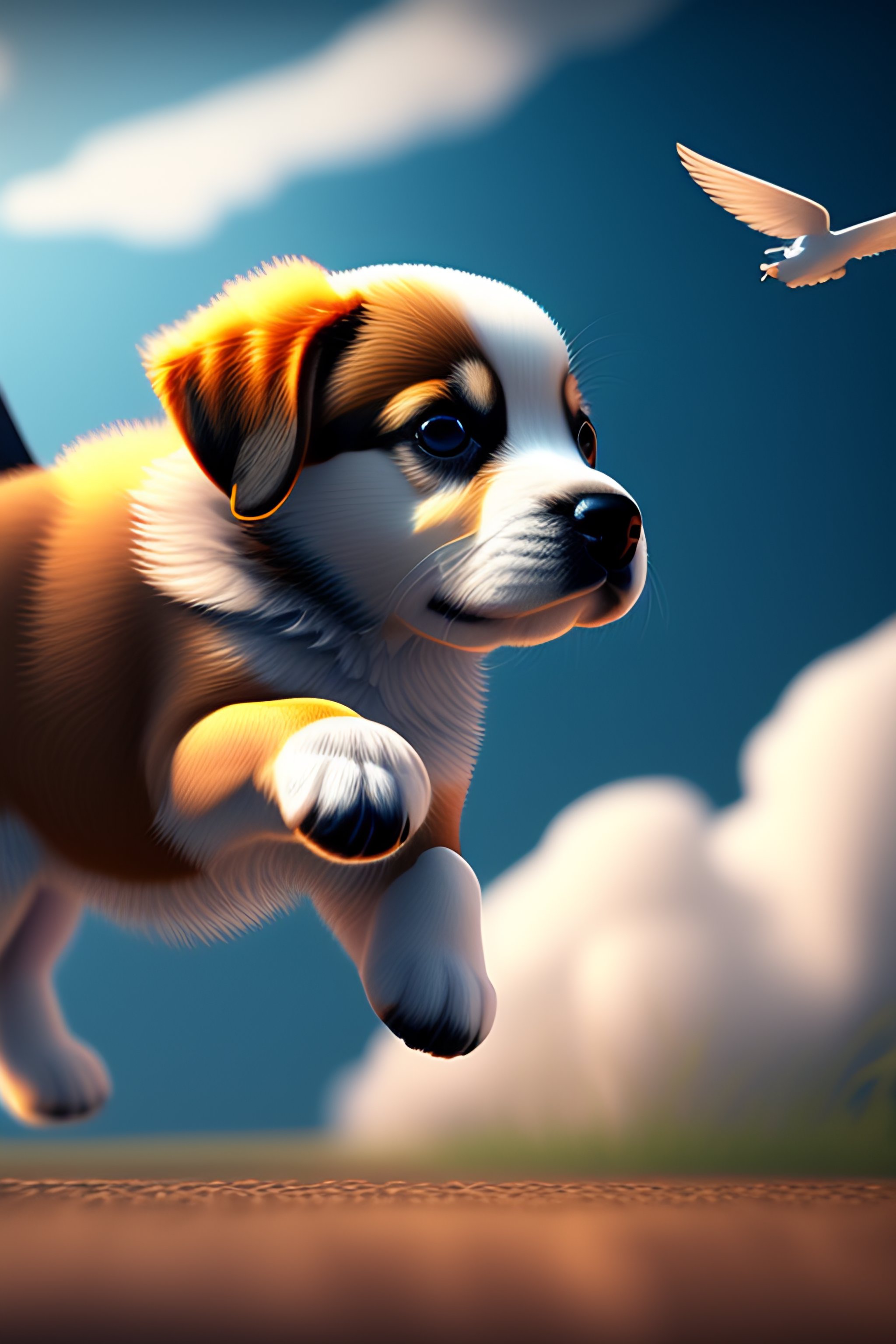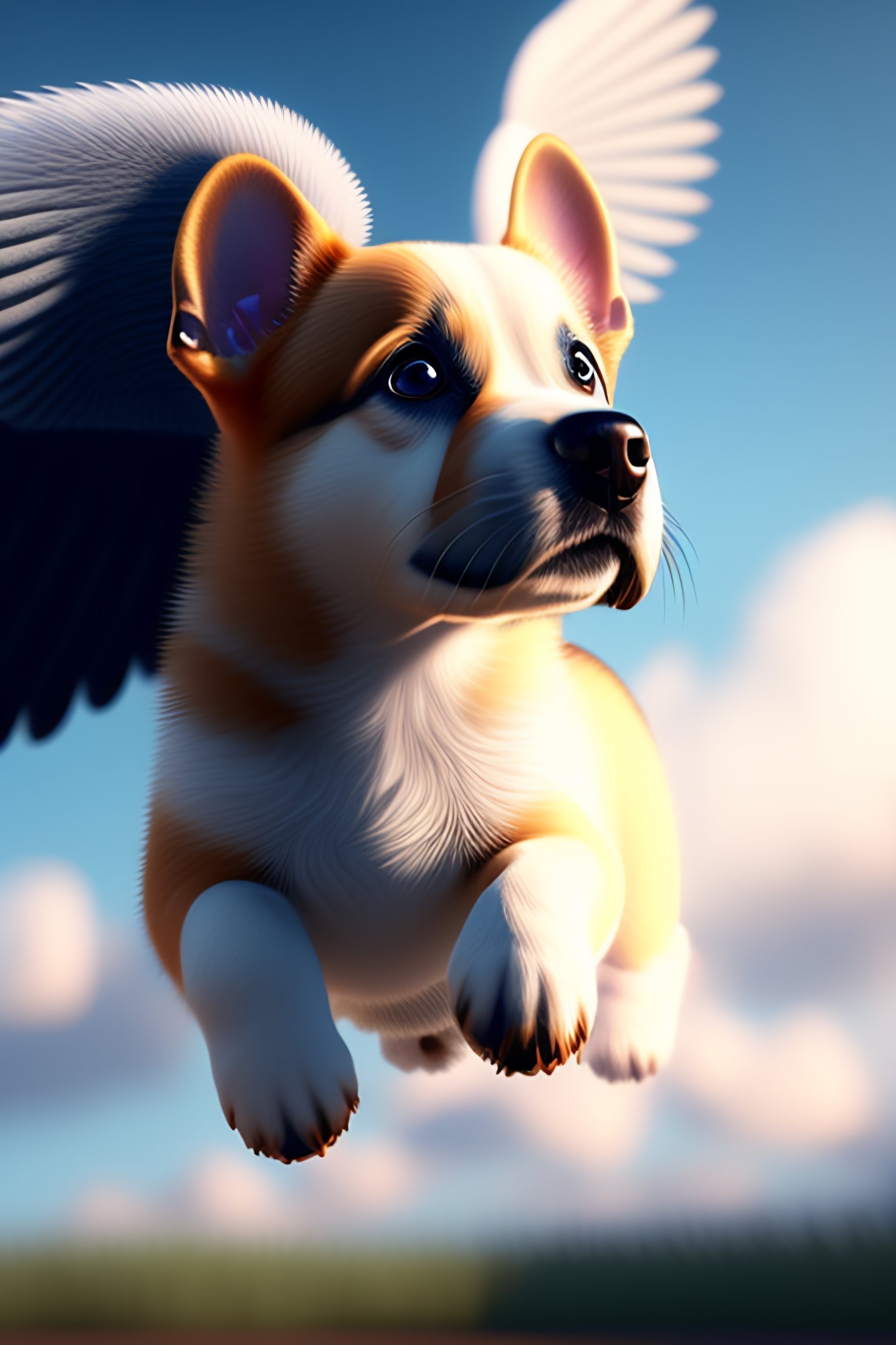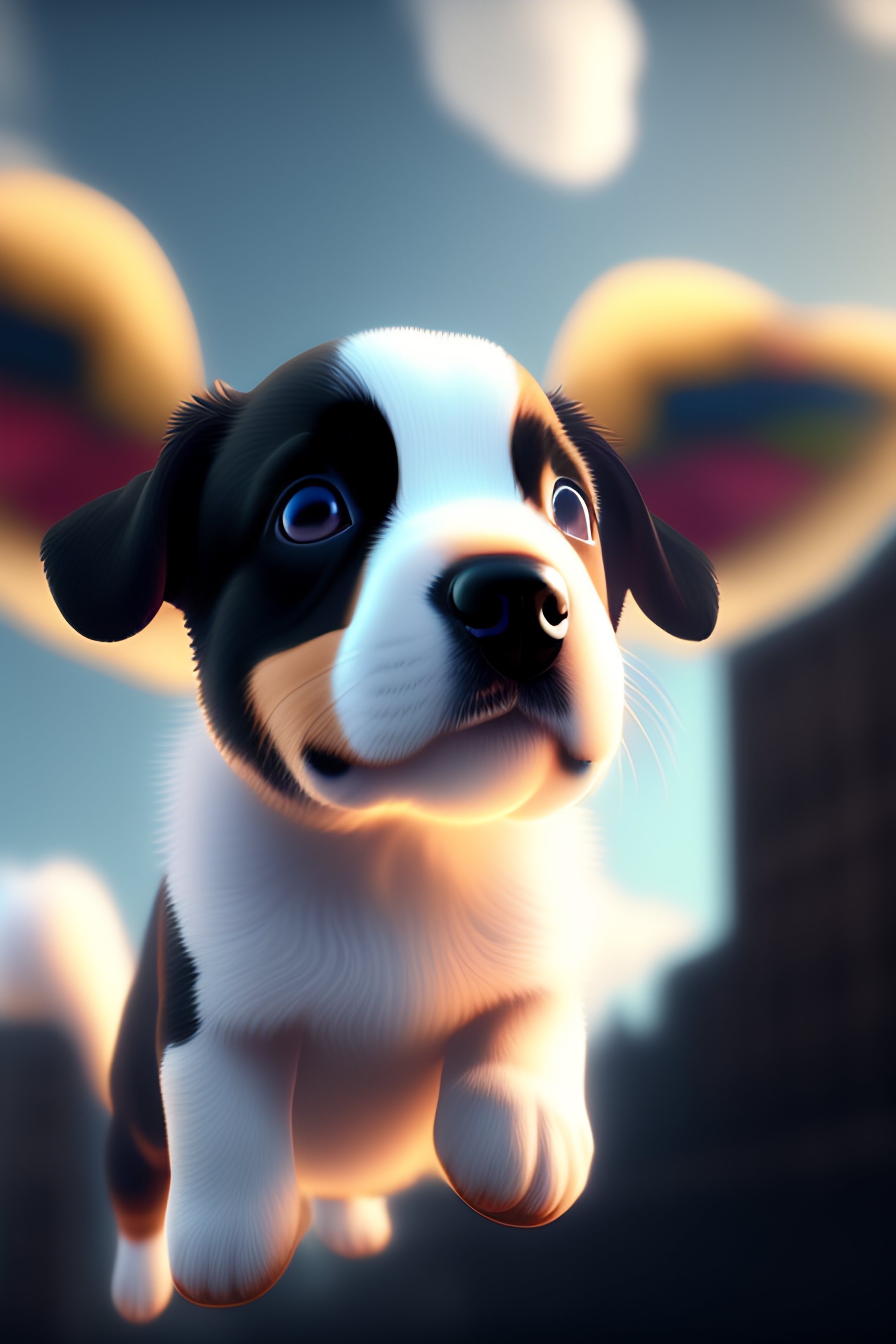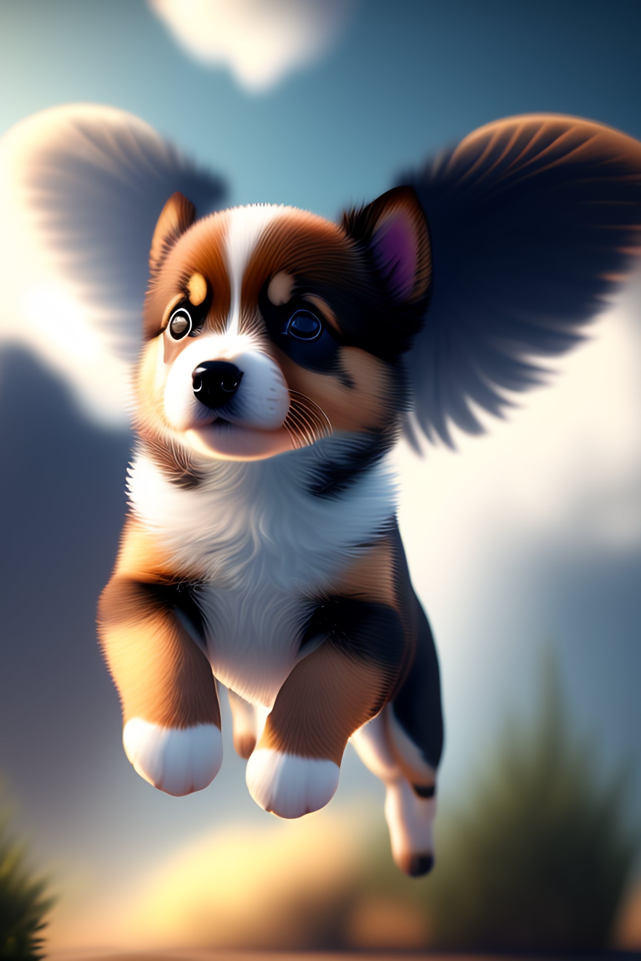 Cute puppy with wings, flying in the air, while people on the ground looking up in the air, thunder clouds, 8k realistic, unreal engine