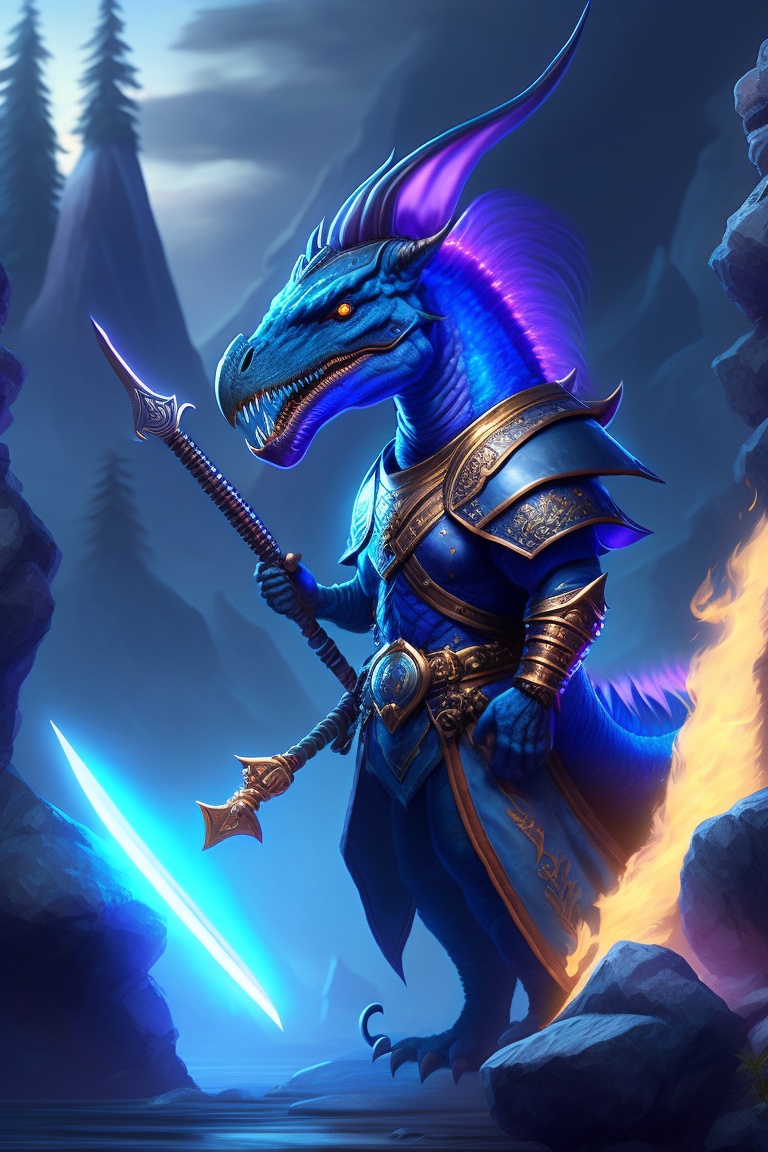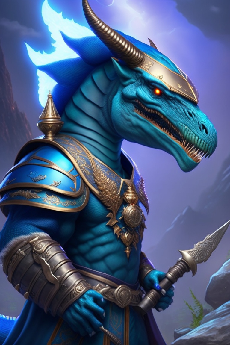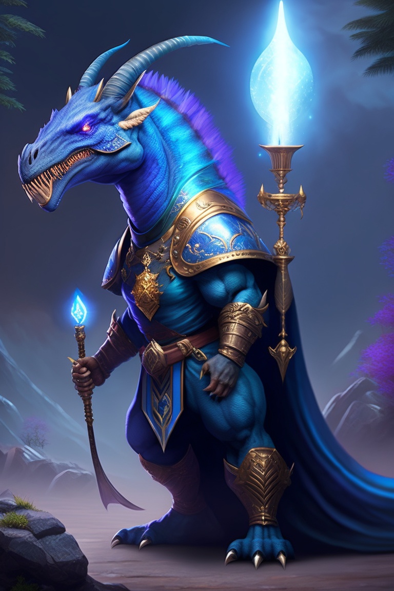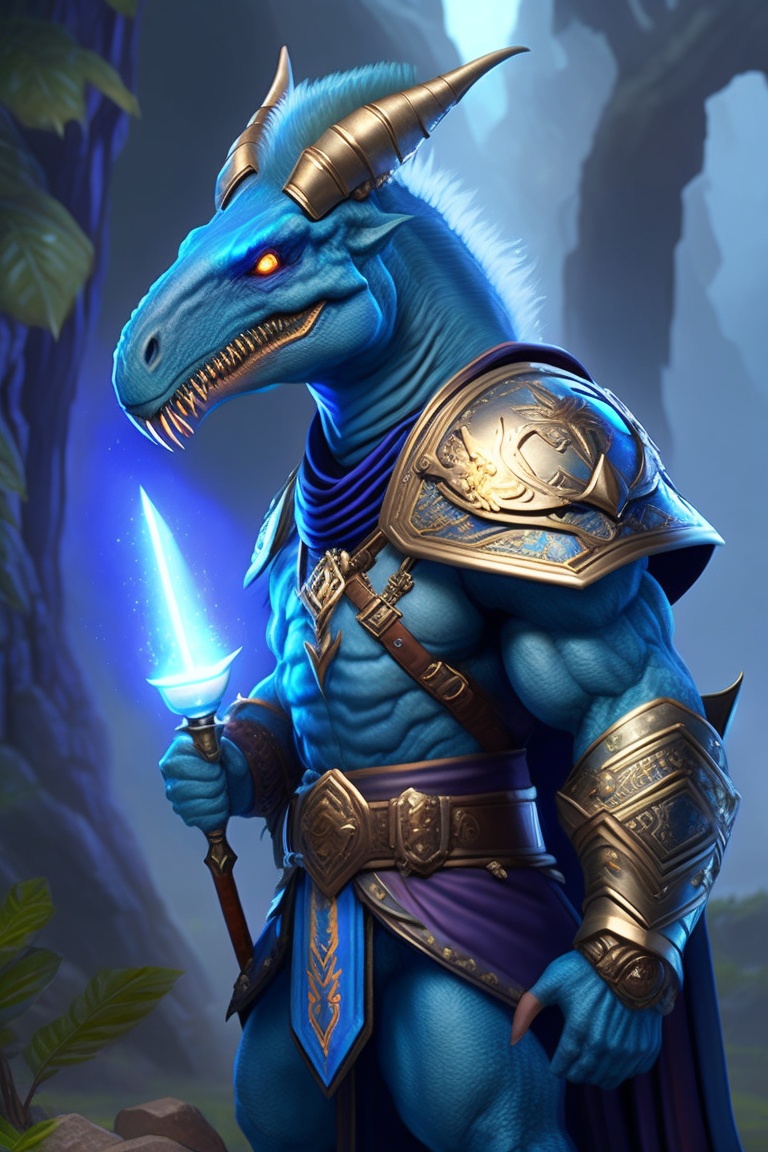 Dark blue dragonborn dinosaur druid with blue magic glow