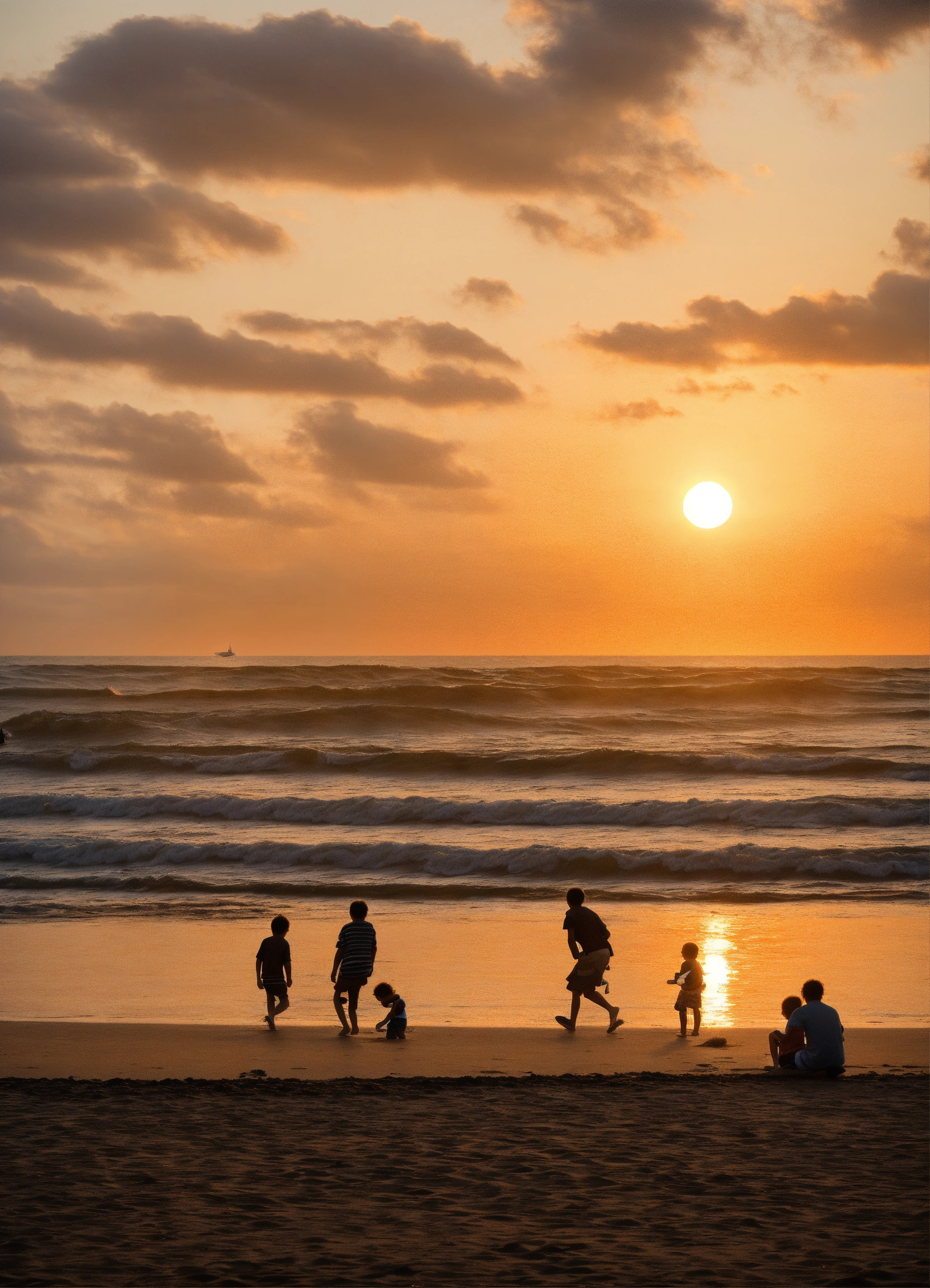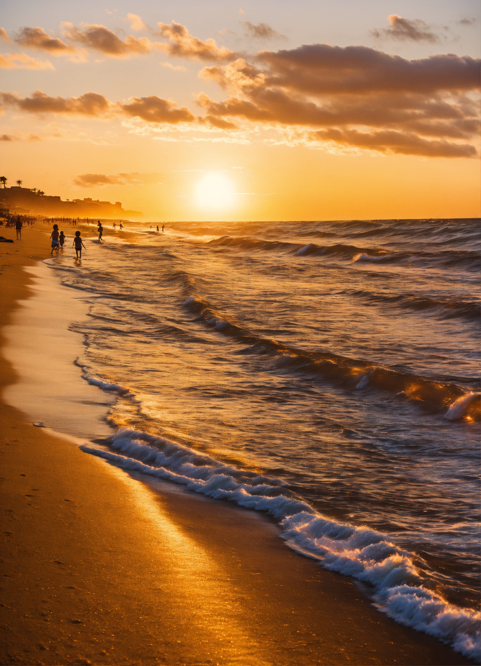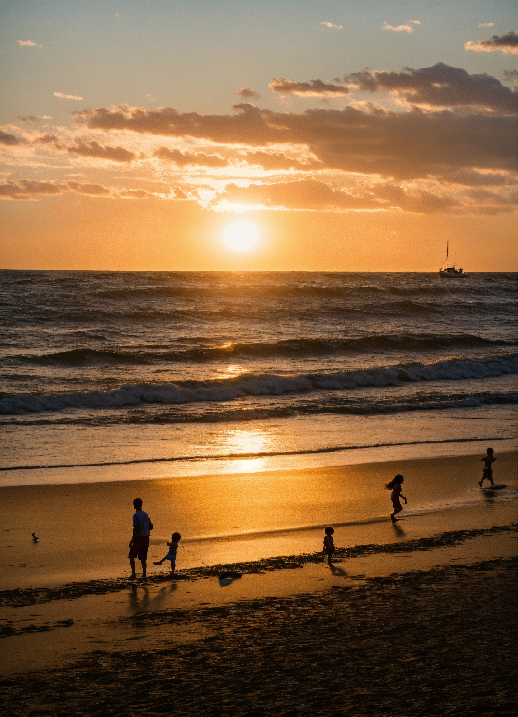 A beach at sunset, with waves coming to the shore. a boat in the far distance. a nice beach. people and kids playing on the beach.