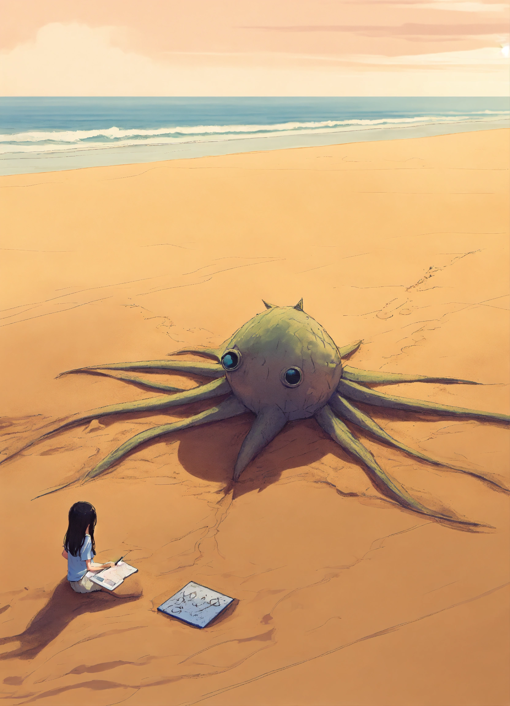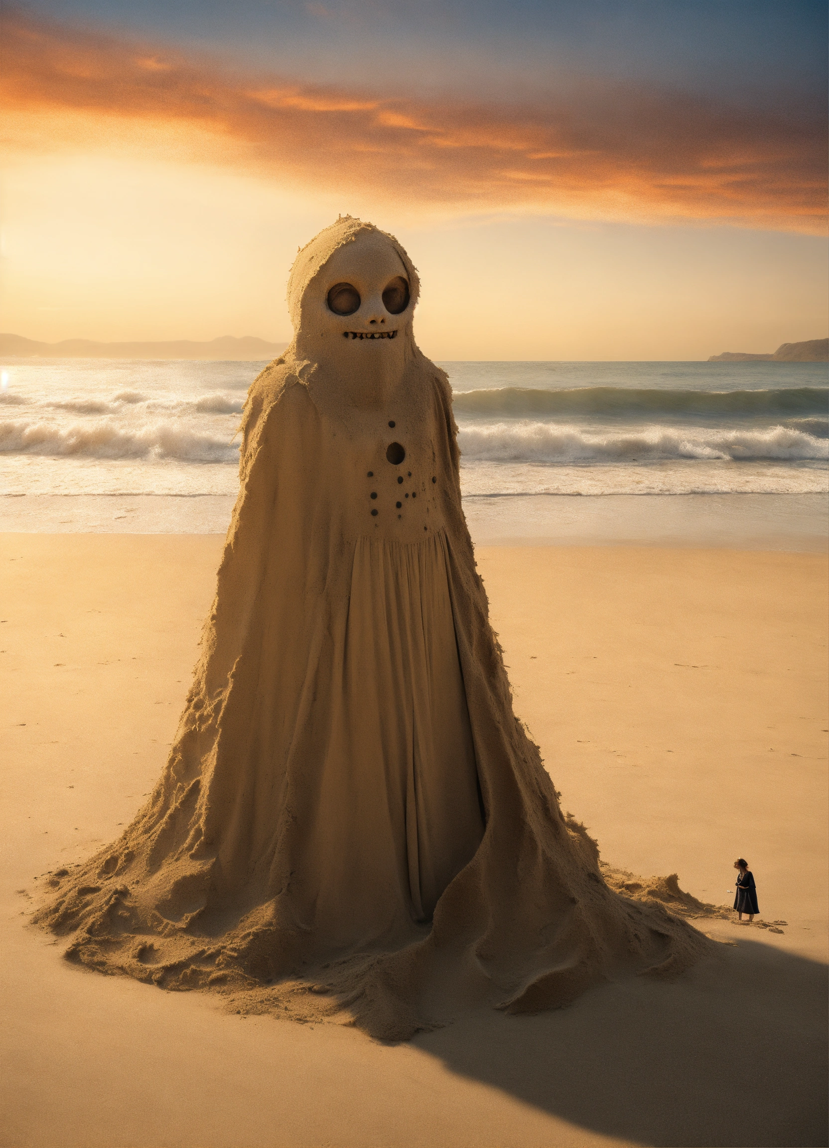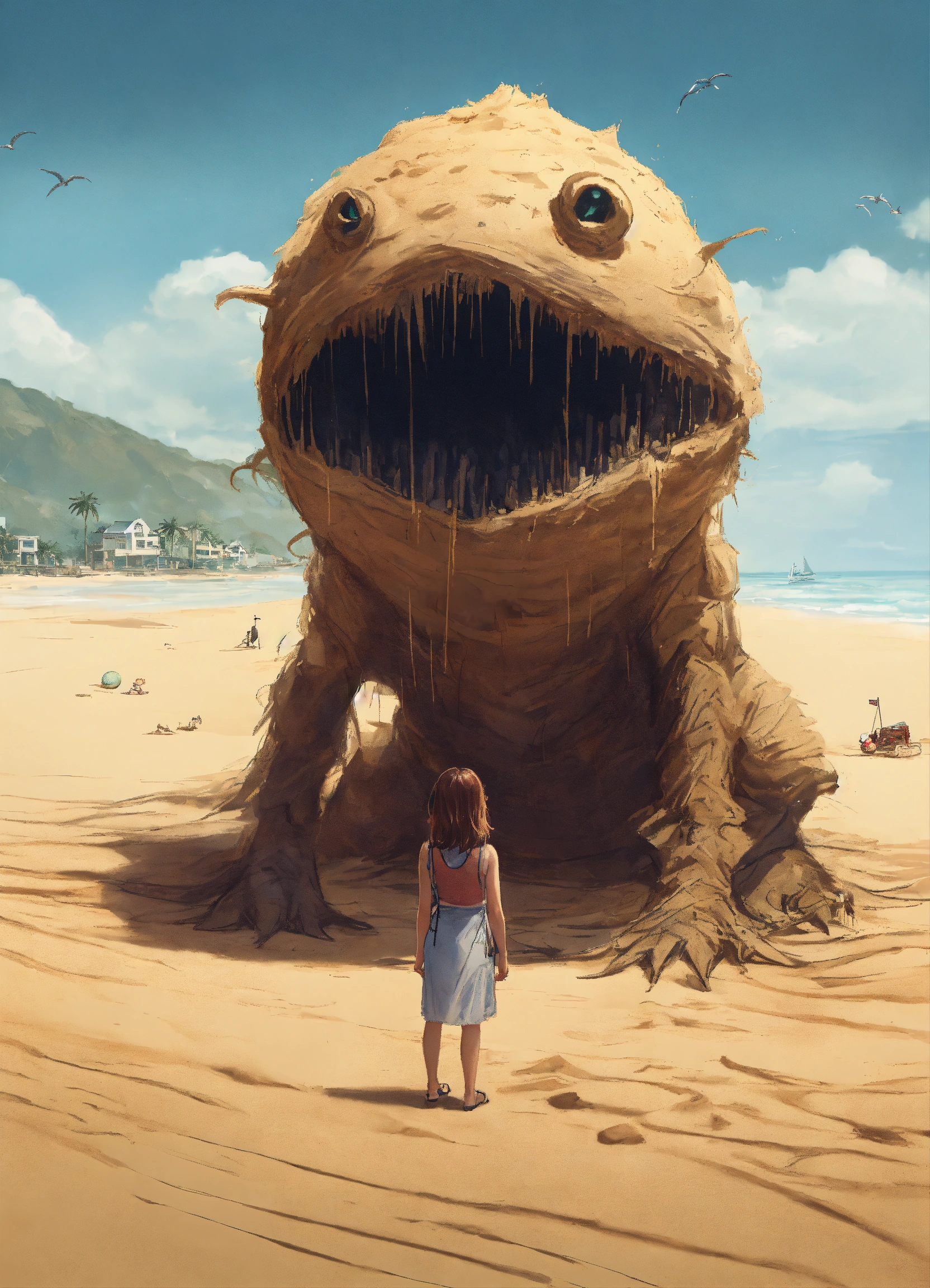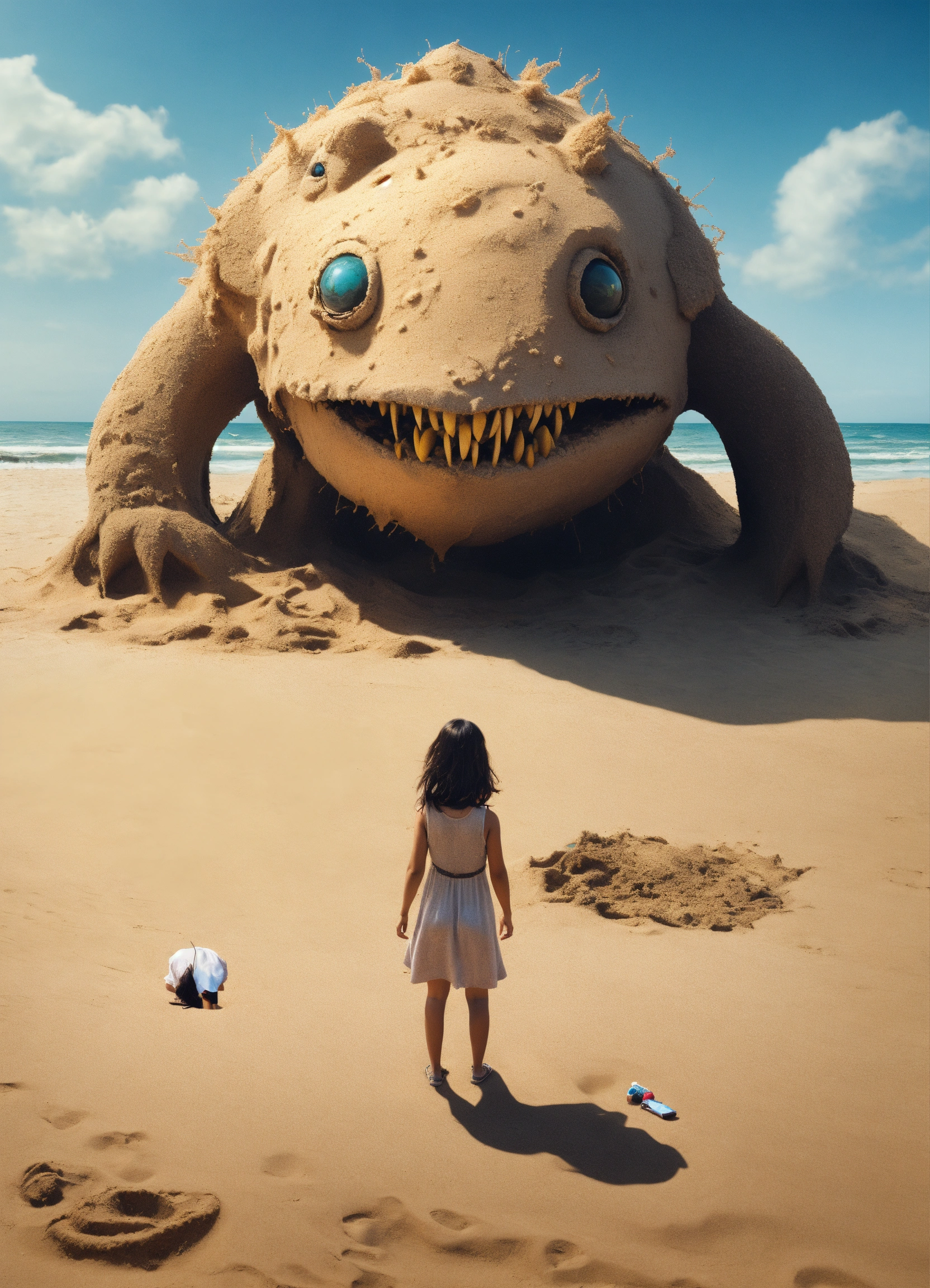 A monster under the sand on a beach, using the girl as a crafty decoy to become a part of 'her' and draw in unwitting prey.