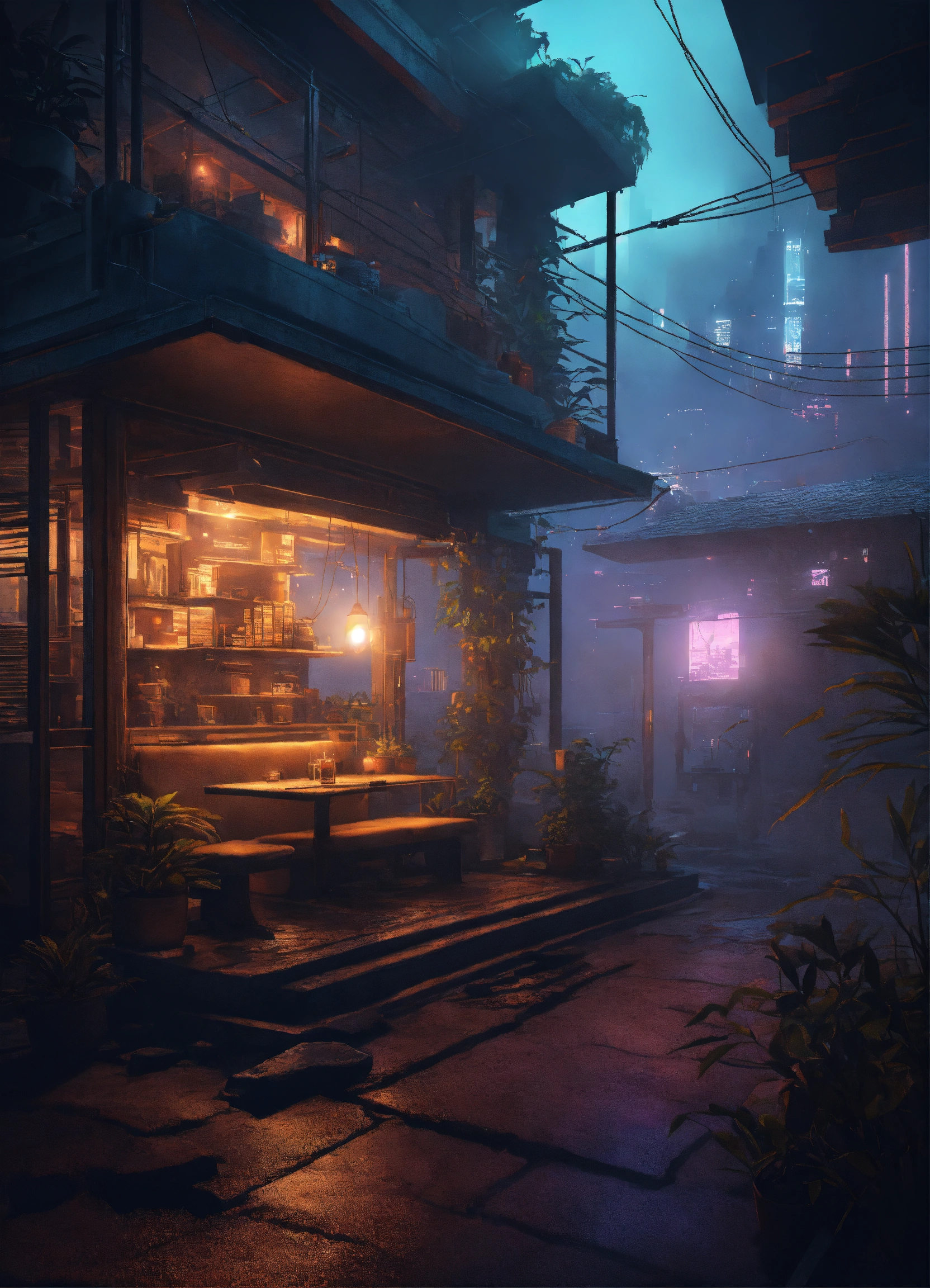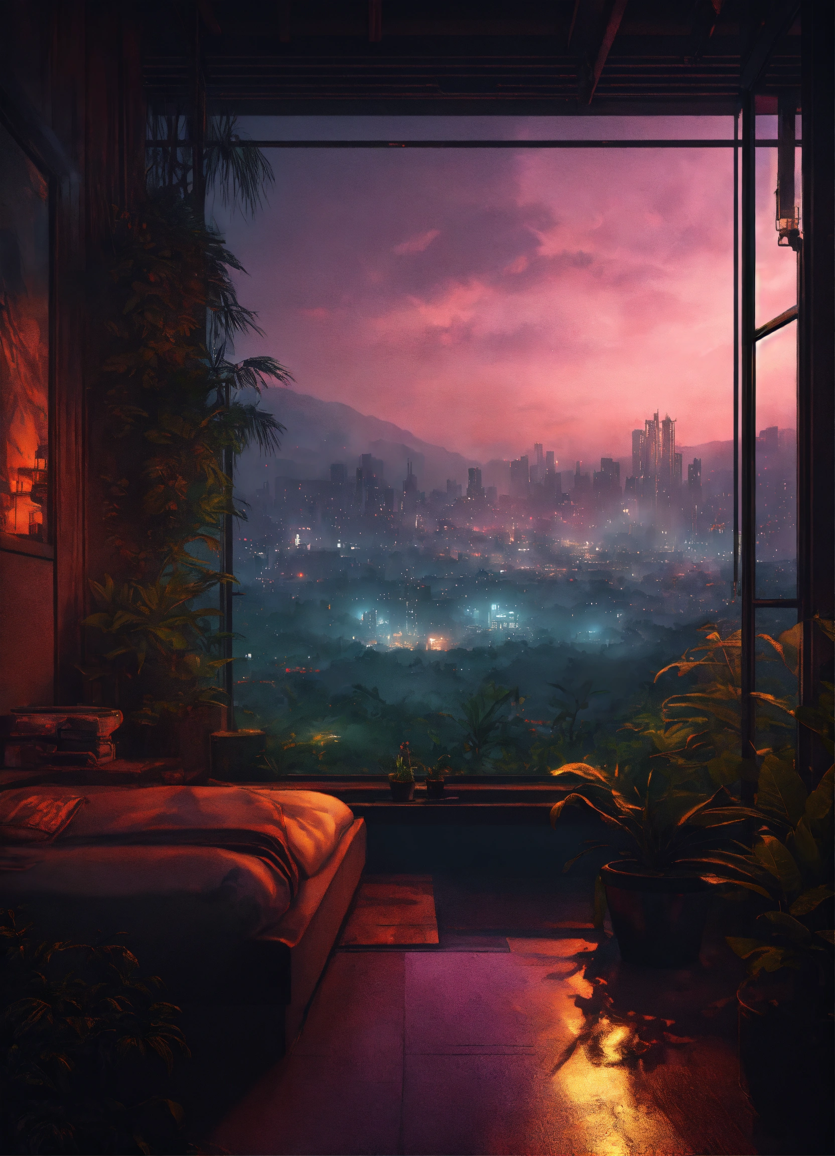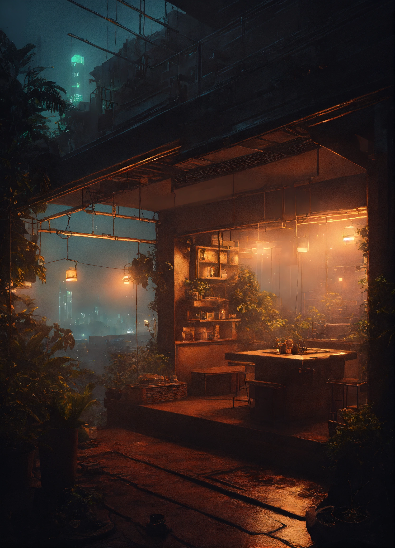 Beautiful cozy oasis with a view overlooking a cyberpunk oasis at night, foggy outside, detailed aesthetic, high resolution, photorealistic, dark, gloomy and moody