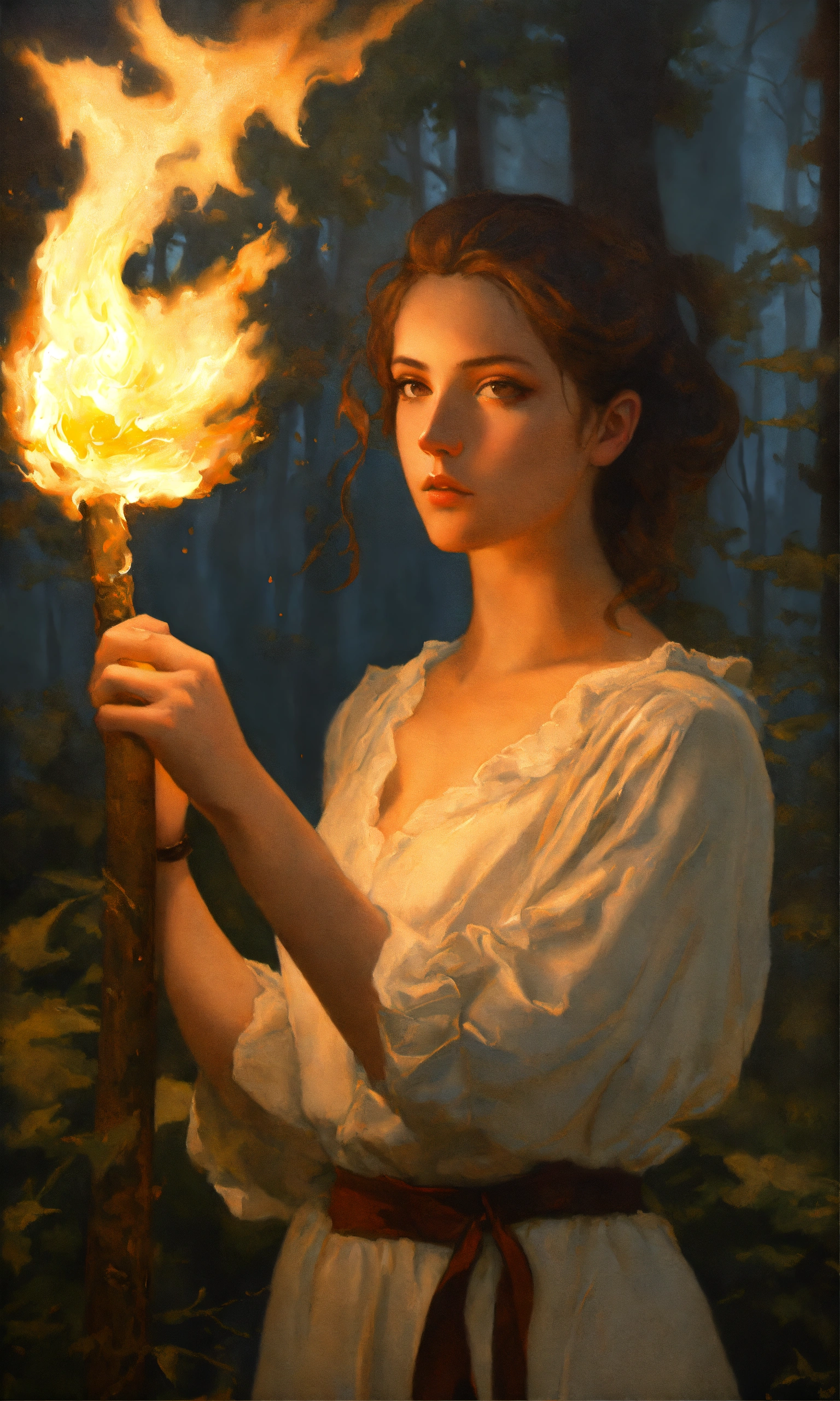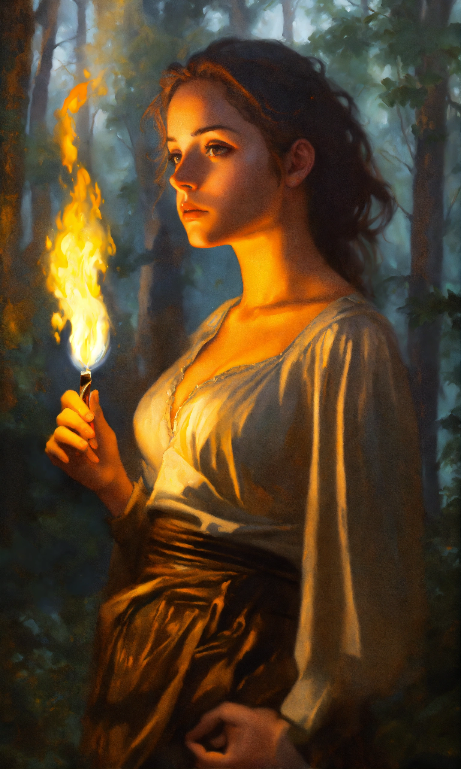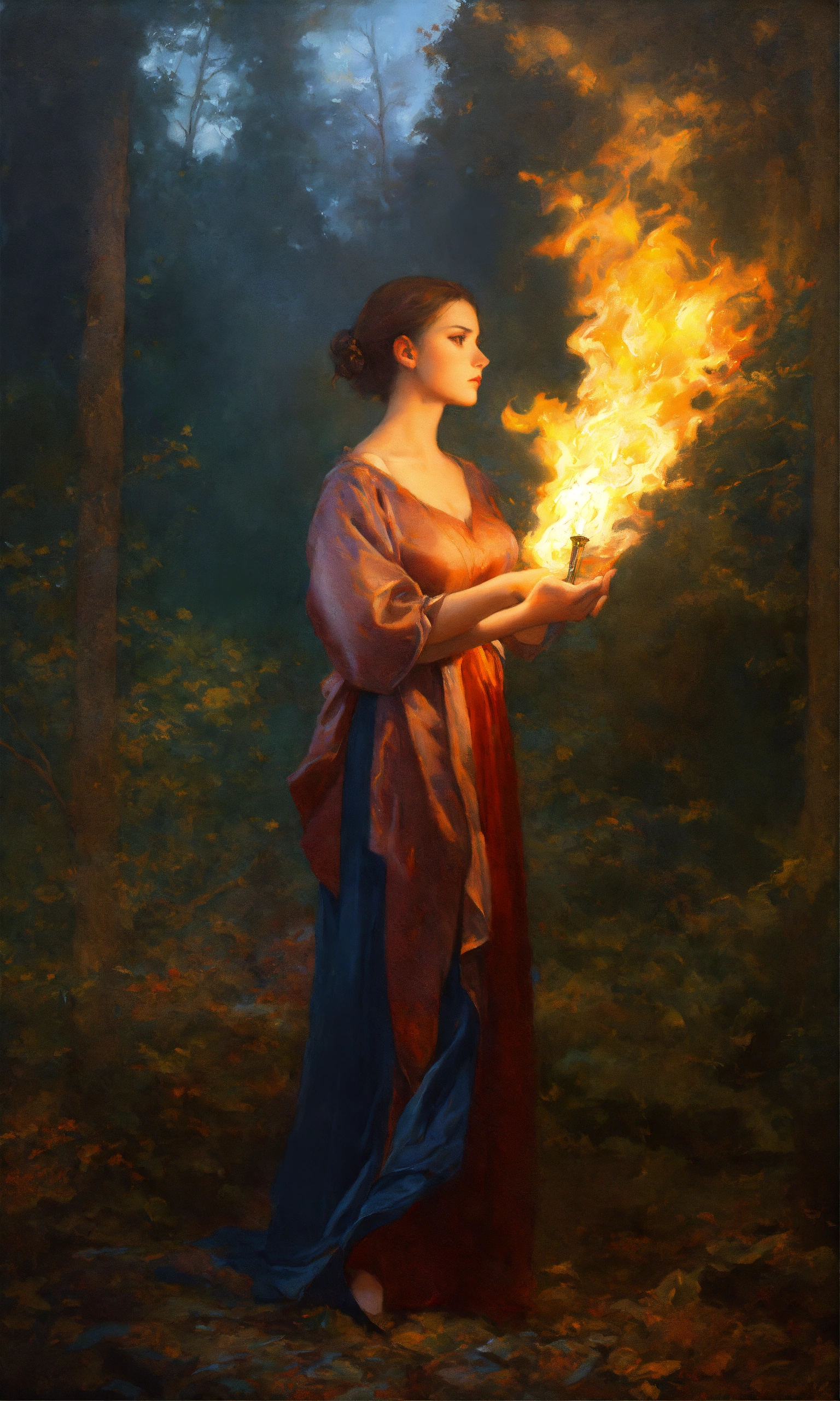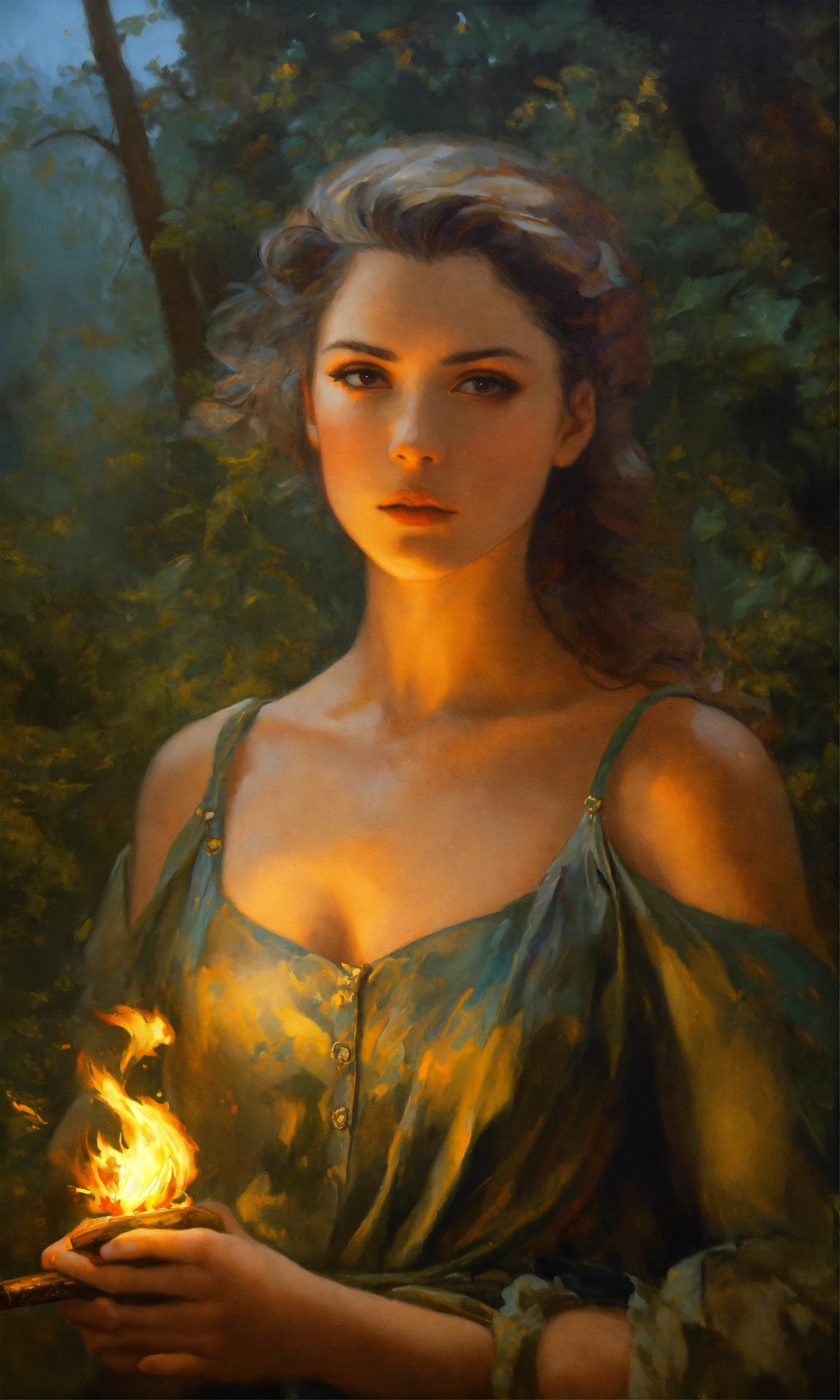 Atelier, oil painting style, cesar santos, roberto ferri, beautiful young woman, pensive expression, magic powers, wielding fire, twilight background, in forest