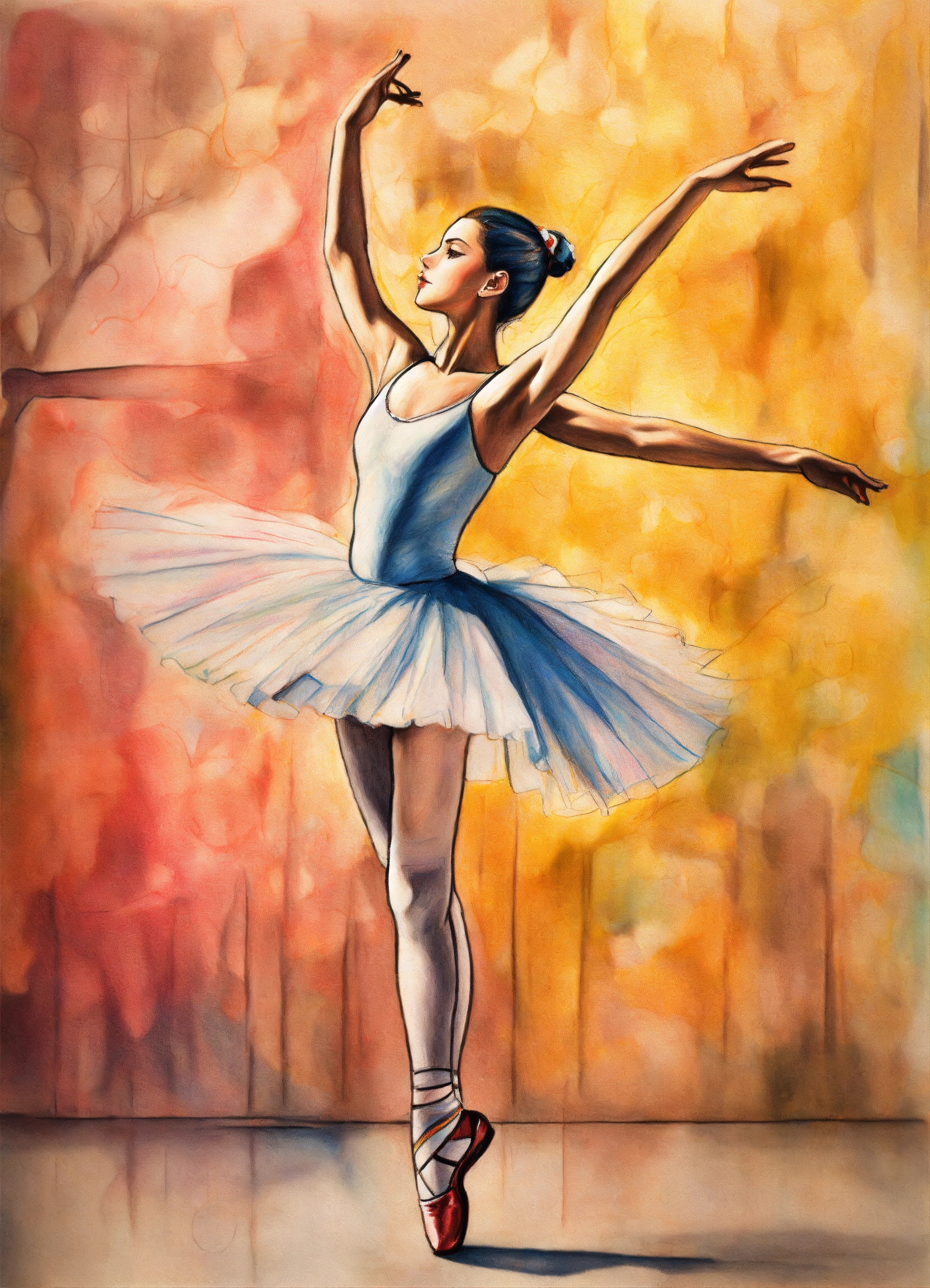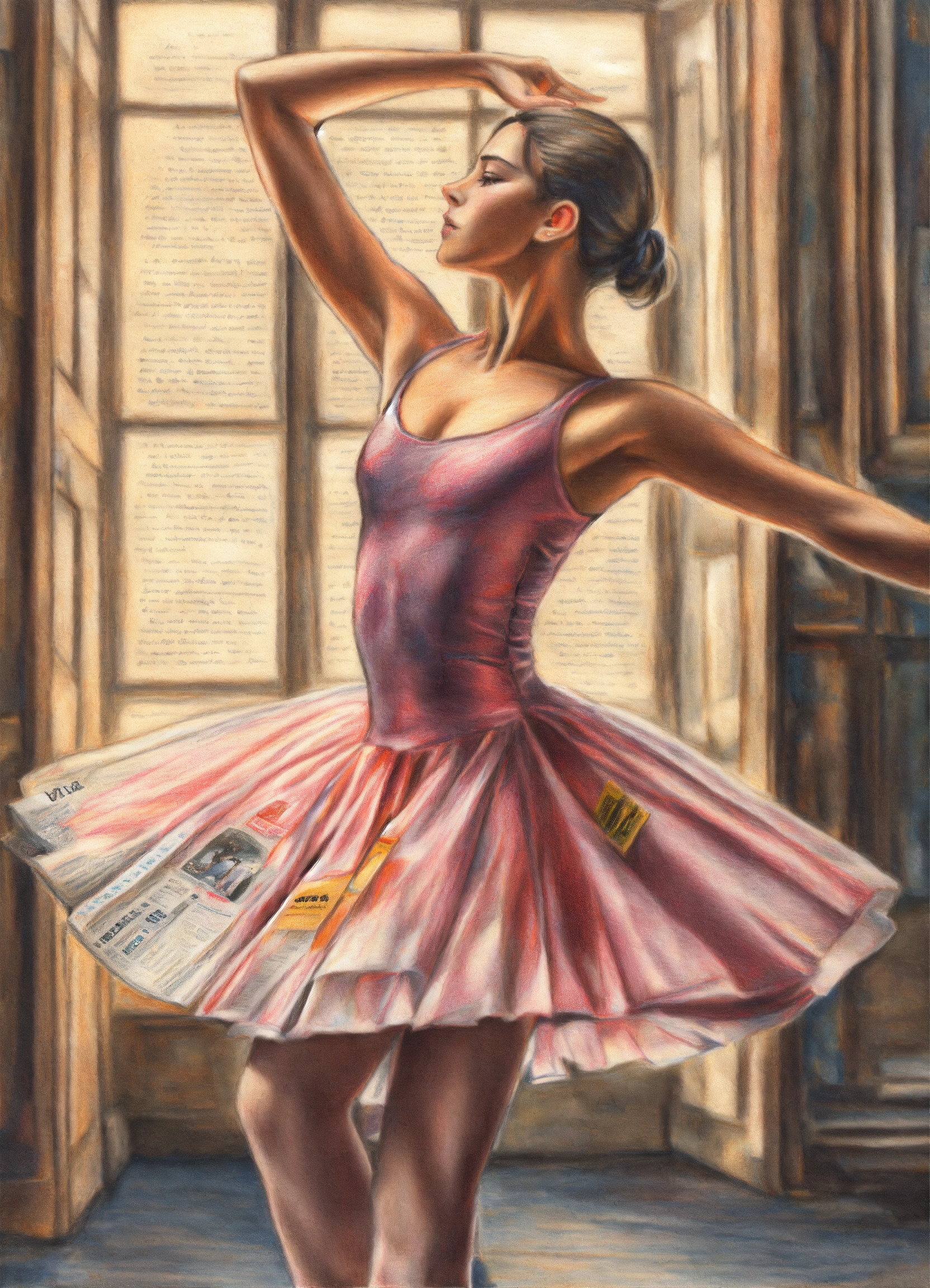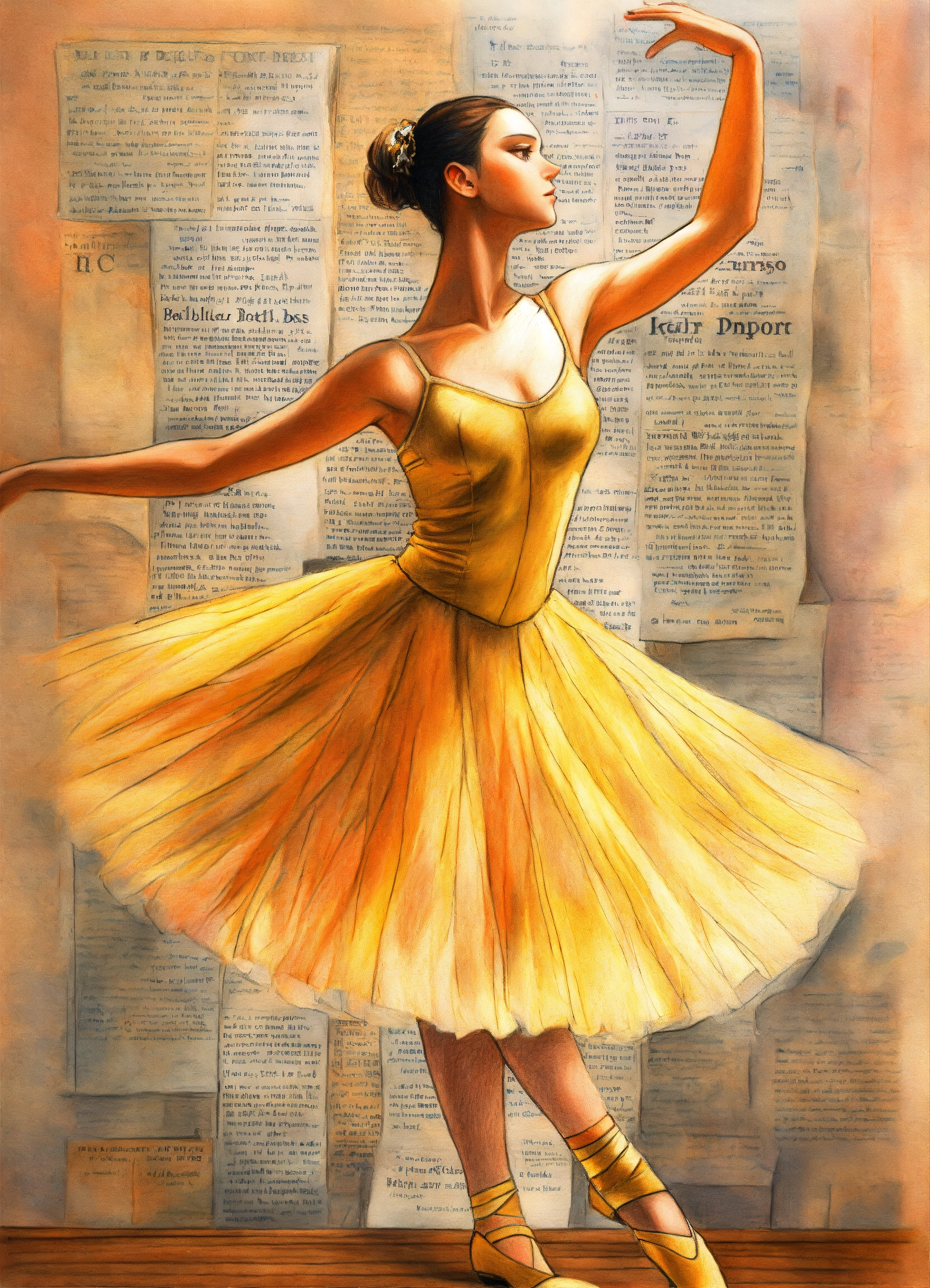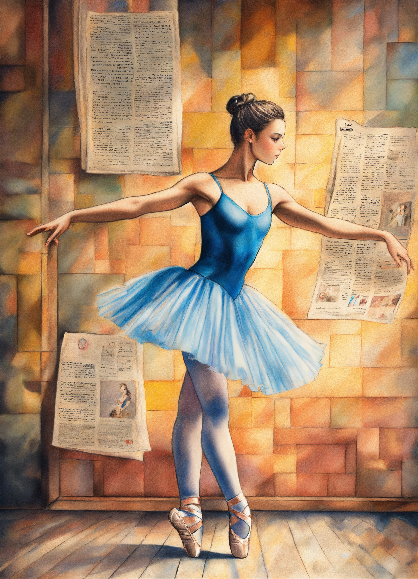 A coloured pencil drawing of a beautiful ballet dancer which is shown with a newspaper background. the ballet dancer should be slightly transparent, 8k, sharp focus, cinematic