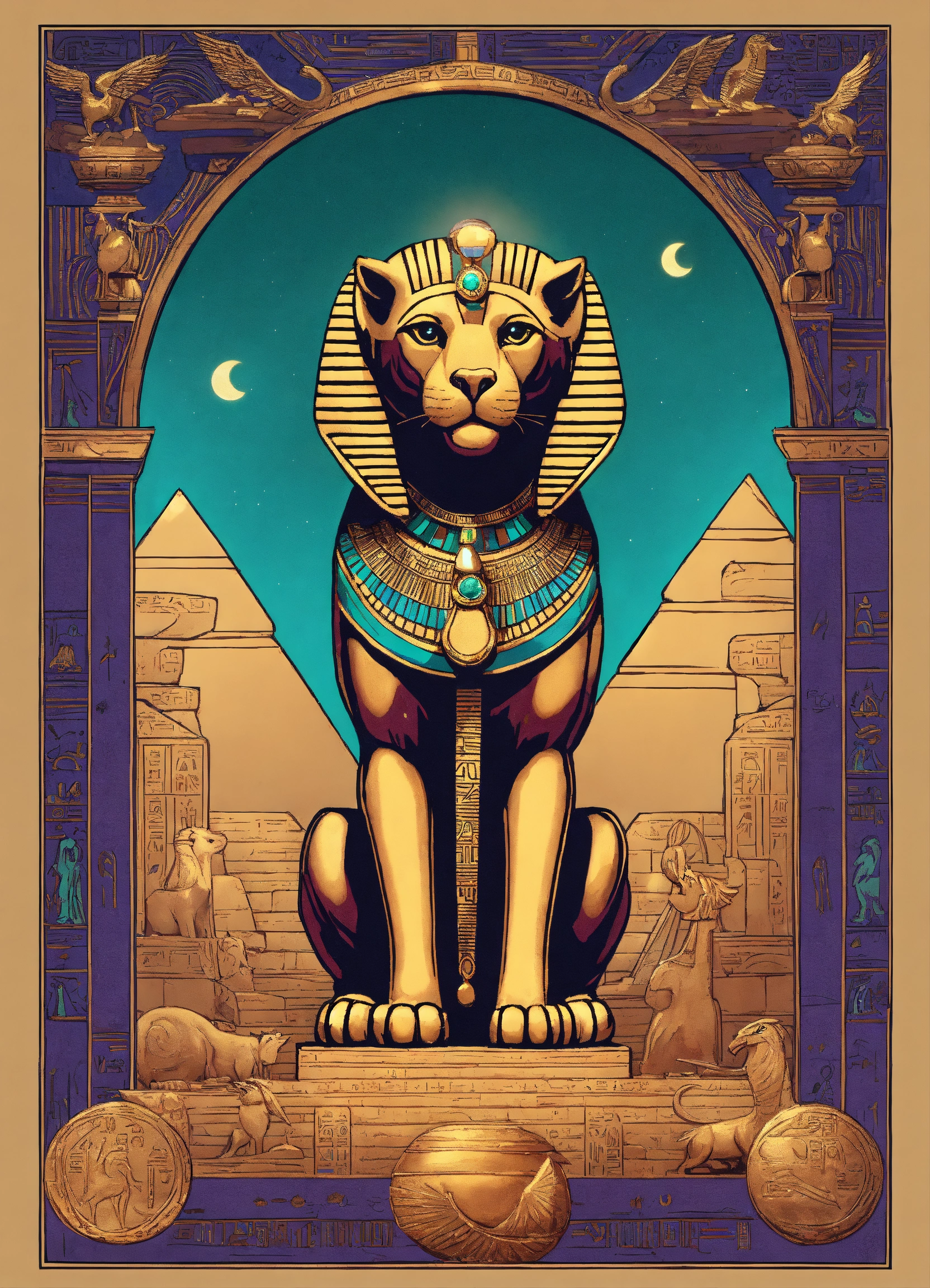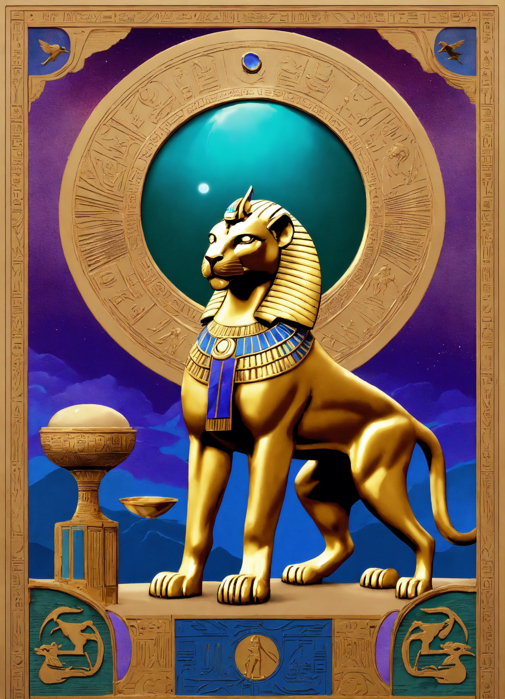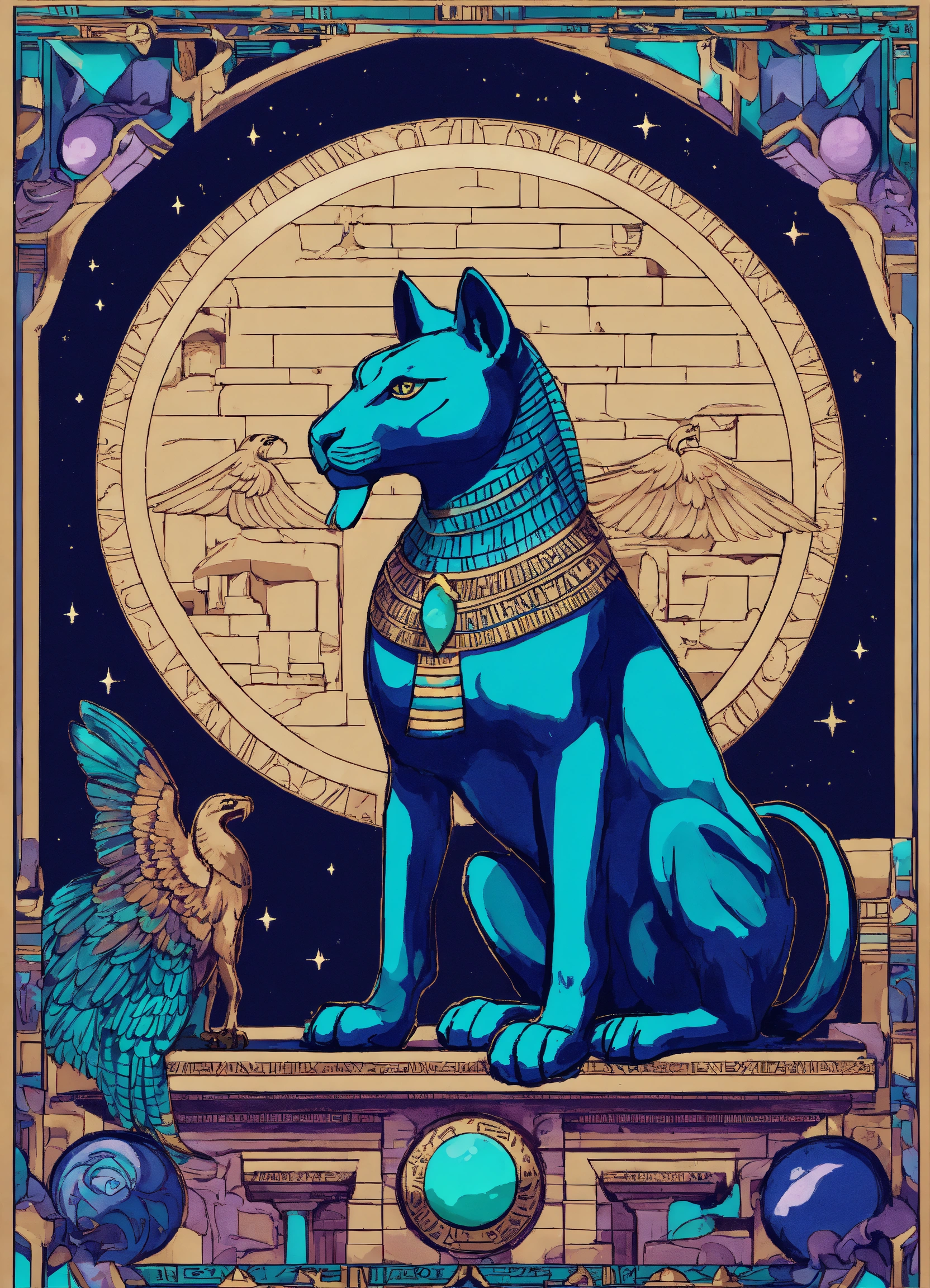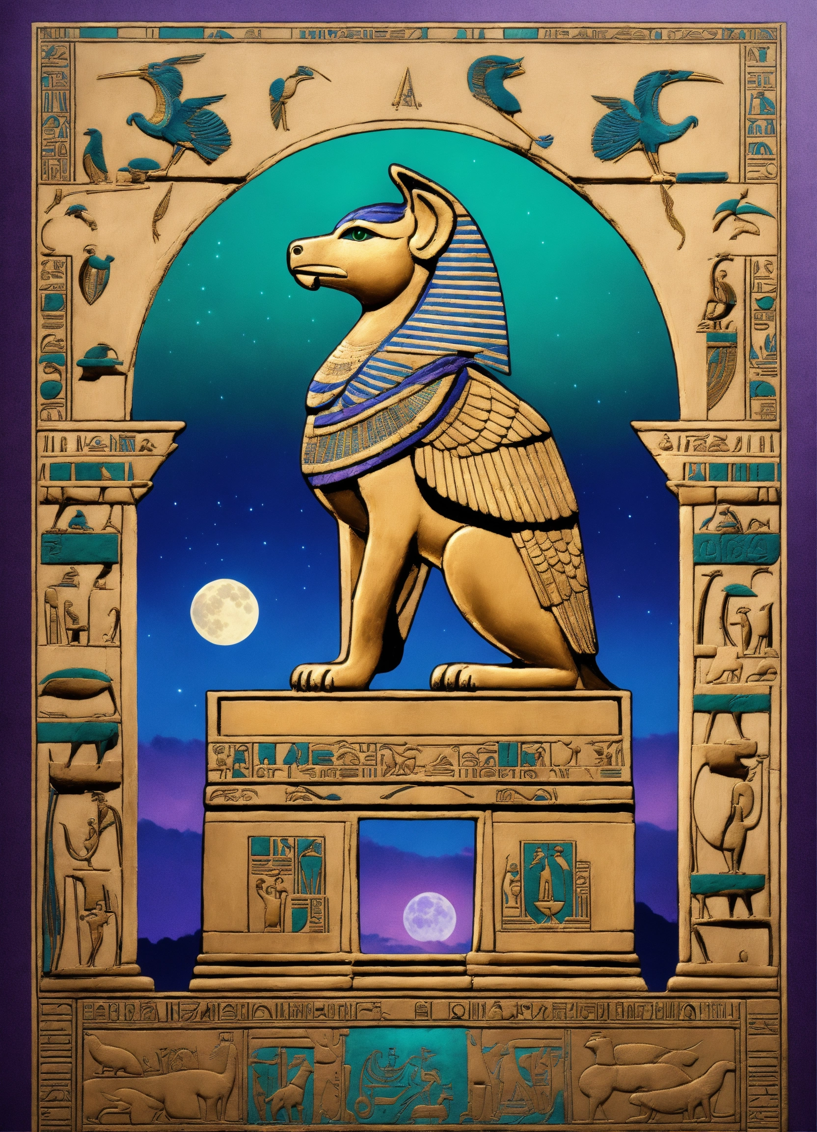 All superrealism style egyptian card style egyptian griffin in the center hieroglyphs all around outdoor big blue moon cream beige purple turquoise emerald green royal blue glow