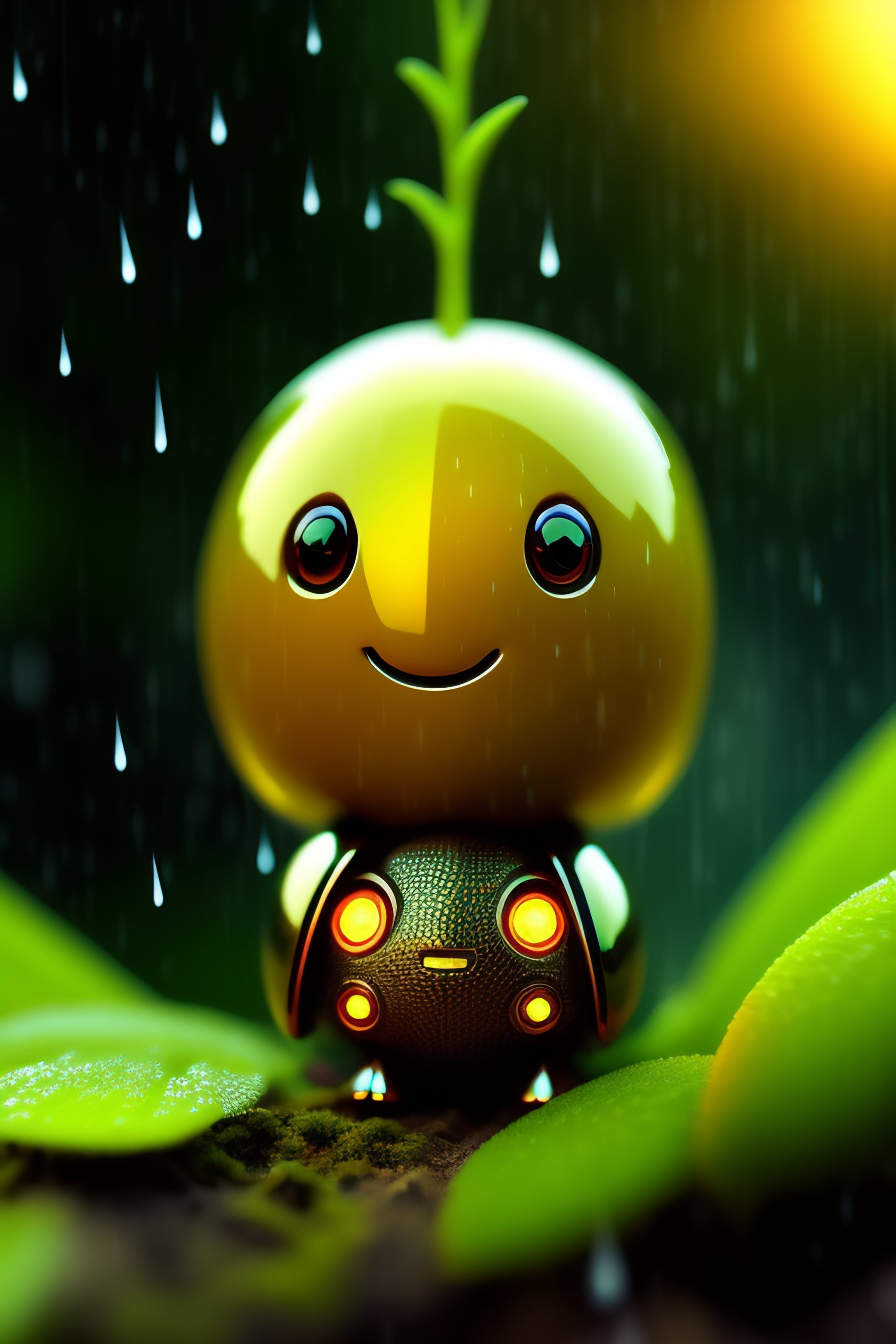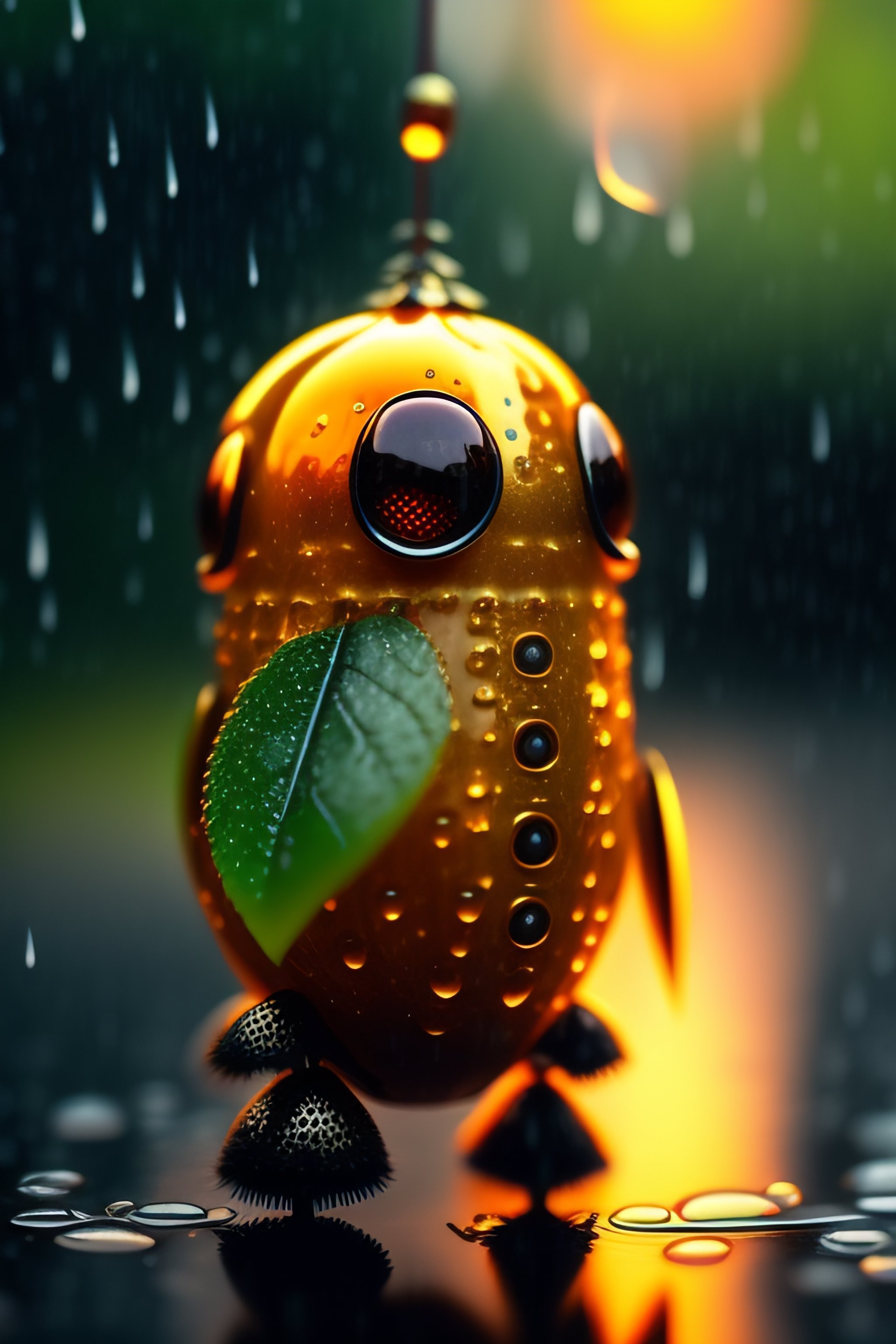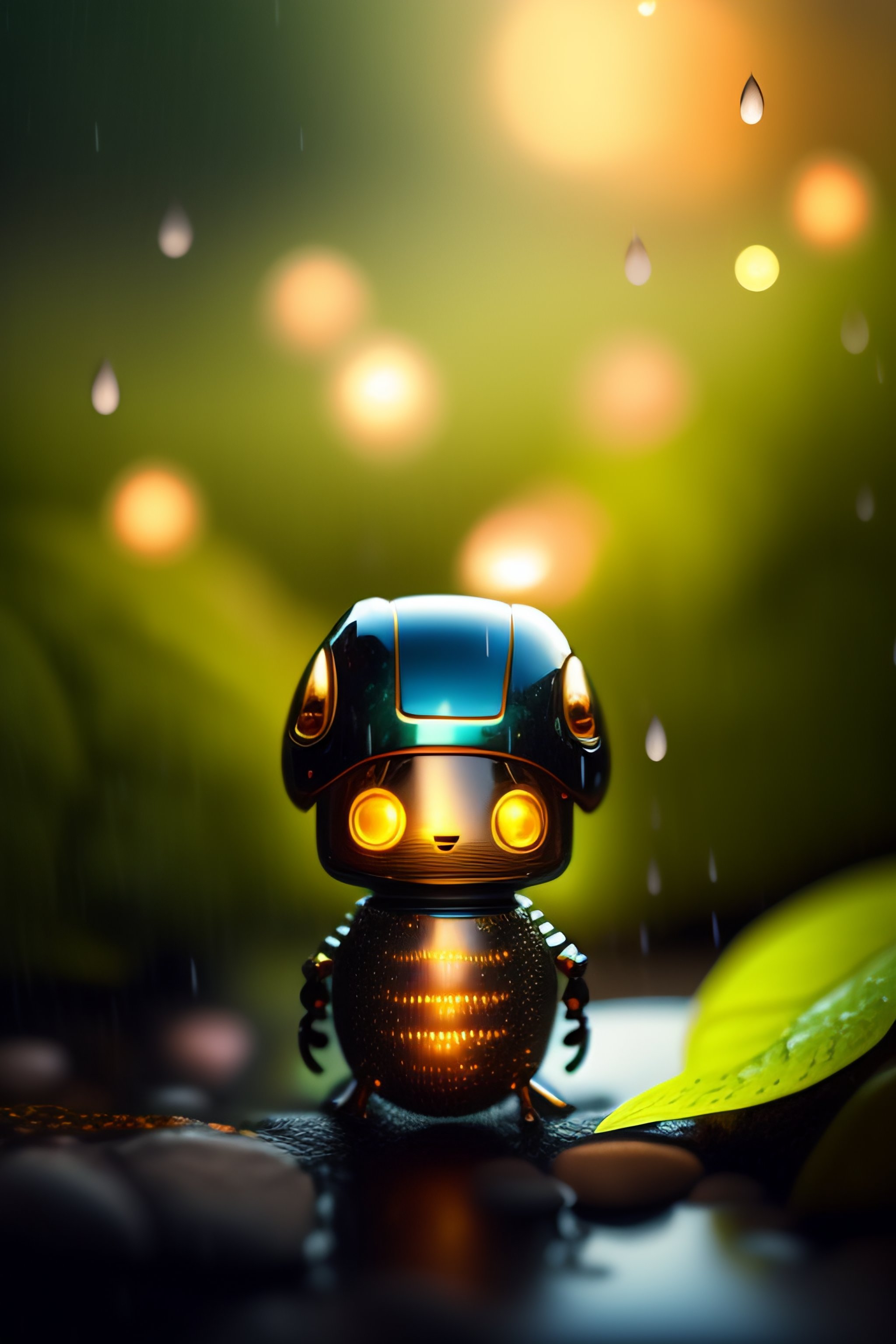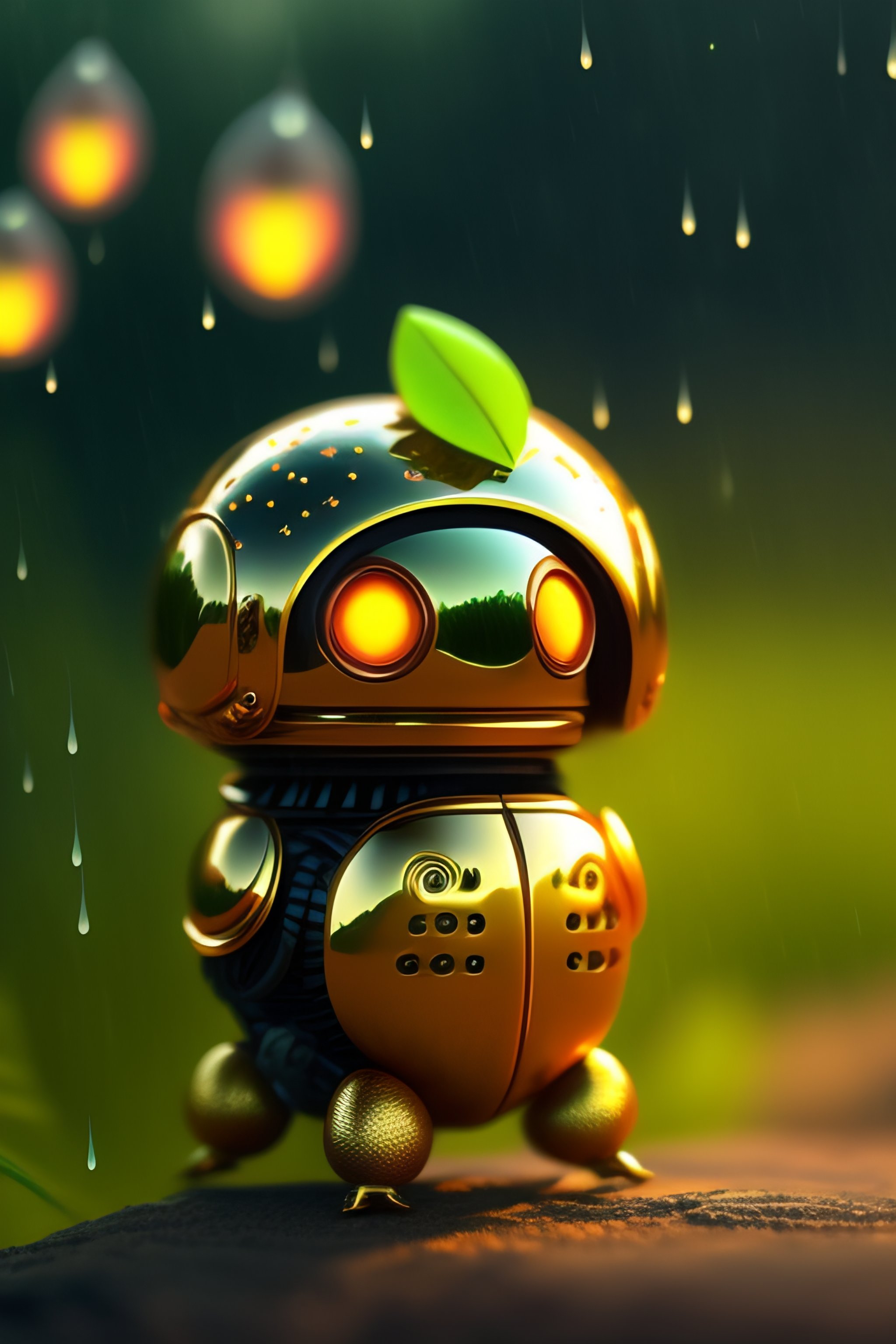 Cute tiny robot sitting under a leaf sheltering from the rain