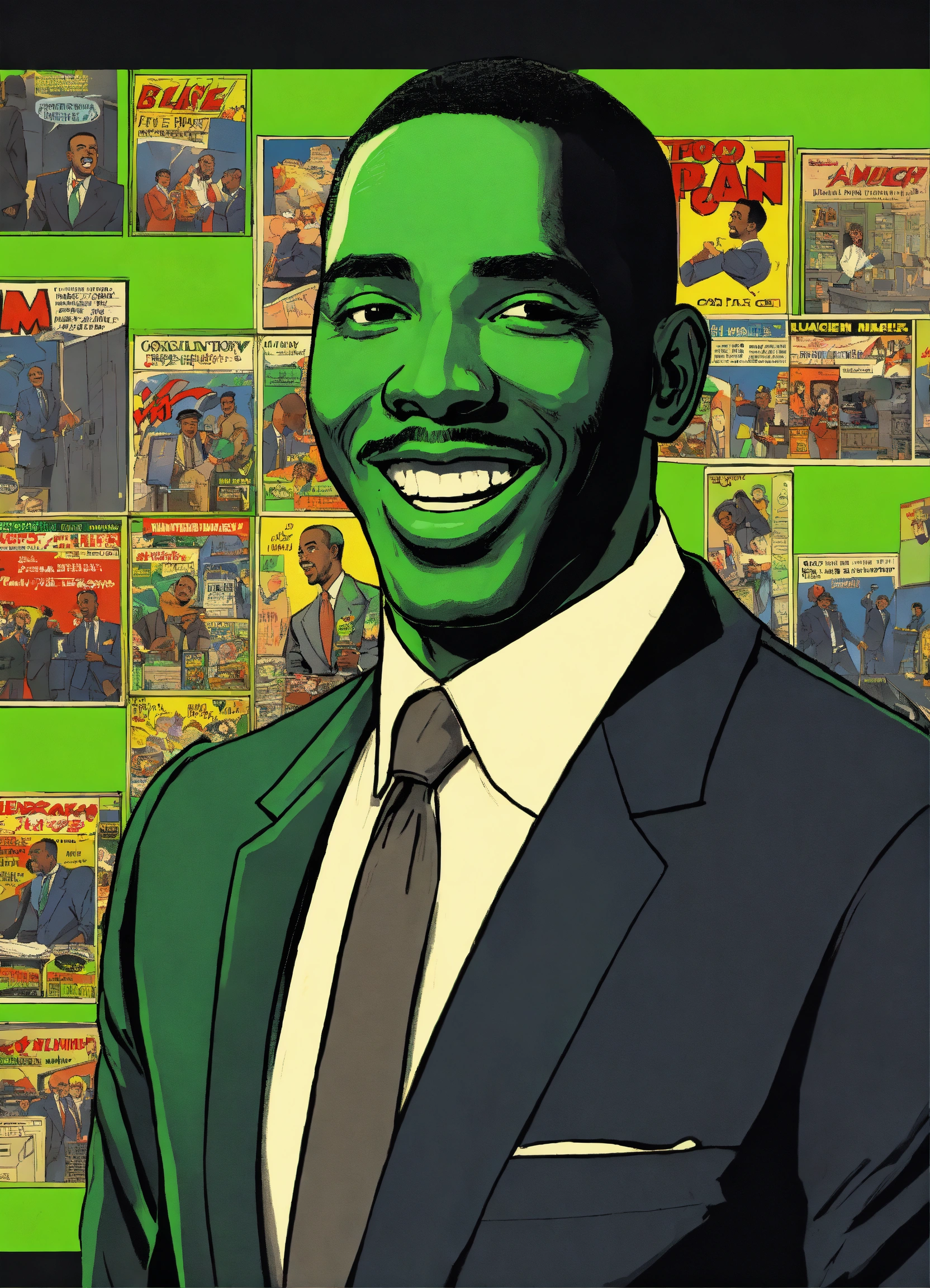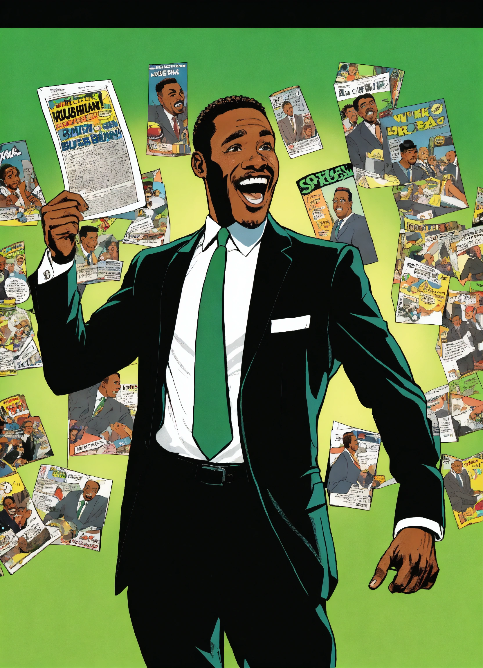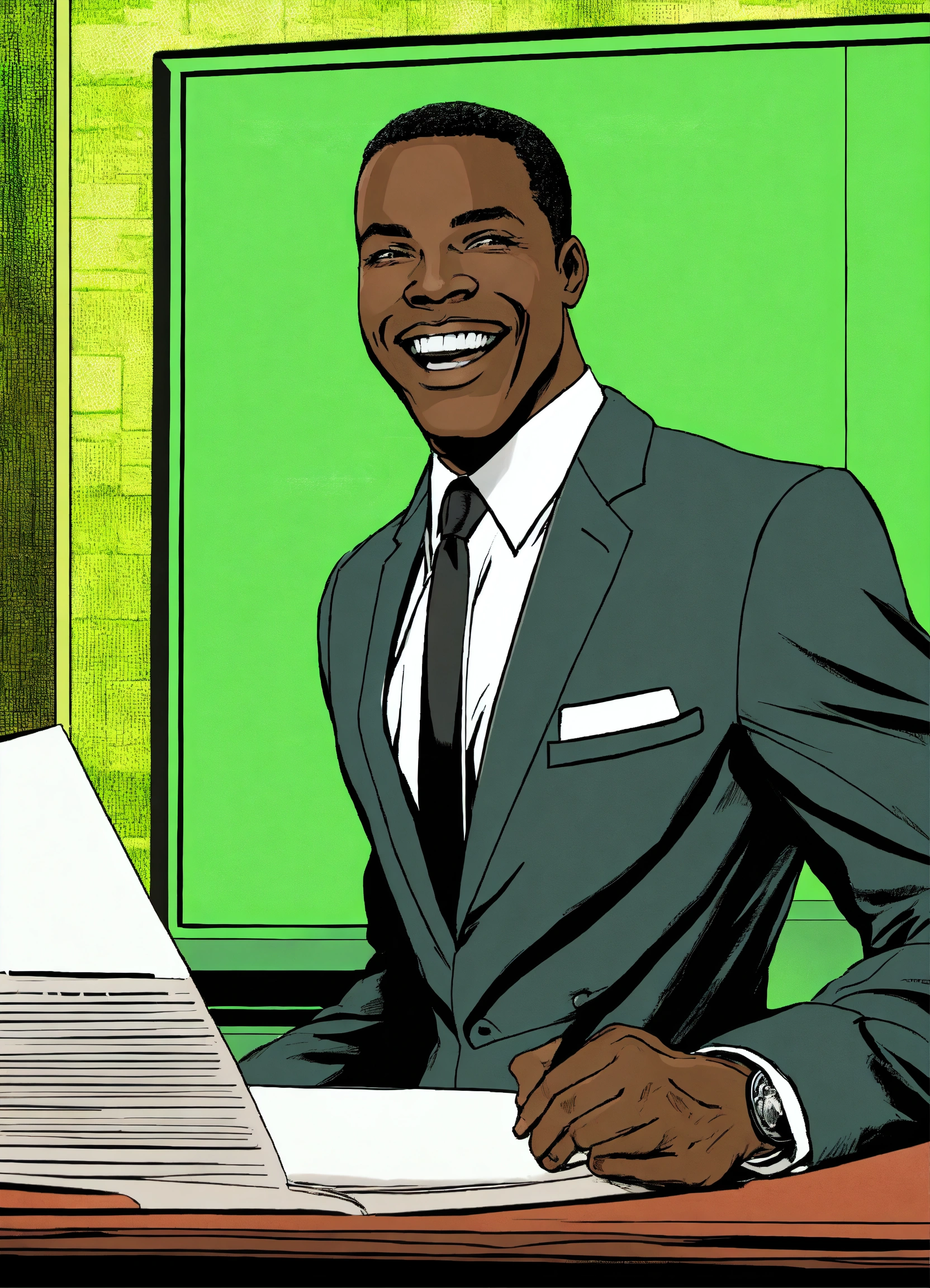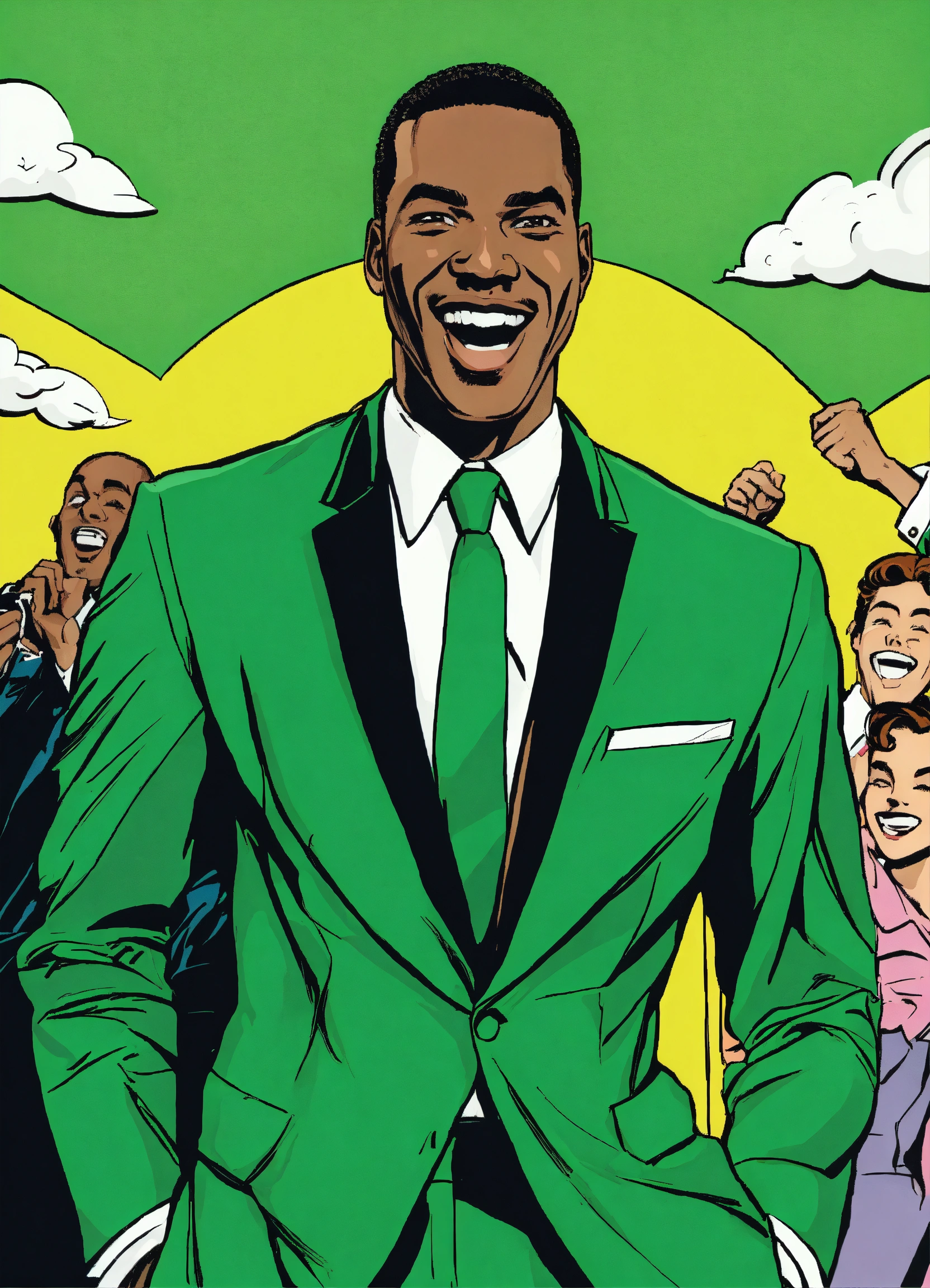 Rejoicing black business man in black suit with blank image-free green screen background drawn in 1950's comic magazine style