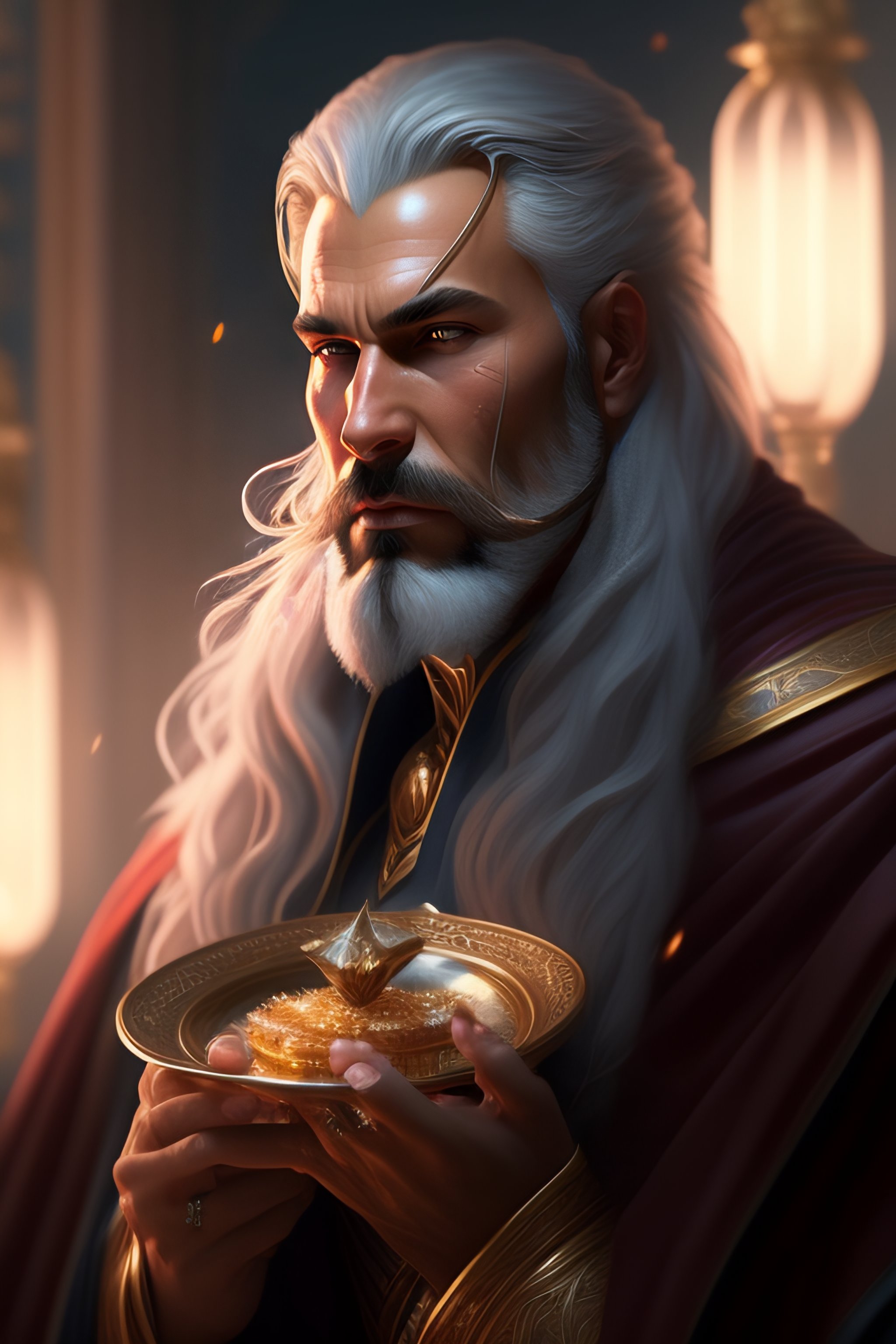 Male greasy evil wizard eating aspartame, intricate, elegant, highly detailed, digital painting, artstation, concept art, smooth, sharp focus, illustration, art by artgerm and greg rutkowski and alphonse mucha, 8 k
