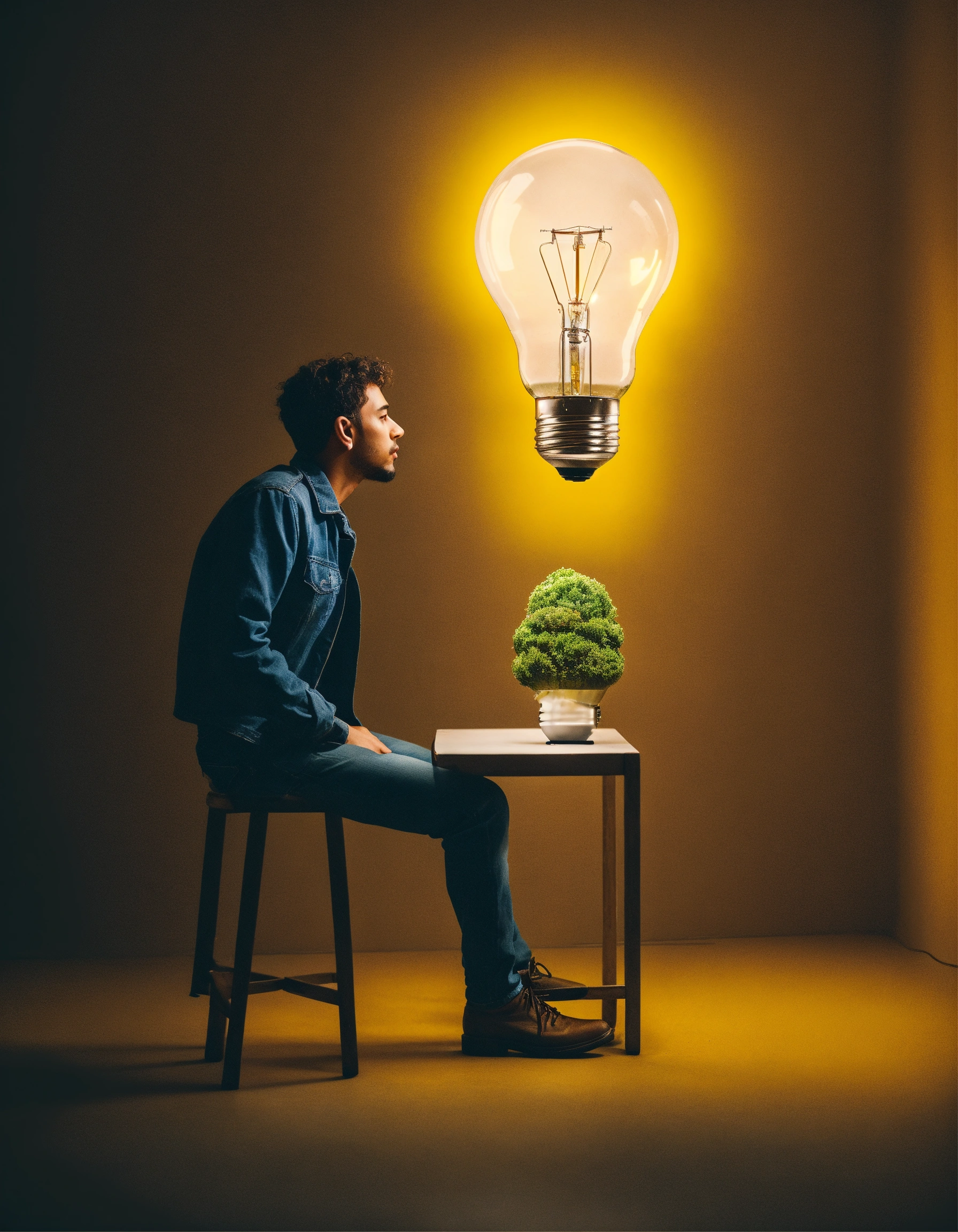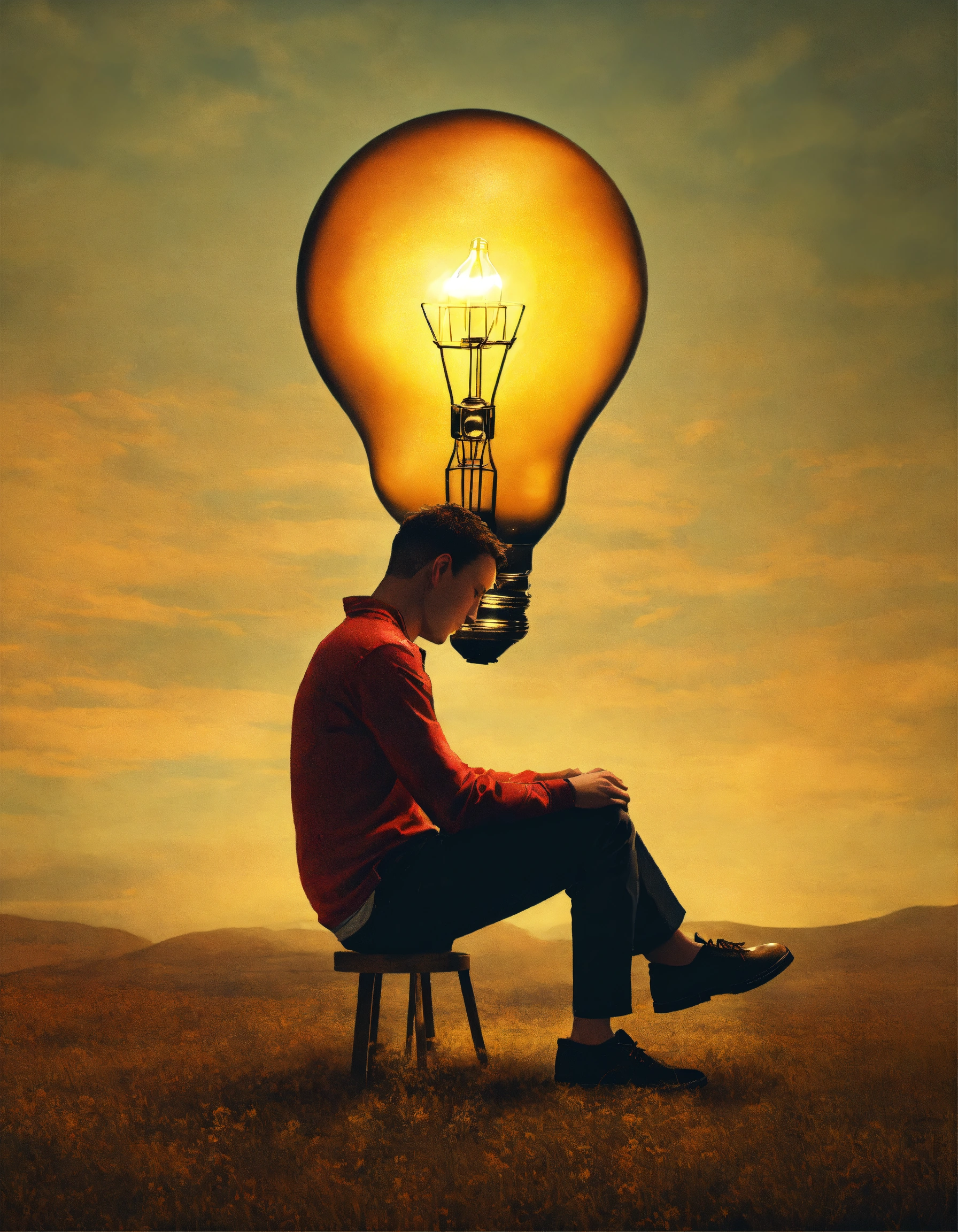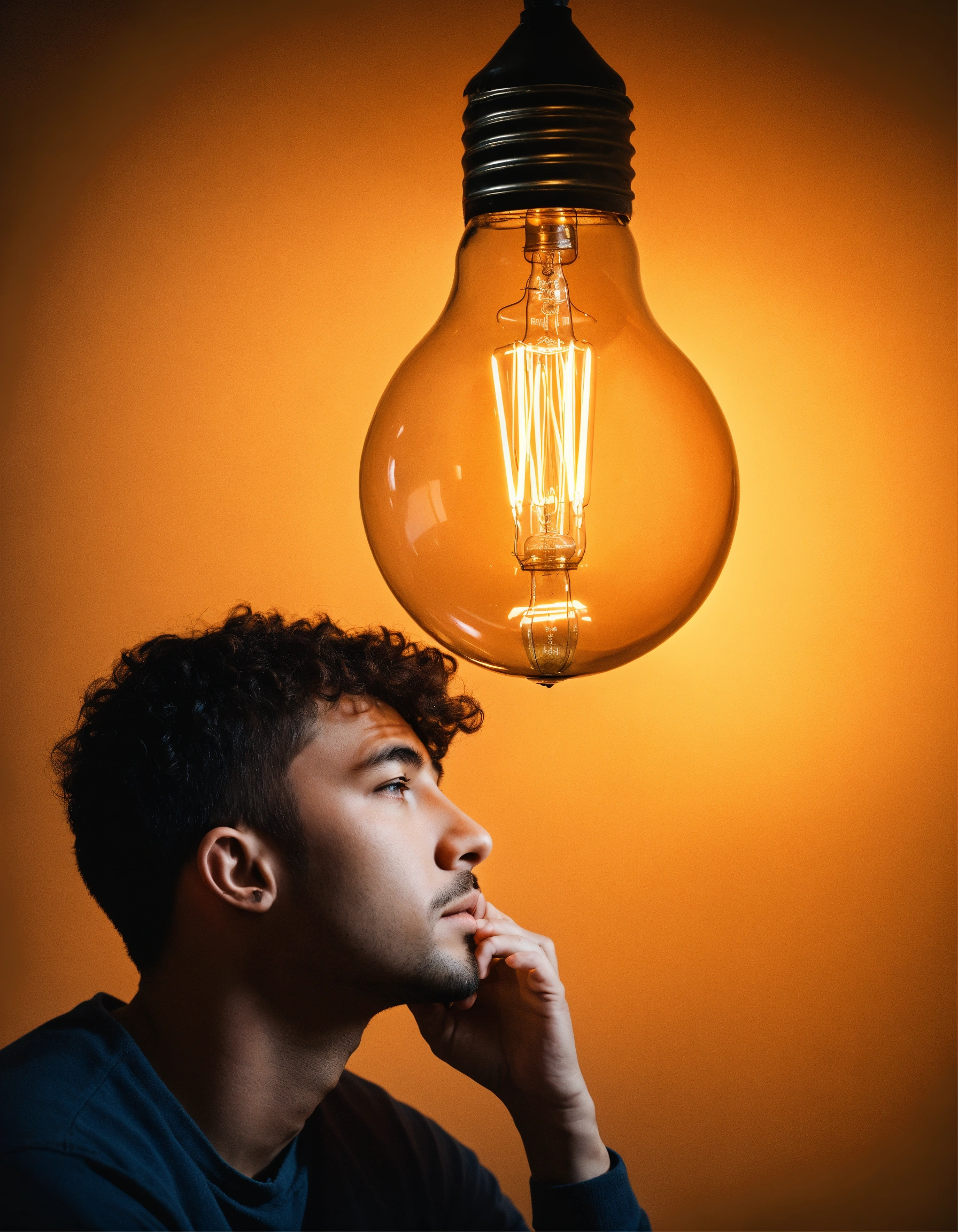 A person thinking and in his thought a light bulb