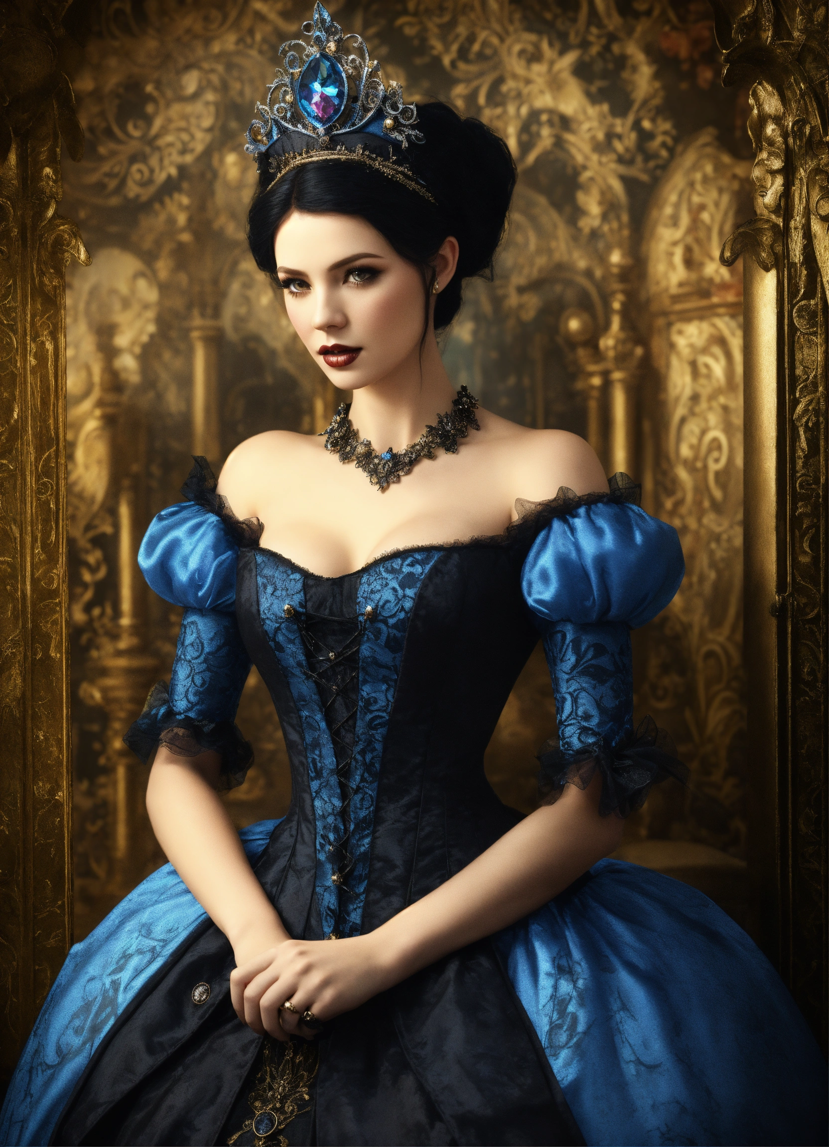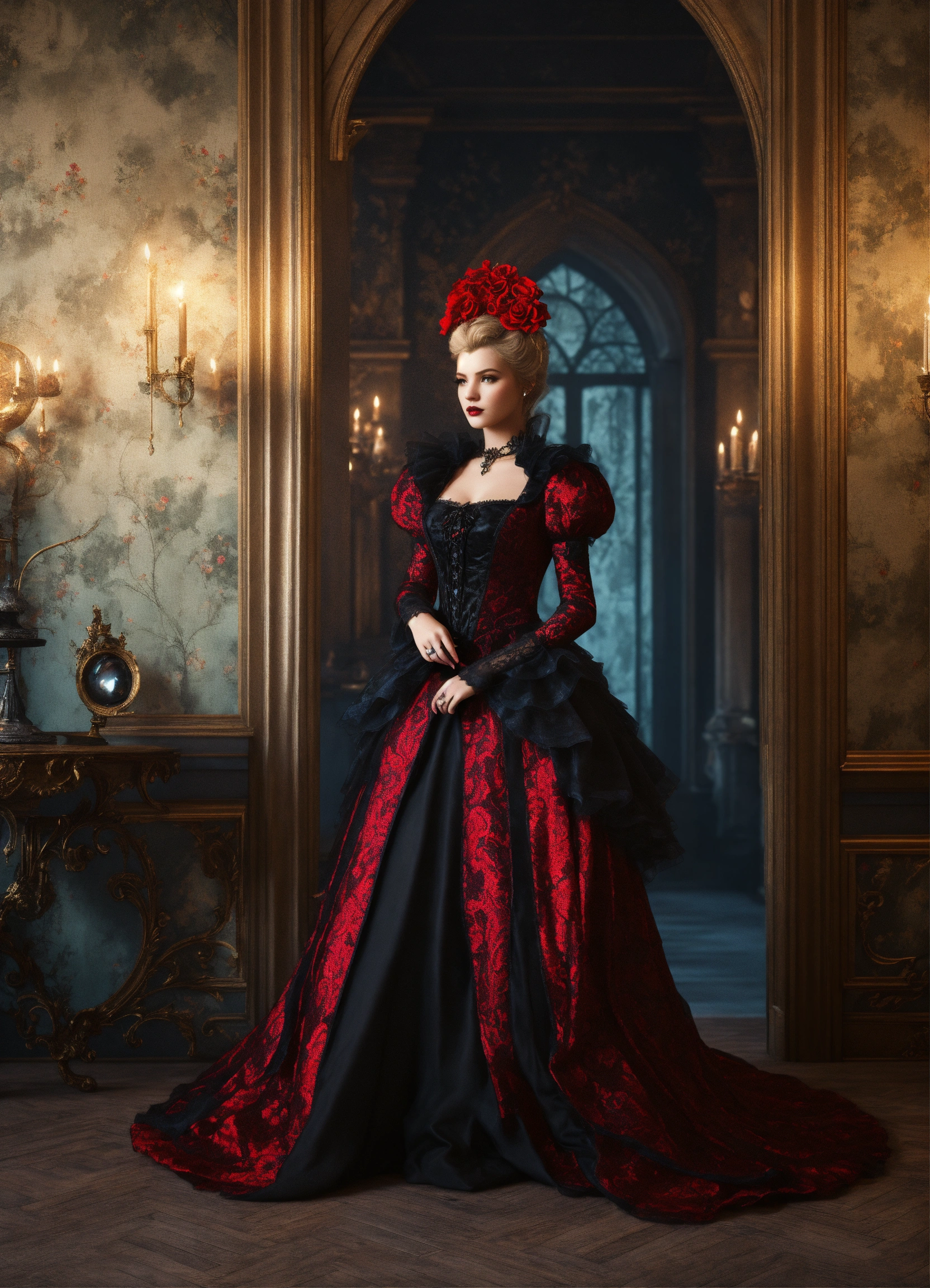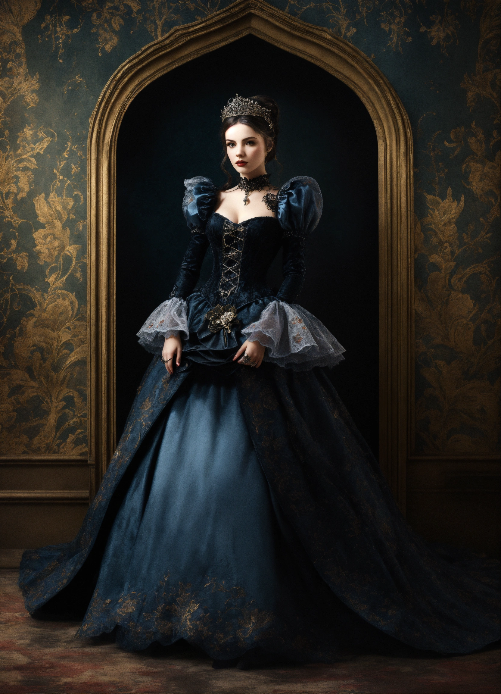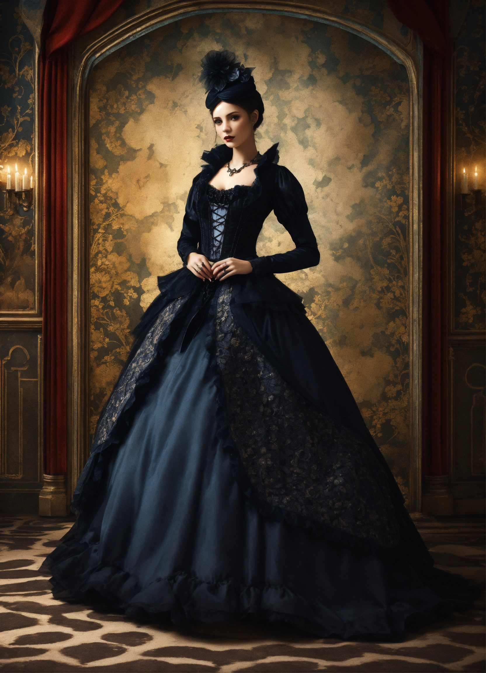 Elaborate gothic cinderella in an elegant and intricate gothic costume, background with grungy wallpaper, 3d, 32k, photorealistic and very detailed.