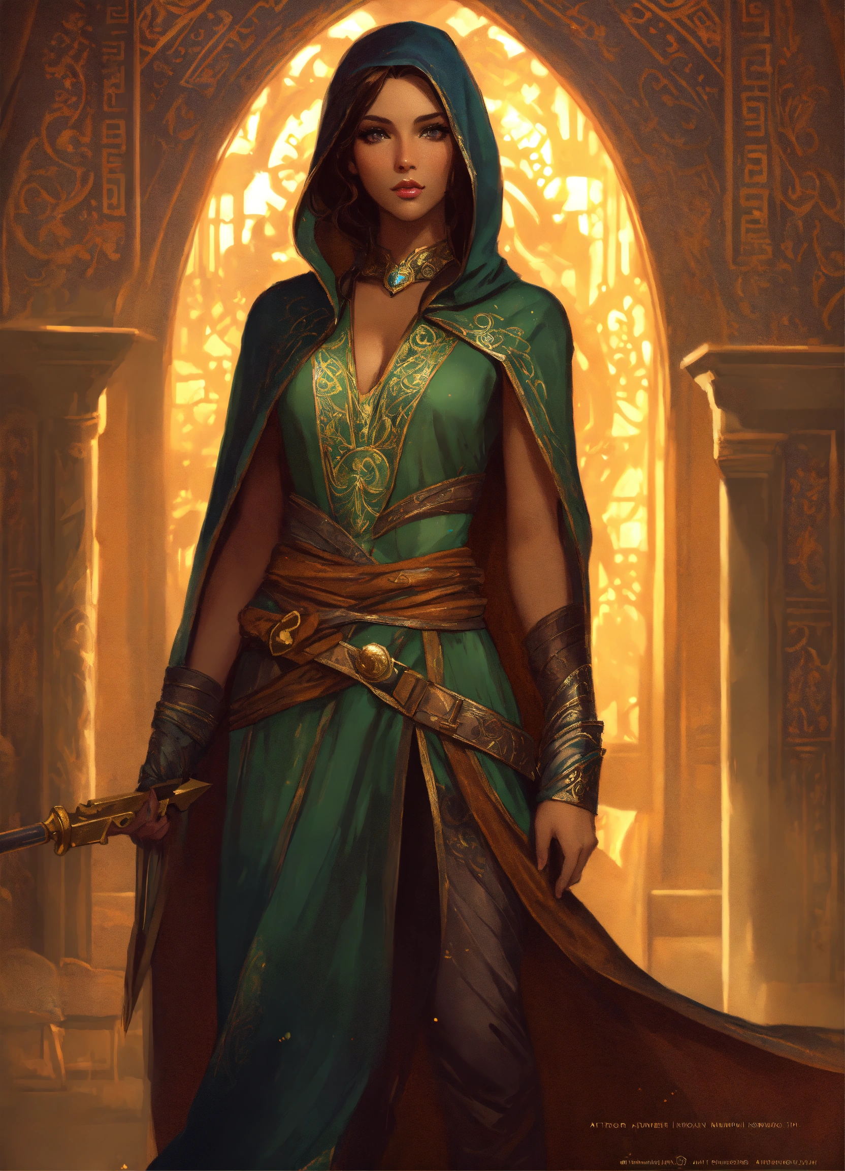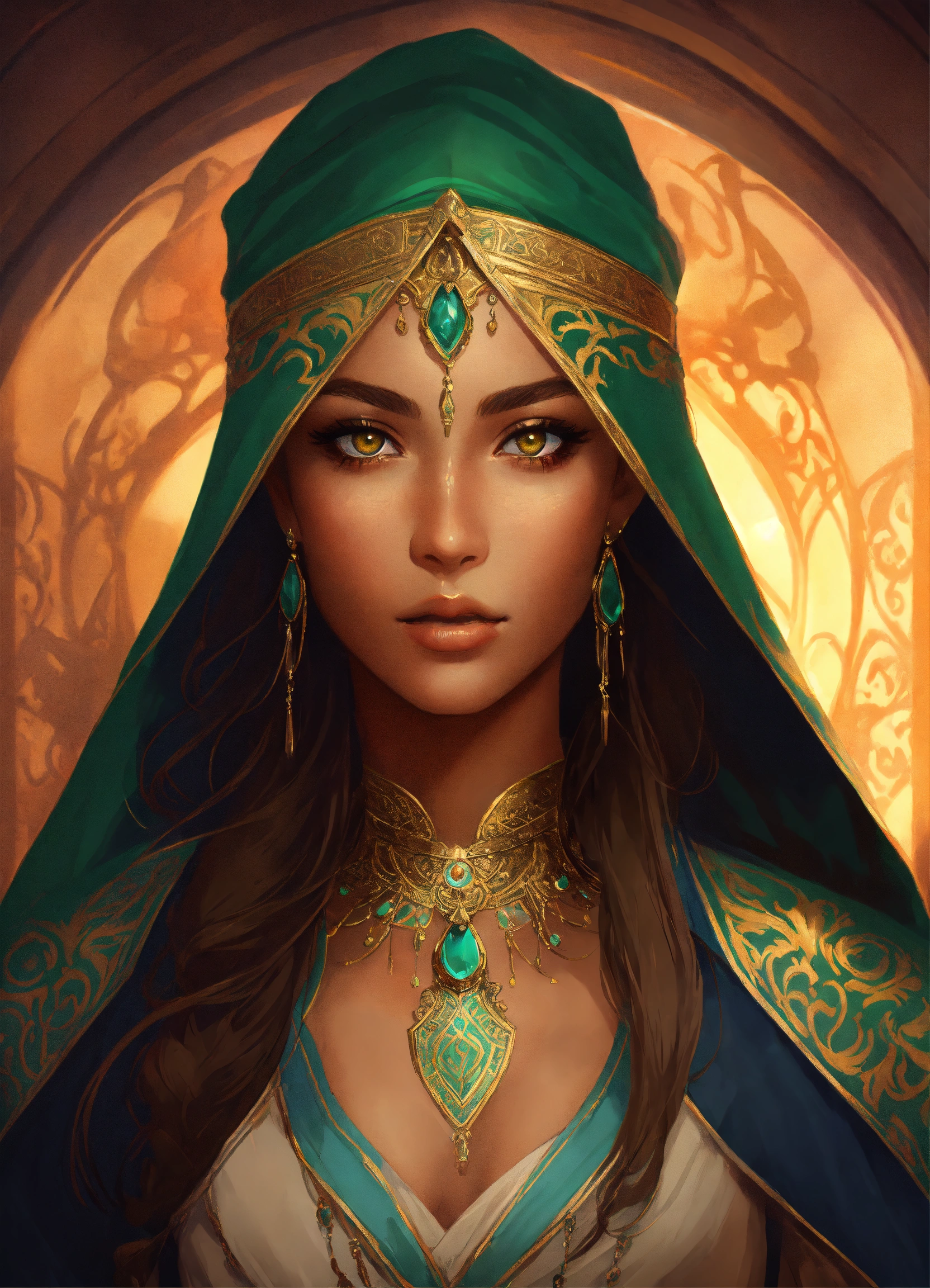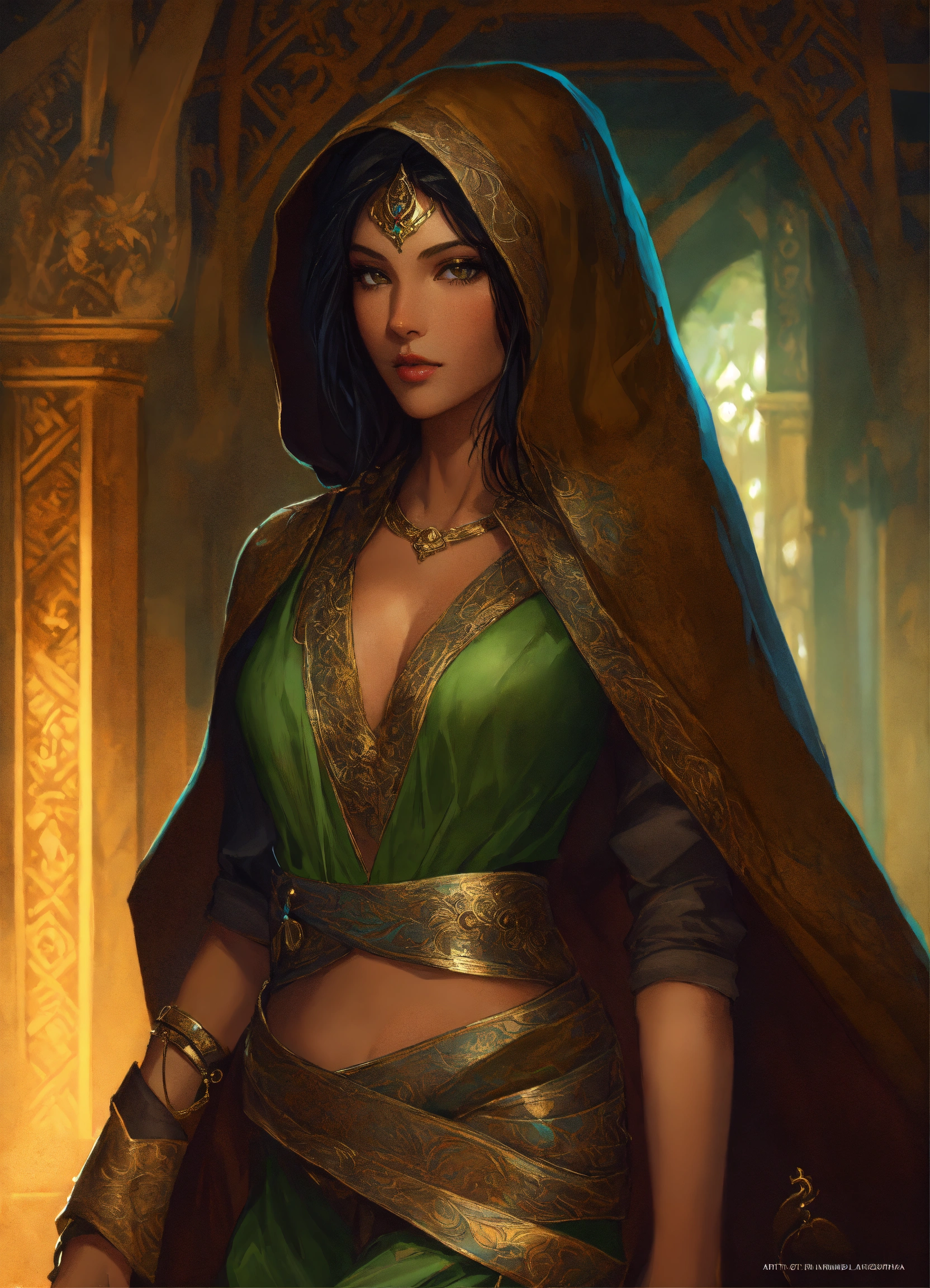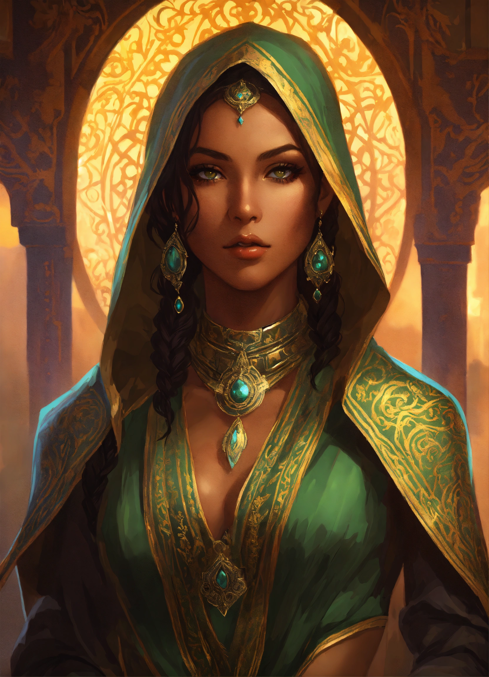 Full body portrait of beautiful timurid elf assassin, high cheekbones, toned, glowing dark tan skin, timurid clothes and cloak, long highlighted dark brown hair, hazel green eyes, magical surrounding lighting outline samarkand, exotic, pretty face, intricate, elegant, highly detailed, digital painting, artstation, concept art, smooth, sharp focus, illustration, art by artgerm and greg rutkowski and alphonse mucha, erte, 8 k, black clothes