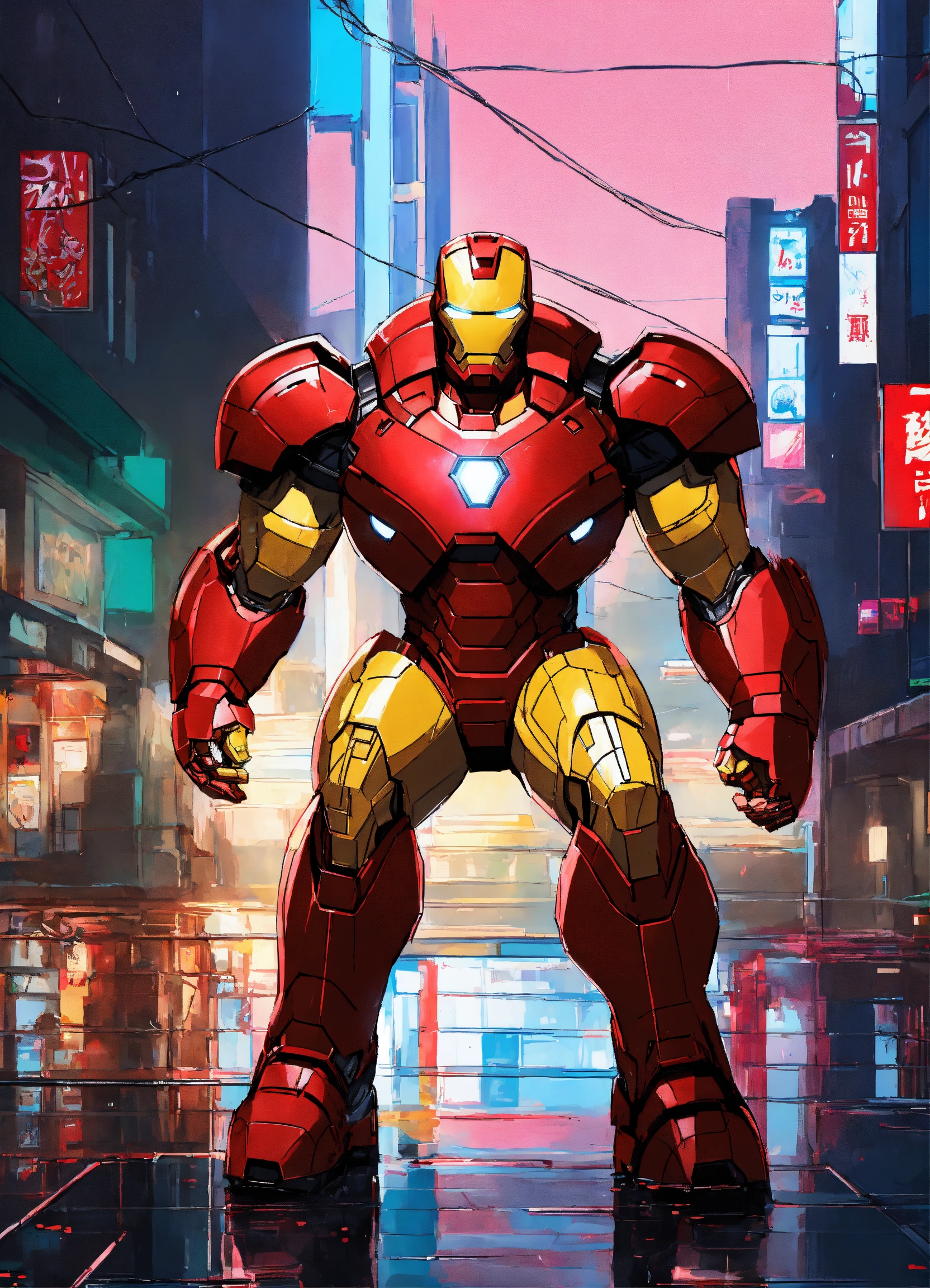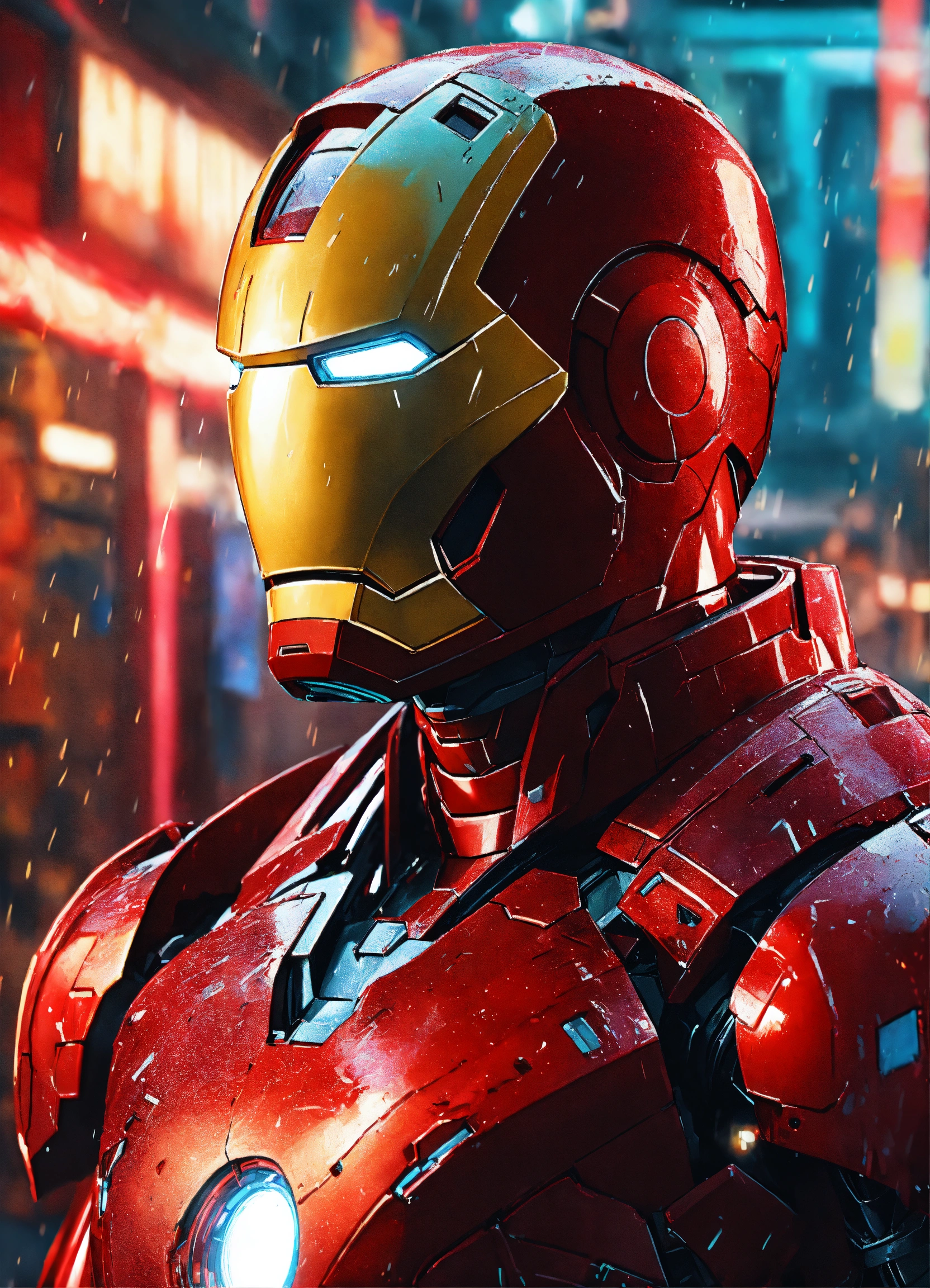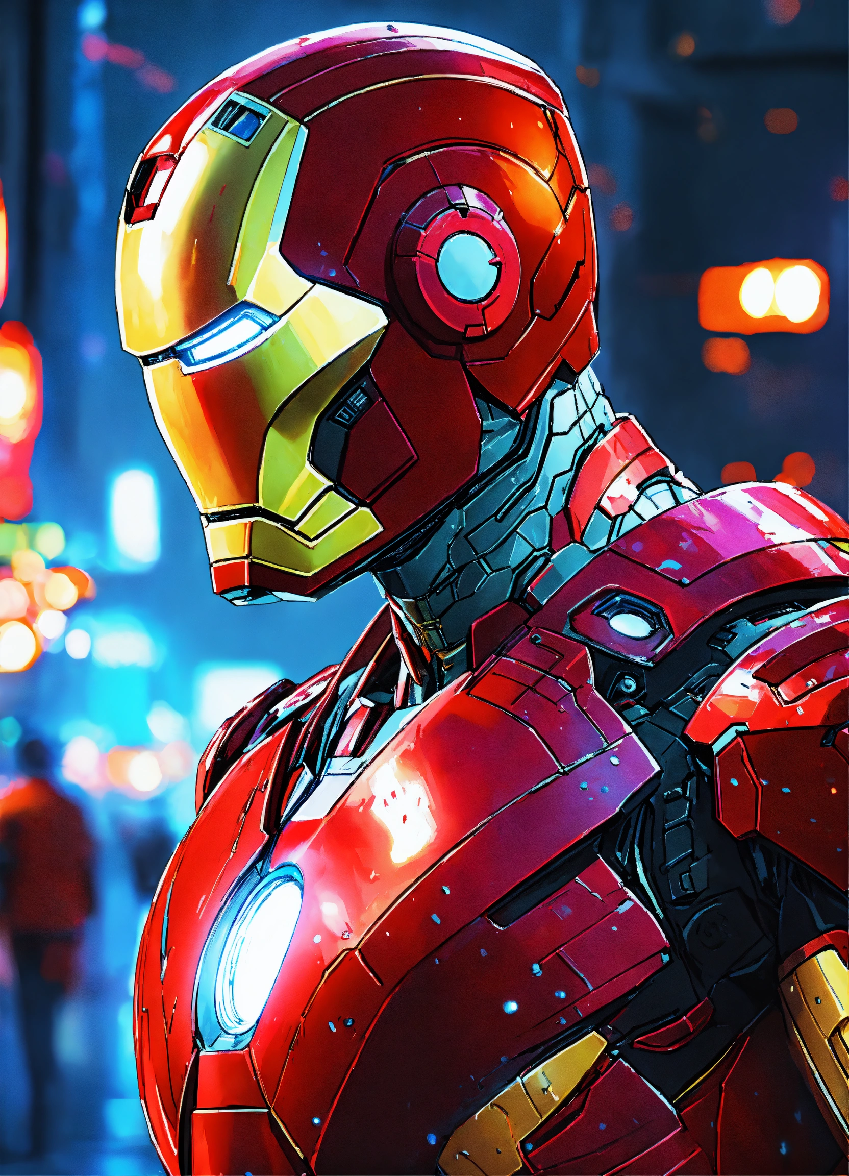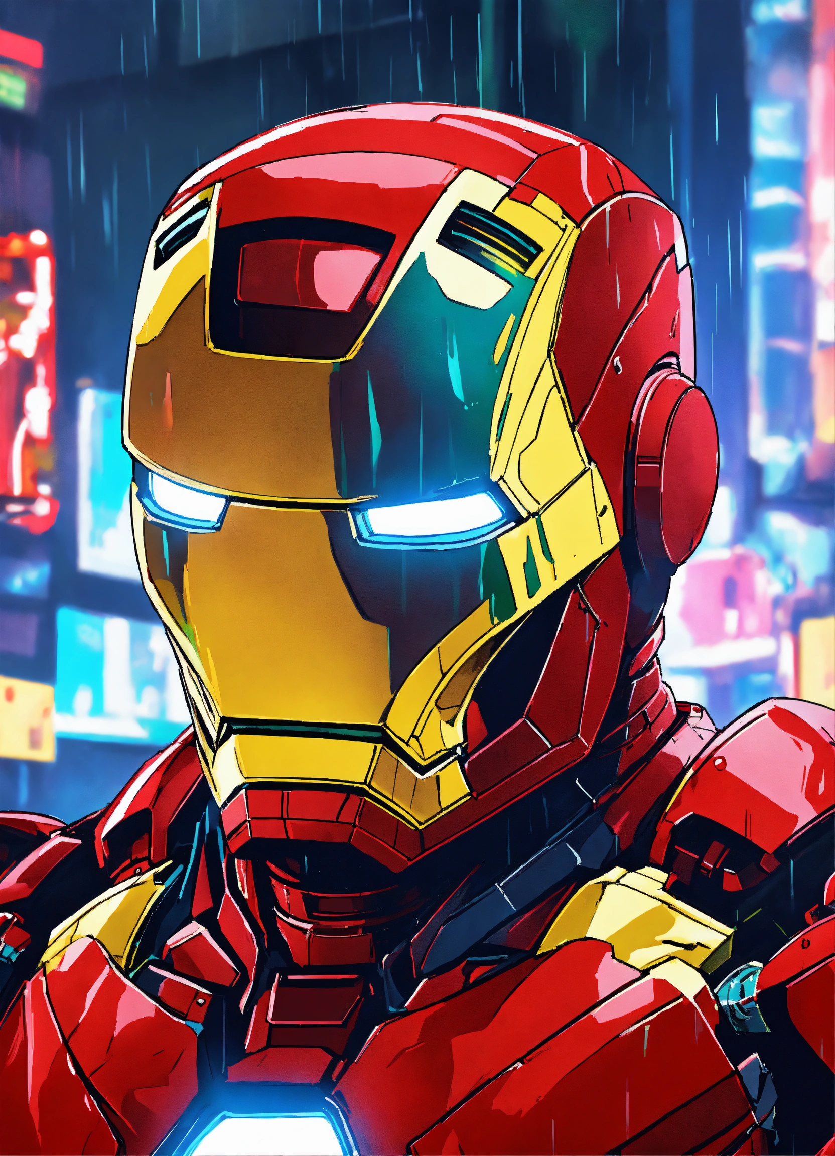 Anime art of iron man in the shell, detailed scene, red, perfect face, intricately detailed photorealism, trending on artstation, neon lights, rainy day, ray-traced environment, vintage 90's anime artwork, of strong body