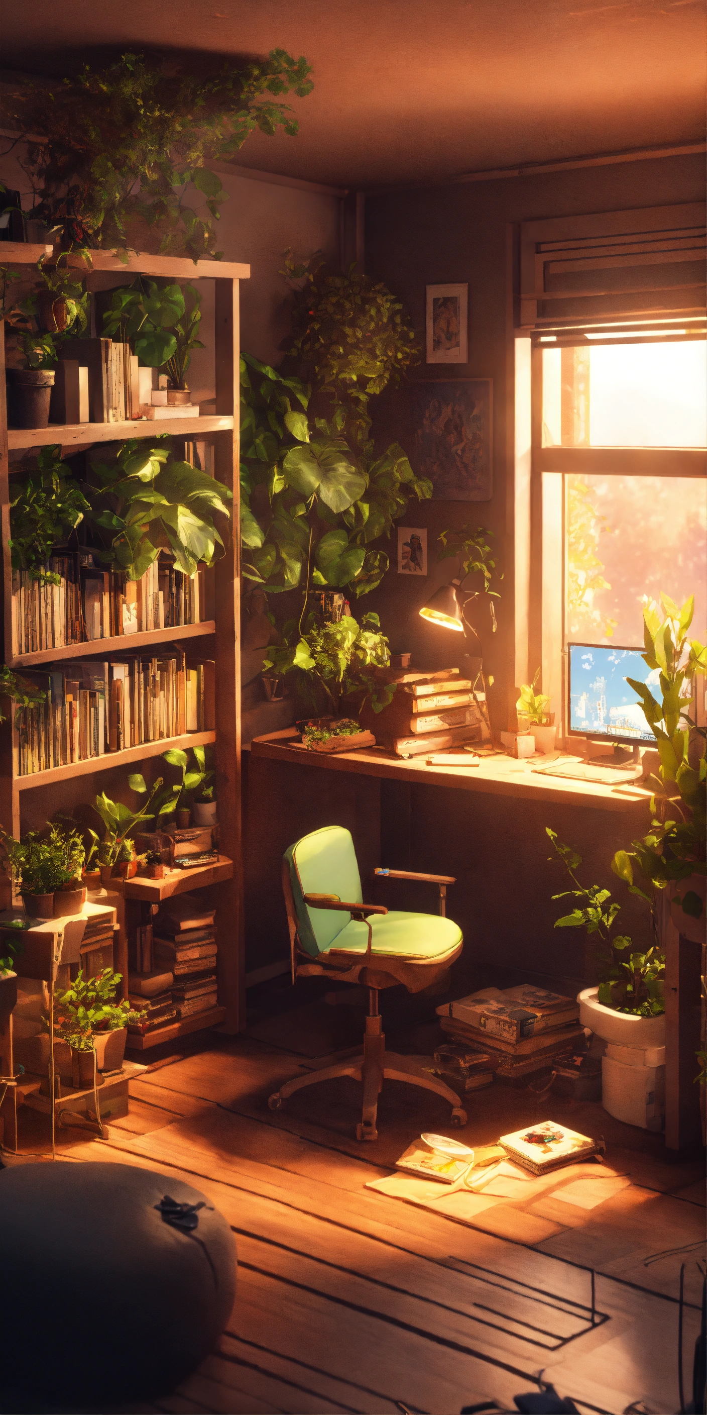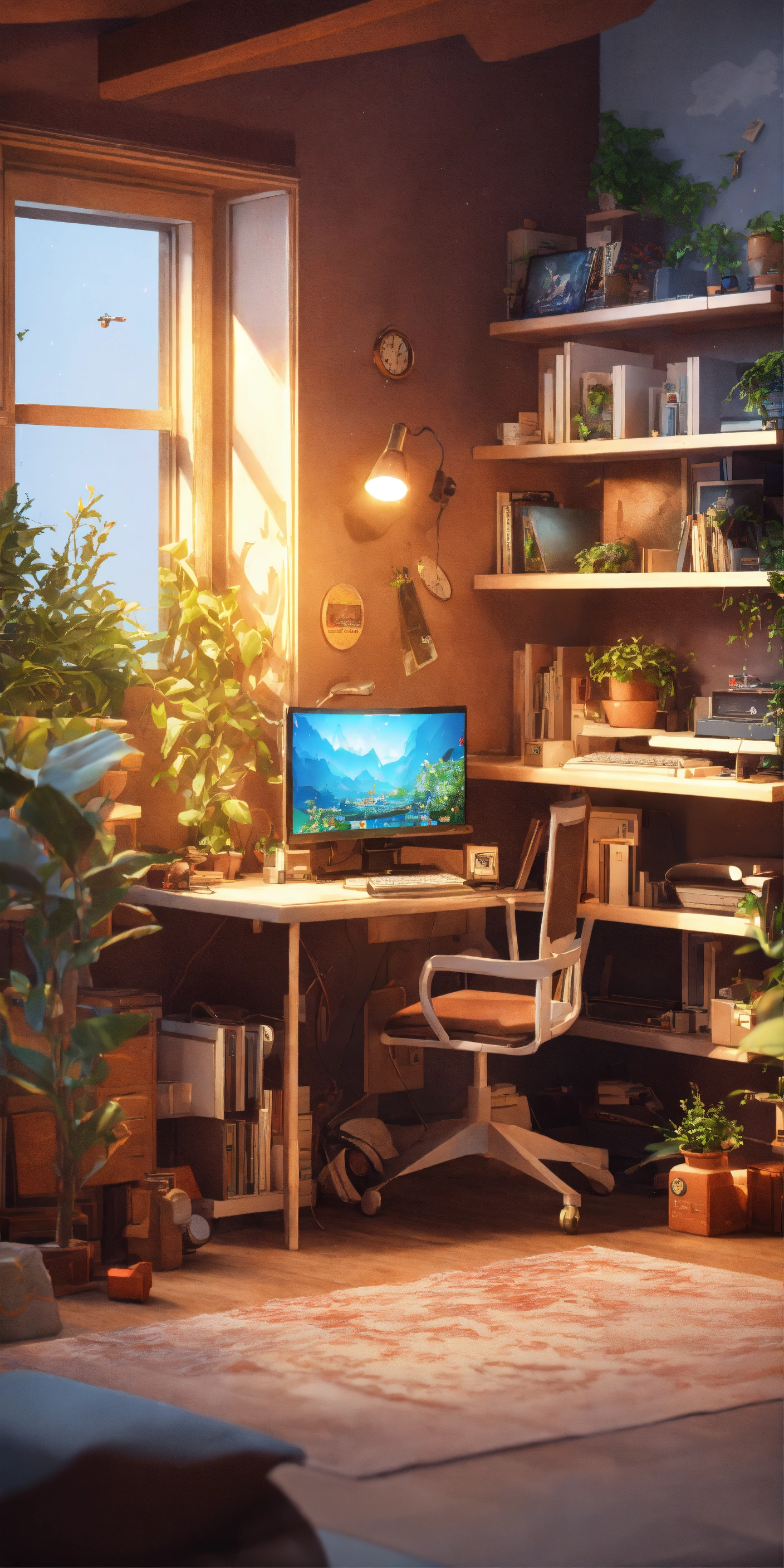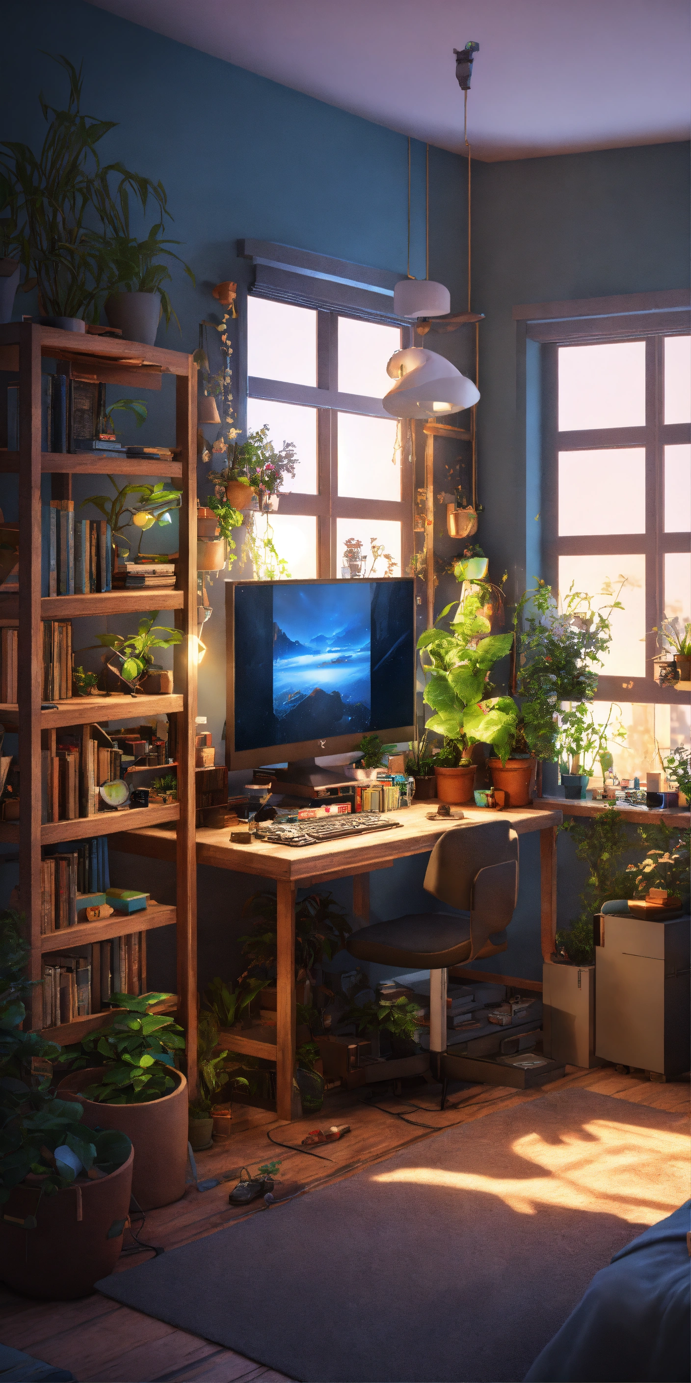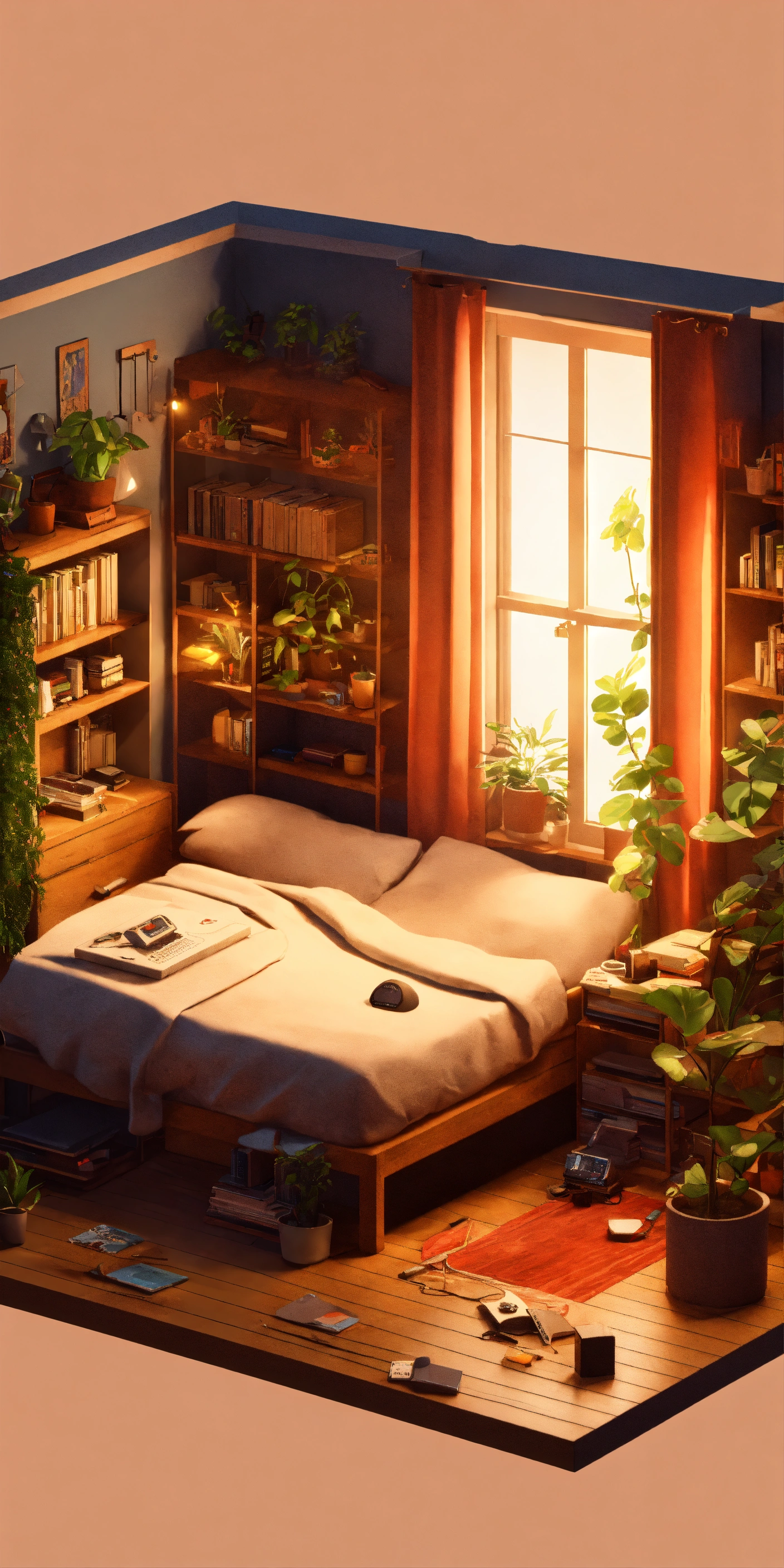 Isometric render, messy nostalgic bedroom with a gaming pc, windows, plants bookshelves, desk, 3d art, muted colors, perfect lighting, high detail, concept art, behance