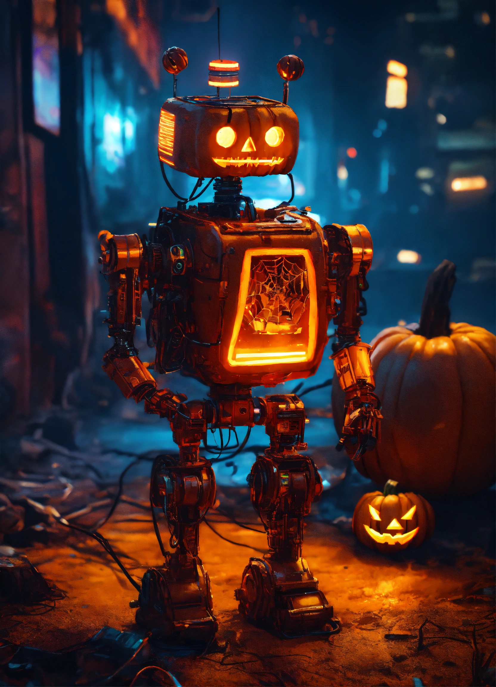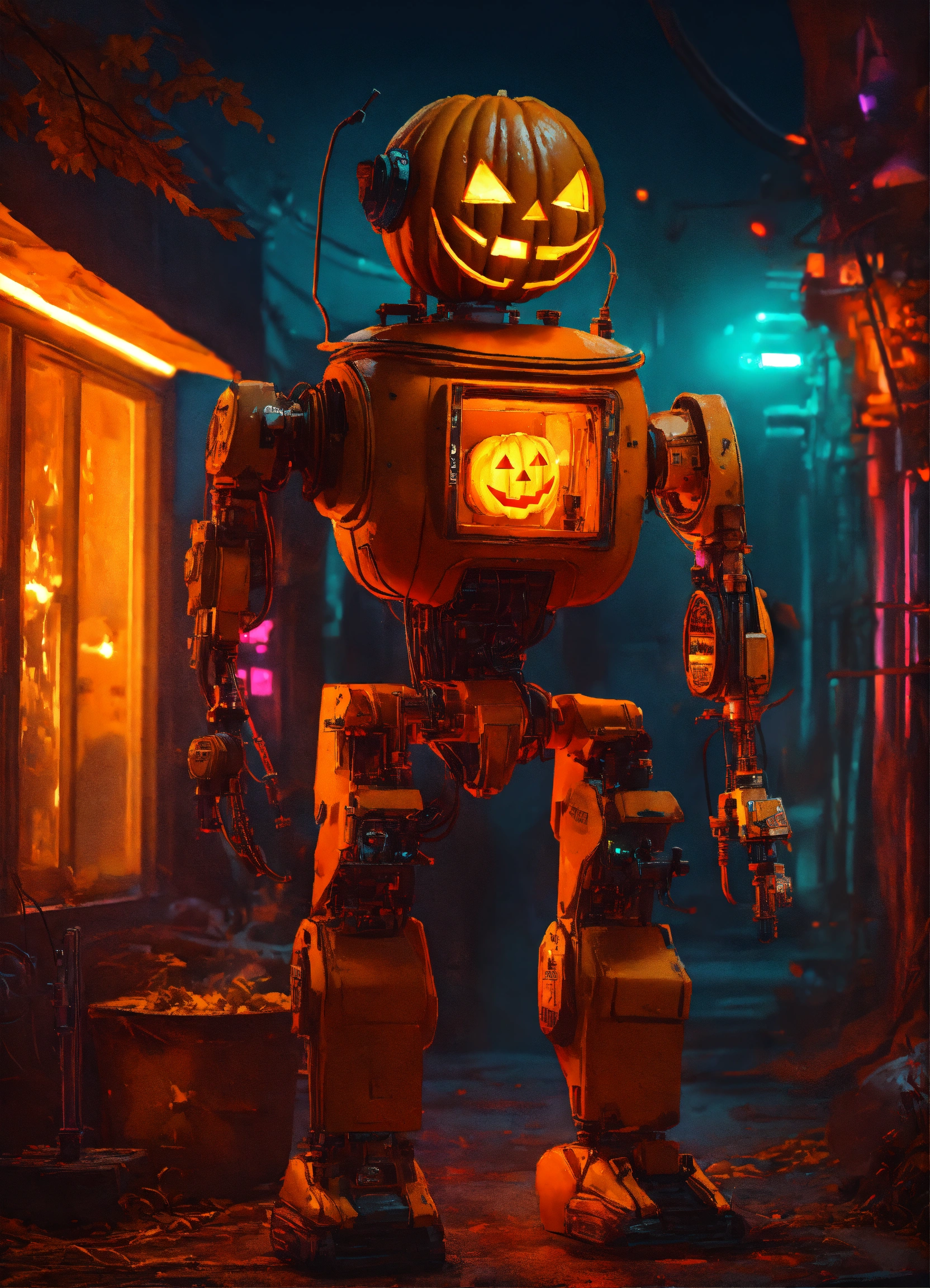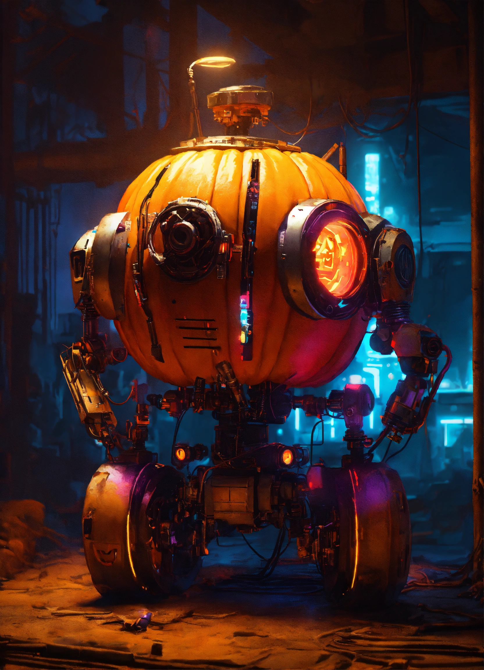 Halloween jackolantern robot cyberpunk on a deep mechanic planet with neon light