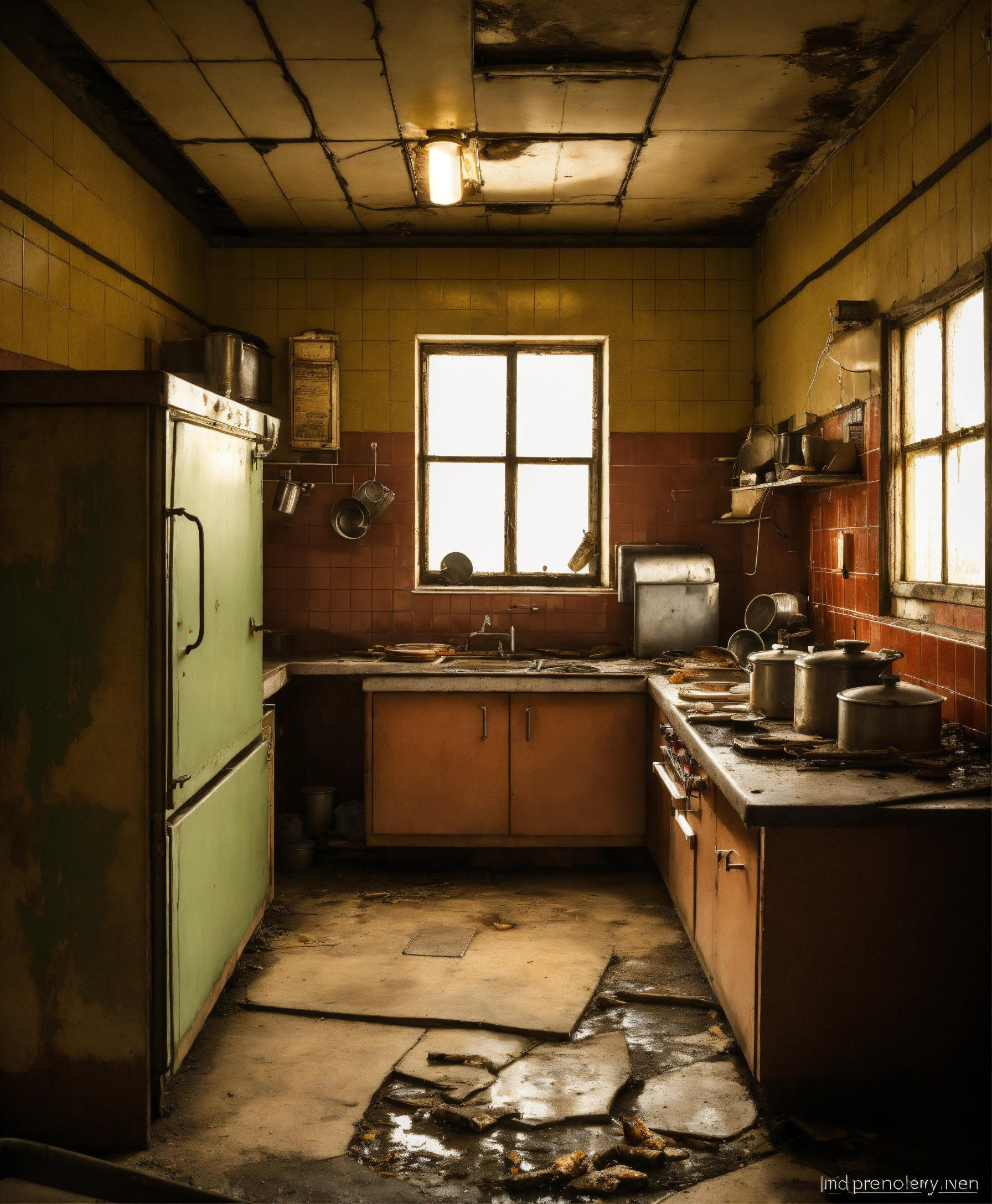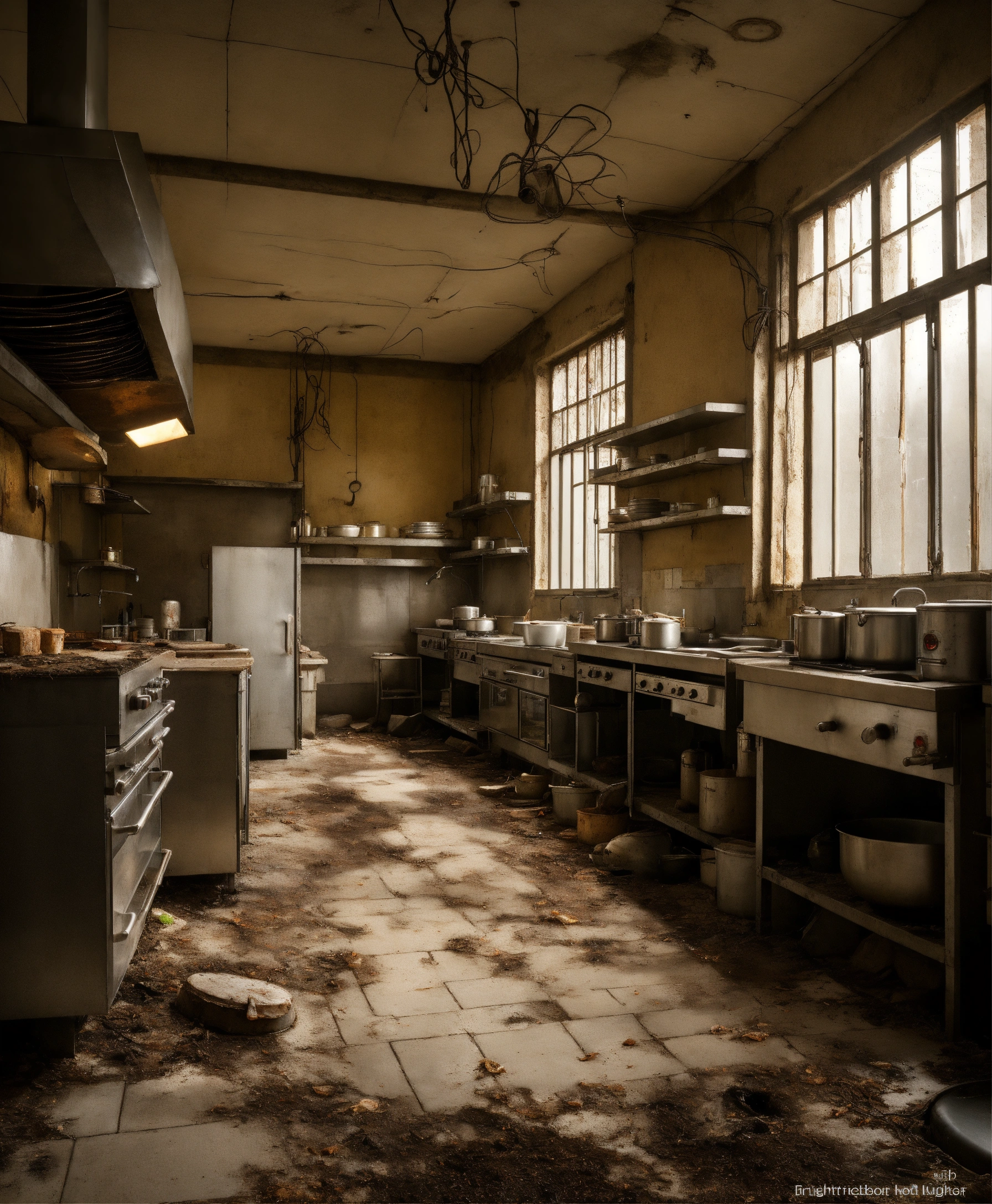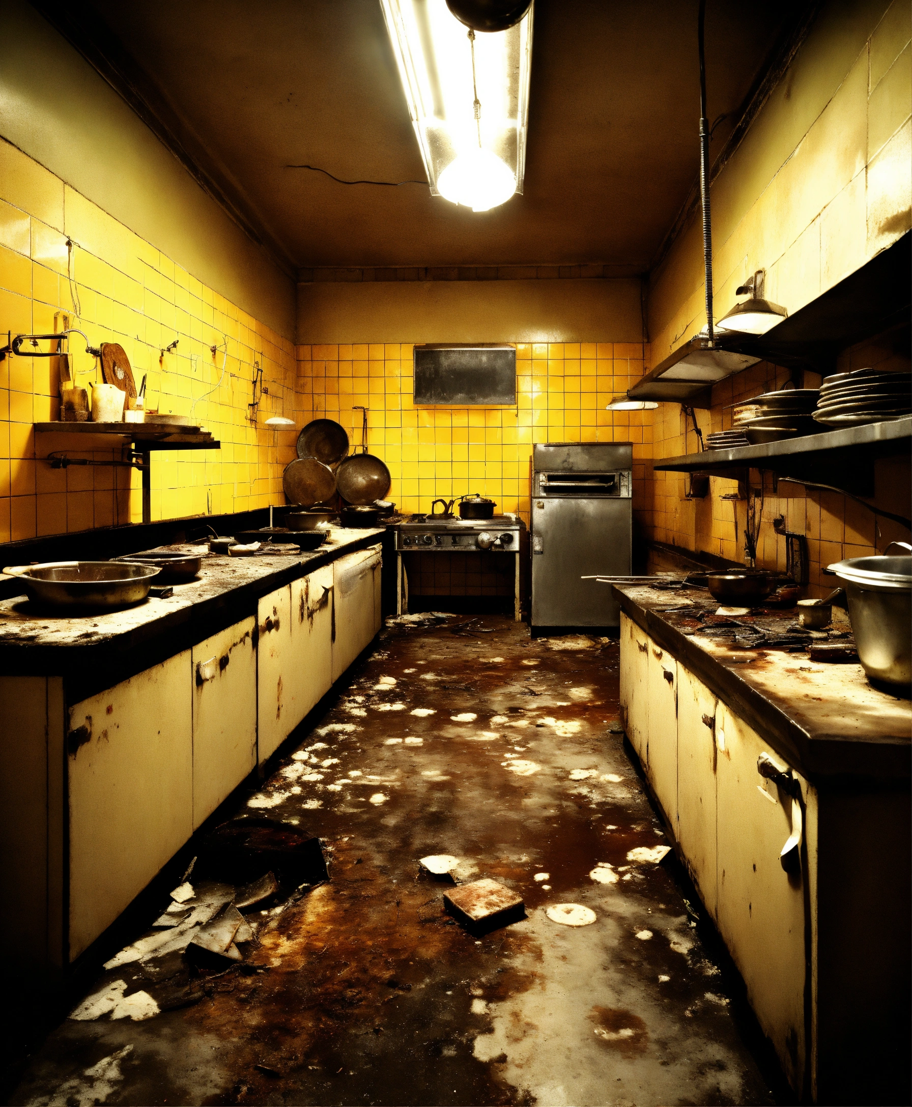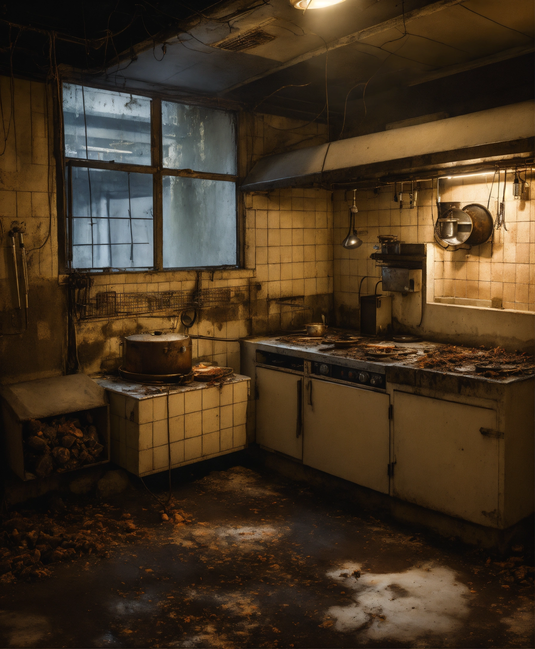 Abandoned restaurant kitchen hotel, large white and steel modern kitchen, photo realistic, eery, dark, moldy, hospital kitchen large, skin disease, fungus, broken tiles, insects, rust, dust, public, drain, manhole, bacteria, sewer, moths, surgical instruments, cockroaches, light bulbs wires cables electric, dungeon, worms, butcher, gloomy, at night time