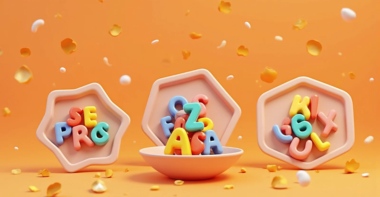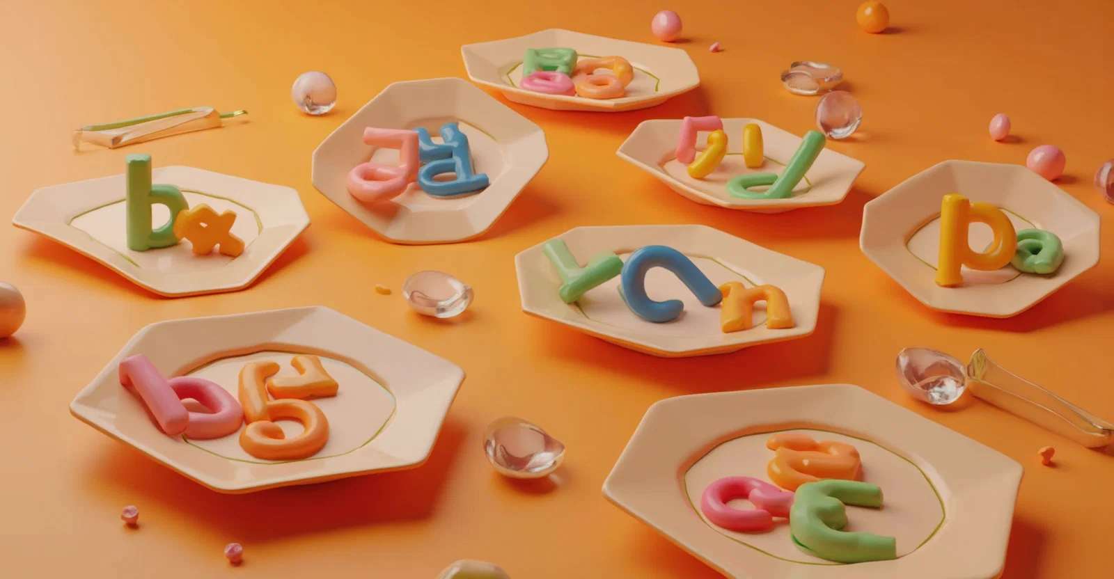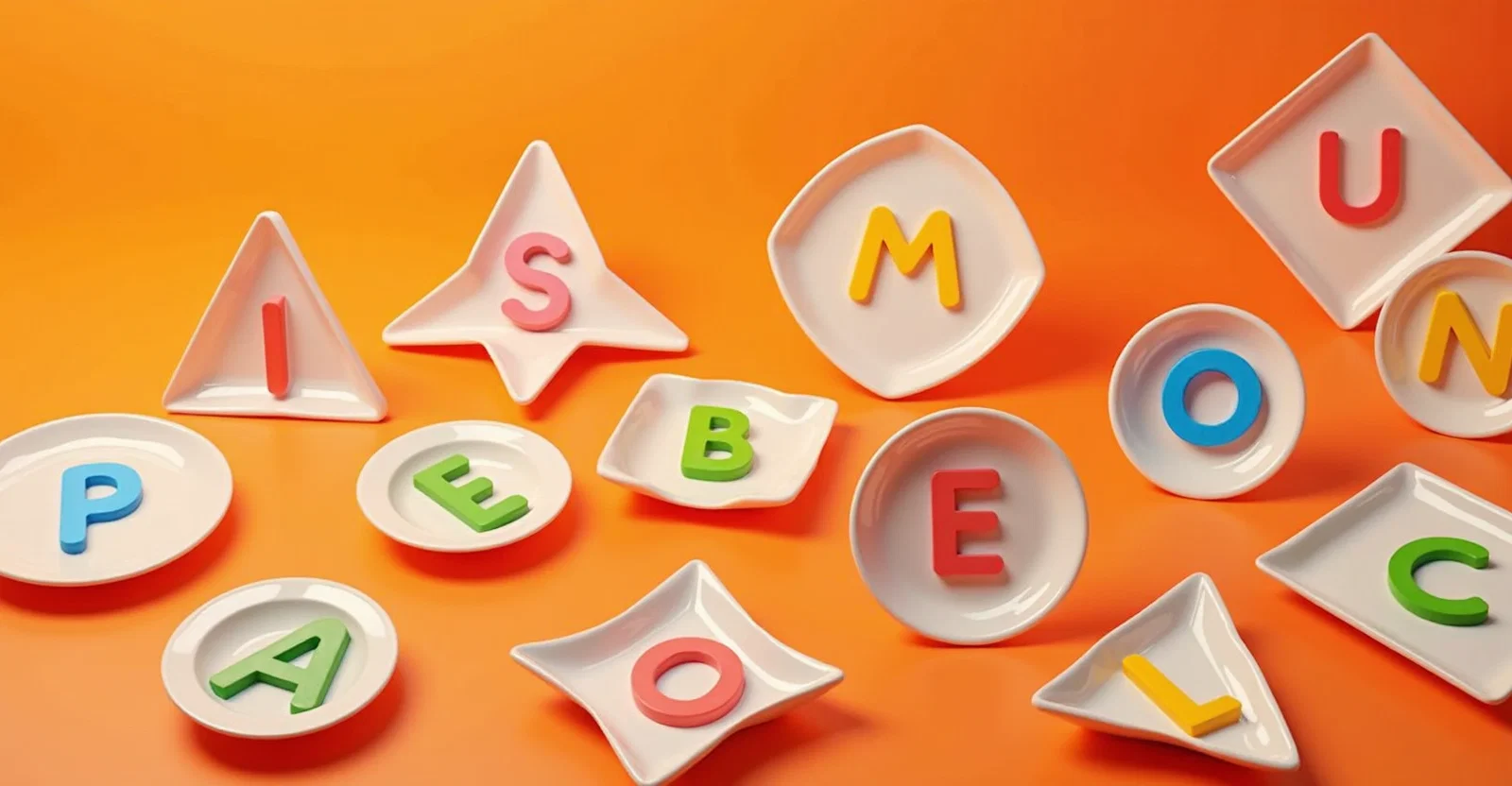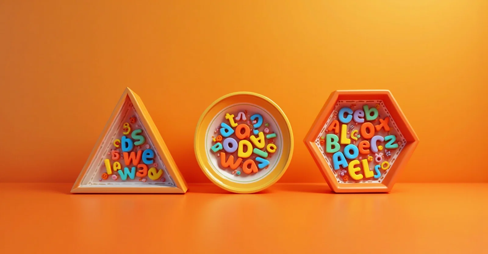 3d, geometric shaped soup plates filled with multicoloured letters of the spanish alphabet, on a gradient orange background, minimalist and photographic style
